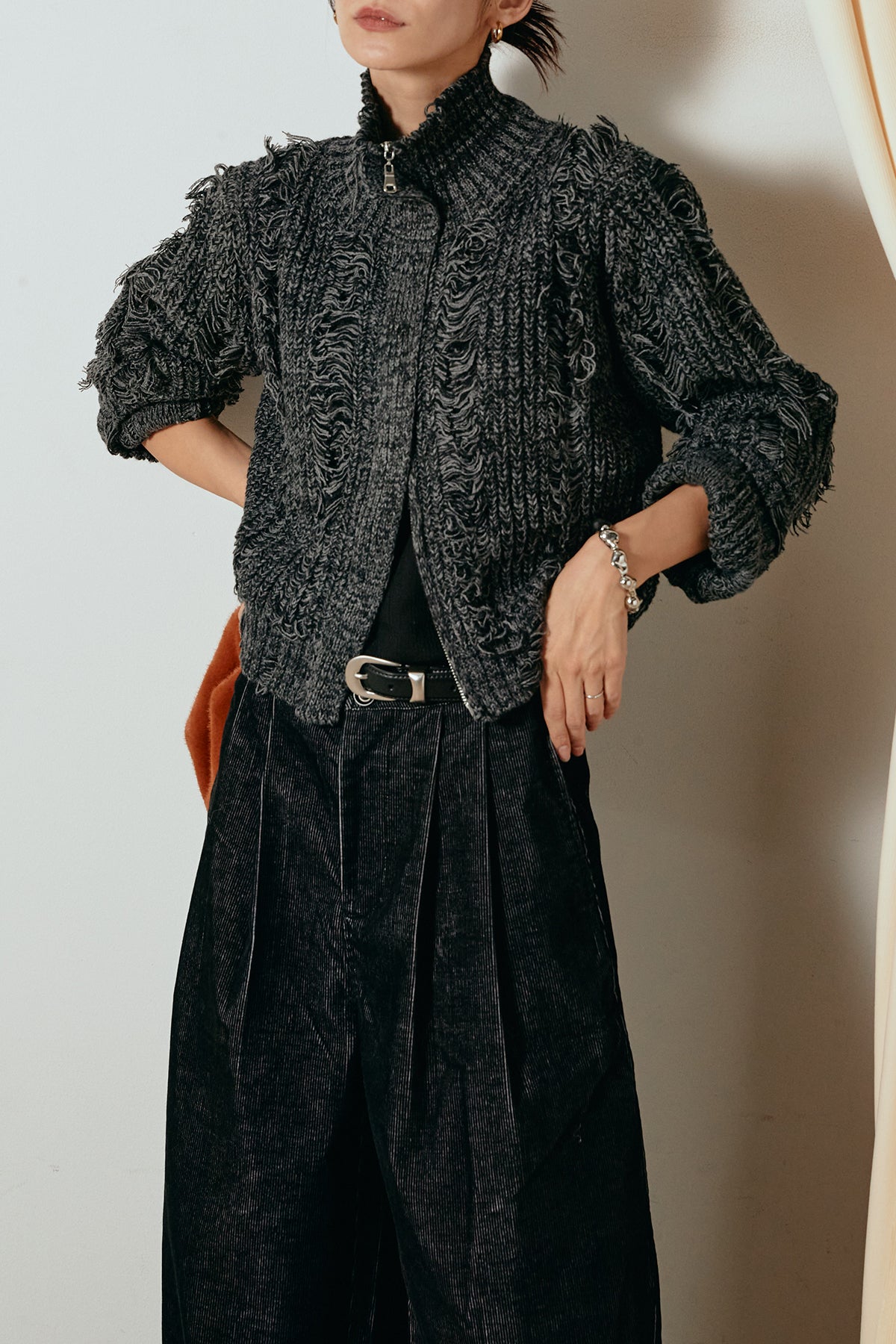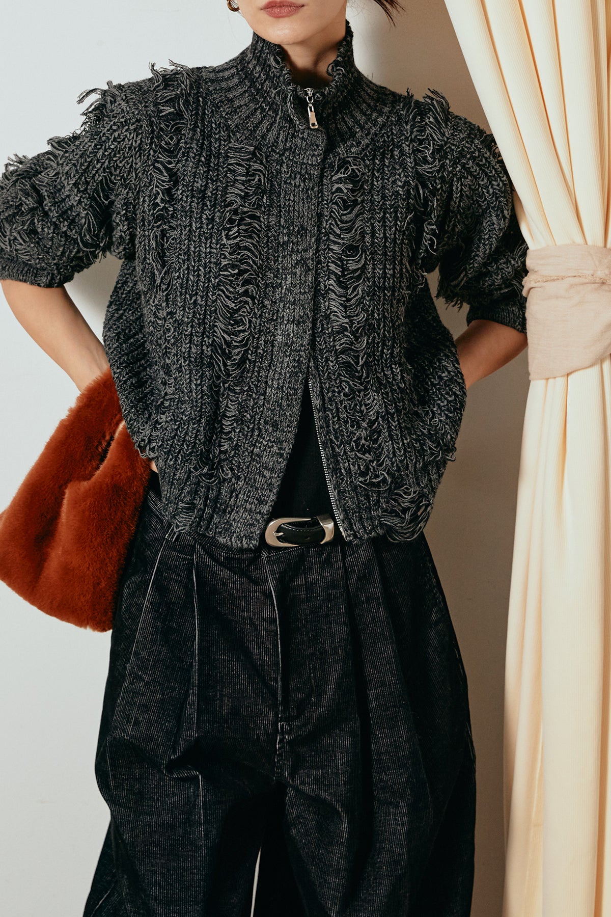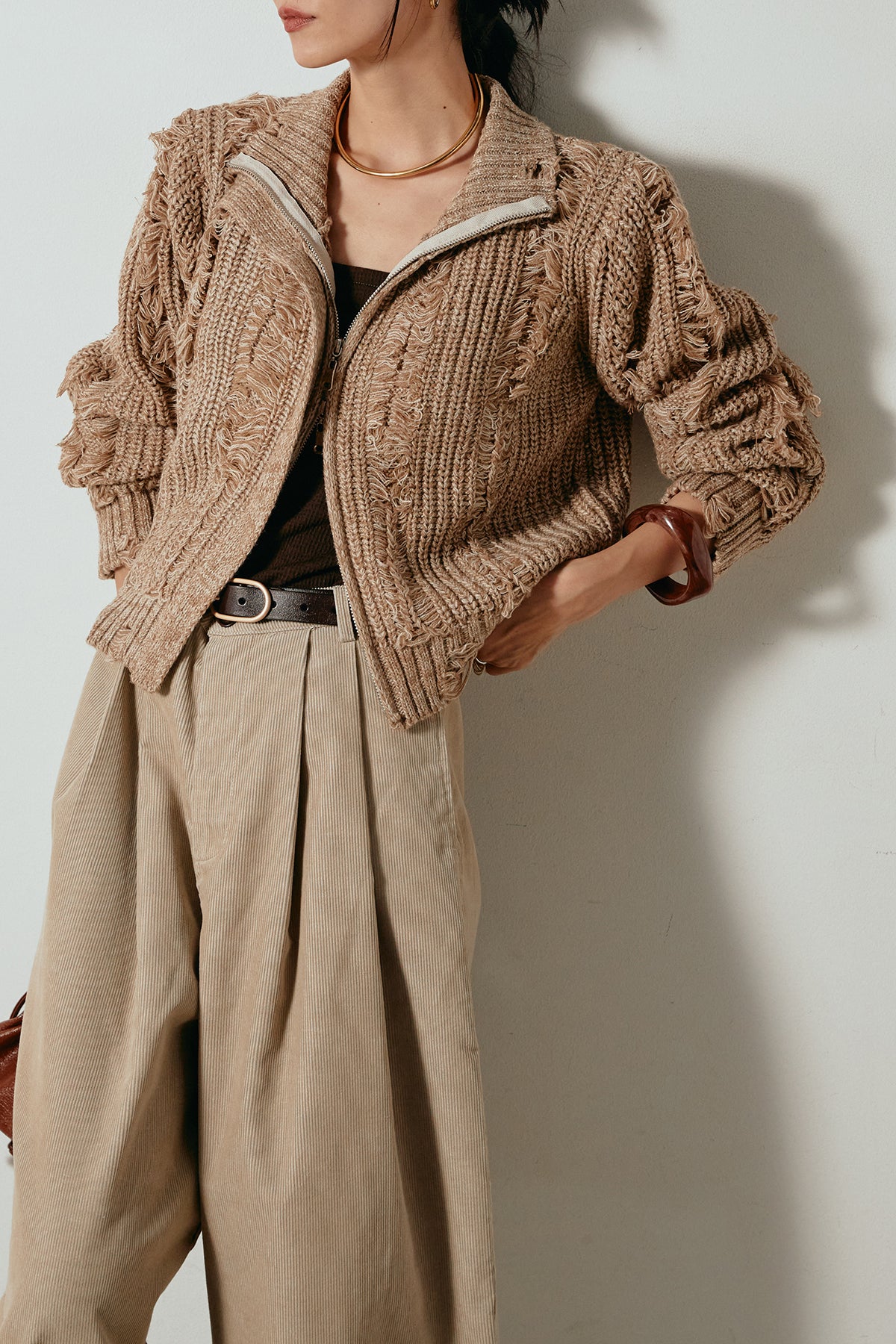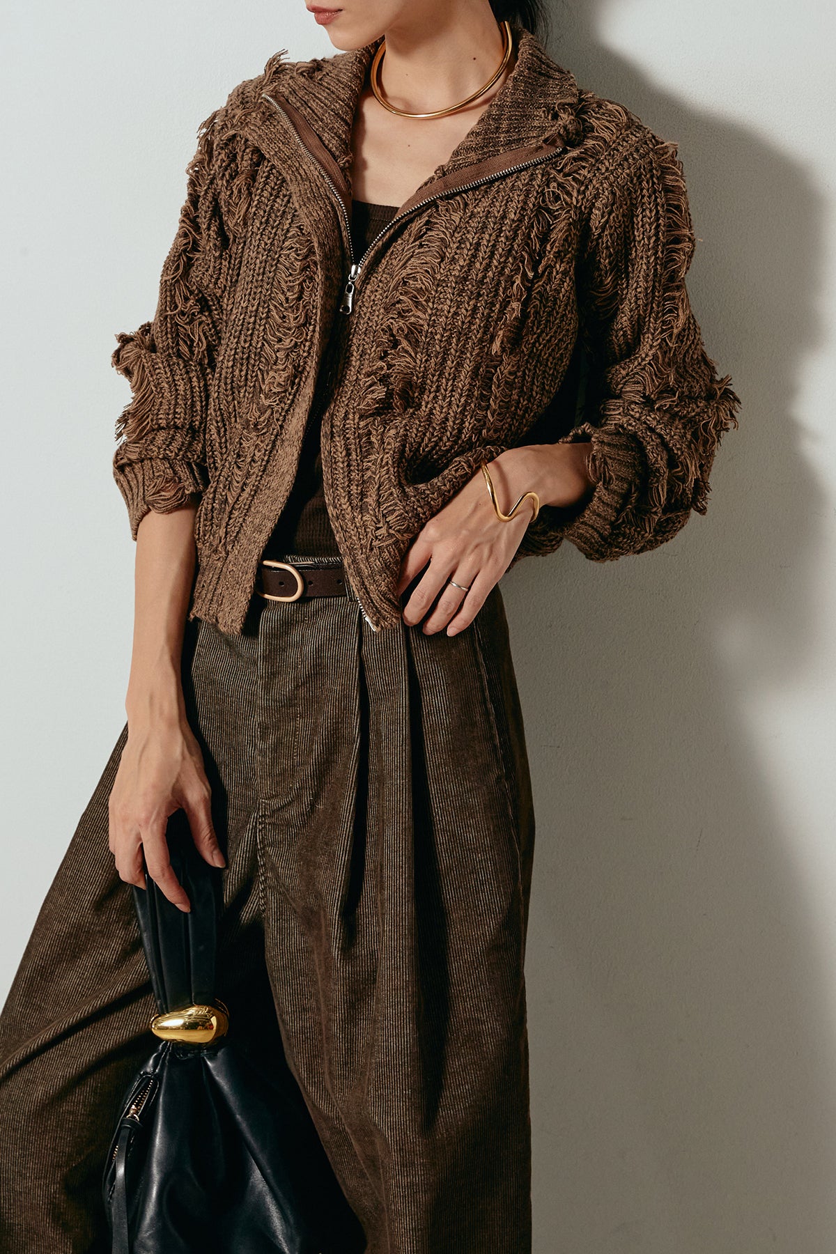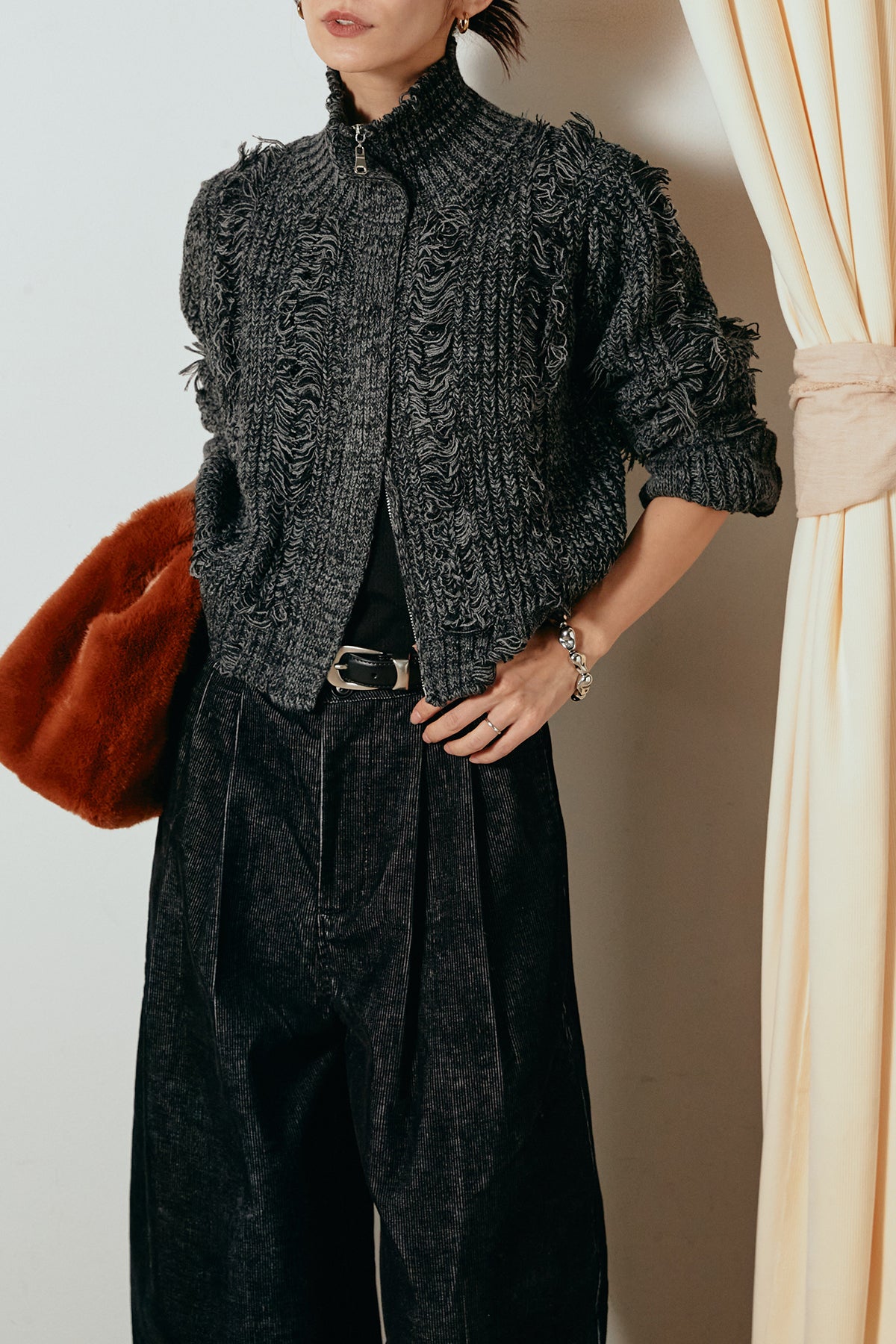 立体的なフリンジ編みがポイントのハイネックジップニットトップス。 ざっくりとしたリブ編みとフリンジの組み合わせで、程よい存在感を演出。 フロントジップ仕様なので着脱もスムーズで、開けてカーディガンのようにも着用可能。 ショート丈のすっきりとしたシルエットがボリュームのあるボトムスとも好相性で、秋冬のスタイリングにニュアンスを添える一枚です。