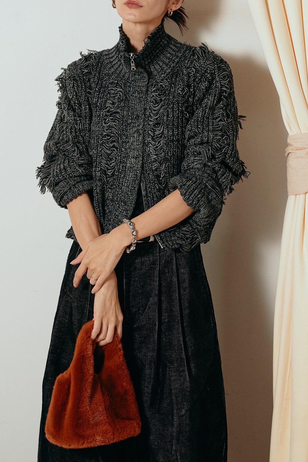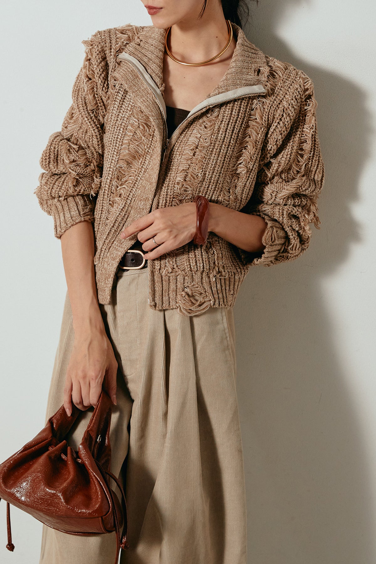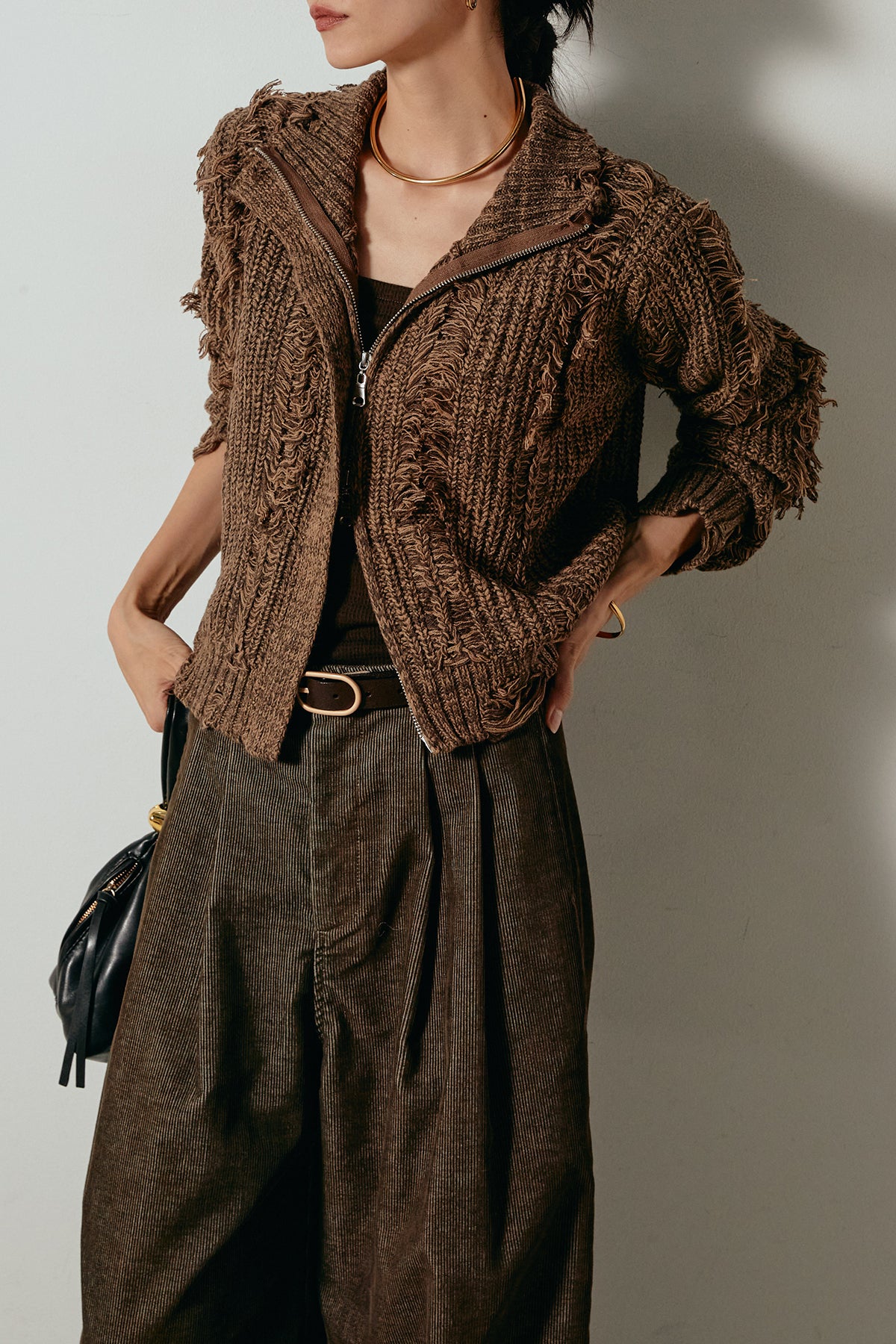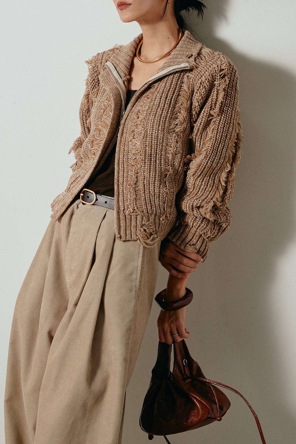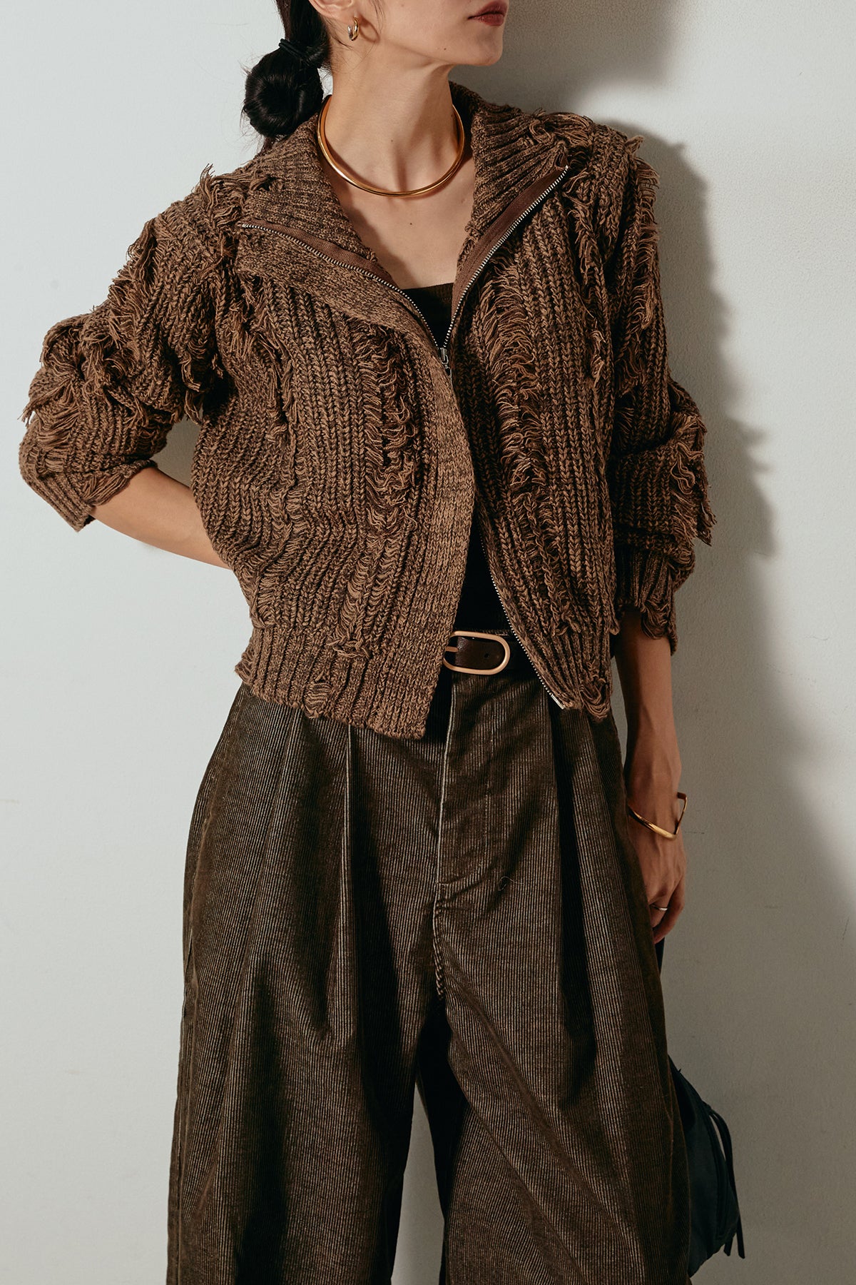 立体的なフリンジ編みがポイントのハイネックジップニットトップス。 ざっくりとしたリブ編みとフリンジの組み合わせで、程よい存在感を演出。 フロントジップ仕様なので着脱もスムーズで、開けてカーディガンのようにも着用可能。 ショート丈のすっきりとしたシルエットがボリュームのあるボトムスとも好相性で、秋冬のスタイリングにニュアンスを添える一枚です。