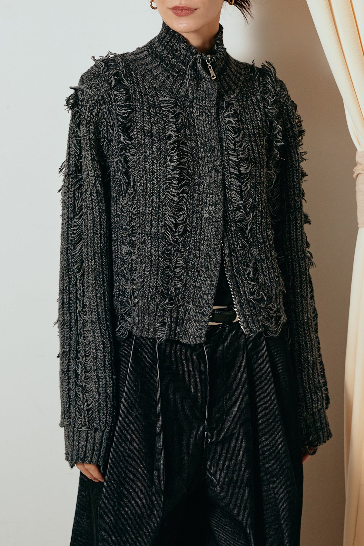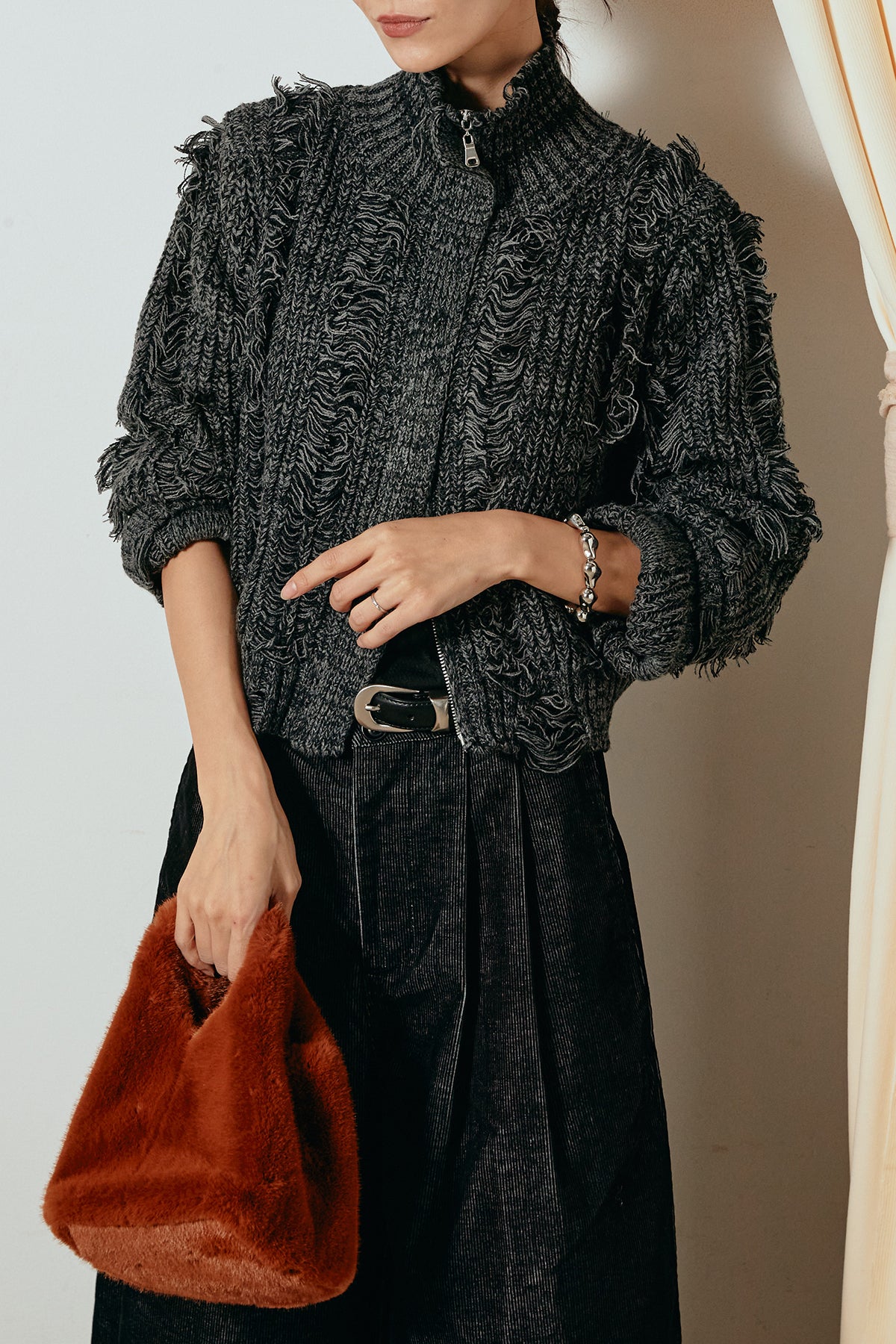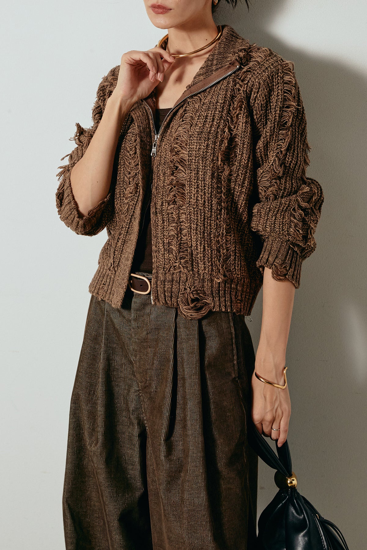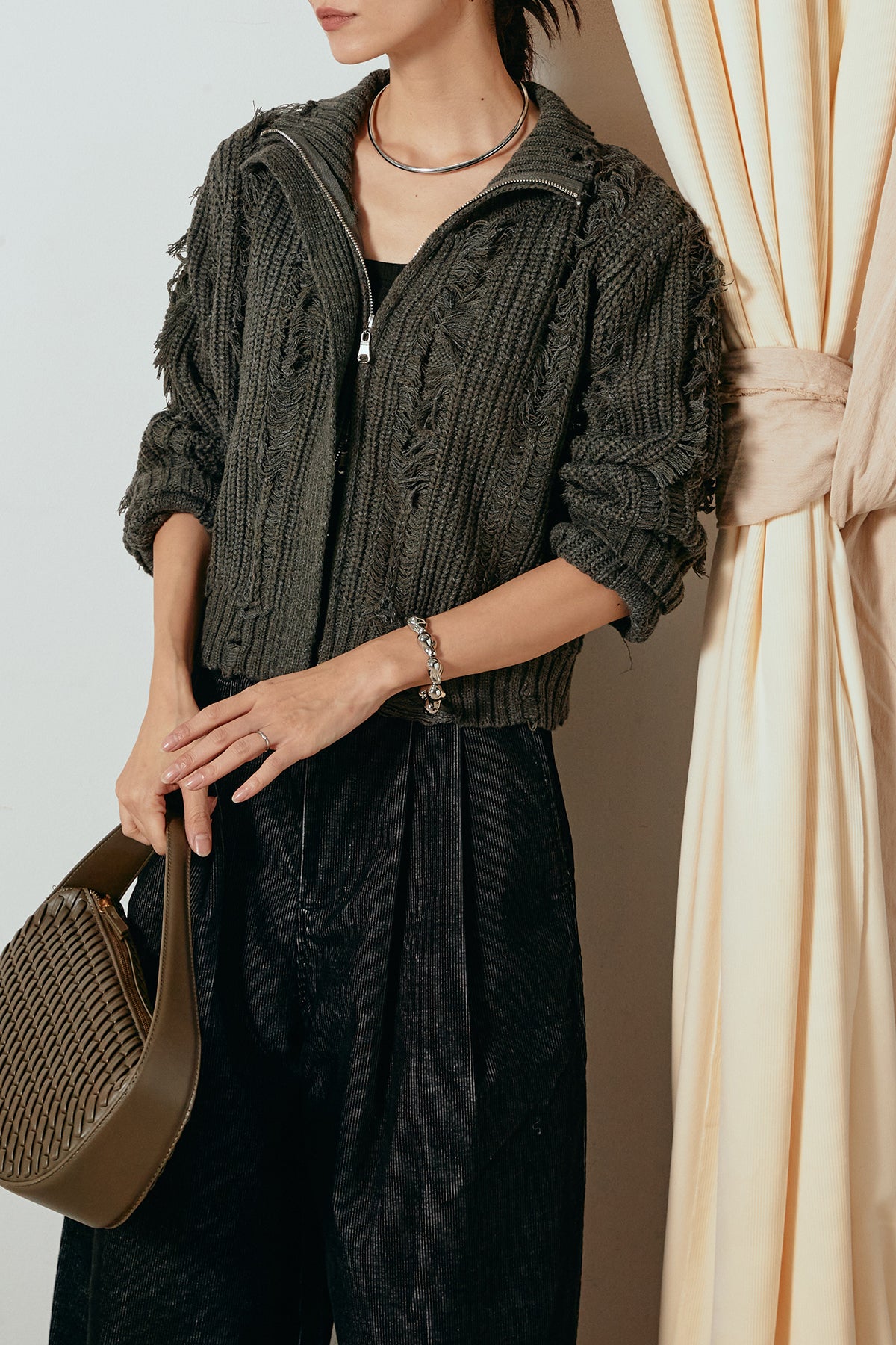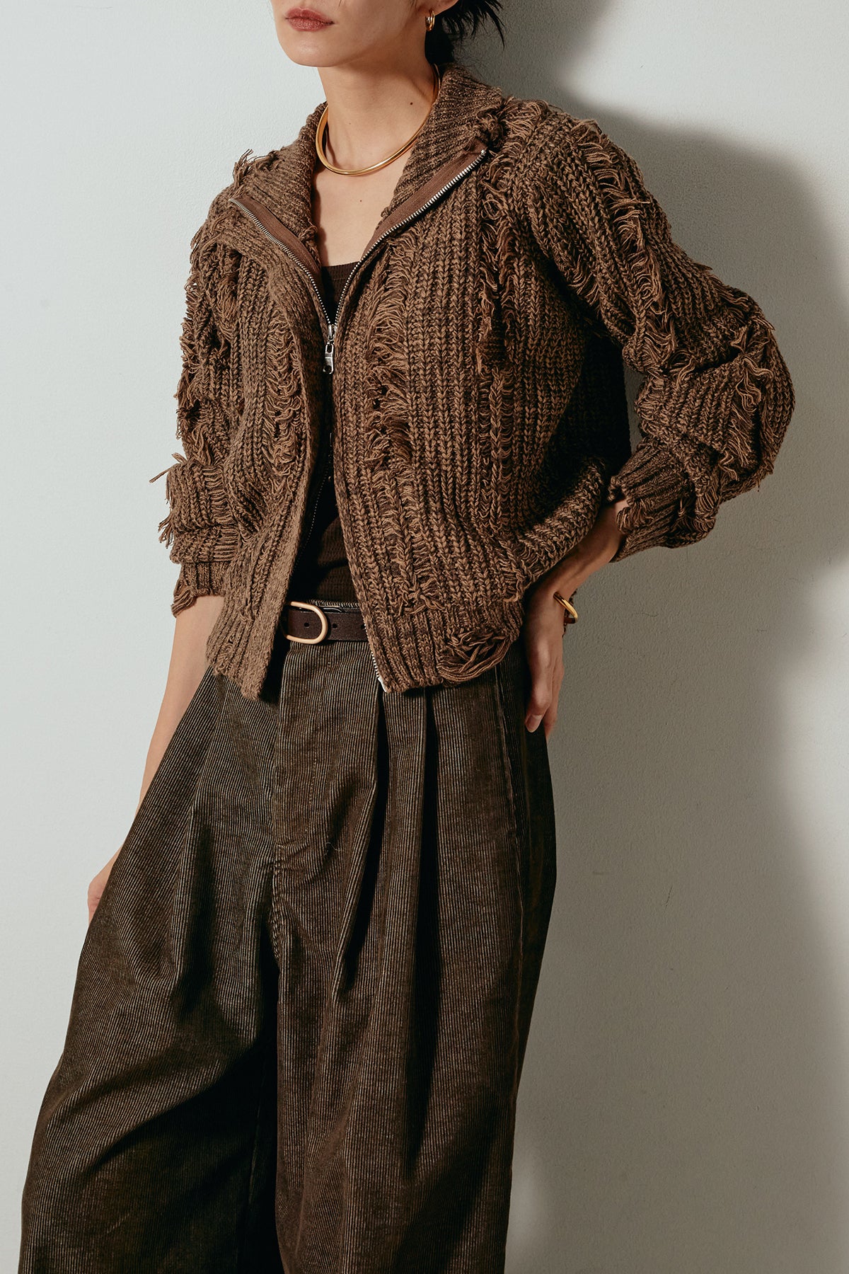 立体的なフリンジ編みがポイントのハイネックジップニットトップス。 ざっくりとしたリブ編みとフリンジの組み合わせで、程よい存在感を演出。 フロントジップ仕様なので着脱もスムーズで、開けてカーディガンのようにも着用可能。 ショート丈のすっきりとしたシルエットがボリュームのあるボトムスとも好相性で、秋冬のスタイリングにニュアンスを添える一枚です。