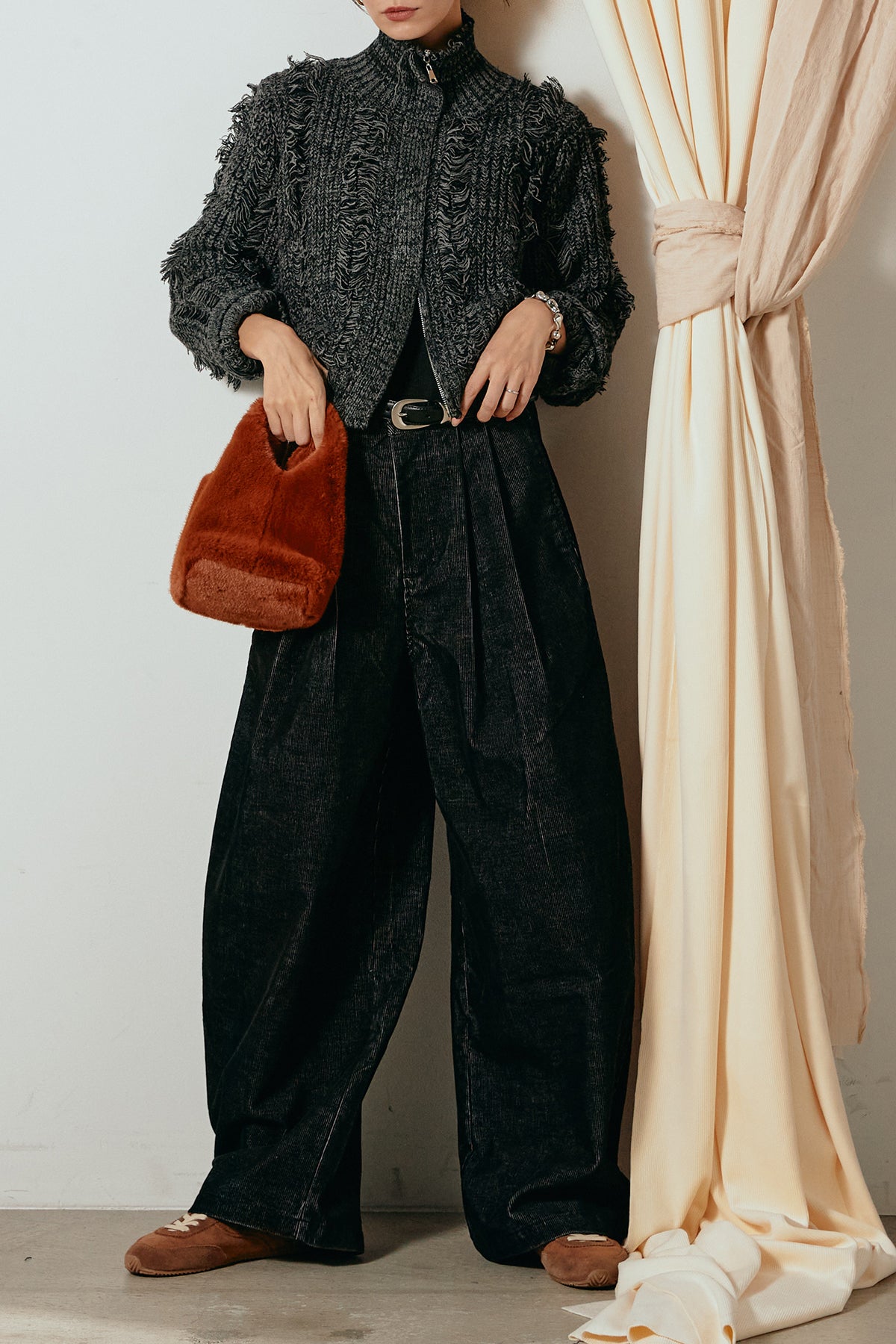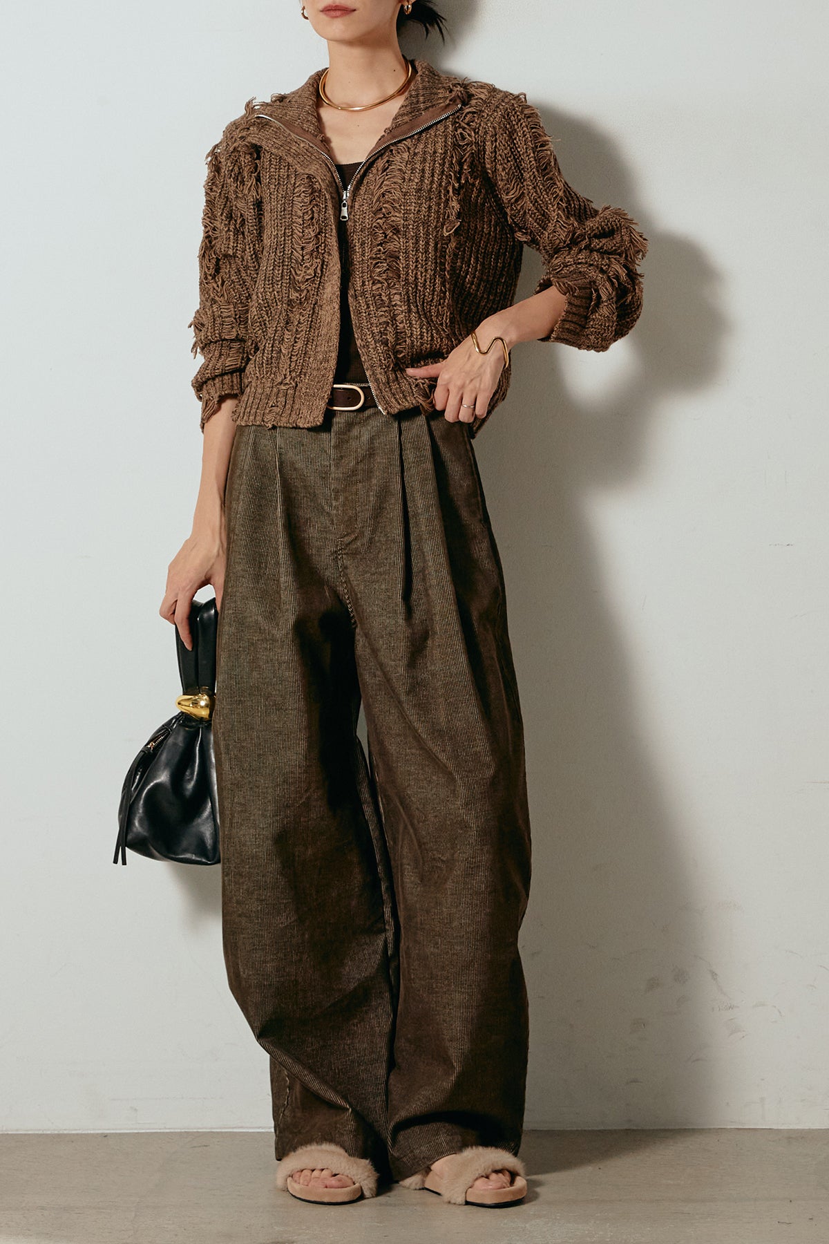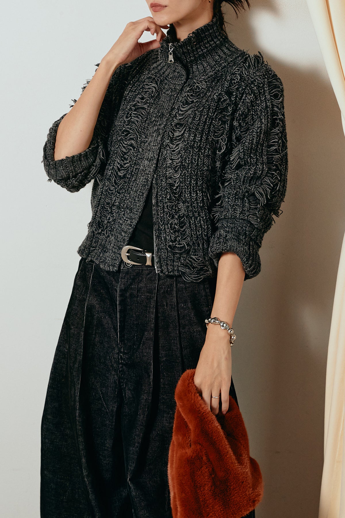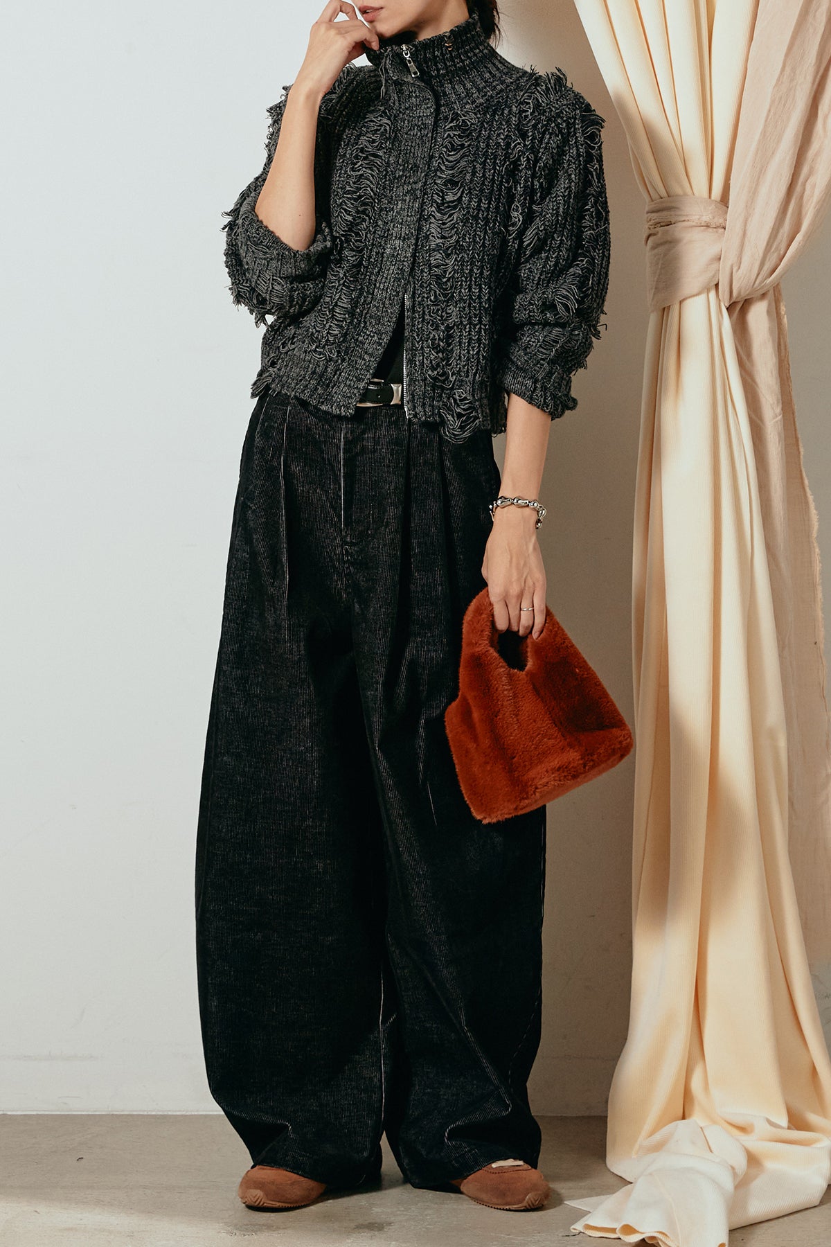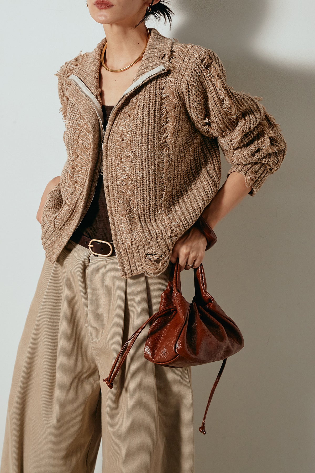 立体的なフリンジ編みがポイントのハイネックジップニットトップス。 ざっくりとしたリブ編みとフリンジの組み合わせで、程よい存在感を演出。 フロントジップ仕様なので着脱もスムーズで、開けてカーディガンのようにも着用可能。 ショート丈のすっきりとしたシルエットがボリュームのあるボトムスとも好相性で、秋冬のスタイリングにニュアンスを添える一枚です。
