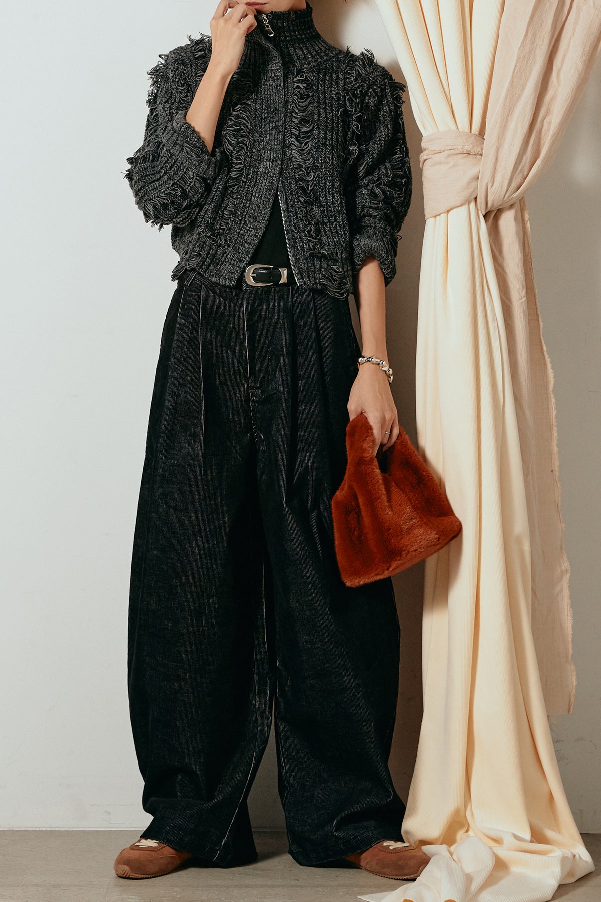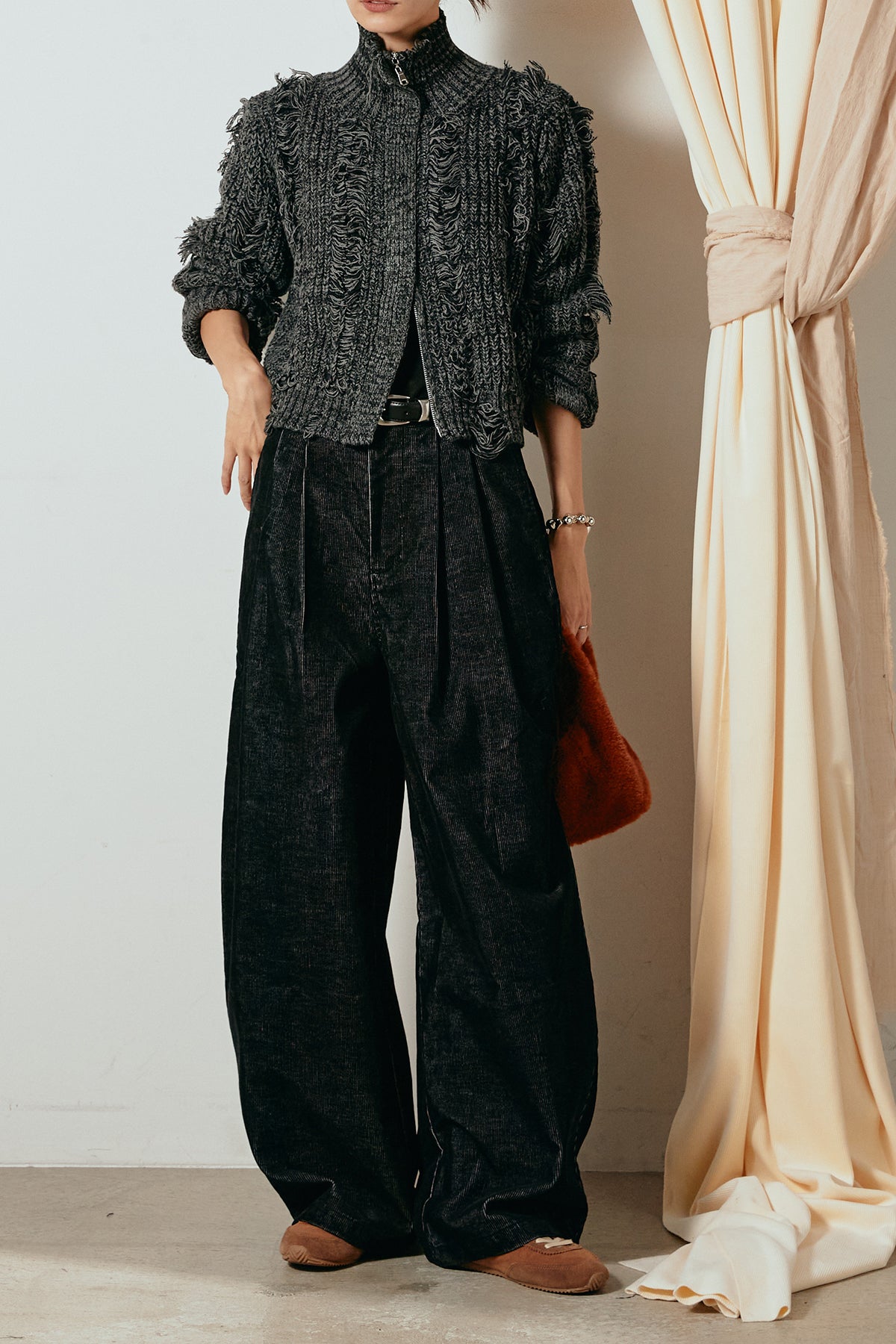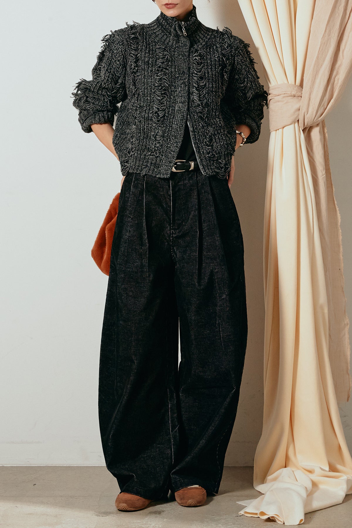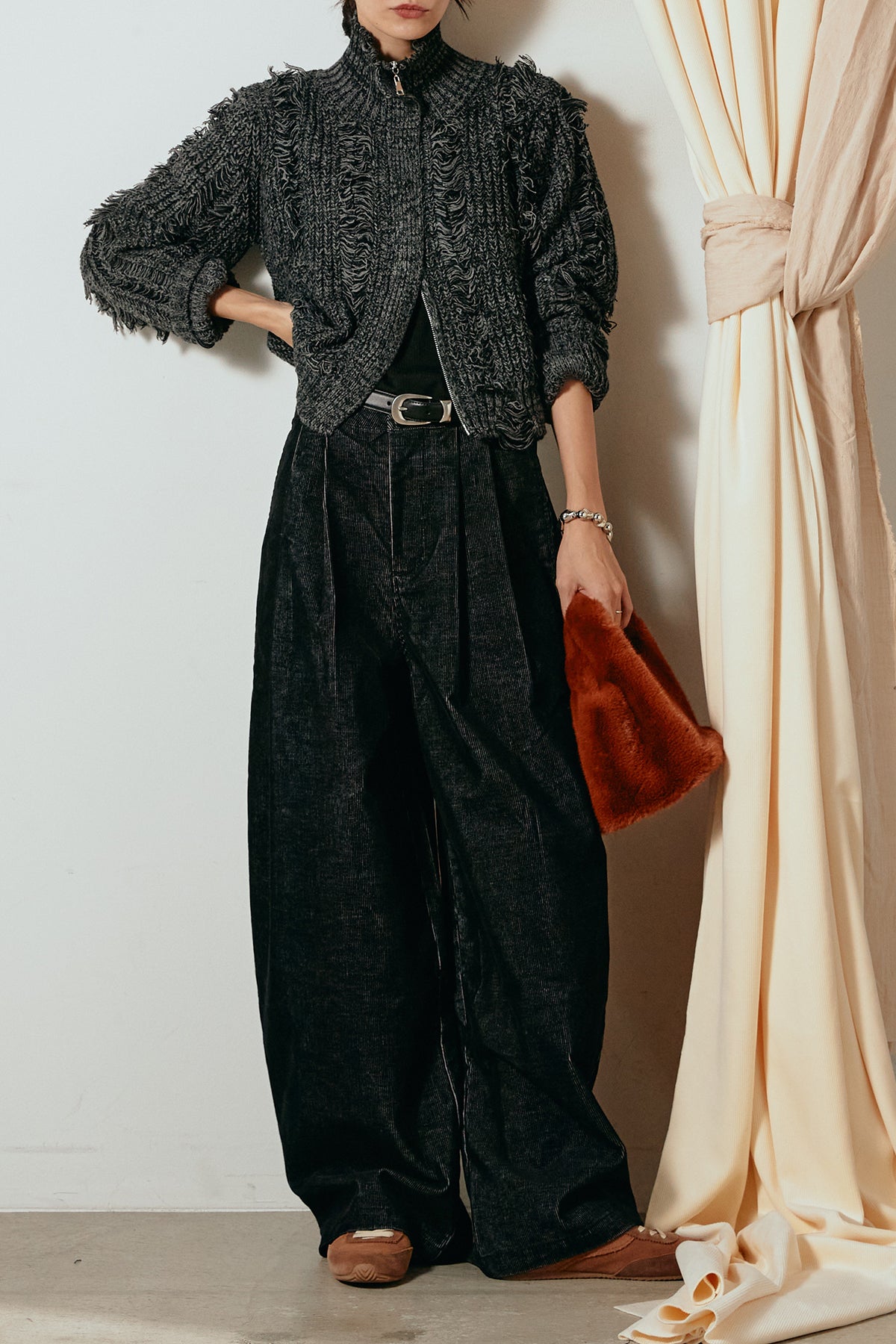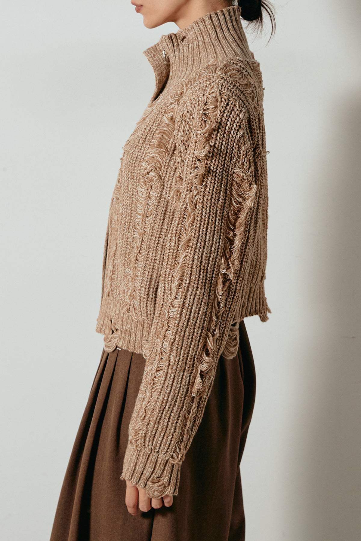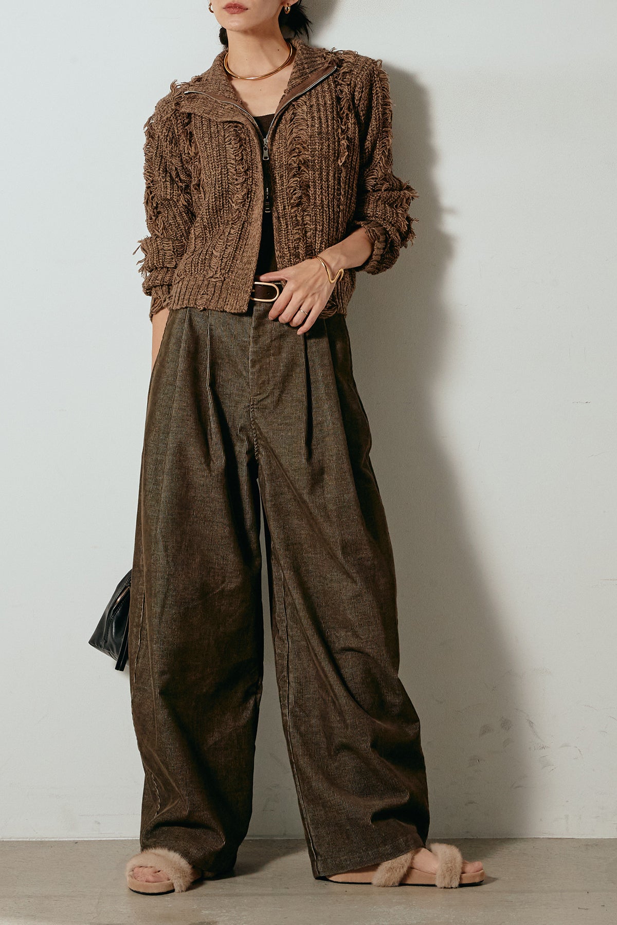 立体的なフリンジ編みがポイントのハイネックジップニットトップス。 ざっくりとしたリブ編みとフリンジの組み合わせで、程よい存在感を演出。 フロントジップ仕様なので着脱もスムーズで、開けてカーディガンのようにも着用可能。 ショート丈のすっきりとしたシルエットがボリュームのあるボトムスとも好相性で、秋冬のスタイリングにニュアンスを添える一枚です。