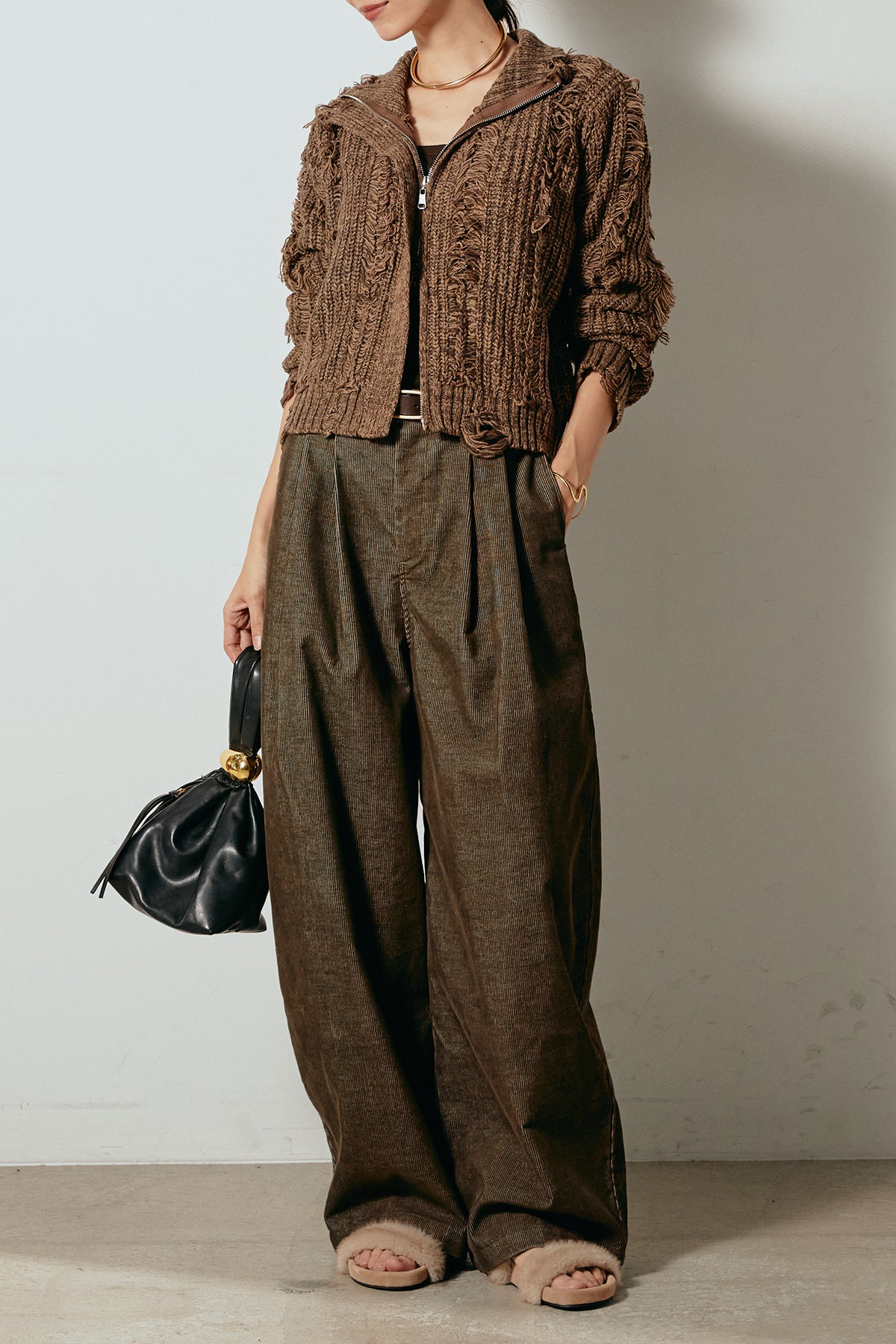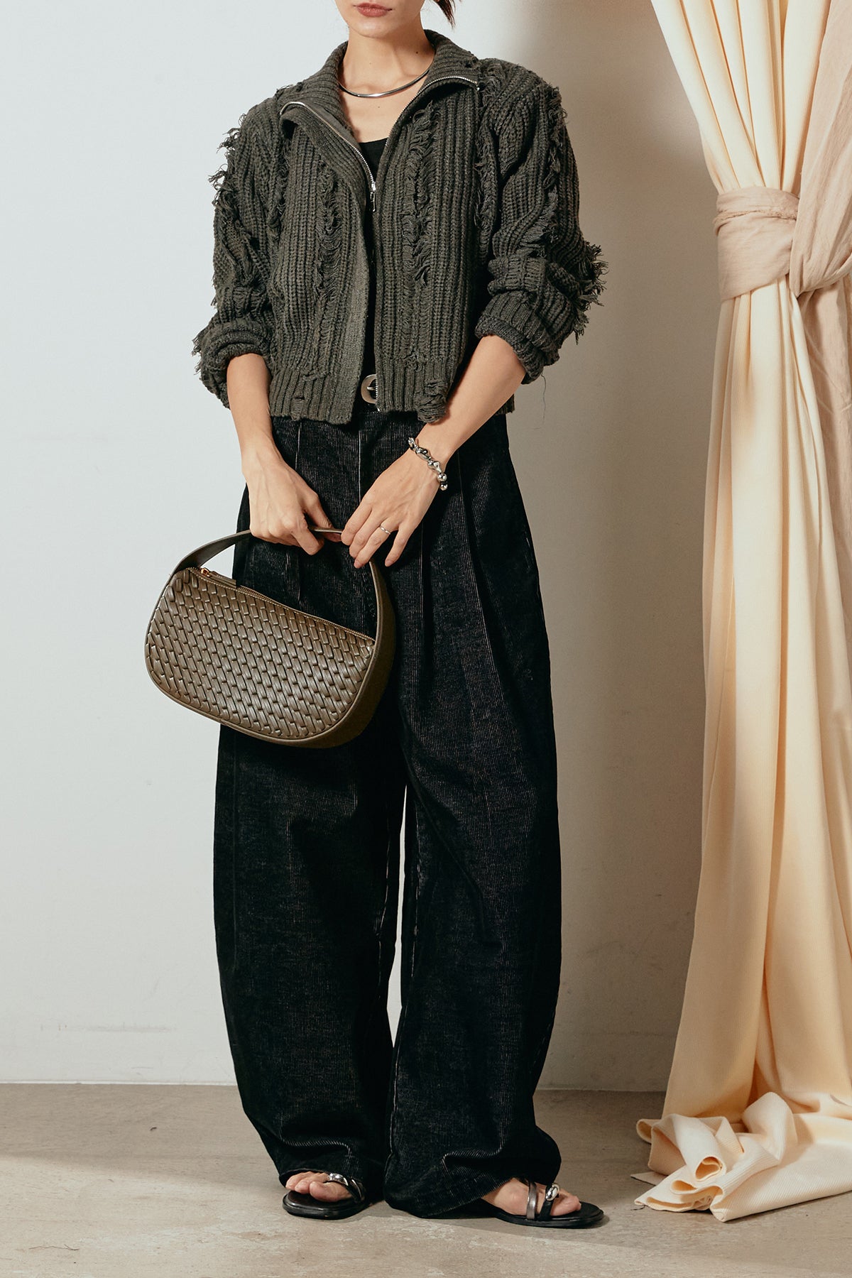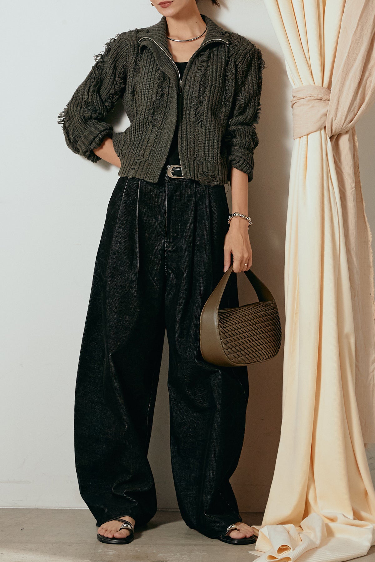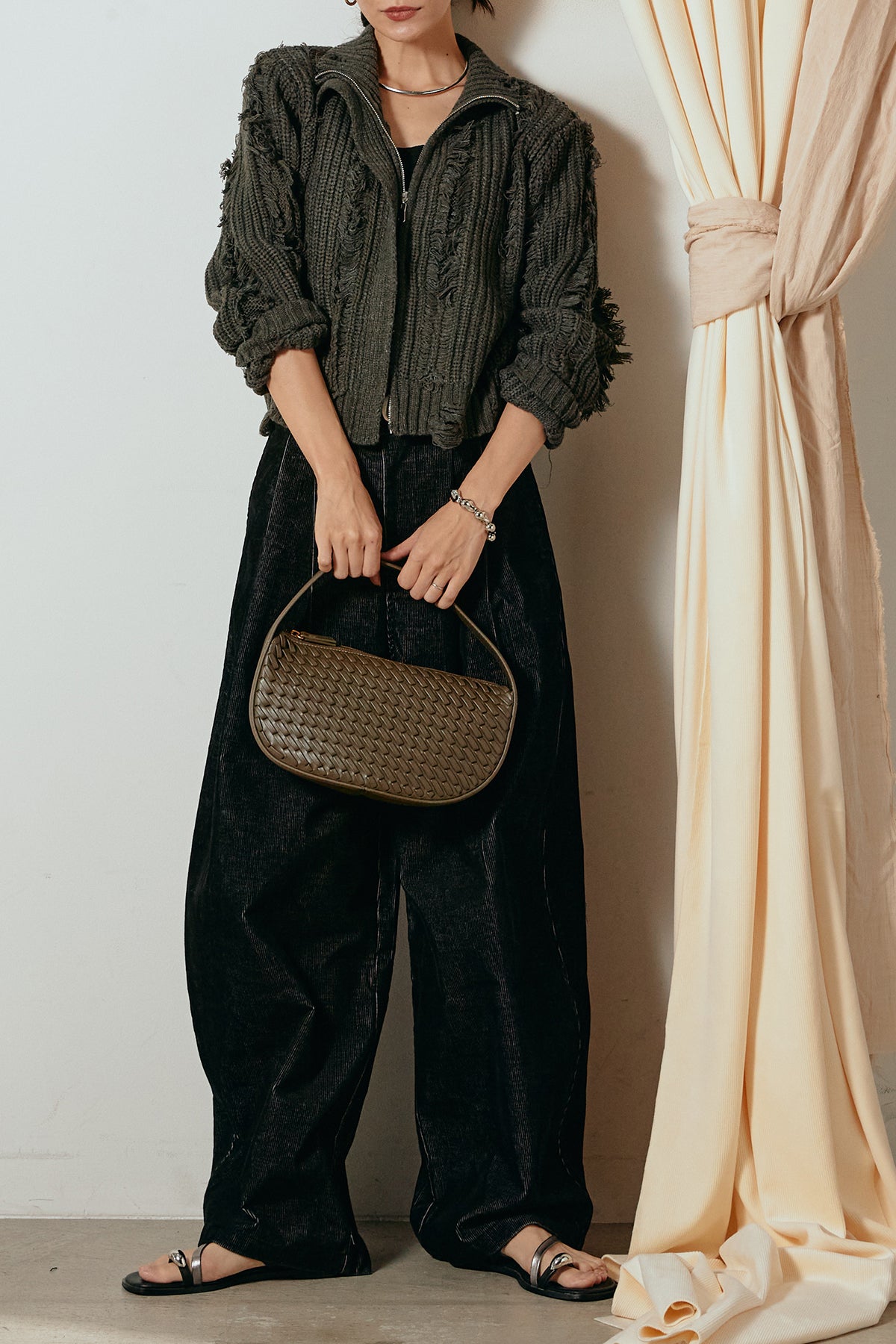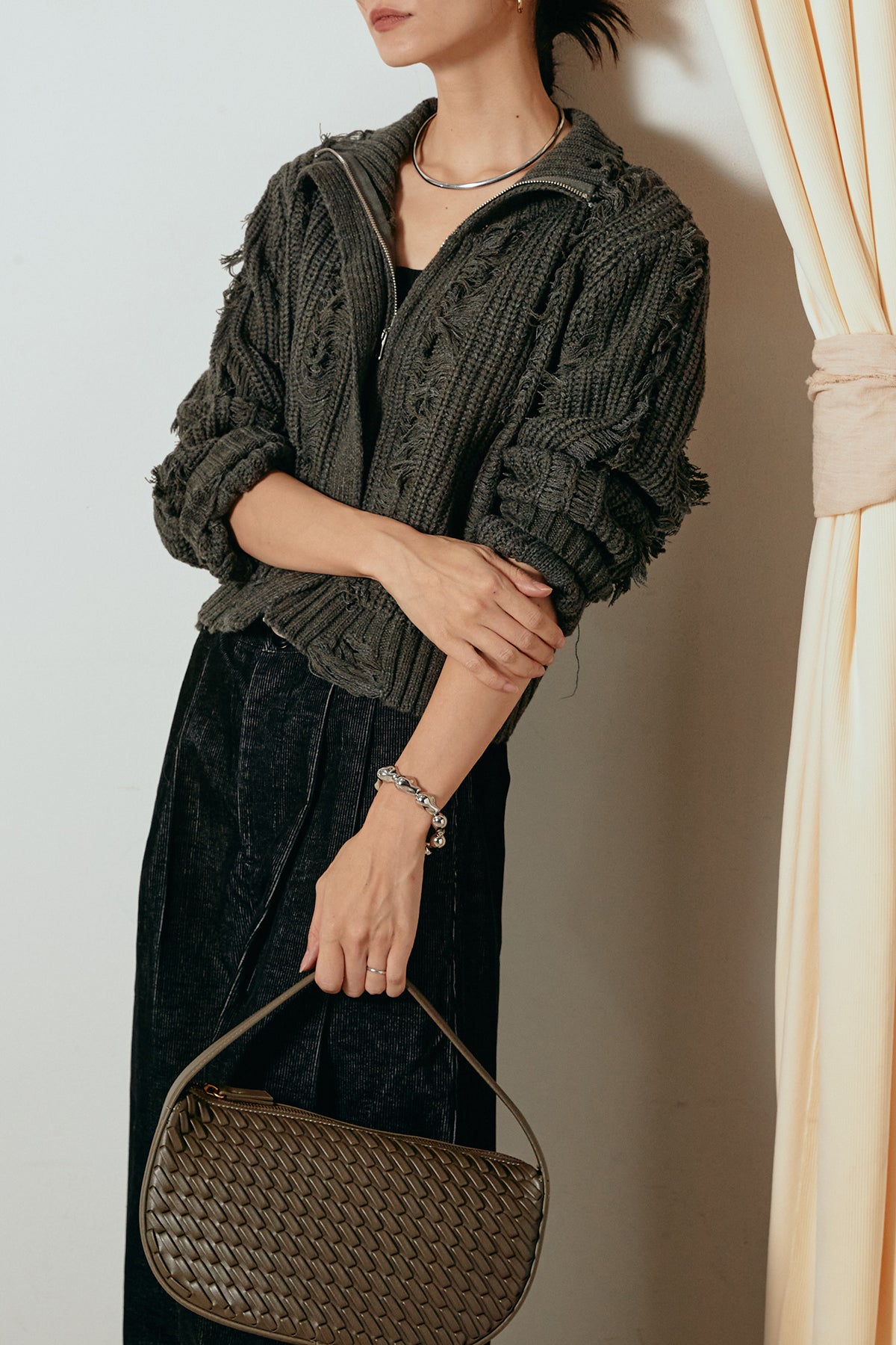 立体的なフリンジ編みがポイントのハイネックジップニットトップス。 ざっくりとしたリブ編みとフリンジの組み合わせで、程よい存在感を演出。 フロントジップ仕様なので着脱もスムーズで、開けてカーディガンのようにも着用可能。 ショート丈のすっきりとしたシルエットがボリュームのあるボトムスとも好相性で、秋冬のスタイリングにニュアンスを添える一枚です。