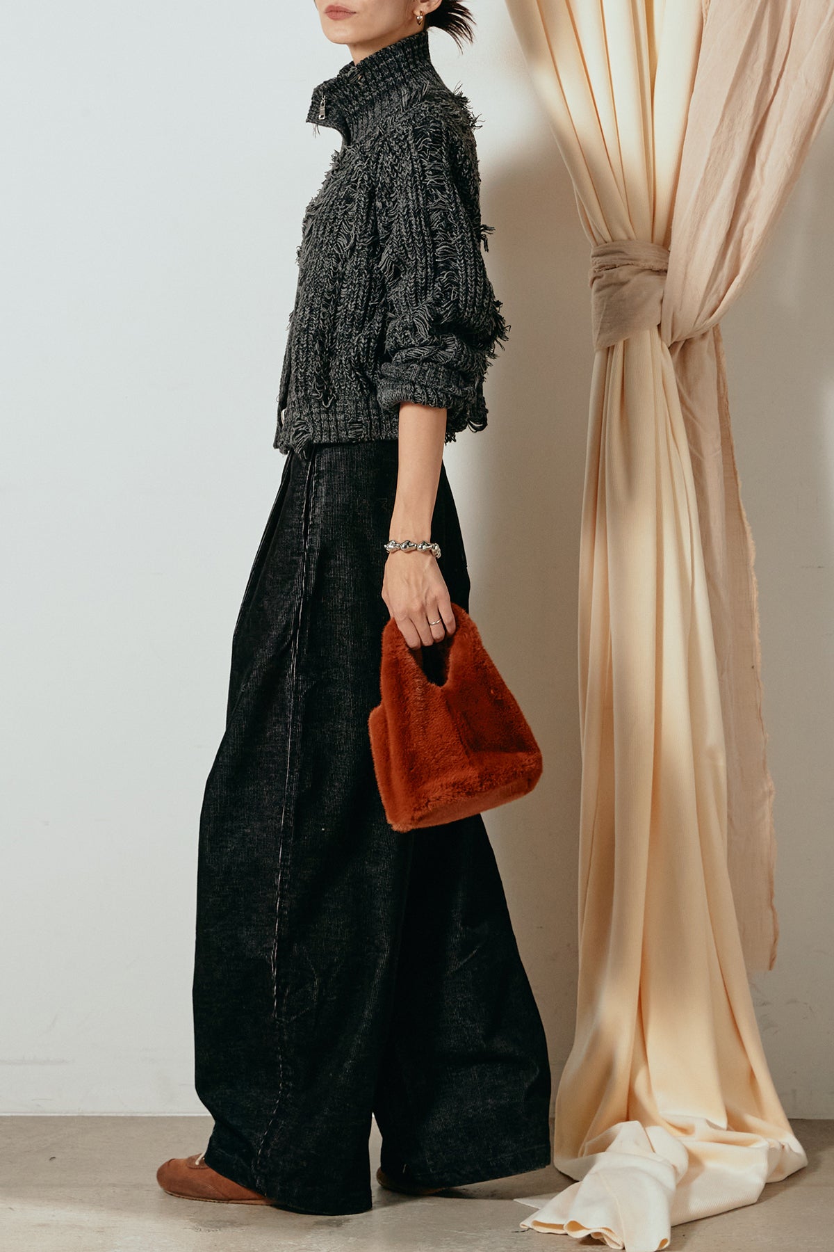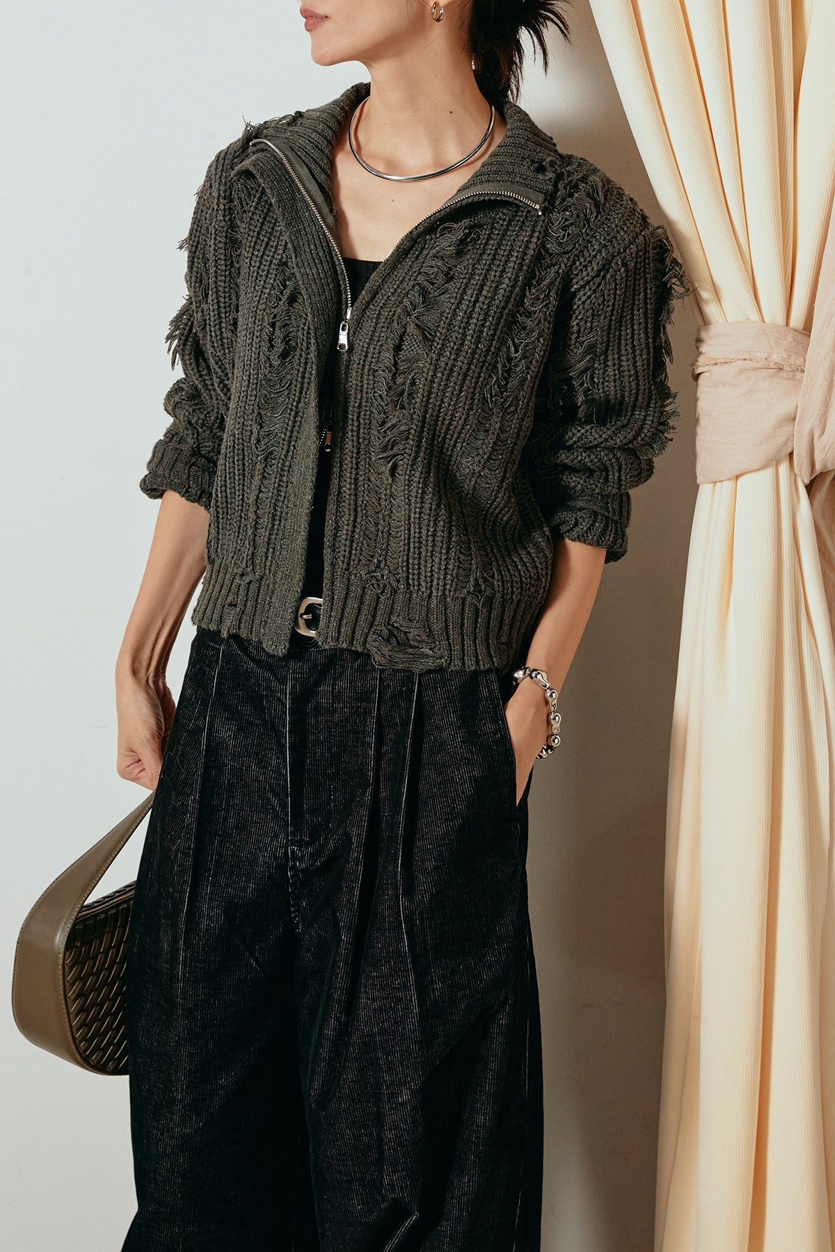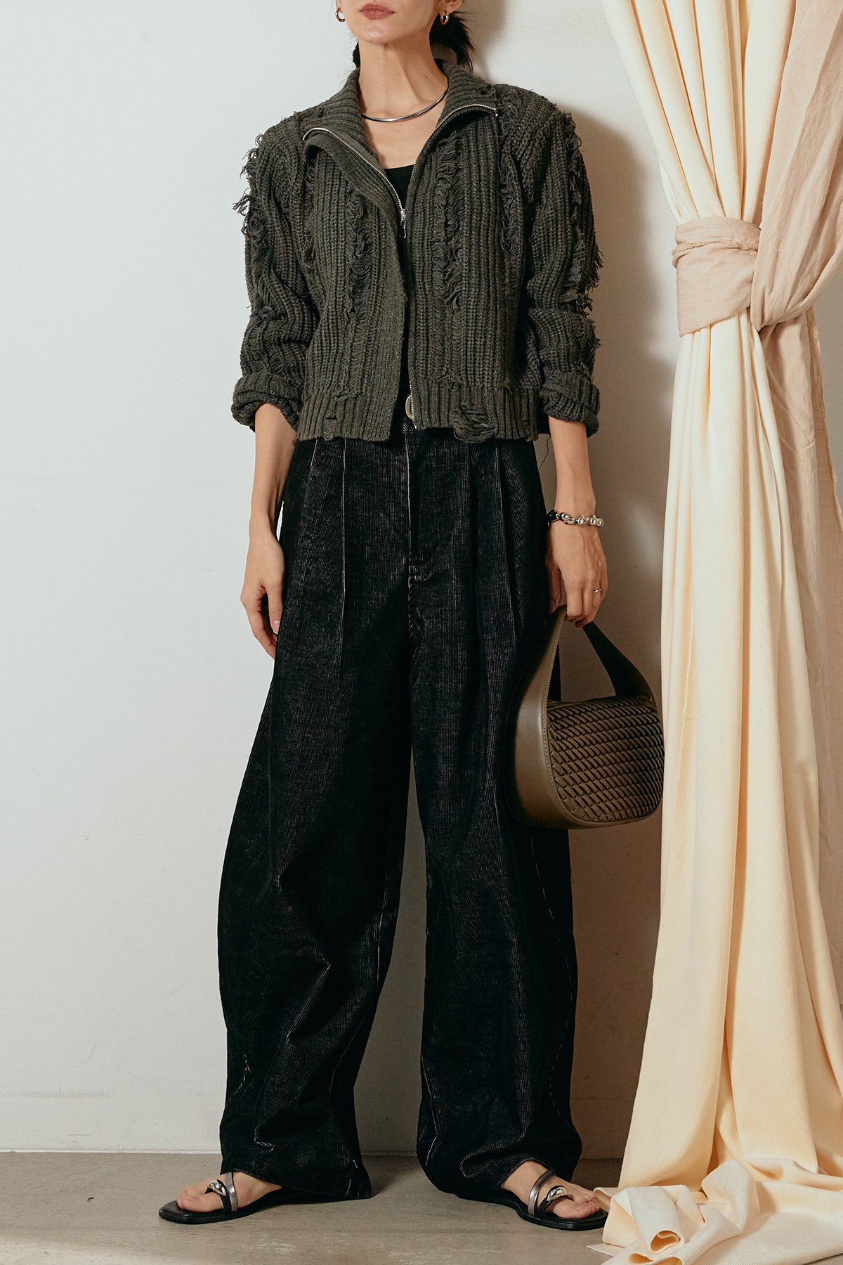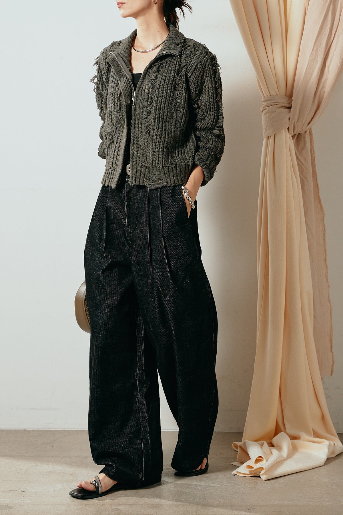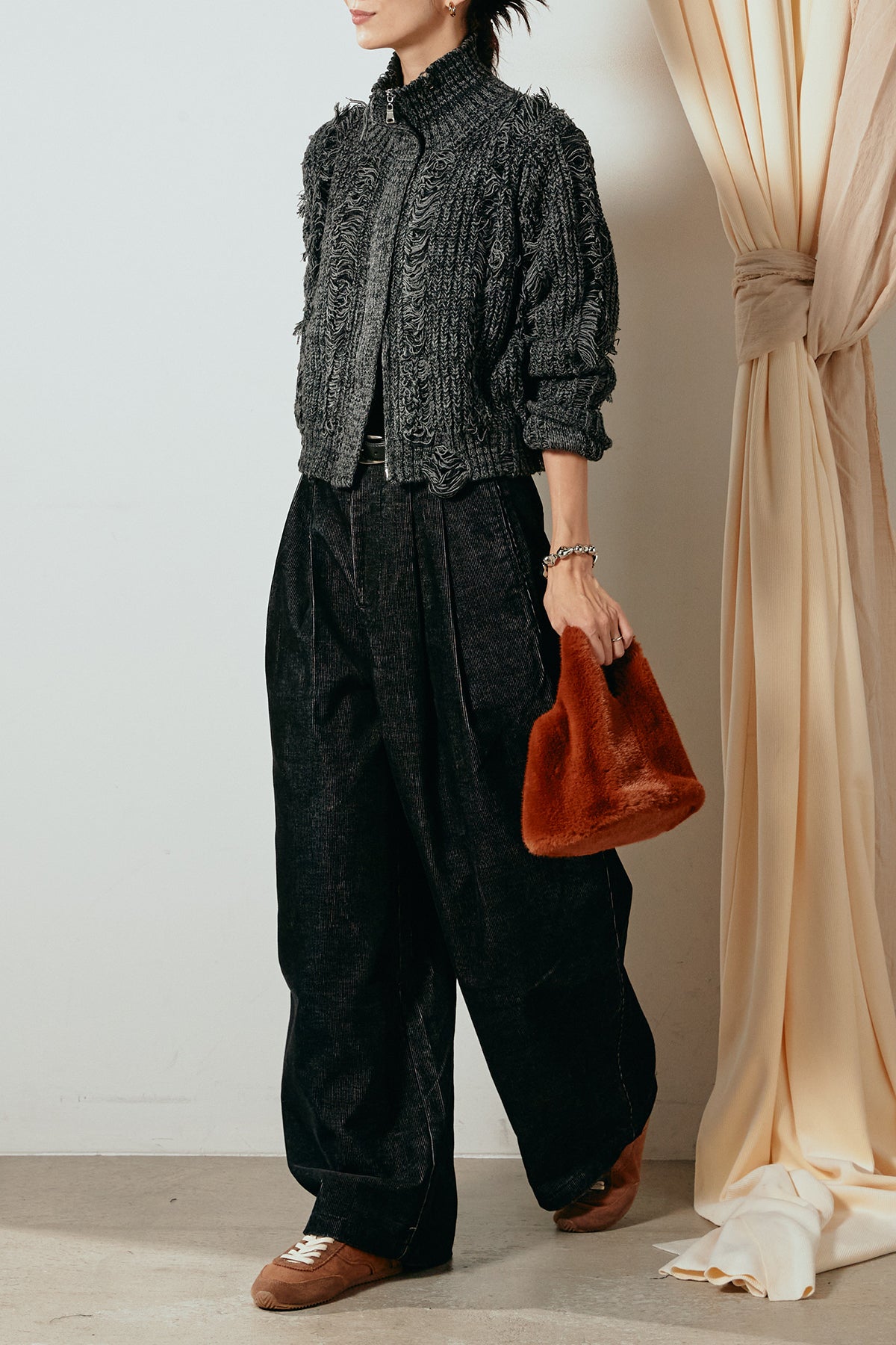 立体的なフリンジ編みがポイントのハイネックジップニットトップス。 ざっくりとしたリブ編みとフリンジの組み合わせで、程よい存在感を演出。 フロントジップ仕様なので着脱もスムーズで、開けてカーディガンのようにも着用可能。 ショート丈のすっきりとしたシルエットがボリュームのあるボトムスとも好相性で、秋冬のスタイリングにニュアンスを添える一枚です。