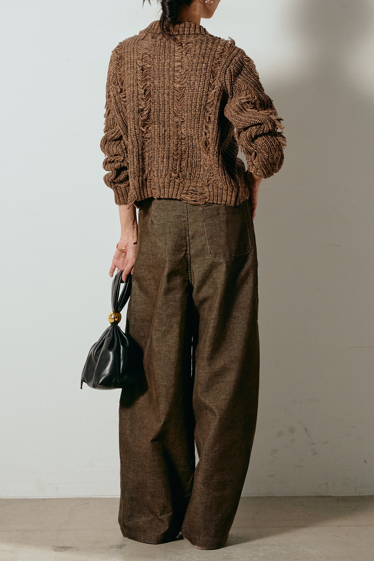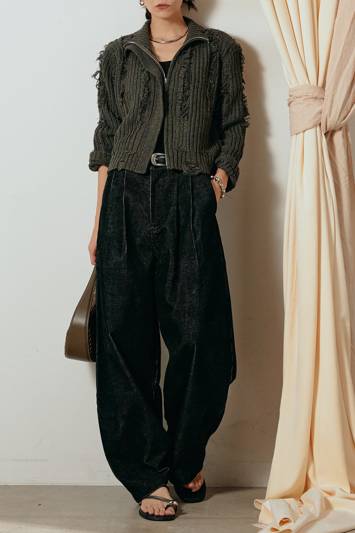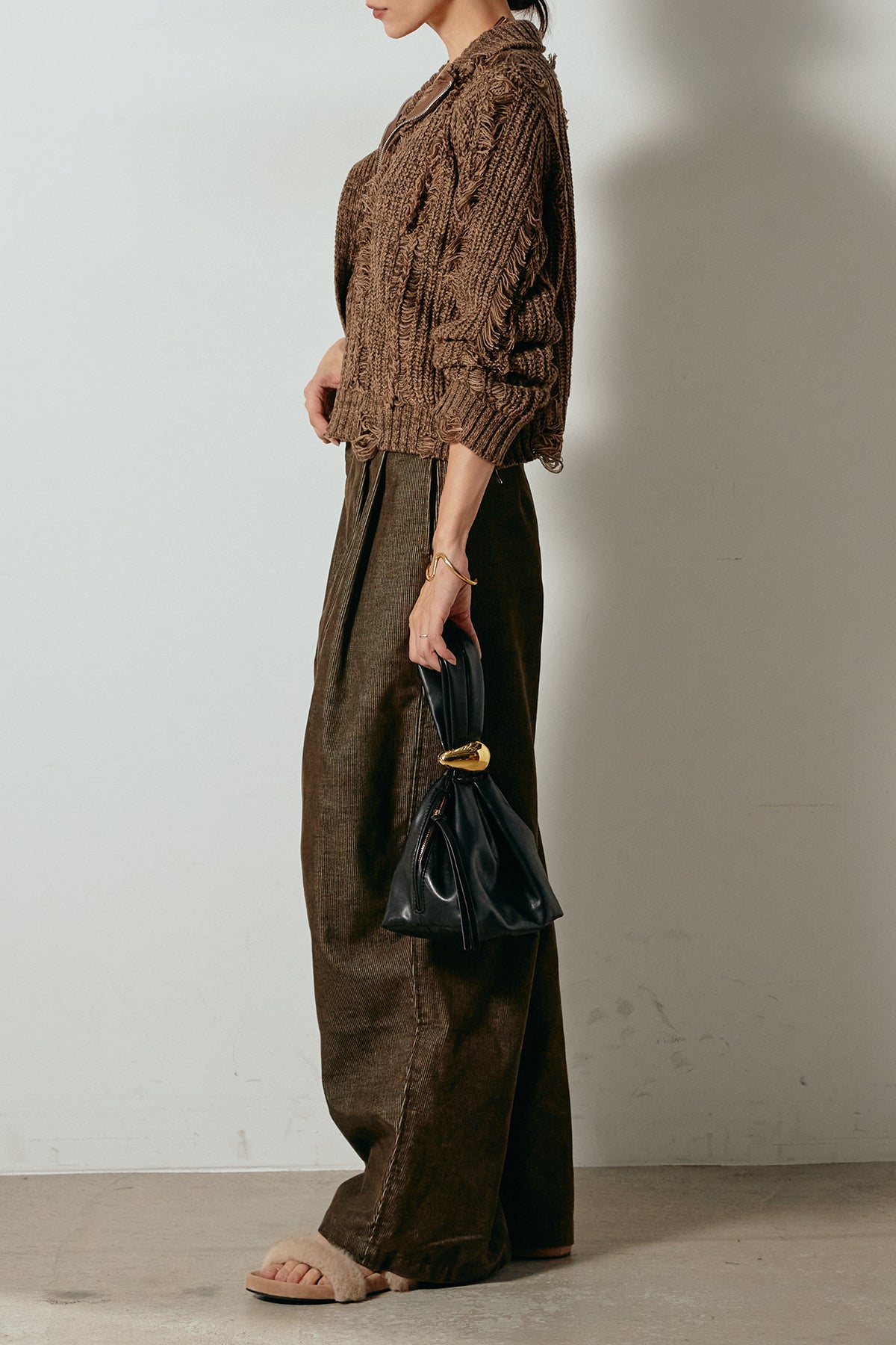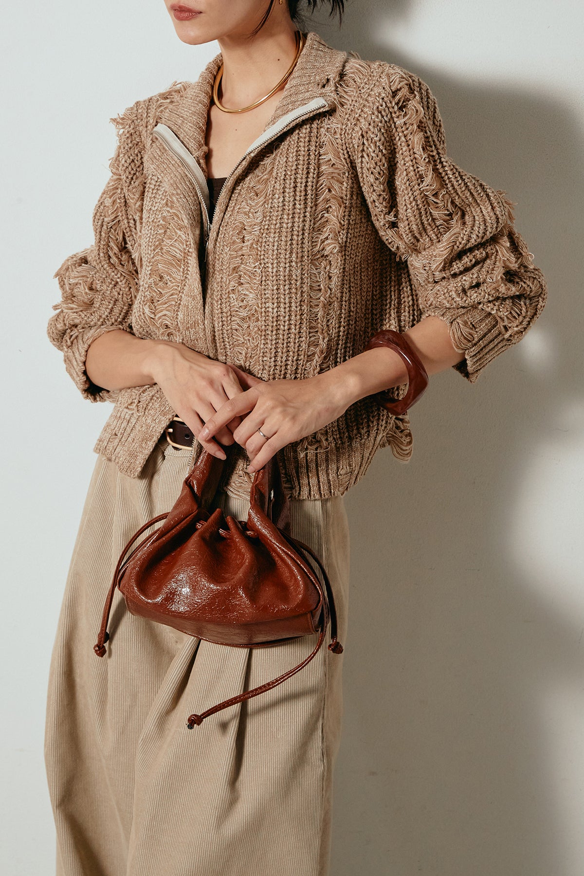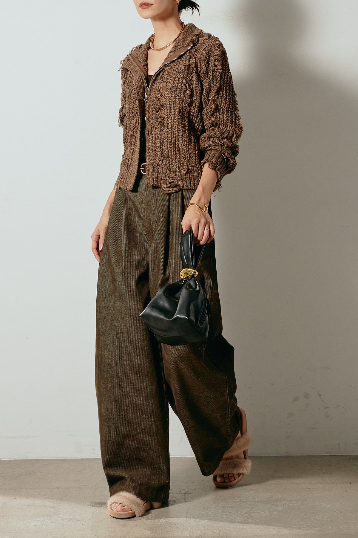 立体的なフリンジ編みがポイントのハイネックジップニットトップス。 ざっくりとしたリブ編みとフリンジの組み合わせで、程よい存在感を演出。 フロントジップ仕様なので着脱もスムーズで、開けてカーディガンのようにも着用可能。 ショート丈のすっきりとしたシルエットがボリュームのあるボトムスとも好相性で、秋冬のスタイリングにニュアンスを添える一枚です。