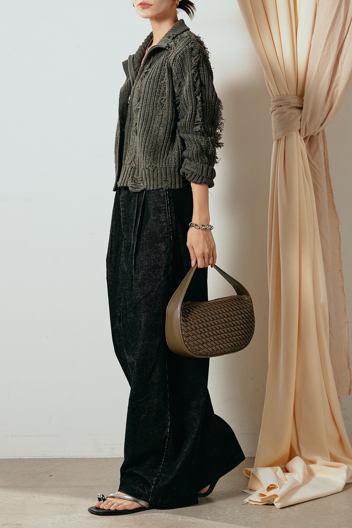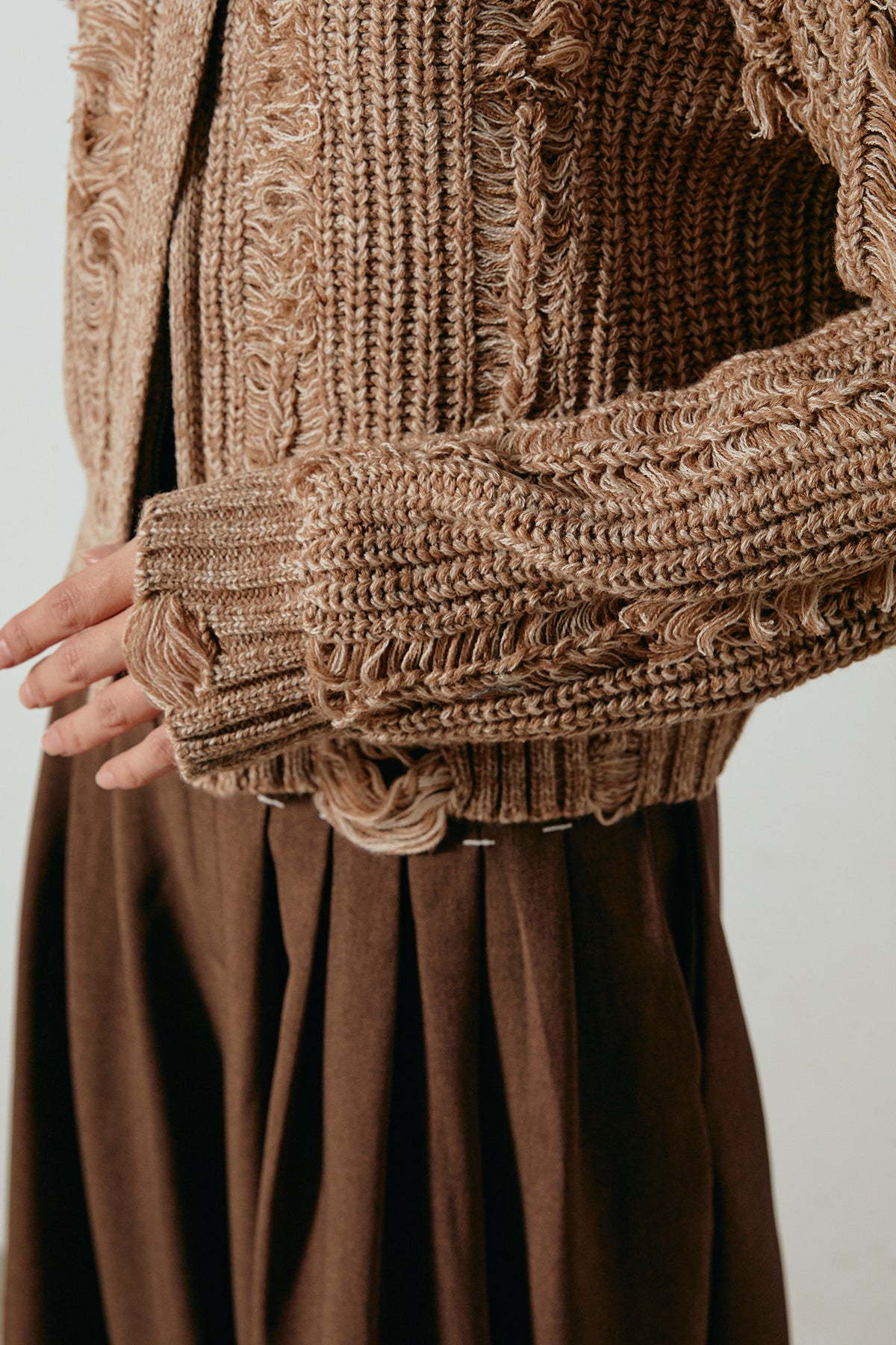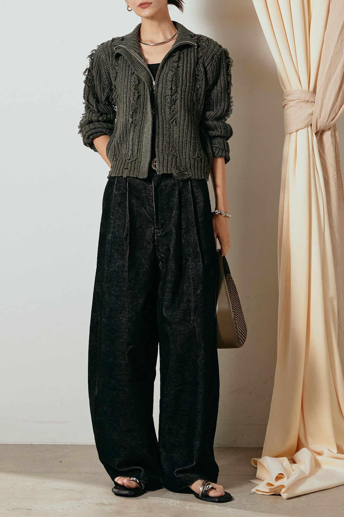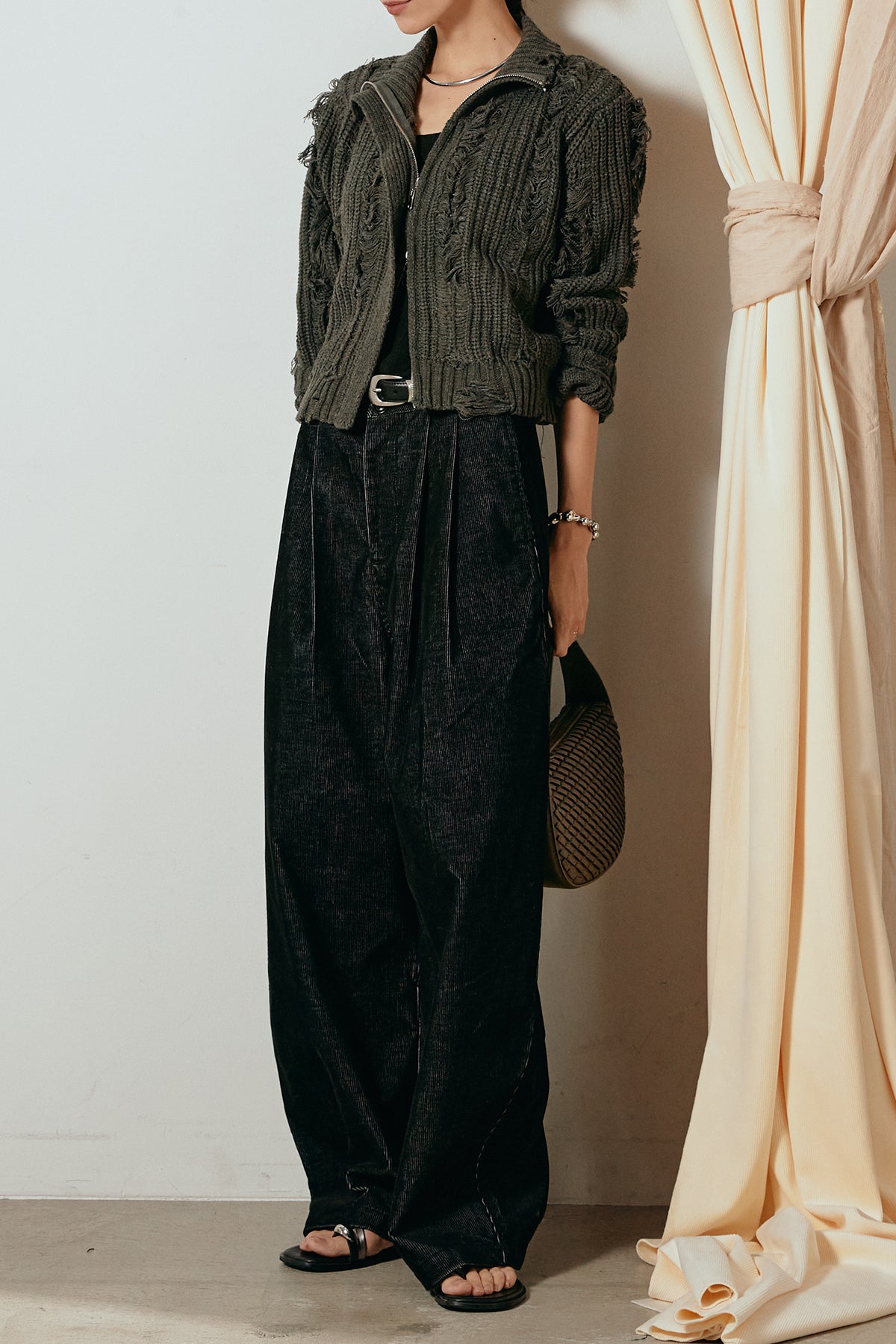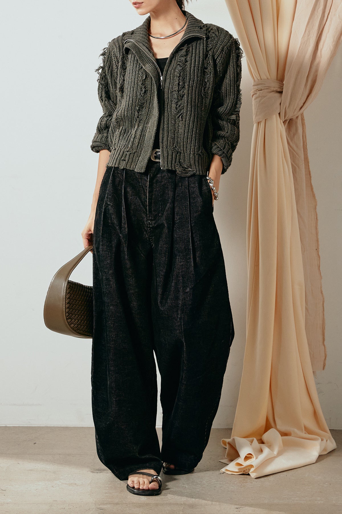 立体的なフリンジ編みがポイントのハイネックジップニットトップス。 ざっくりとしたリブ編みとフリンジの組み合わせで、程よい存在感を演出。 フロントジップ仕様なので着脱もスムーズで、開けてカーディガンのようにも着用可能。 ショート丈のすっきりとしたシルエットがボリュームのあるボトムスとも好相性で、秋冬のスタイリングにニュアンスを添える一枚です。