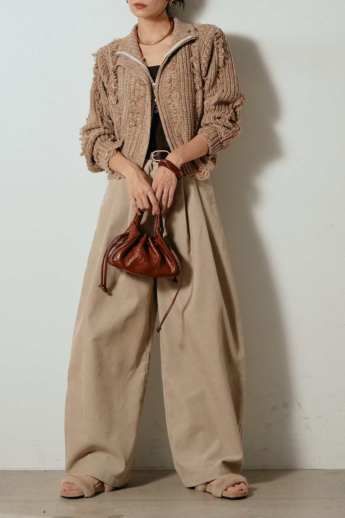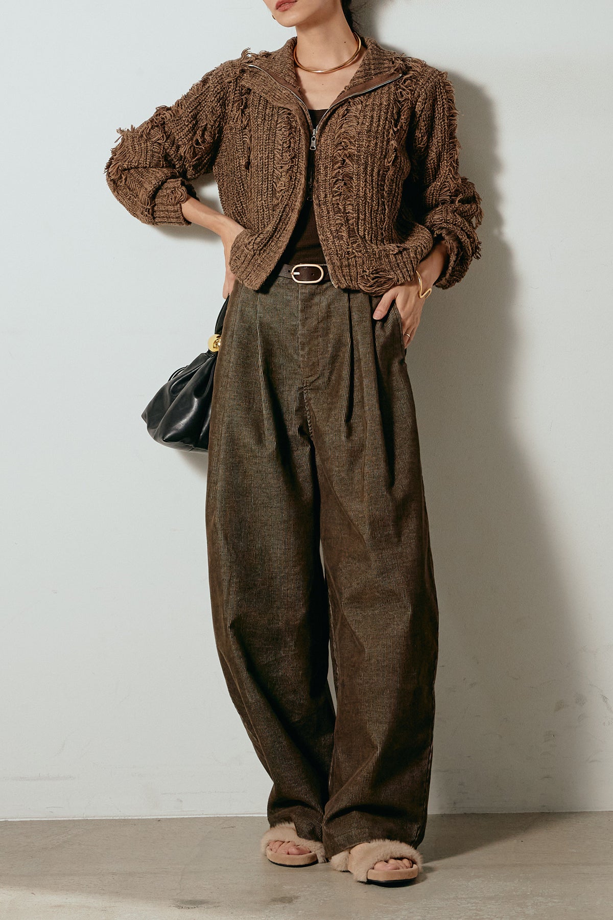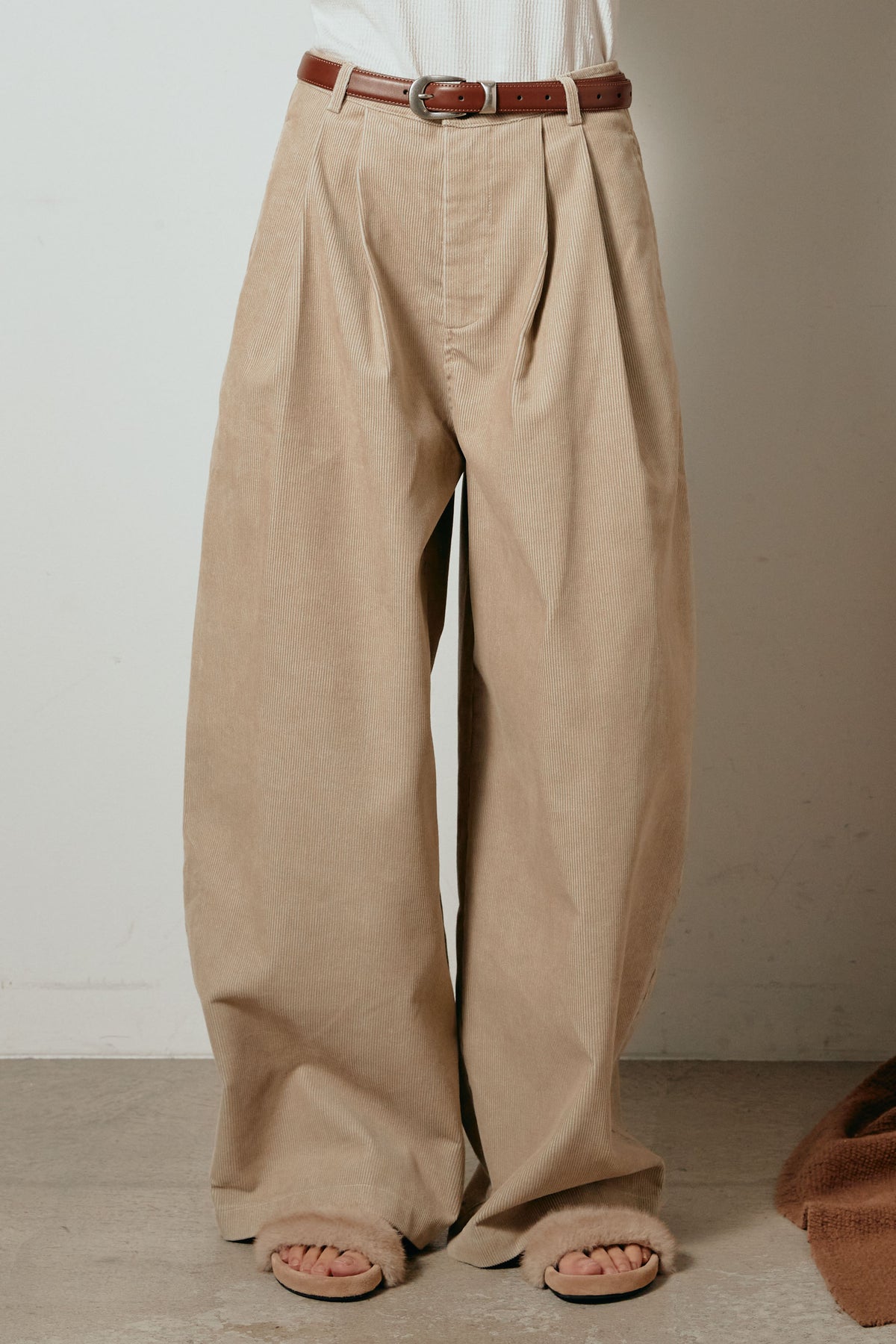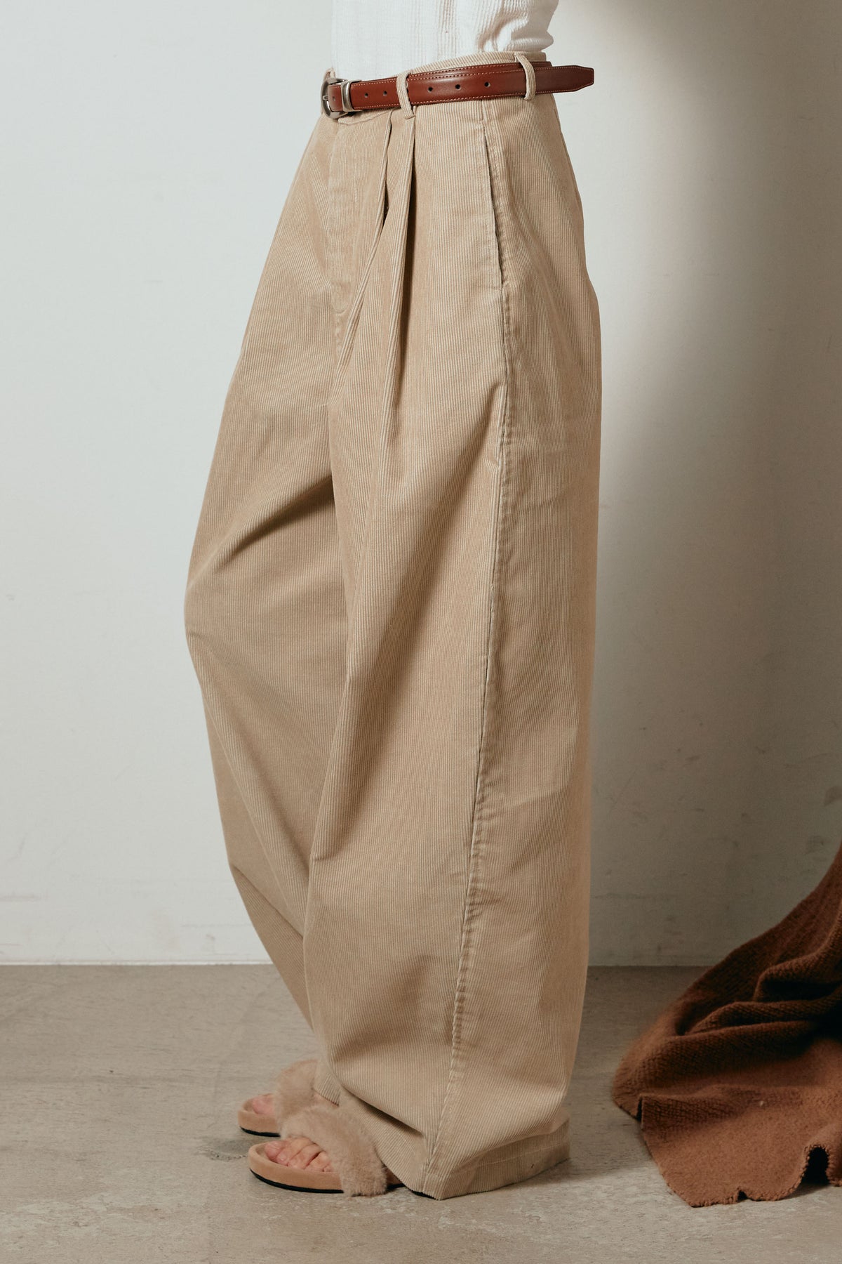 温かみのあるコーデュロイ素材を使用したフロントタックパンツ。程よくゆとりを持たせたワイドシルエットが体型を拾わず、リラクシーな印象に仕上げます。フロントのタックディテールが立体感を生み、脚長効果も◎。トップスをインしてウエストベルトをアクセントにする着こなしもおすすめ。秋冬らしい素材感で、カジュアルからきれいめまで幅広く活躍する一本です。