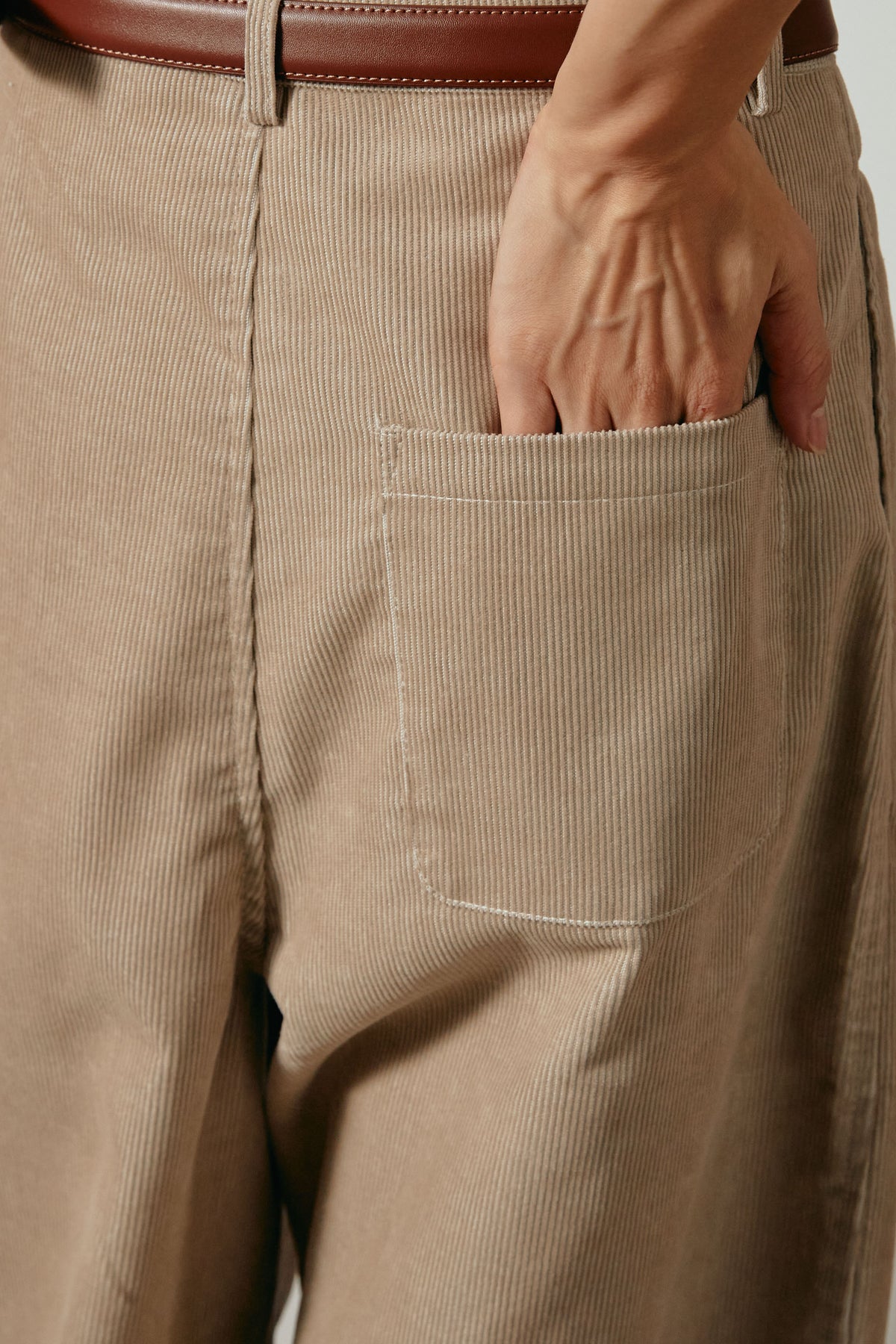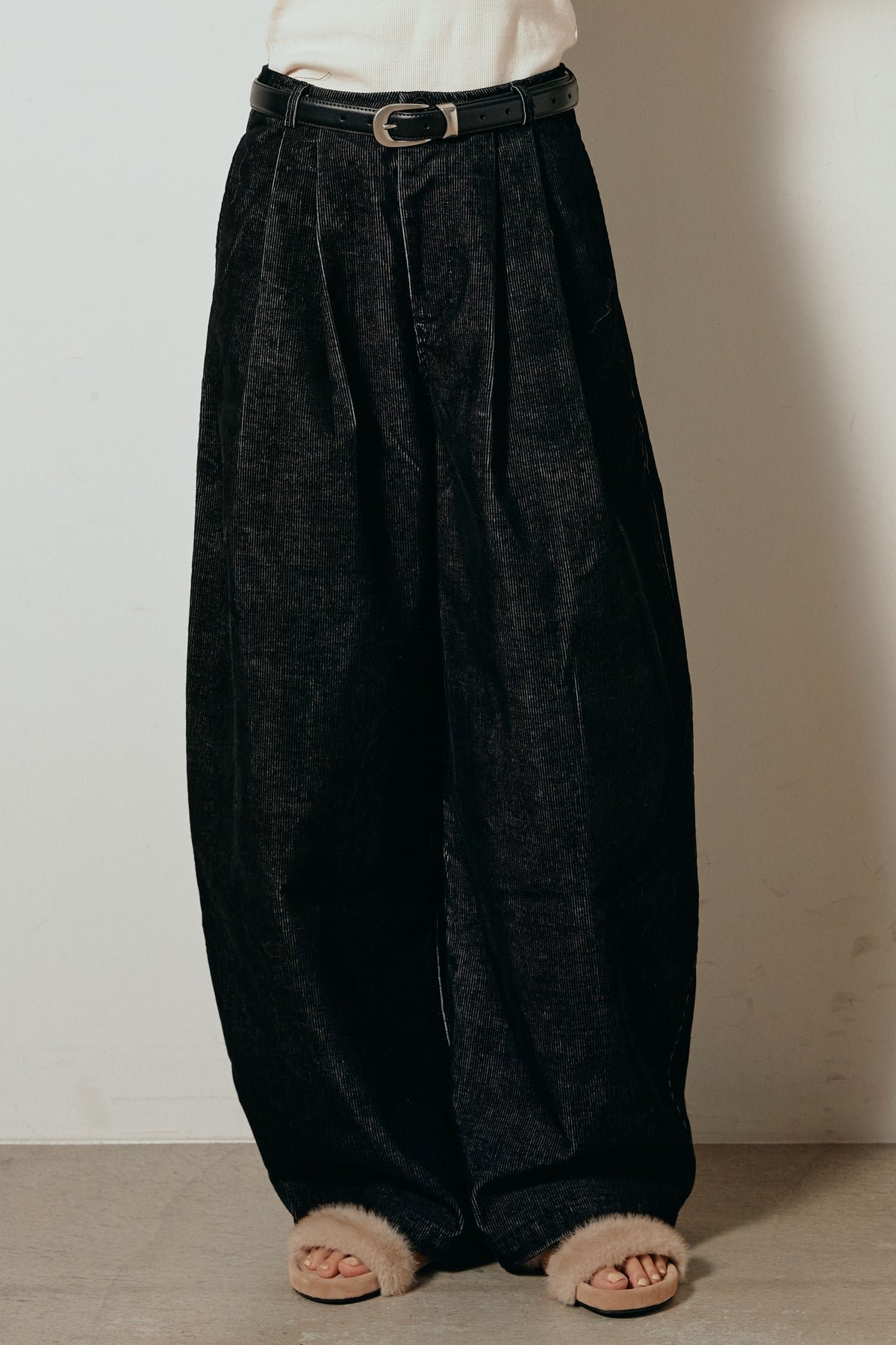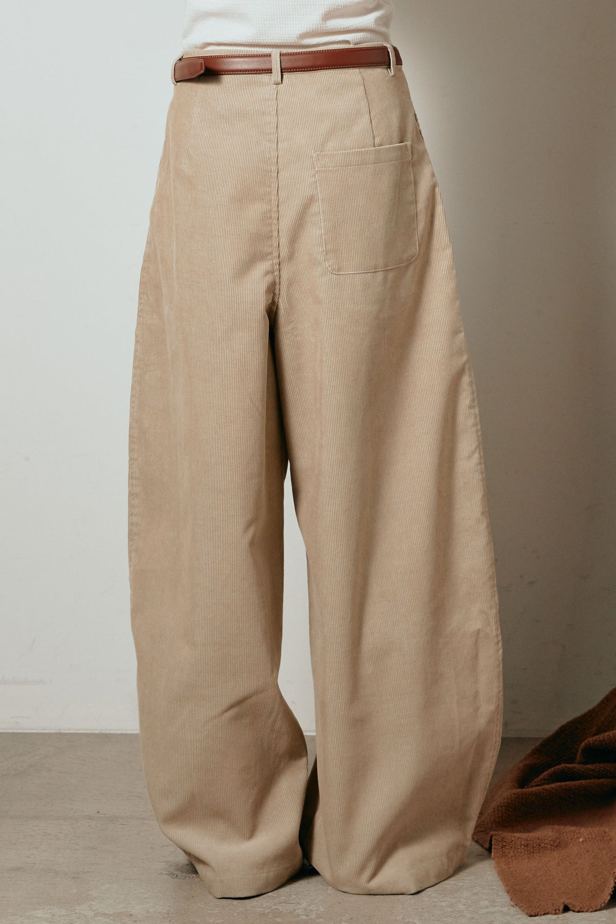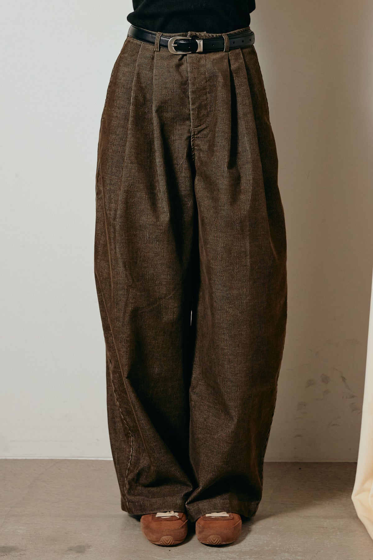温かみのあるコーデュロイ素材を使用したフロントタックパンツ。程よくゆとりを持たせたワイドシルエットが体型を拾わず、リラクシーな印象に仕上げます。フロントのタックディテールが立体感を生み、脚長効果も◎。トップスをインしてウエストベルトをアクセントにする着こなしもおすすめ。秋冬らしい素材感で、カジュアルからきれいめまで幅広く活躍する一本です。