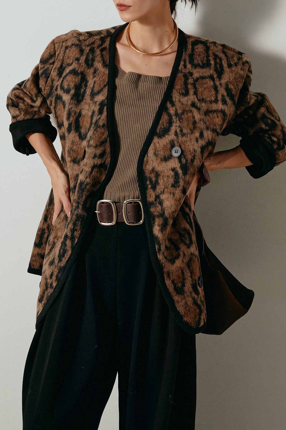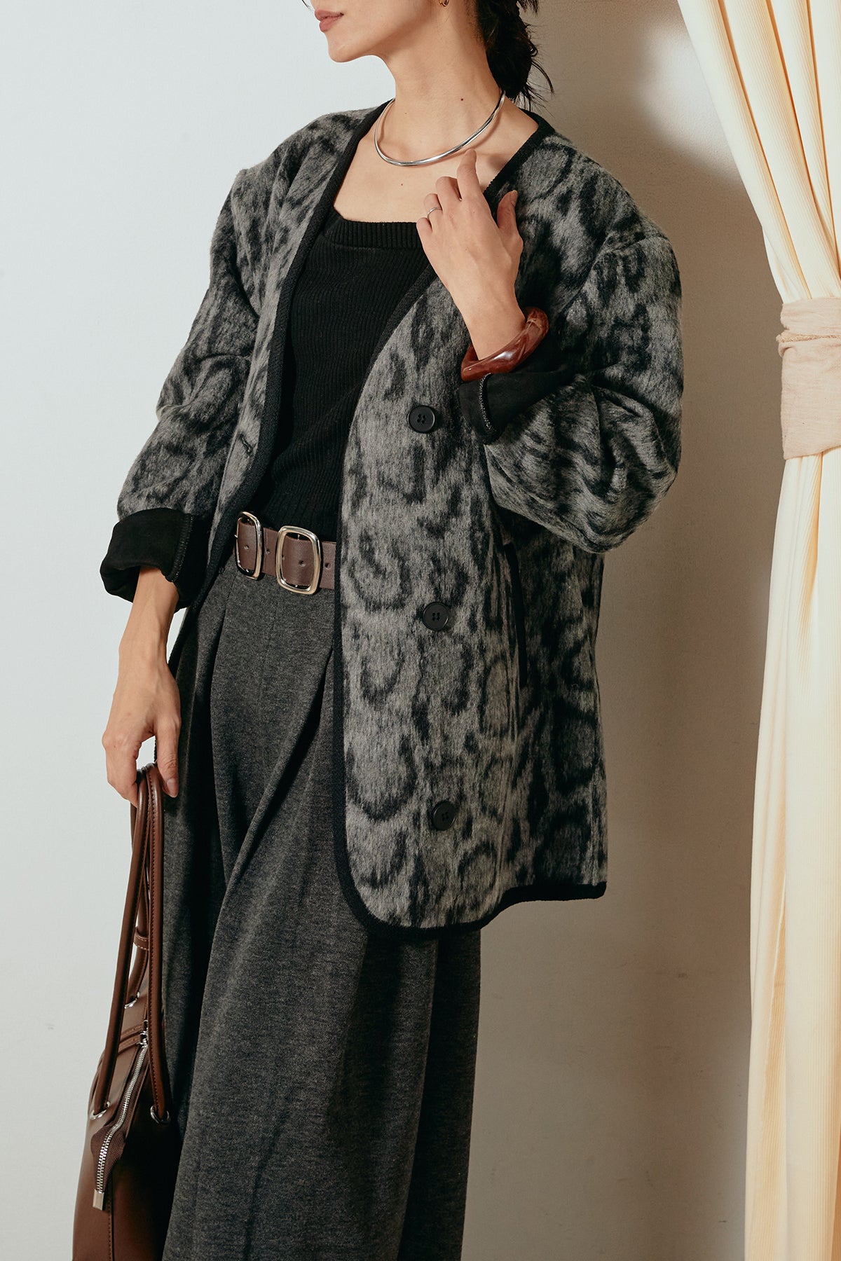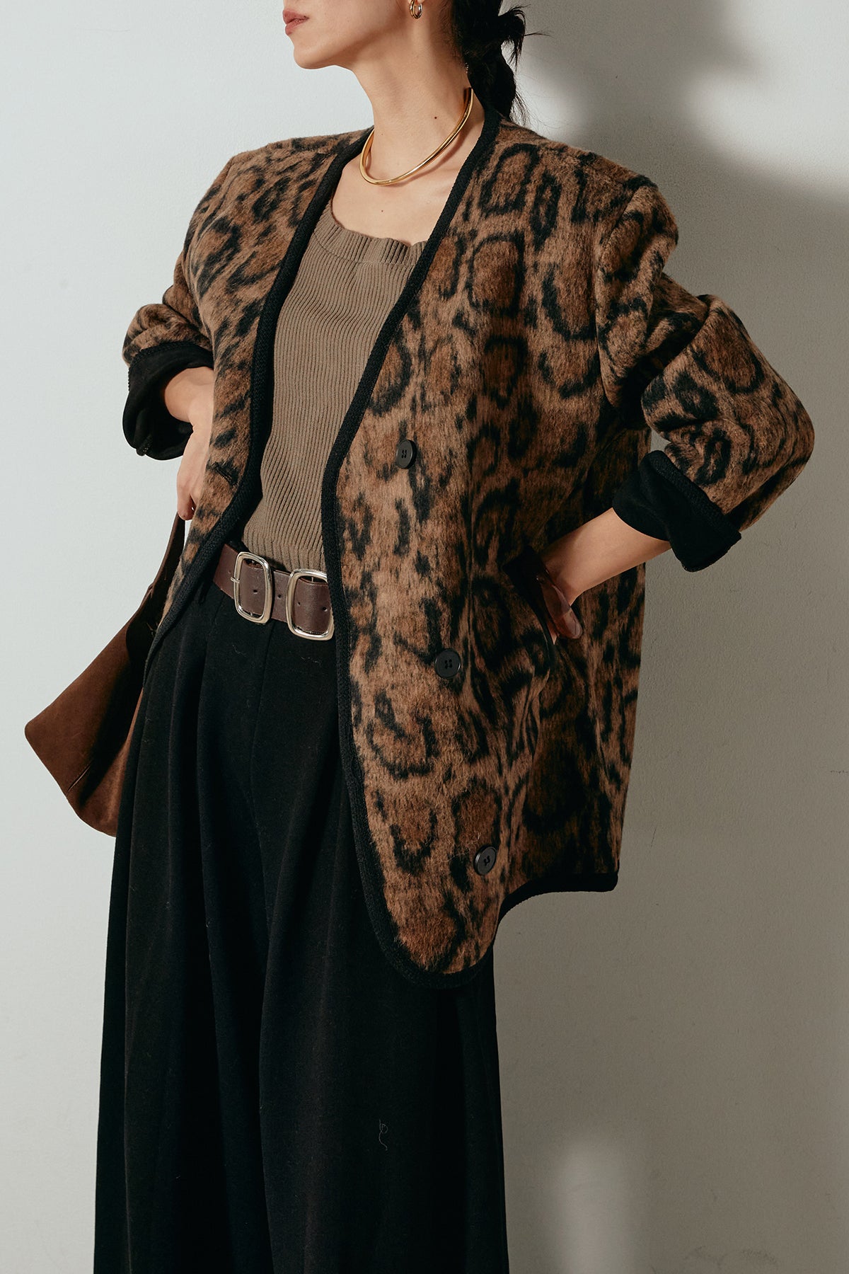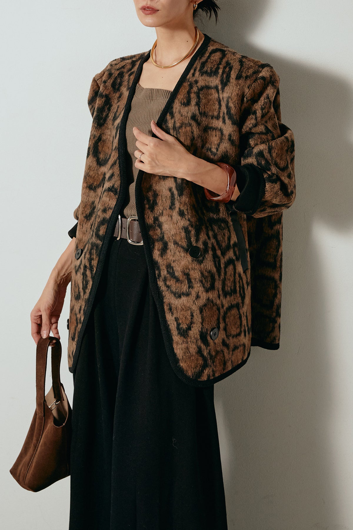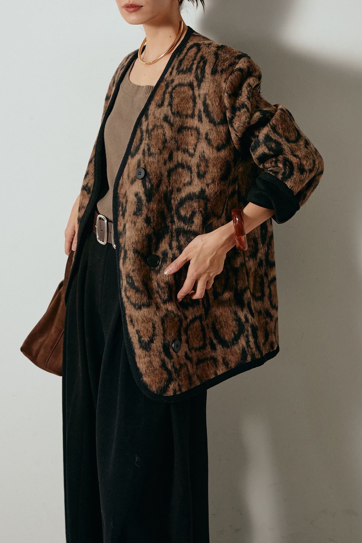 存在感のあるレオパード柄が目を惹くノーカラーアウター。