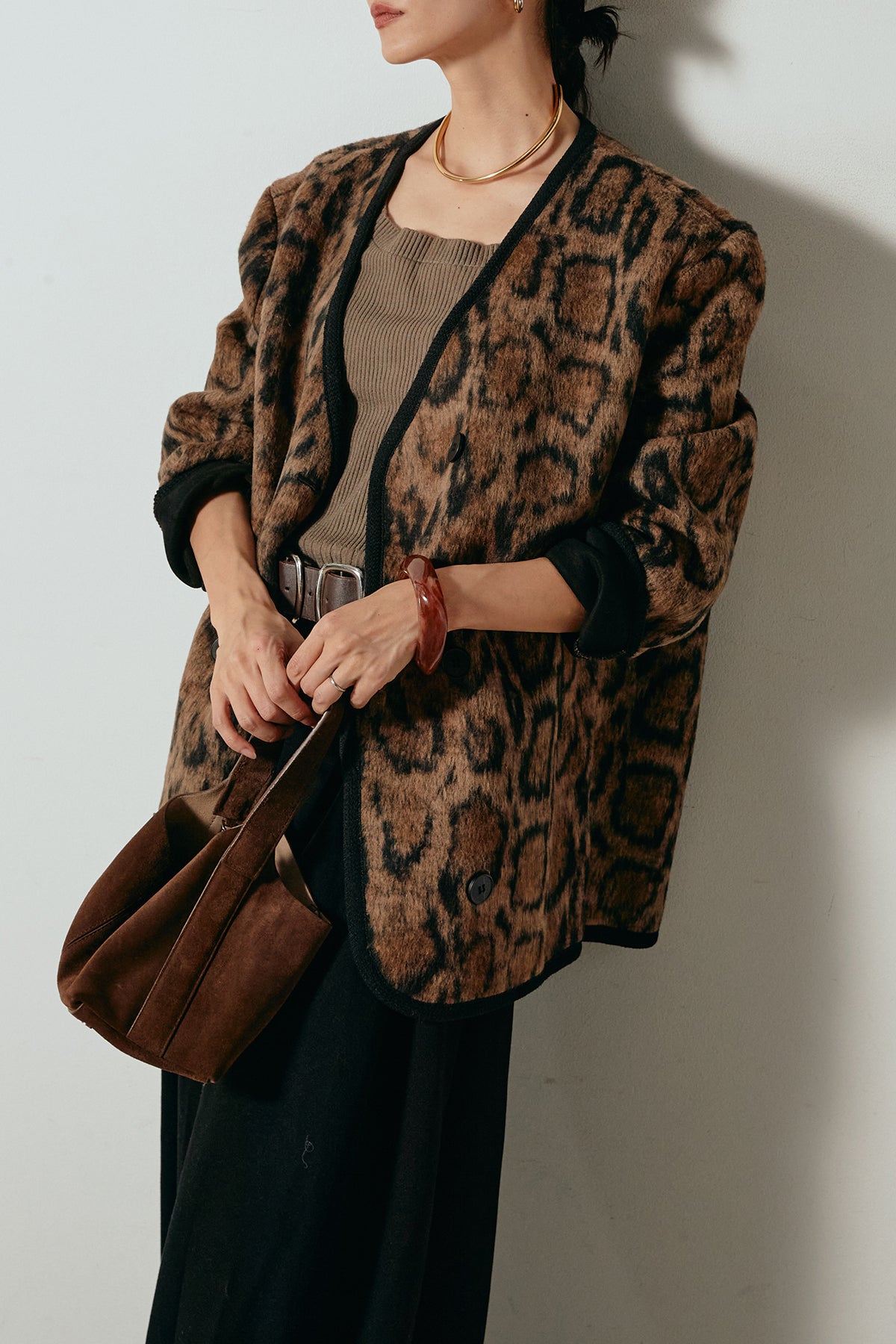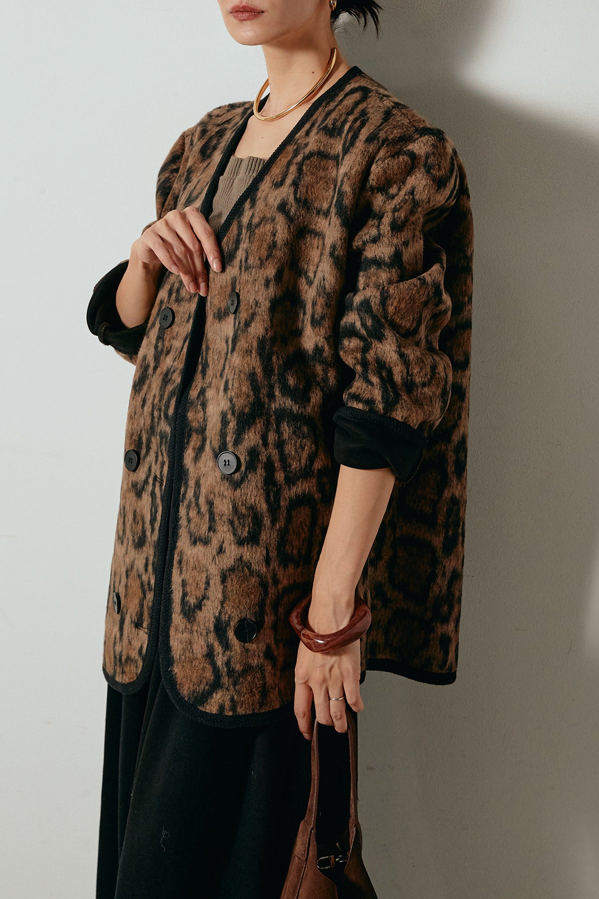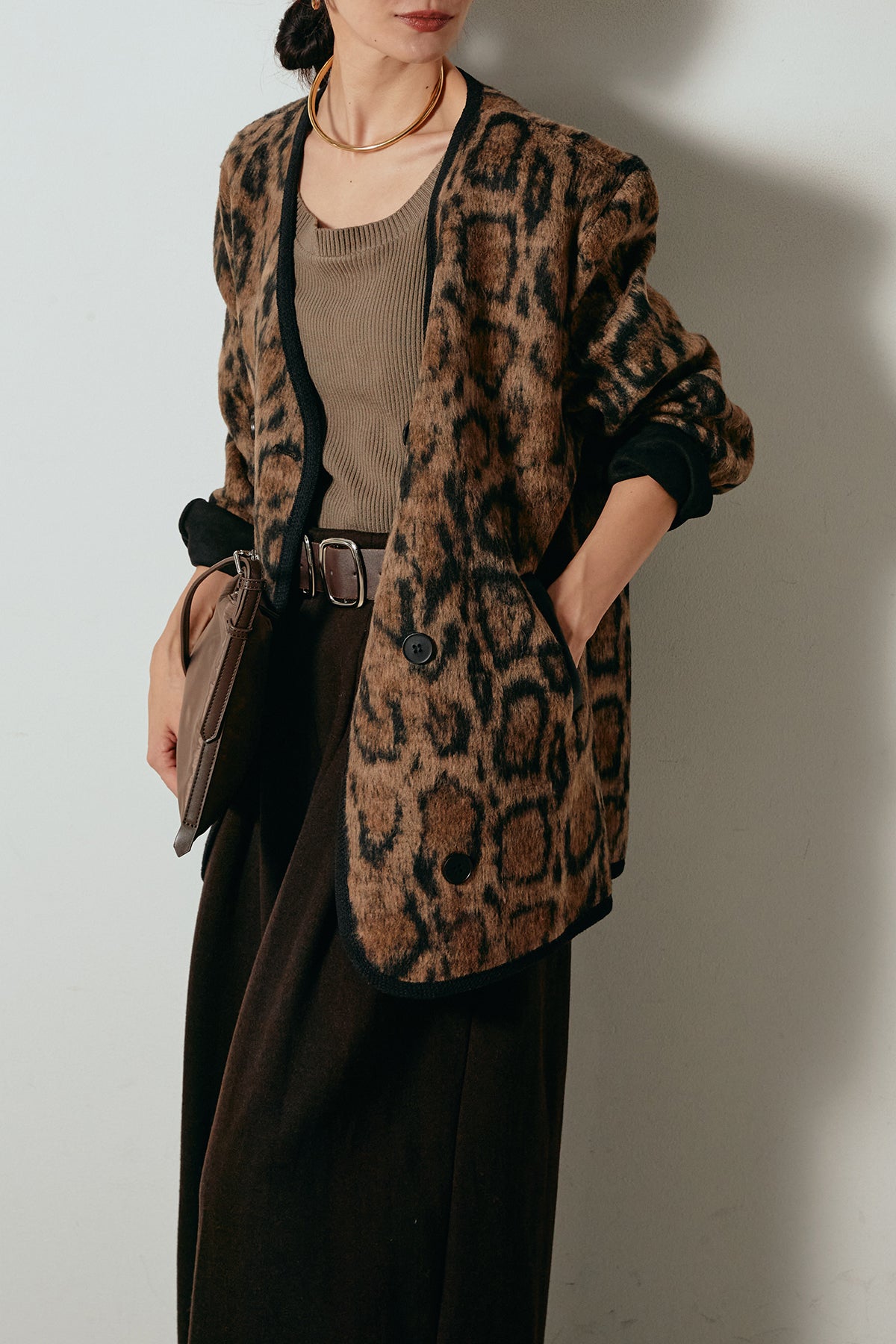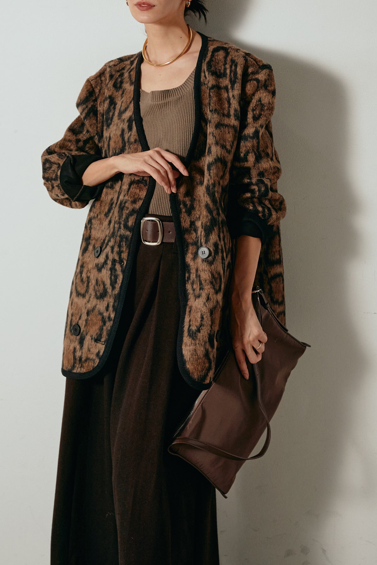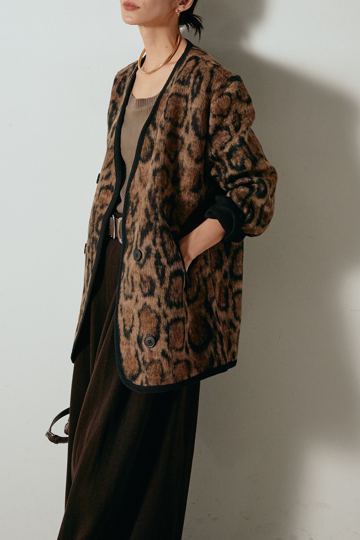 存在感のあるレオパード柄が目を惹くノーカラーアウター。