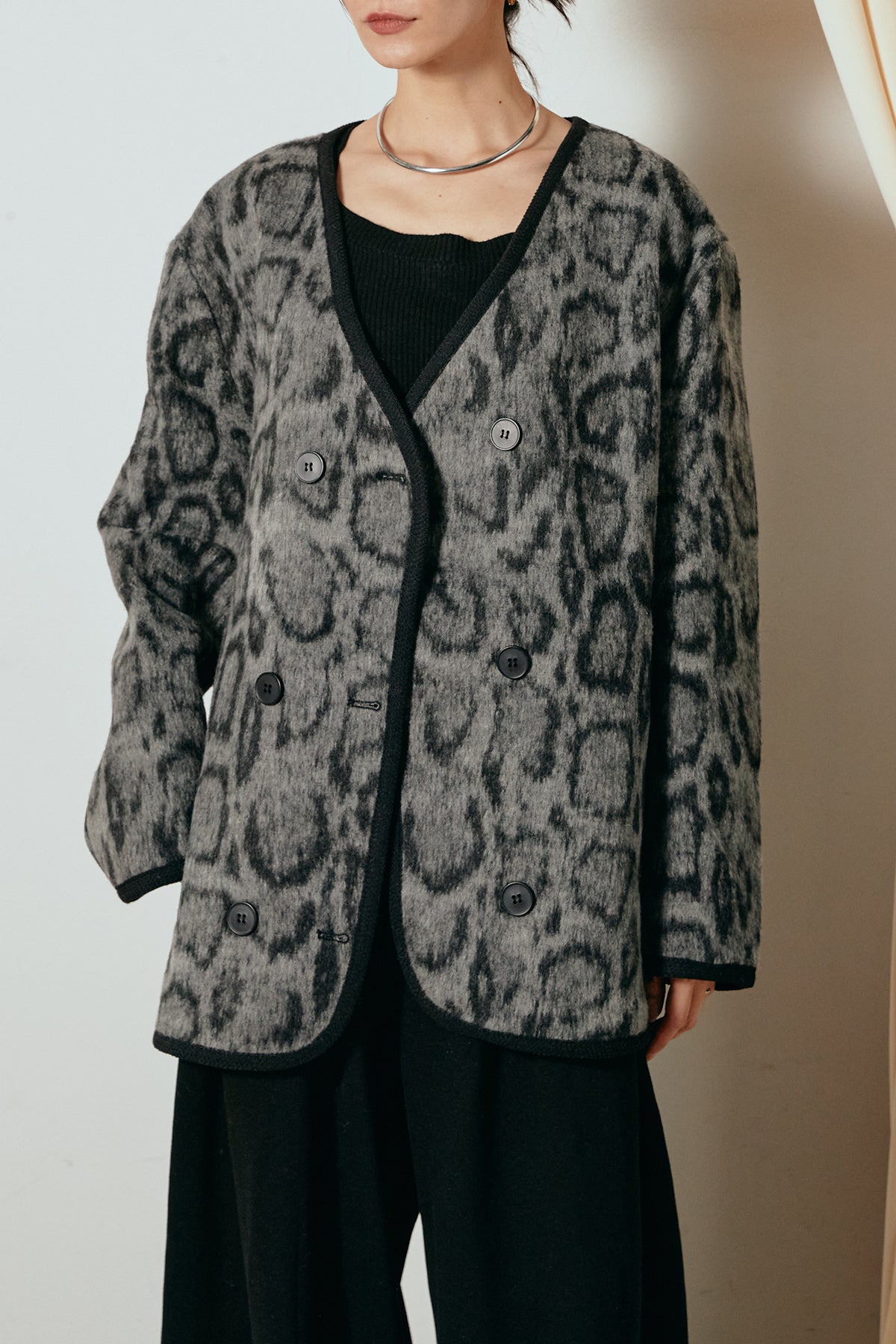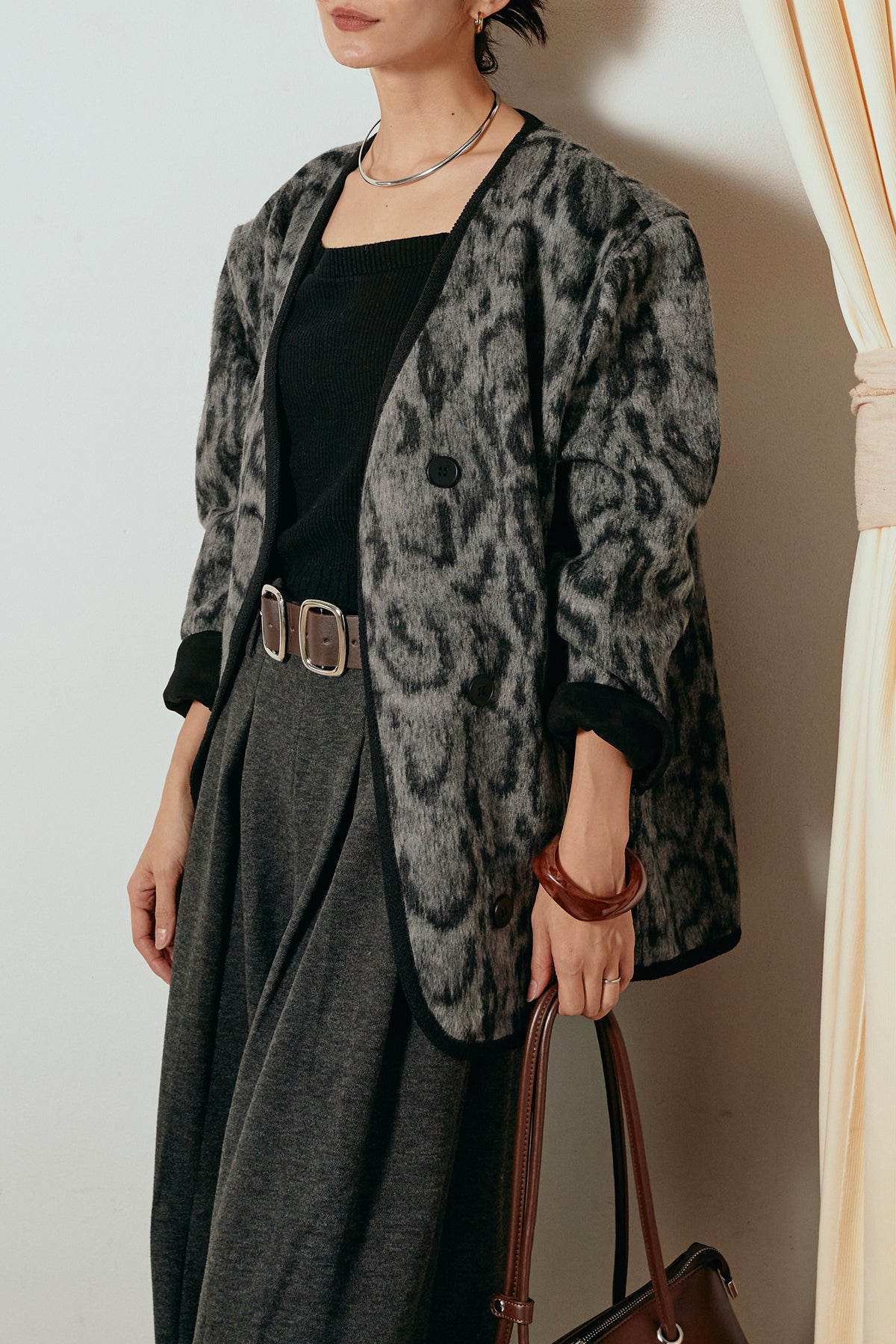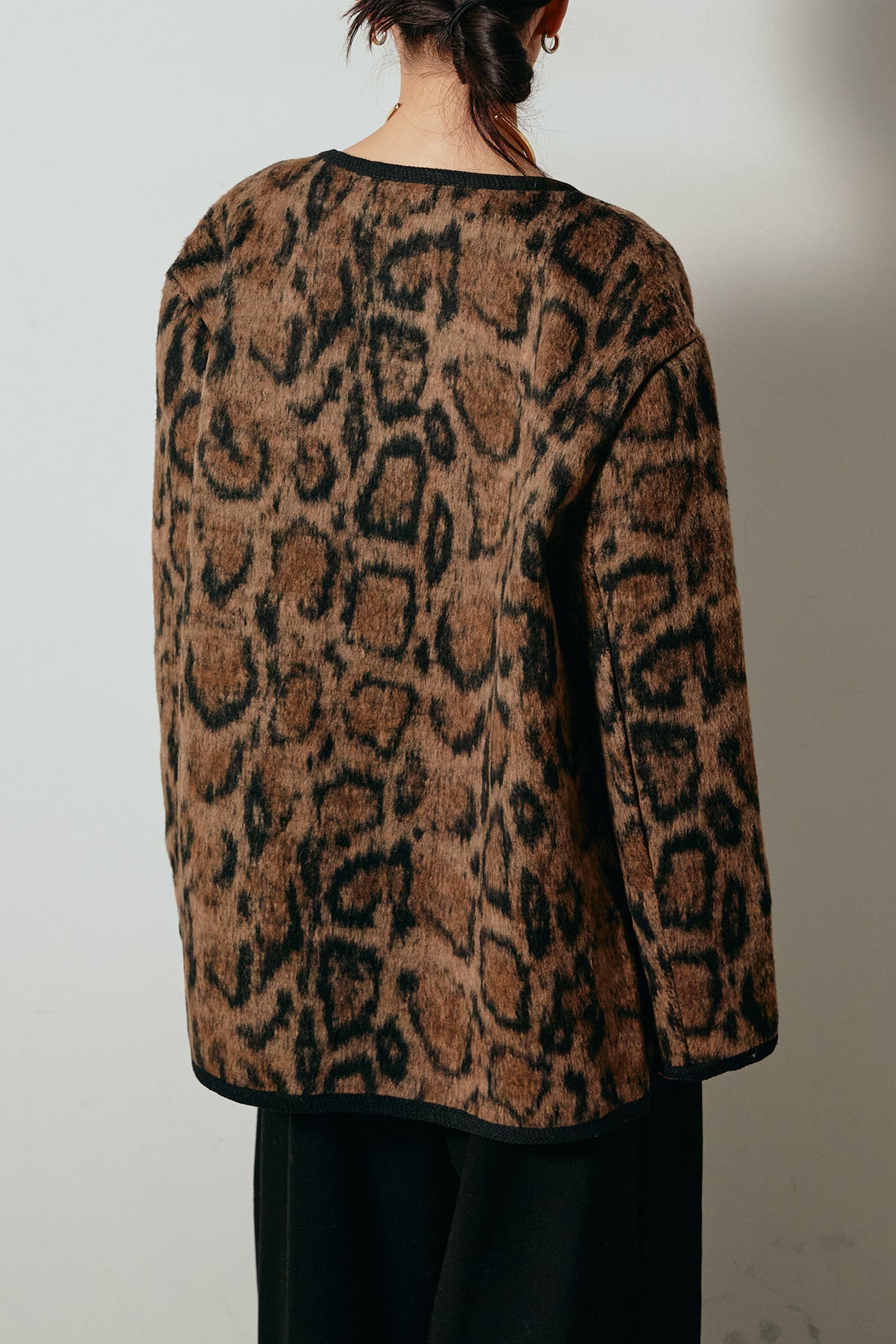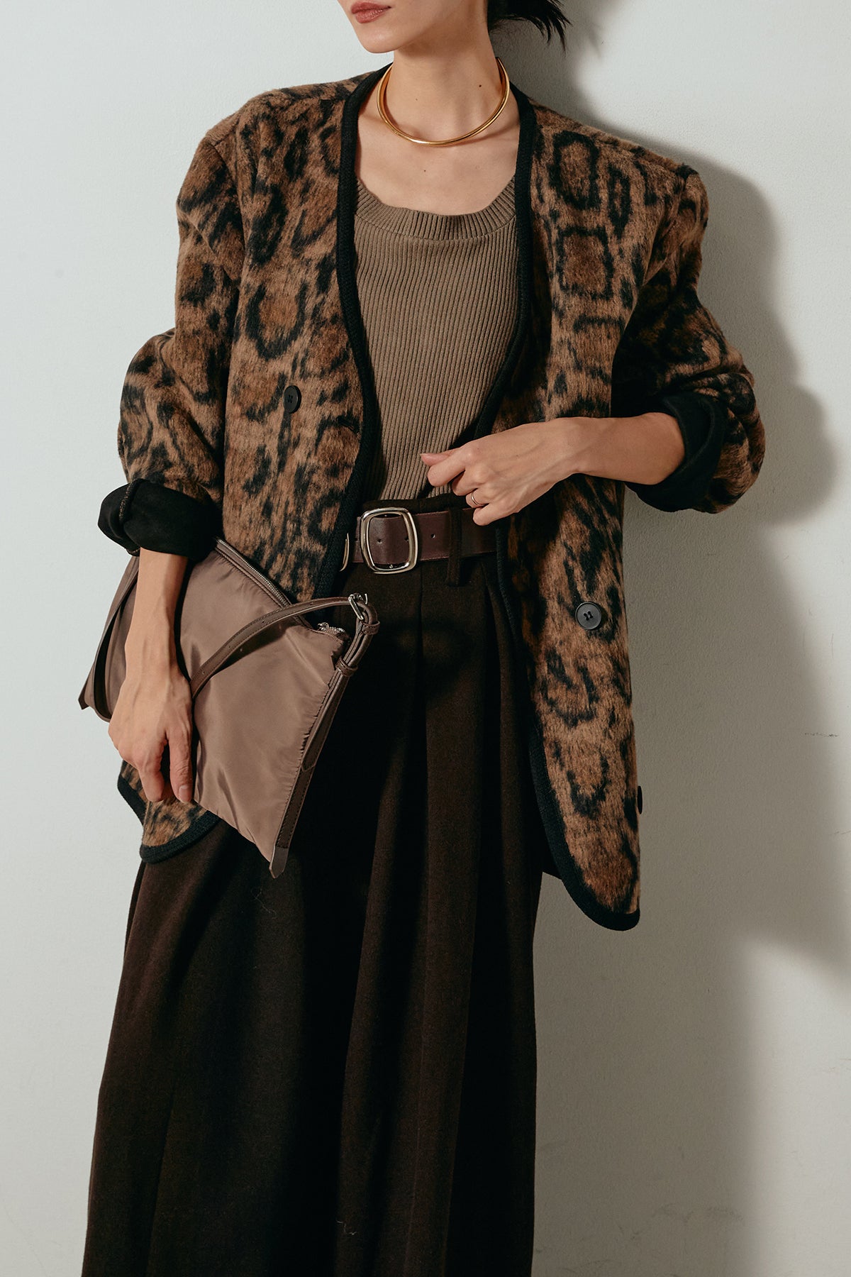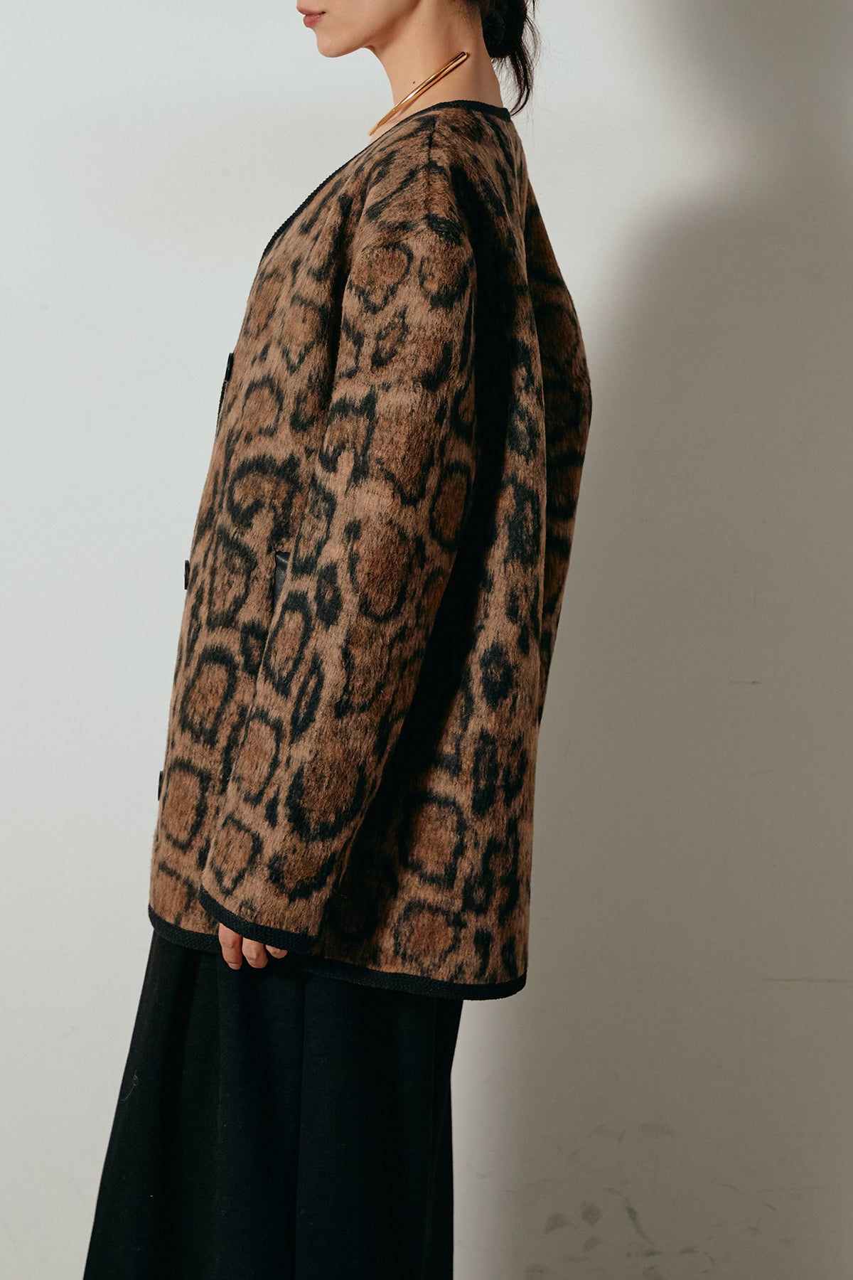 存在感のあるレオパード柄が目を惹くノーカラーアウター。