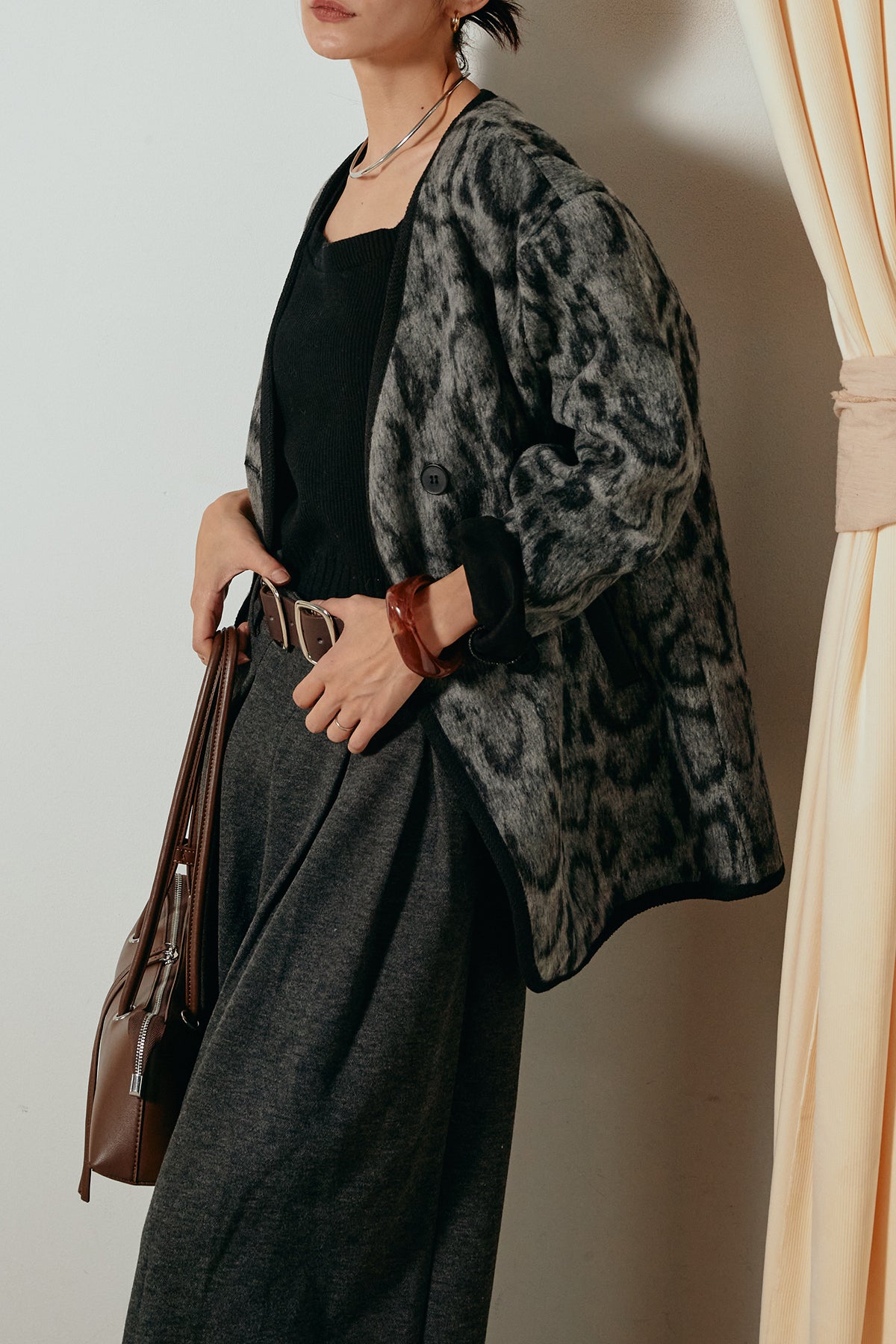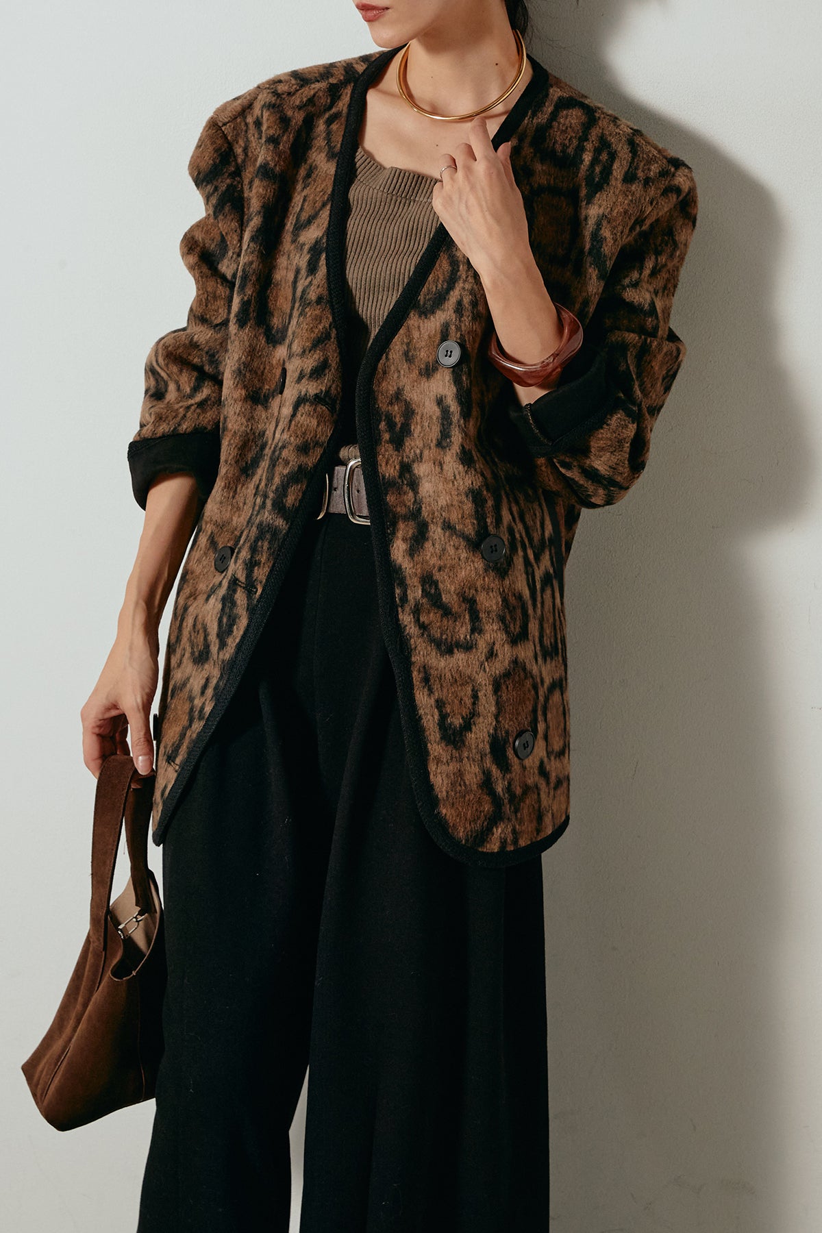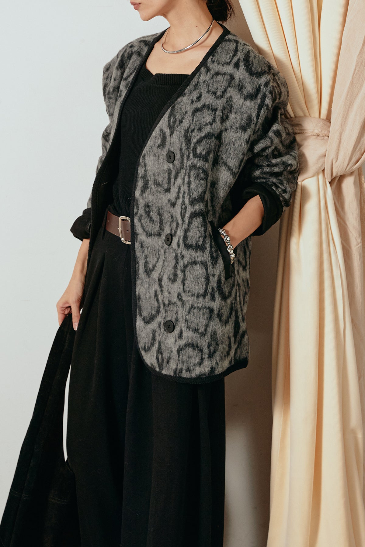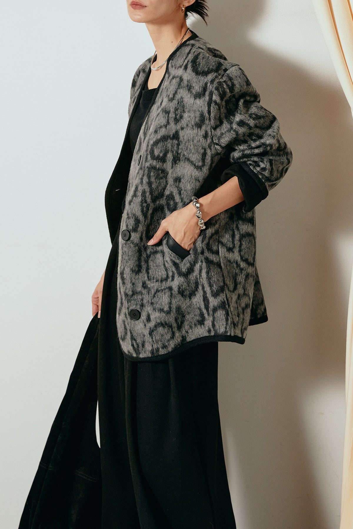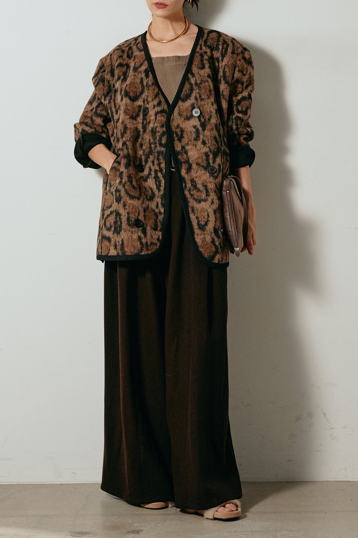 存在感のあるレオパード柄が目を惹くノーカラーアウター。