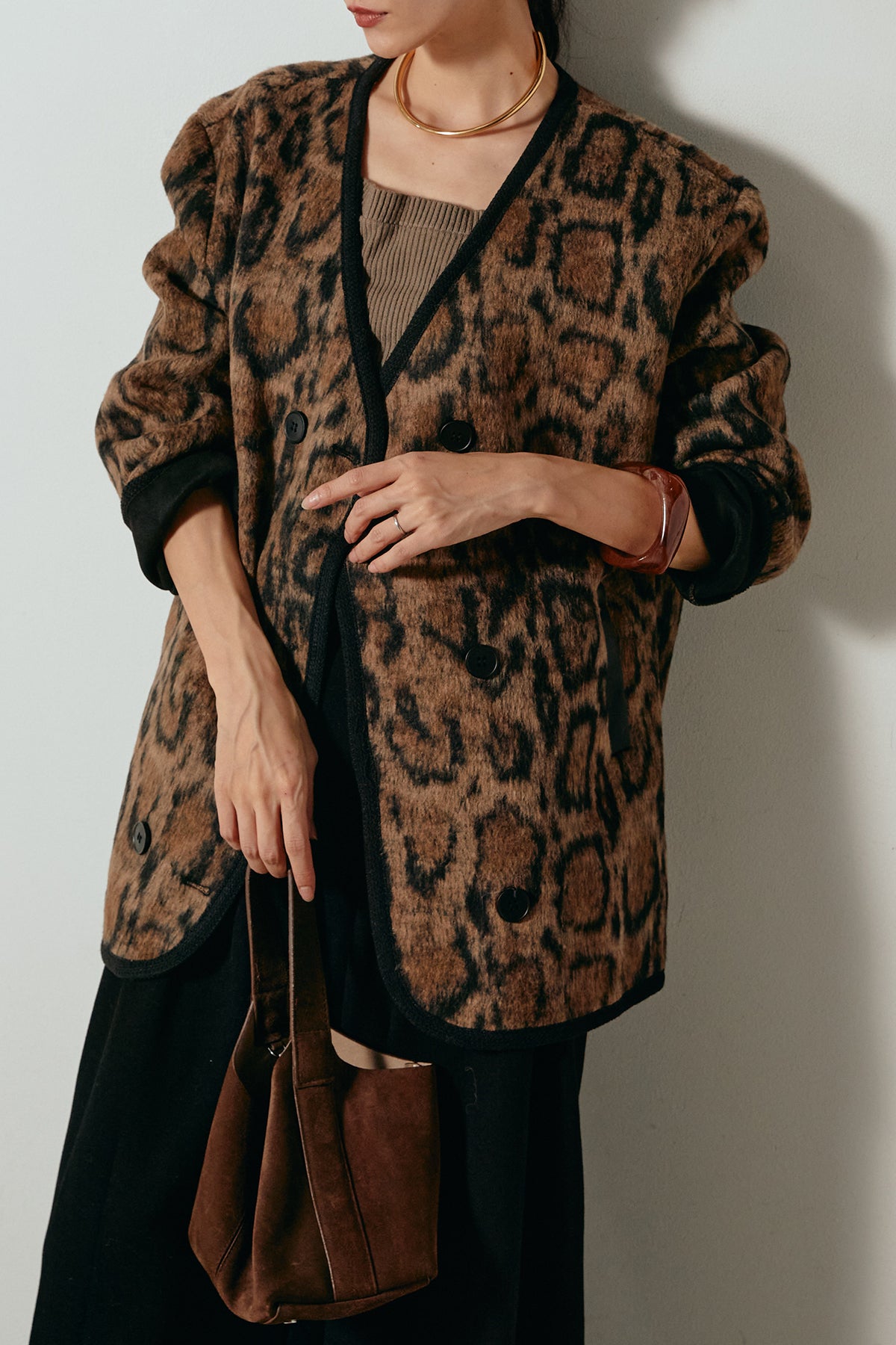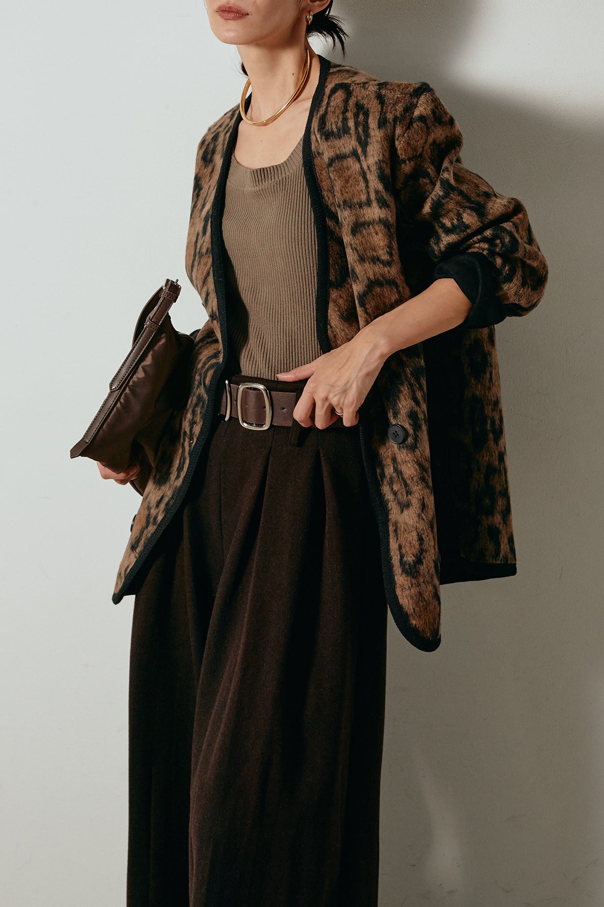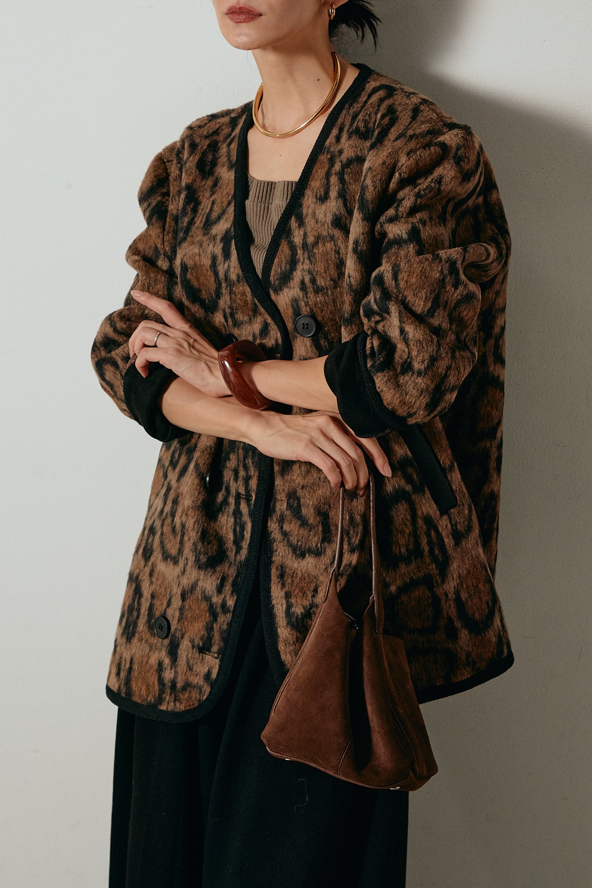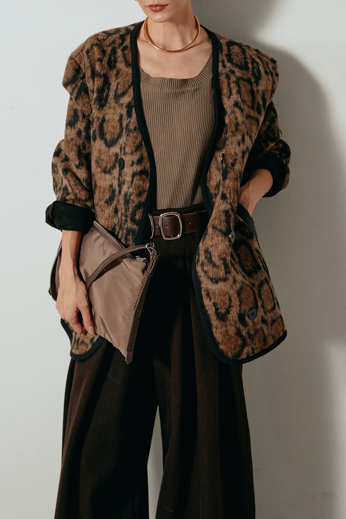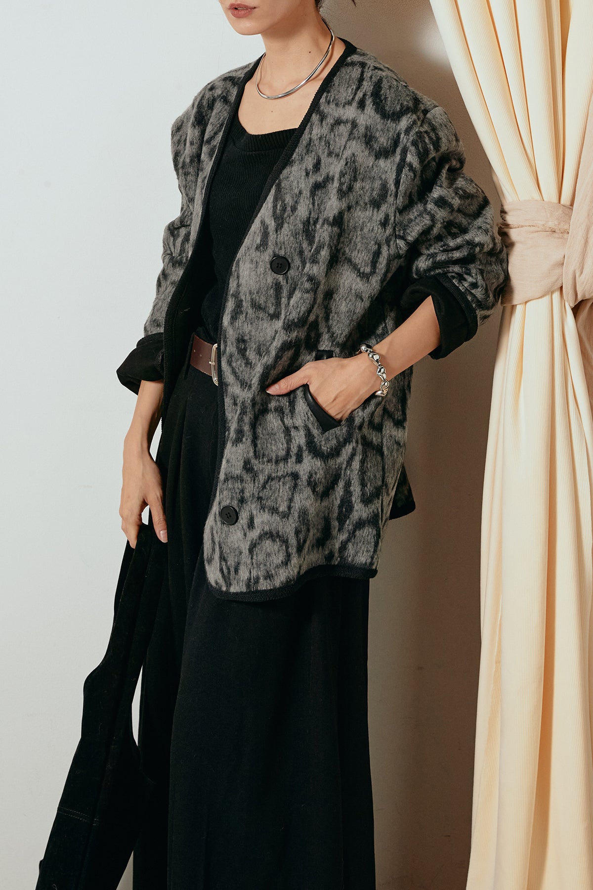 存在感のあるレオパード柄が目を惹くノーカラーアウター。