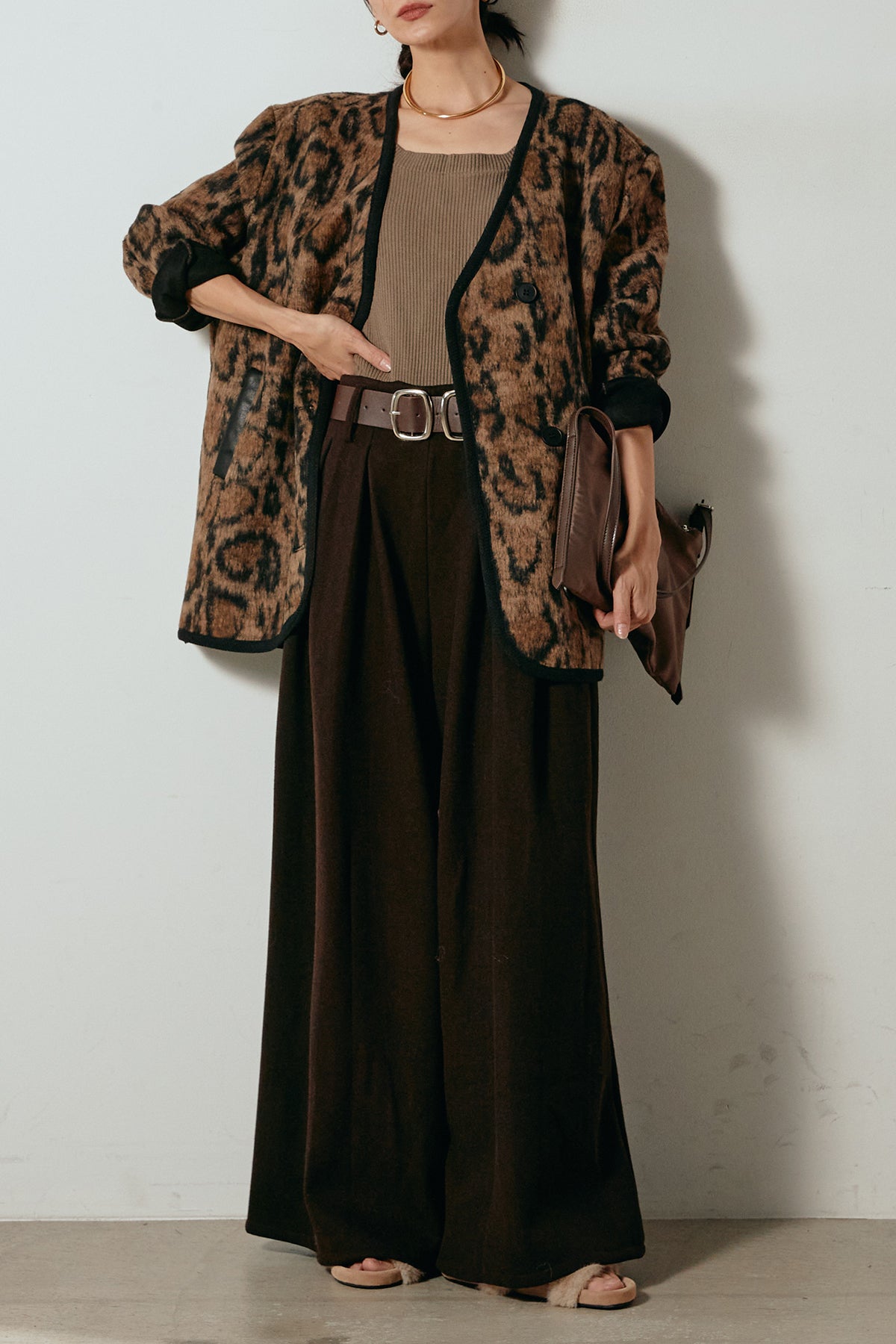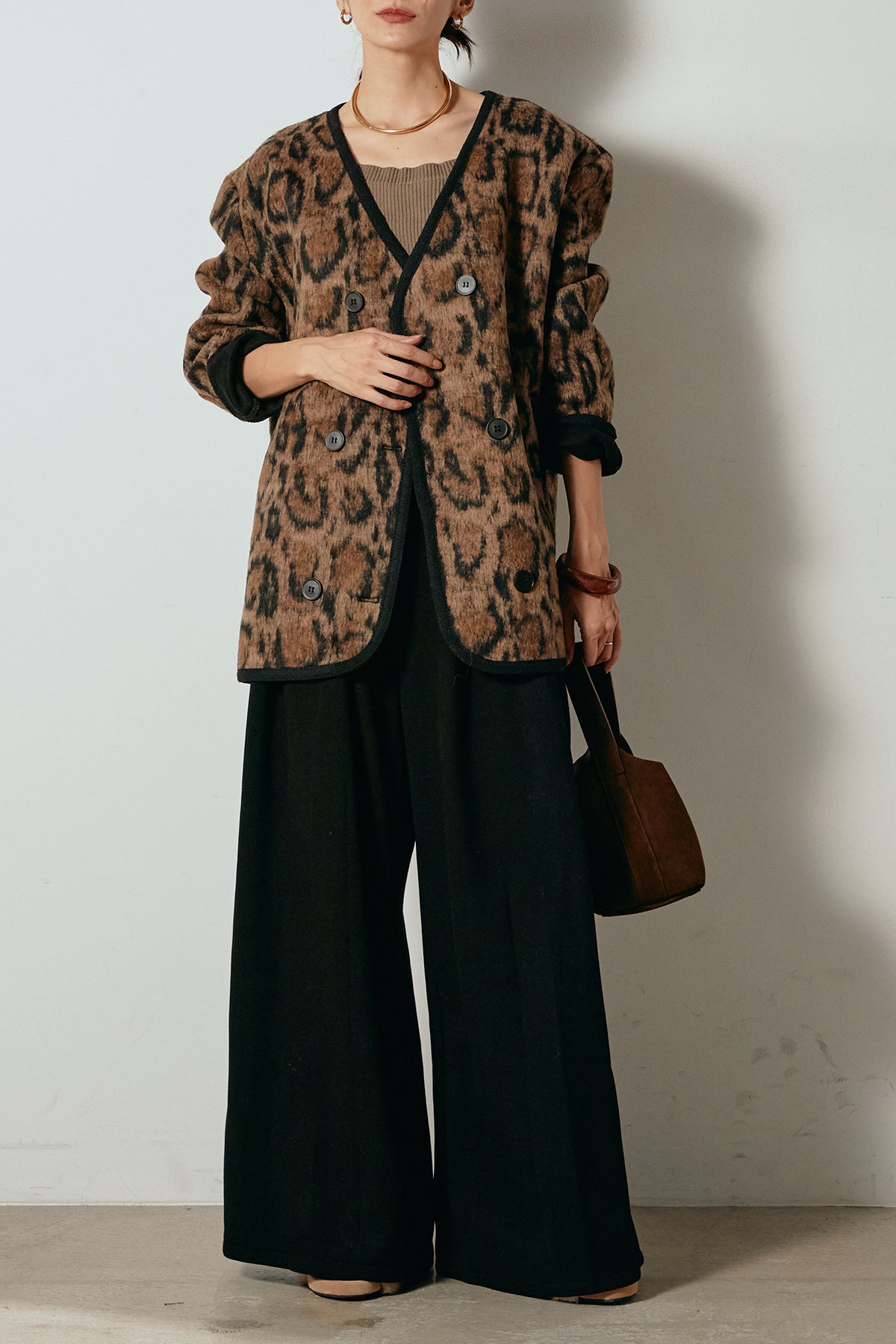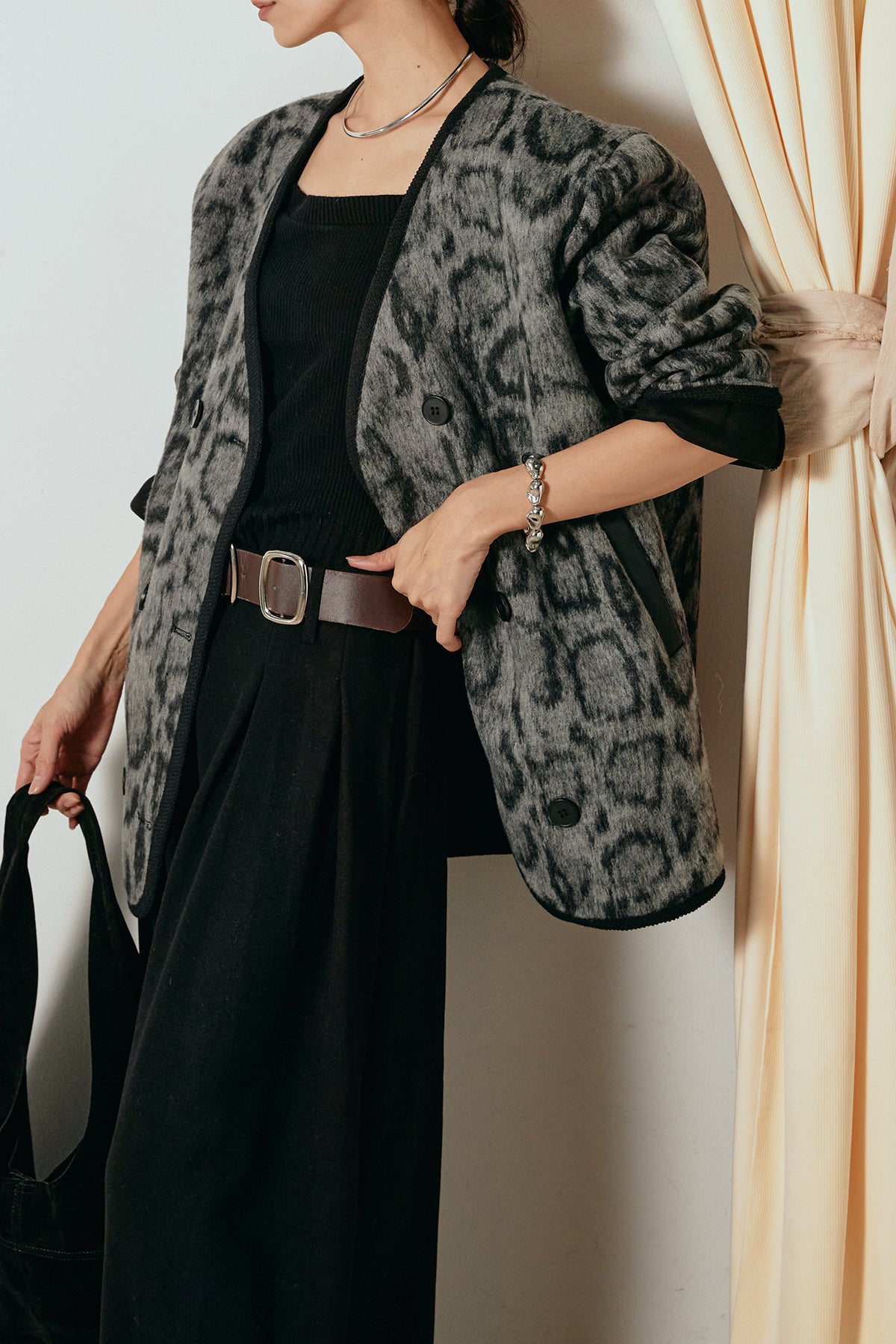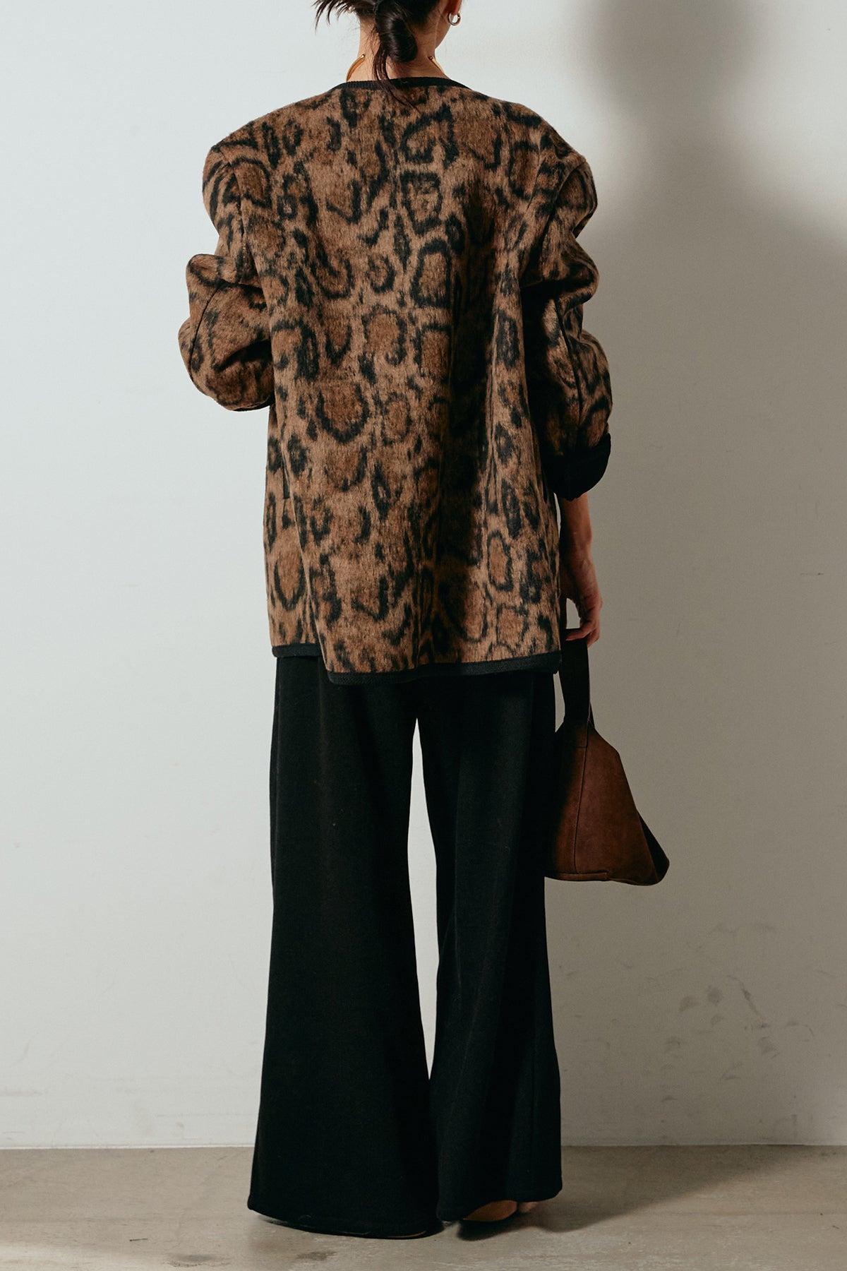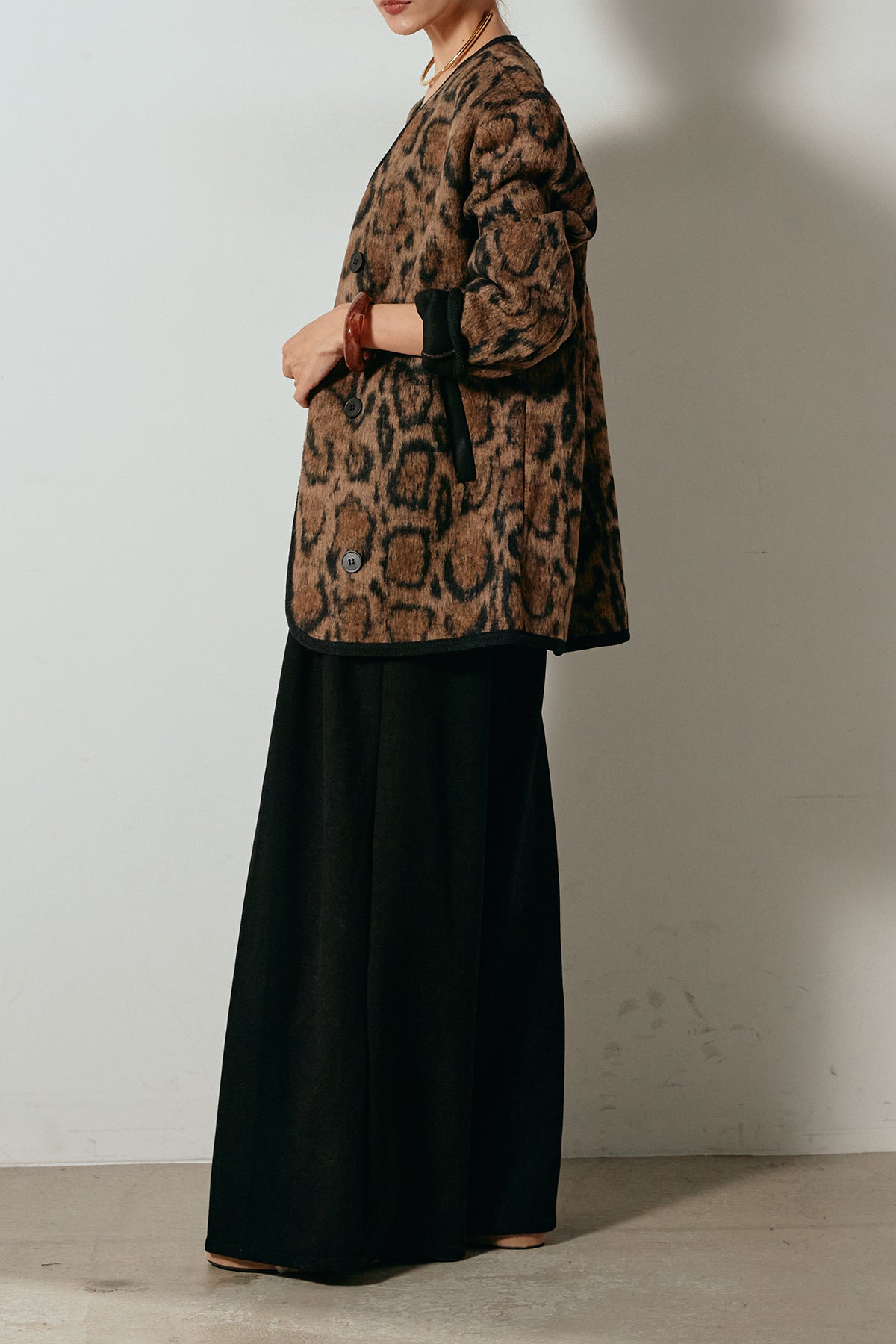 存在感のあるレオパード柄が目を惹くノーカラーアウター。