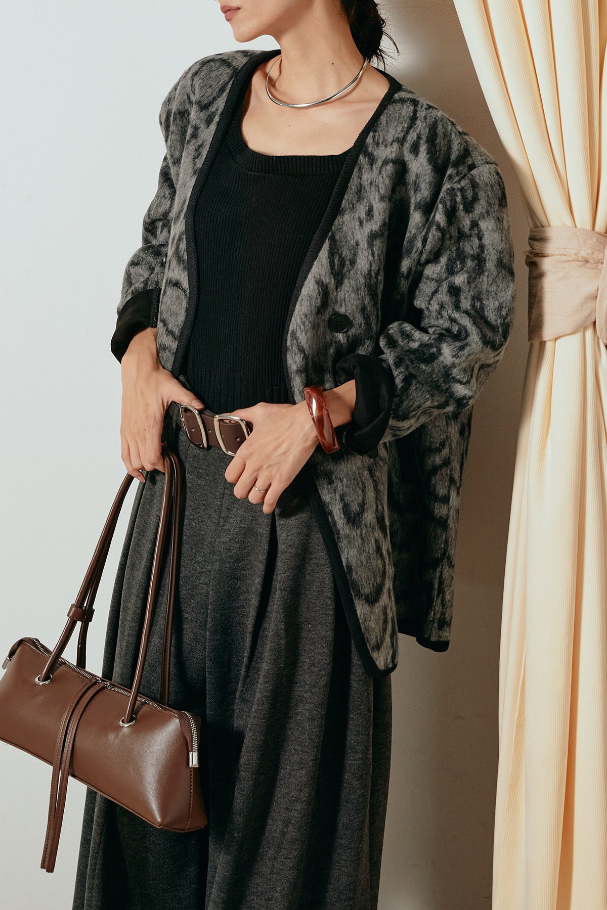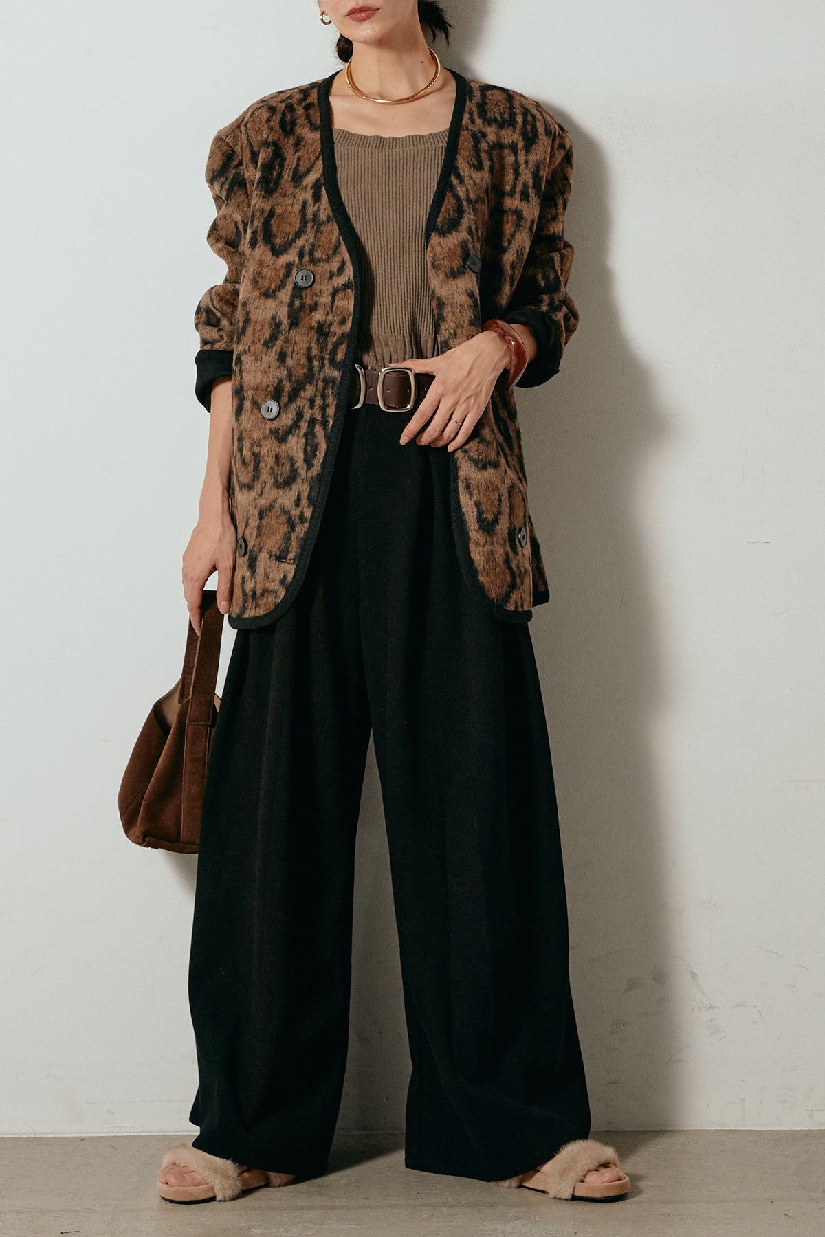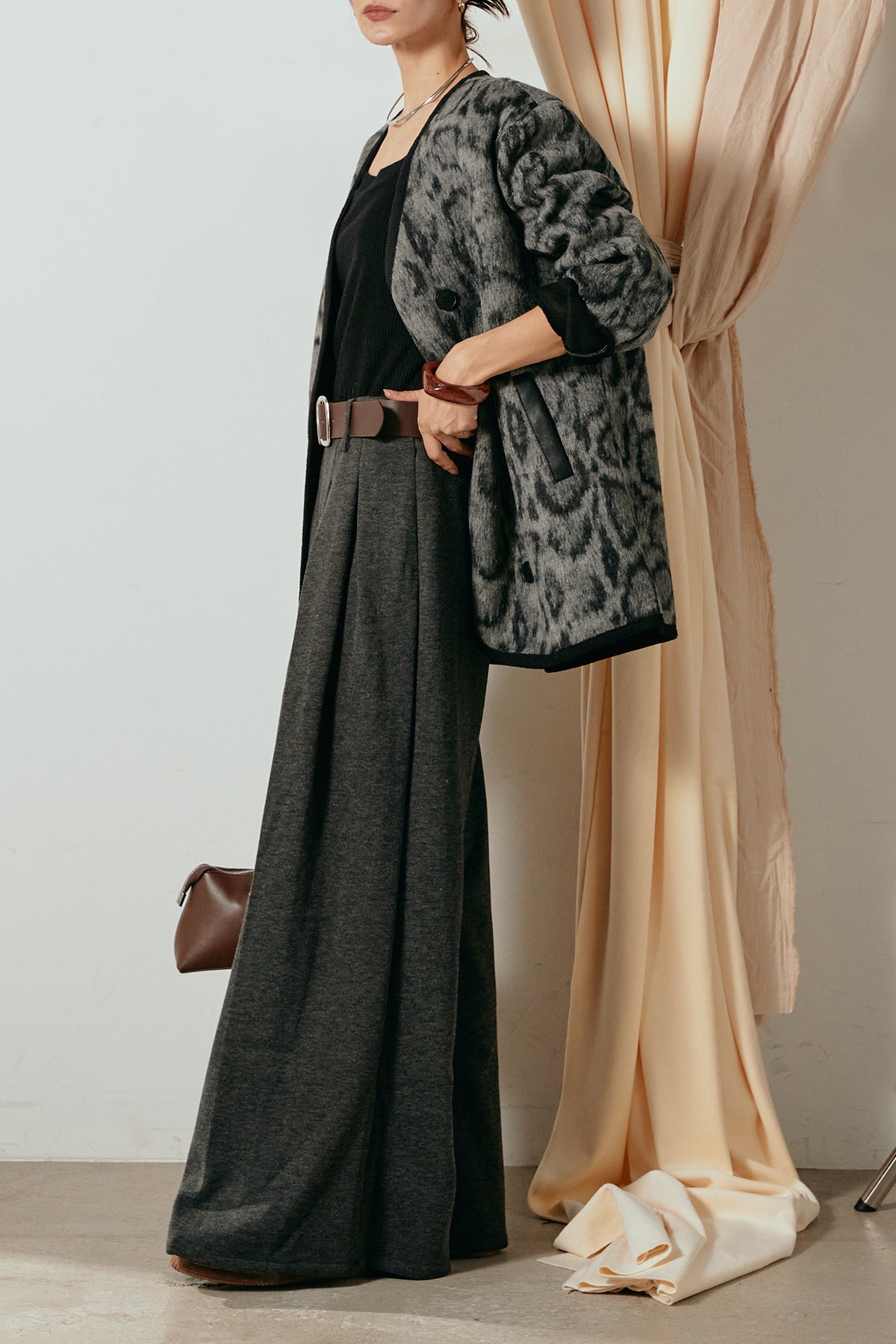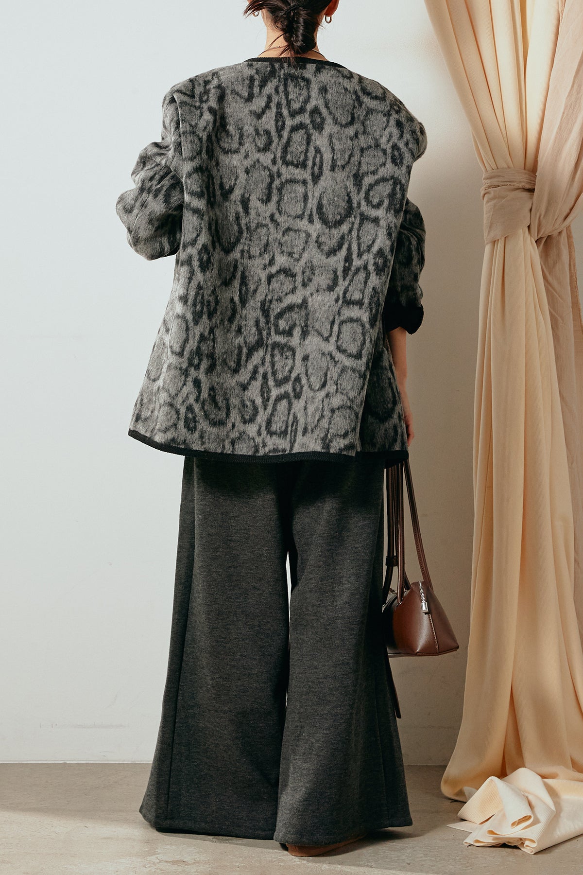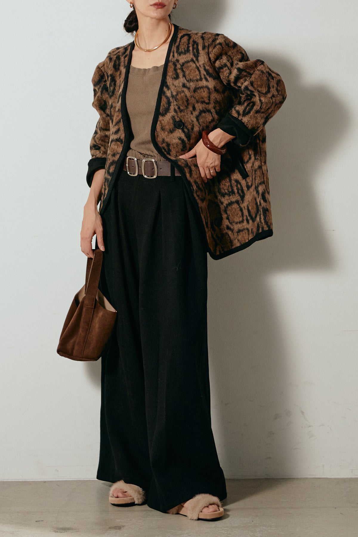 存在感のあるレオパード柄が目を惹くノーカラーアウター。