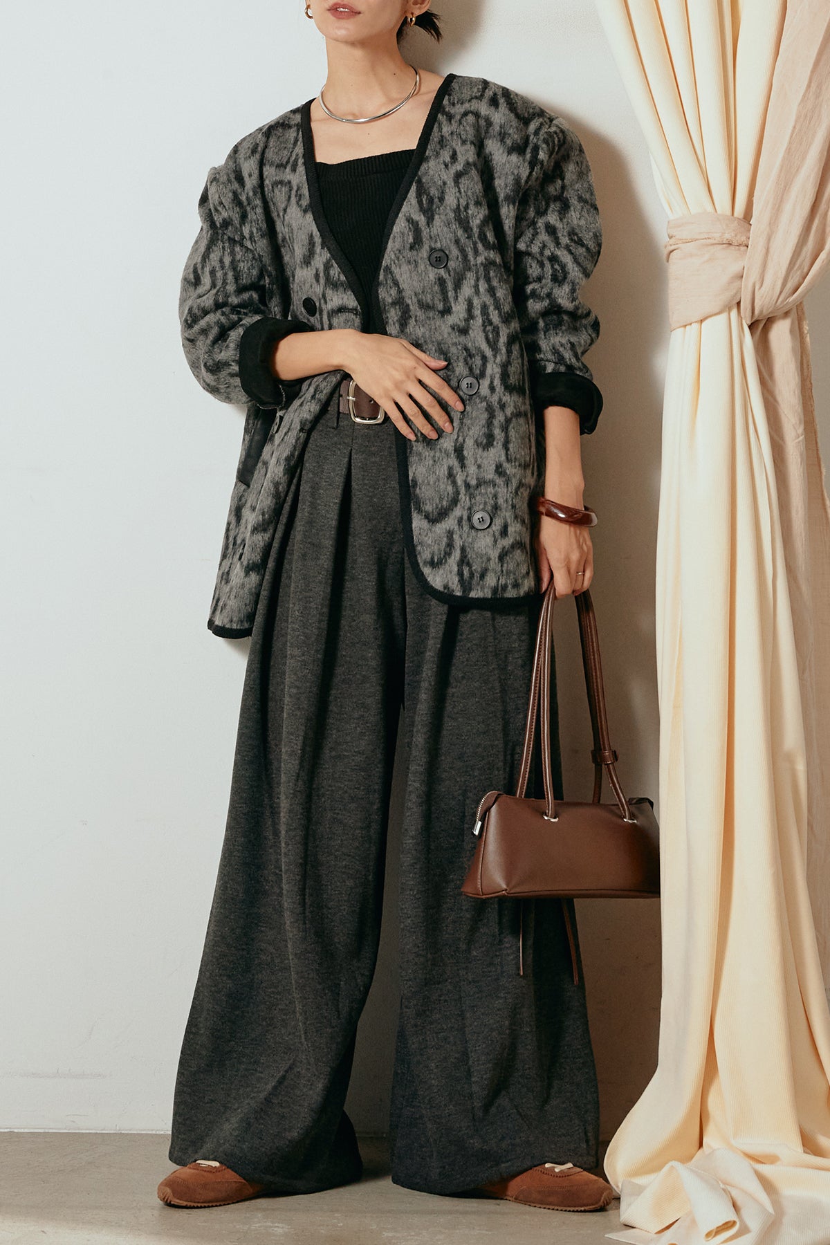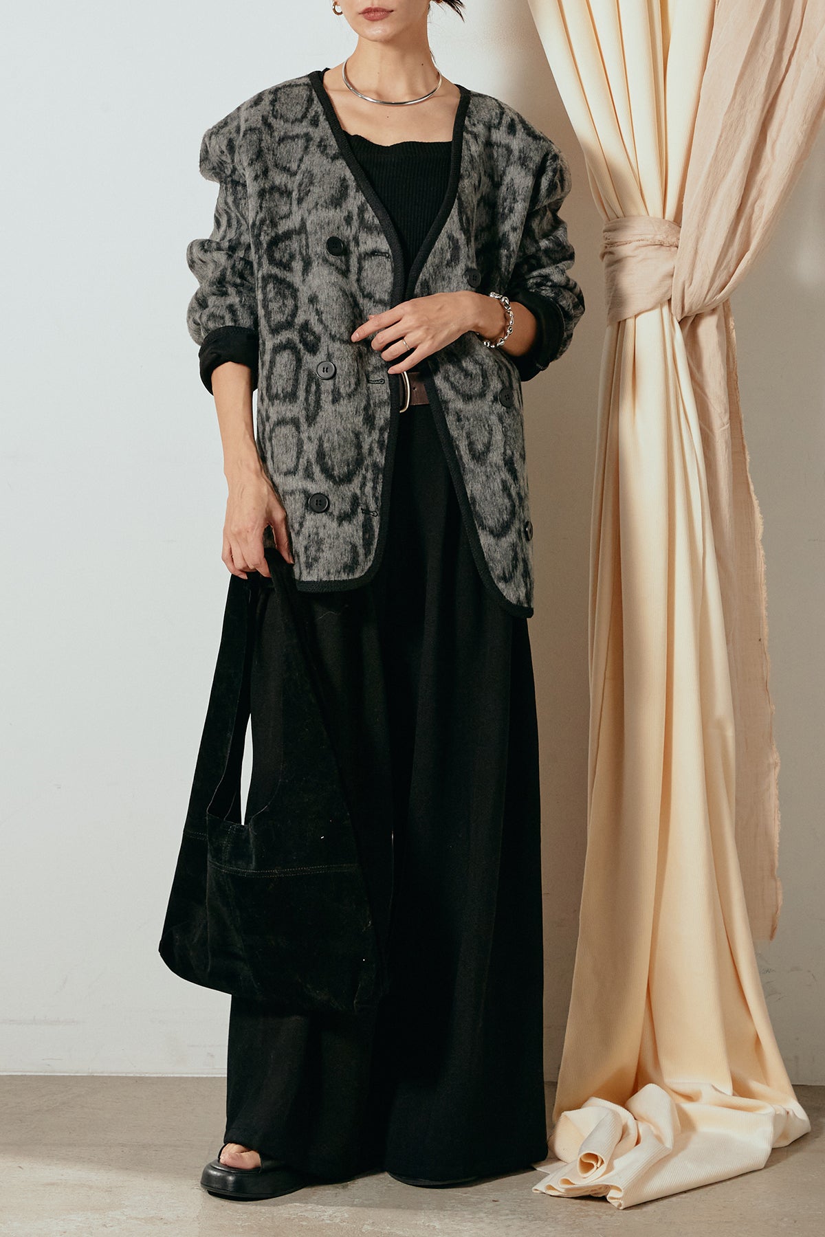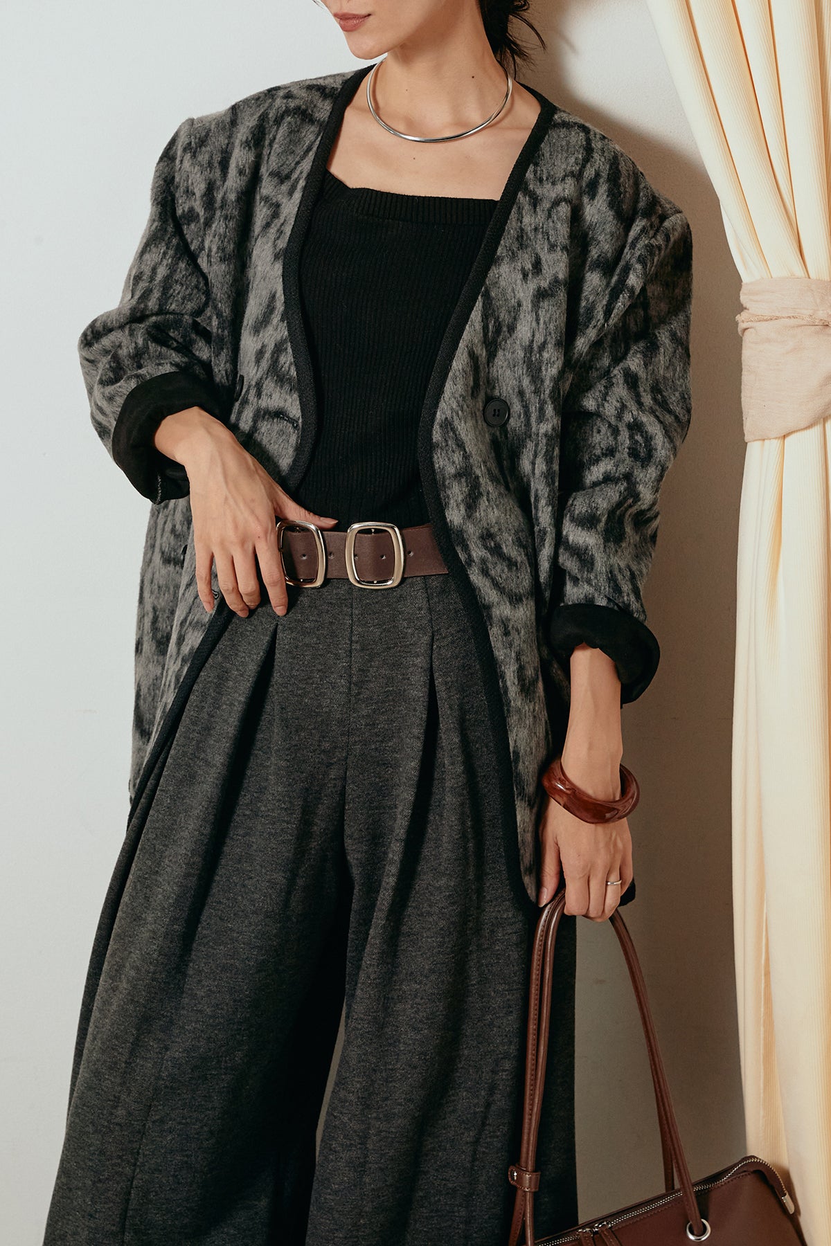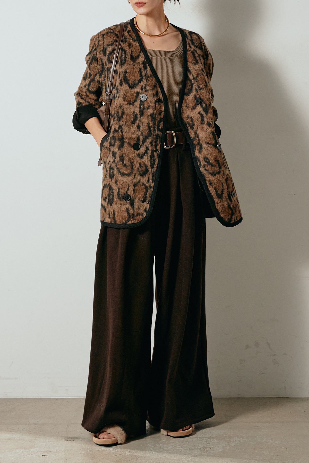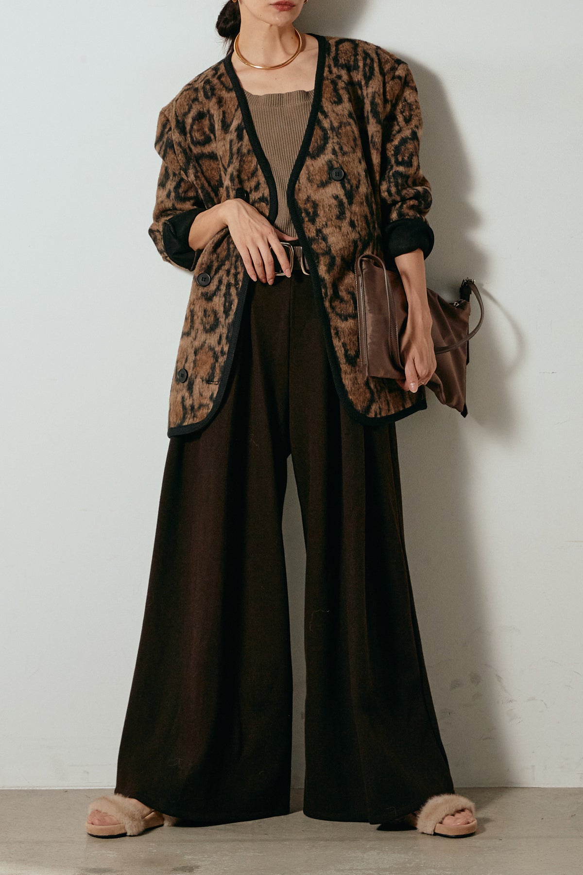 存在感のあるレオパード柄が目を惹くノーカラーアウター。