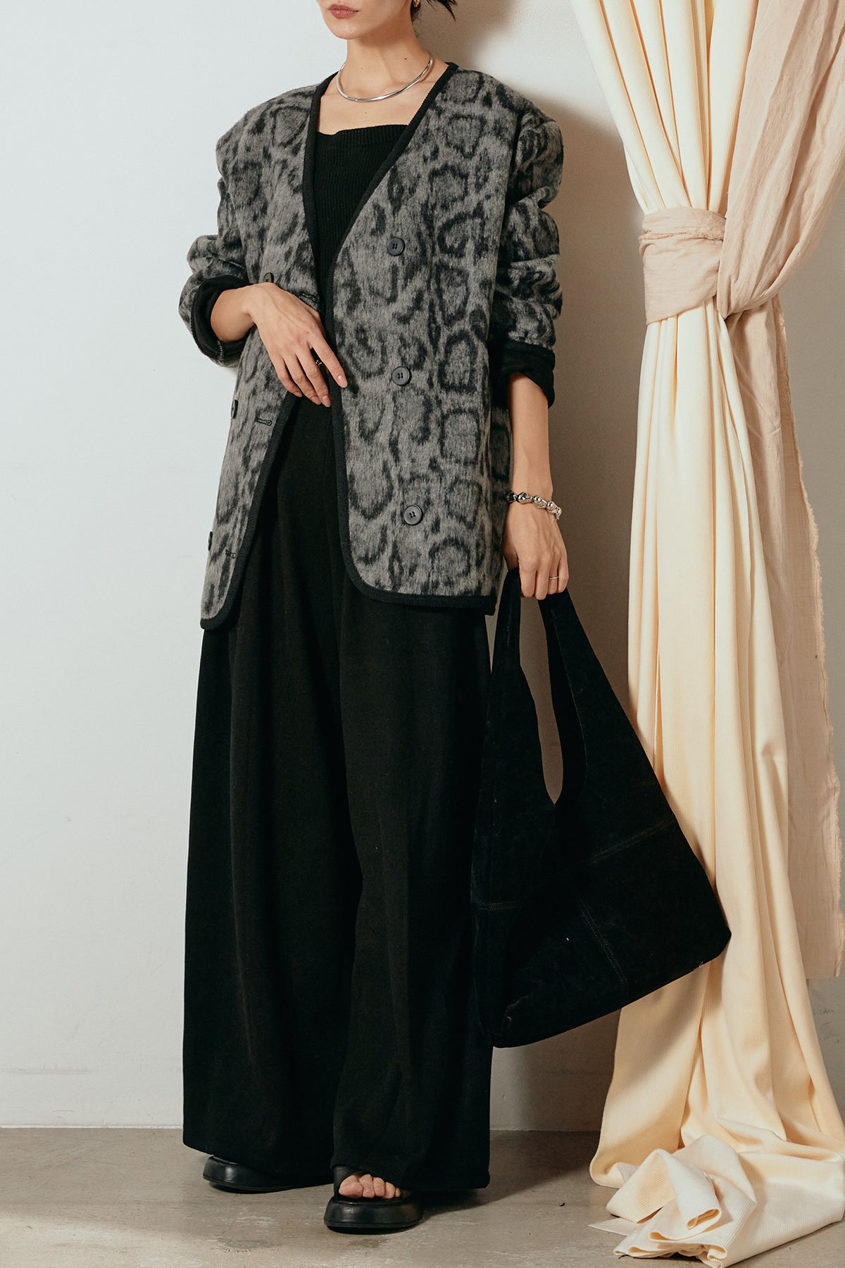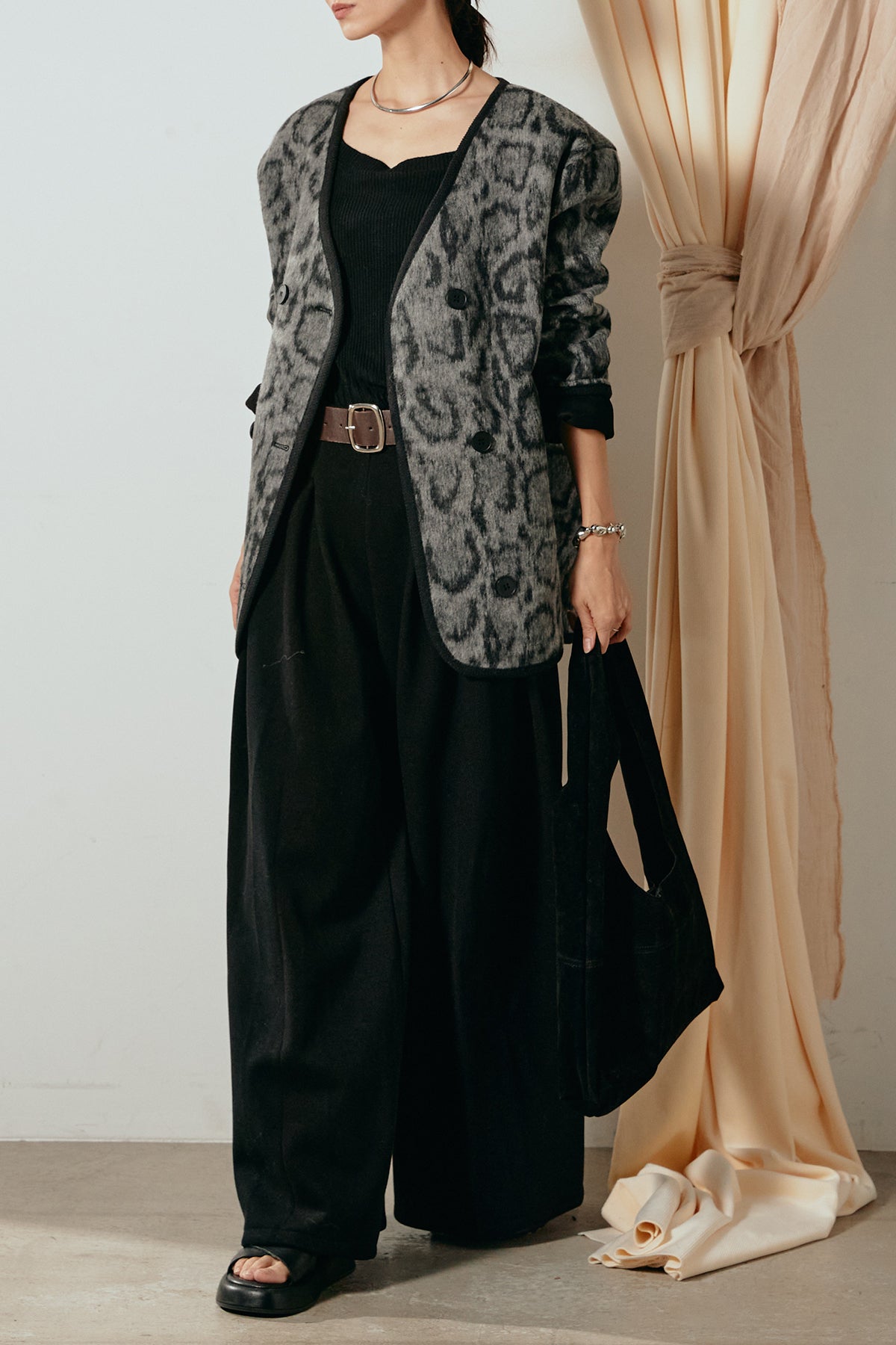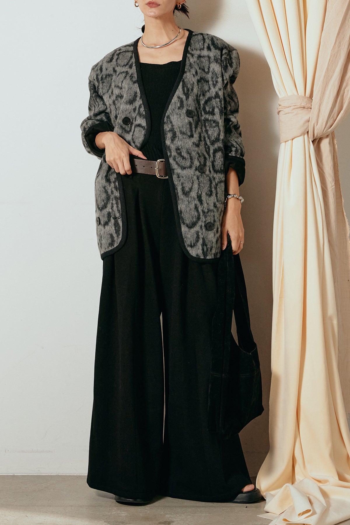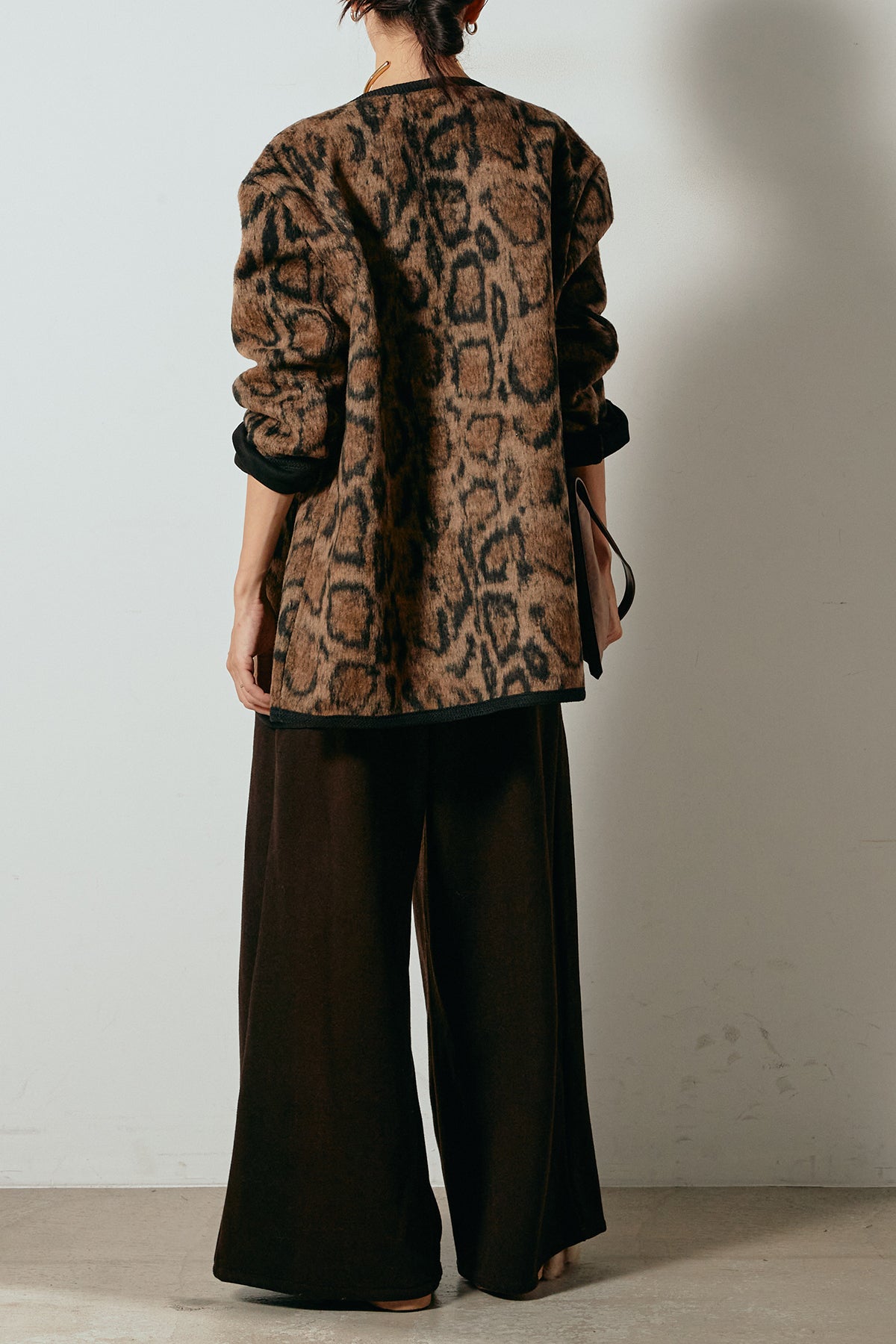 存在感のあるレオパード柄が目を惹くノーカラーアウター。