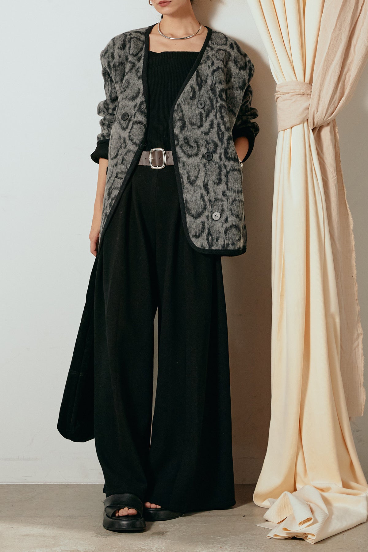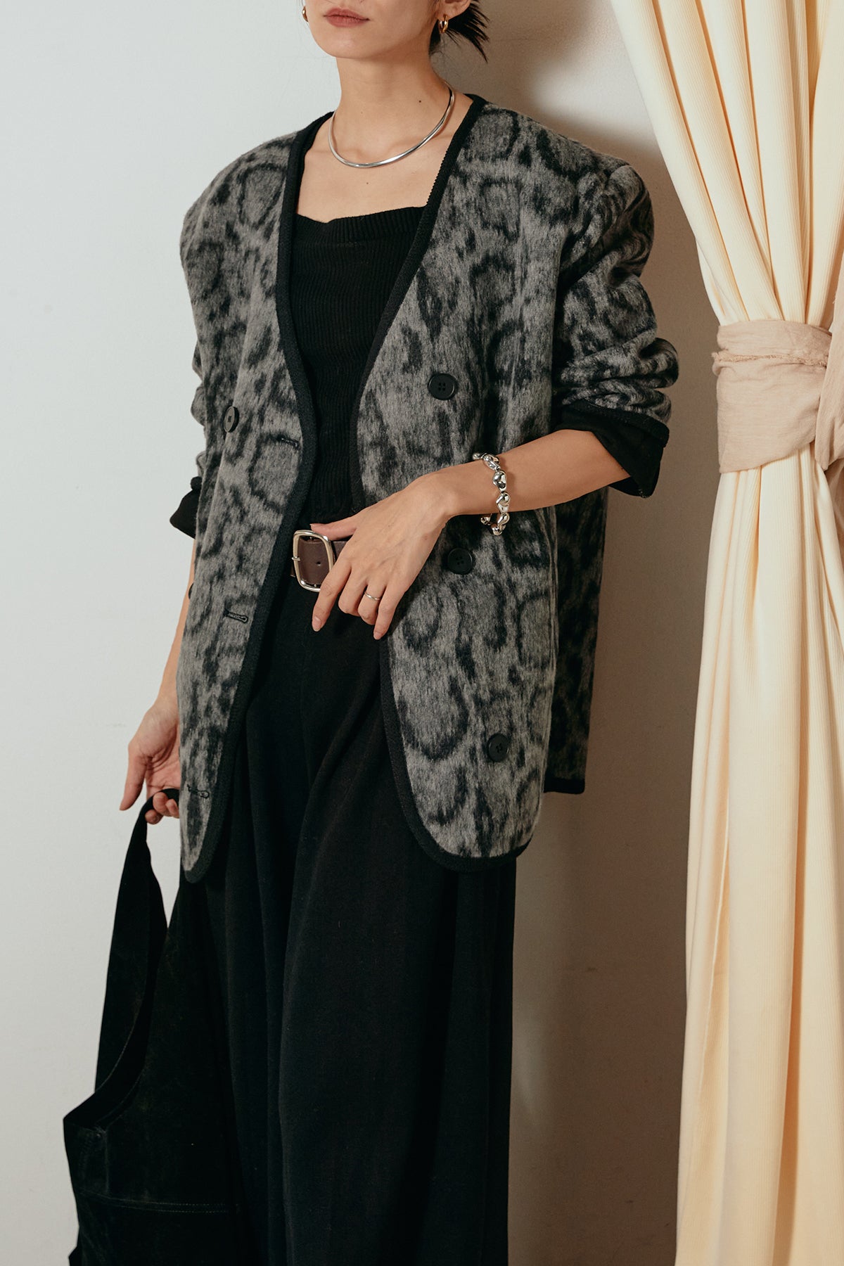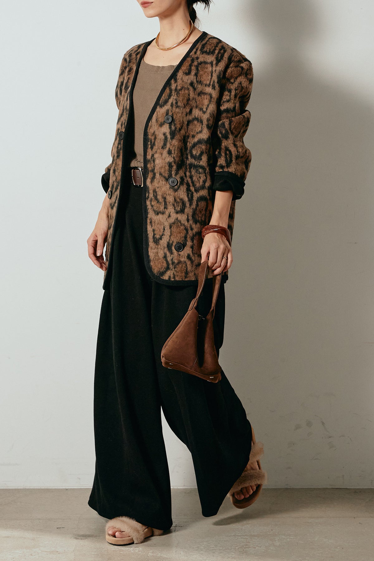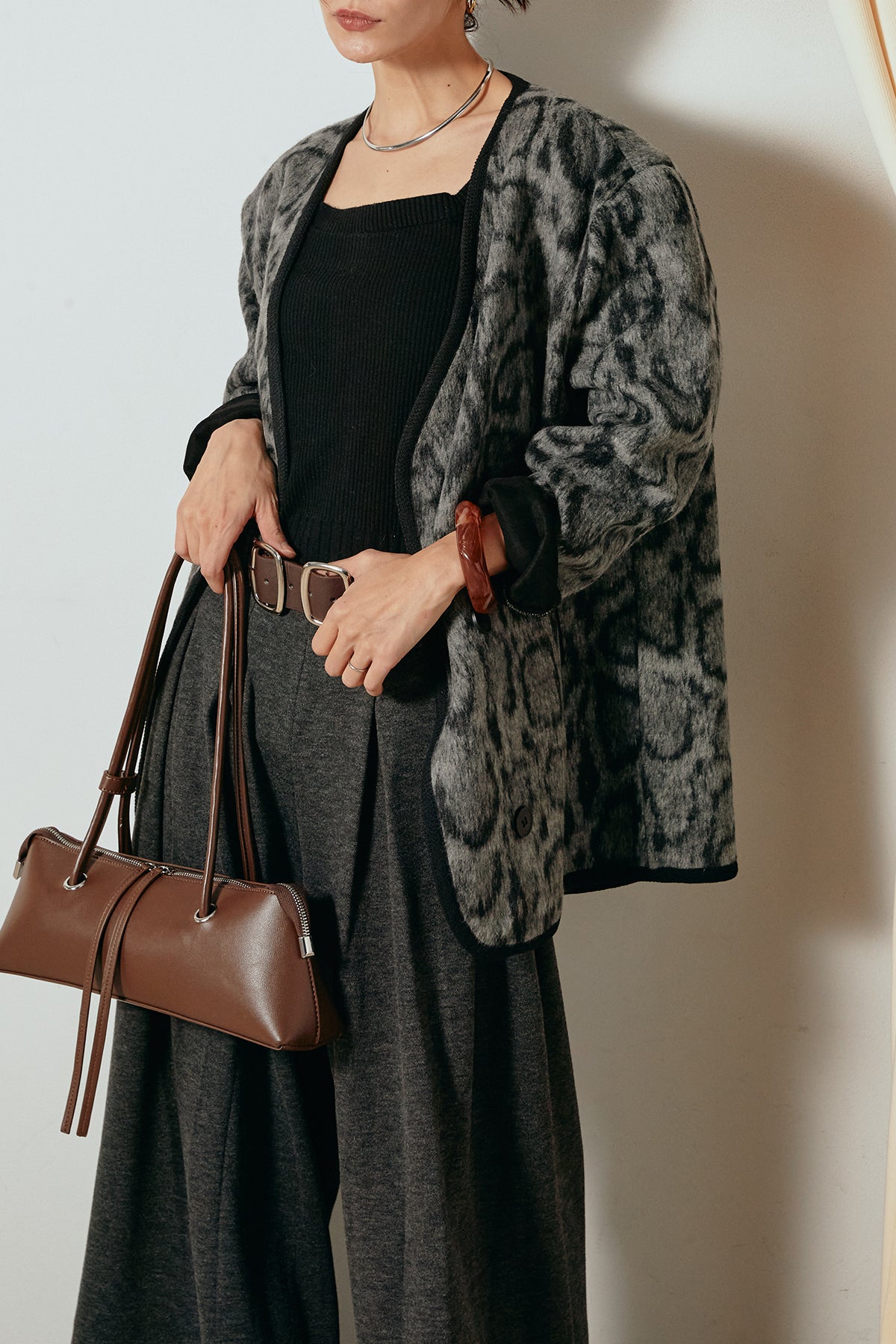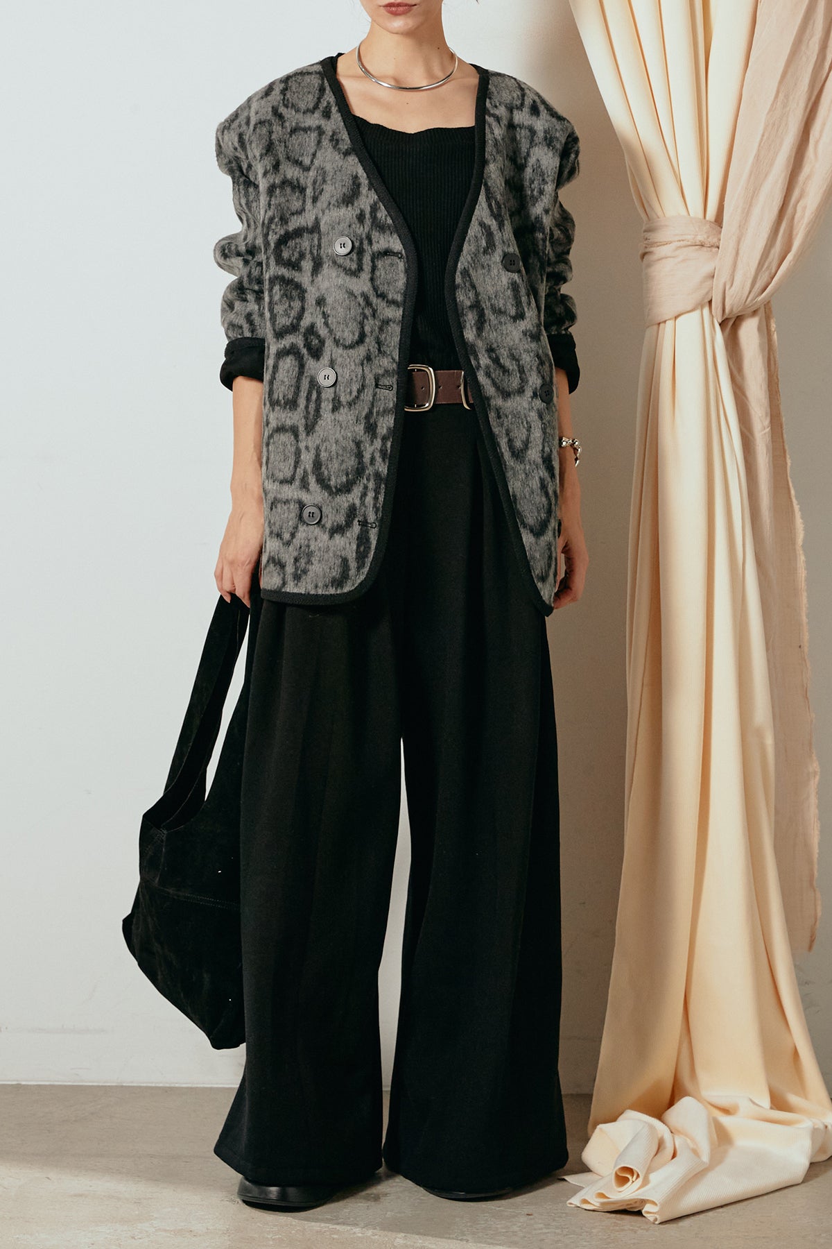 存在感のあるレオパード柄が目を惹くノーカラーアウター。