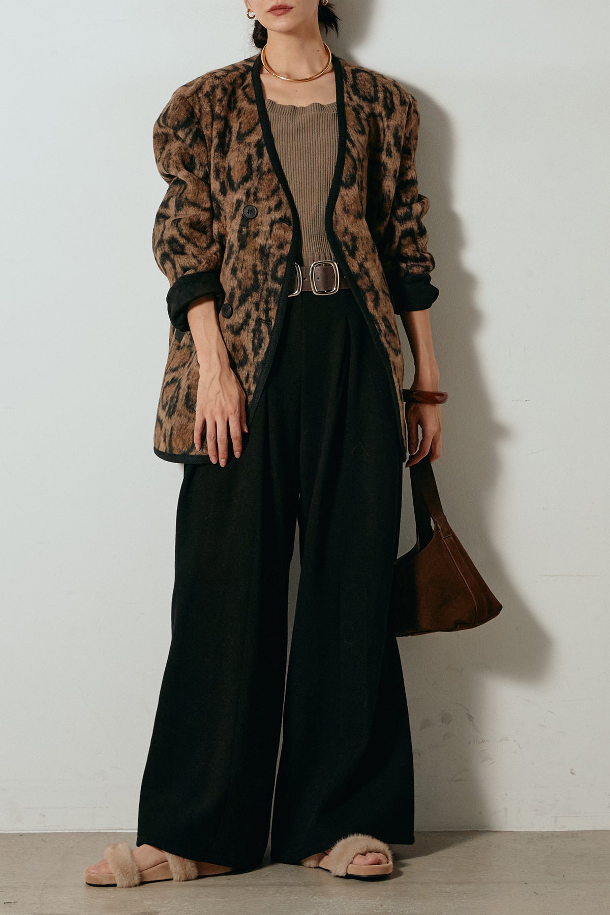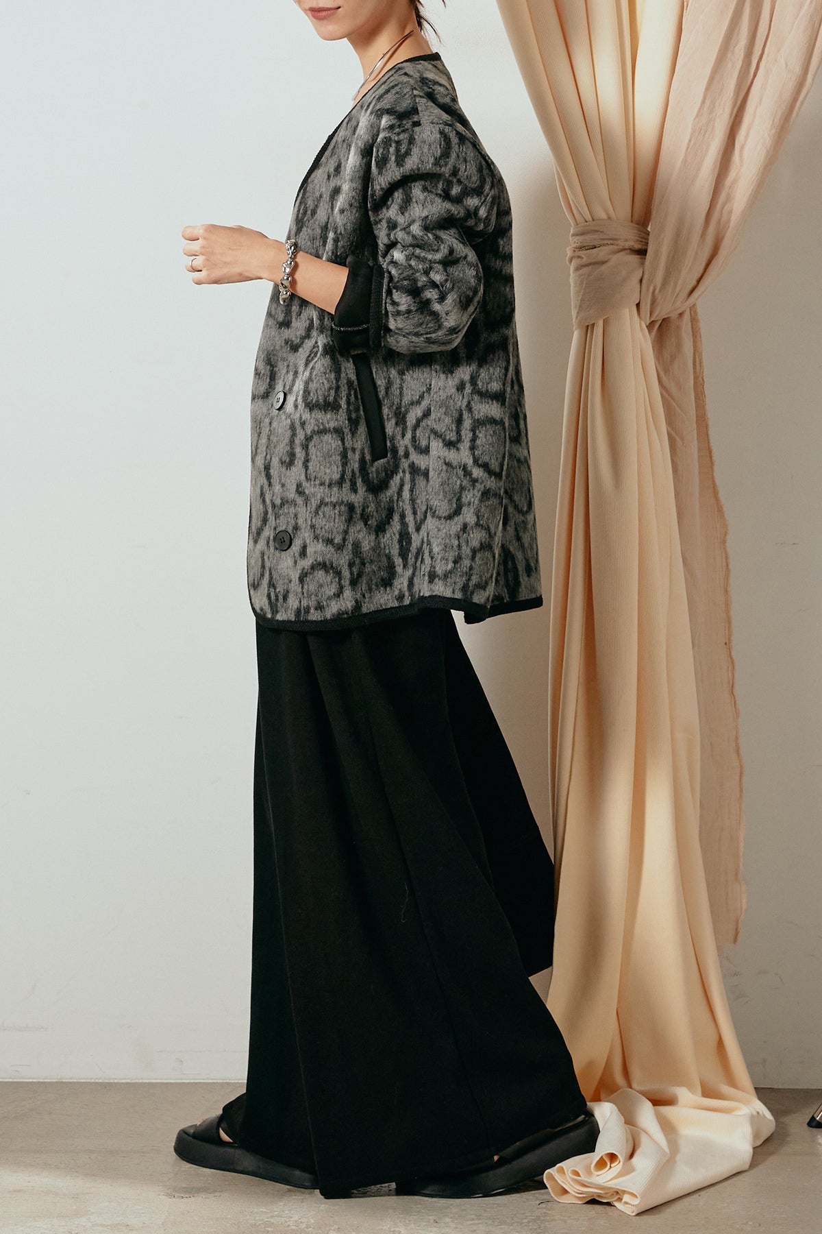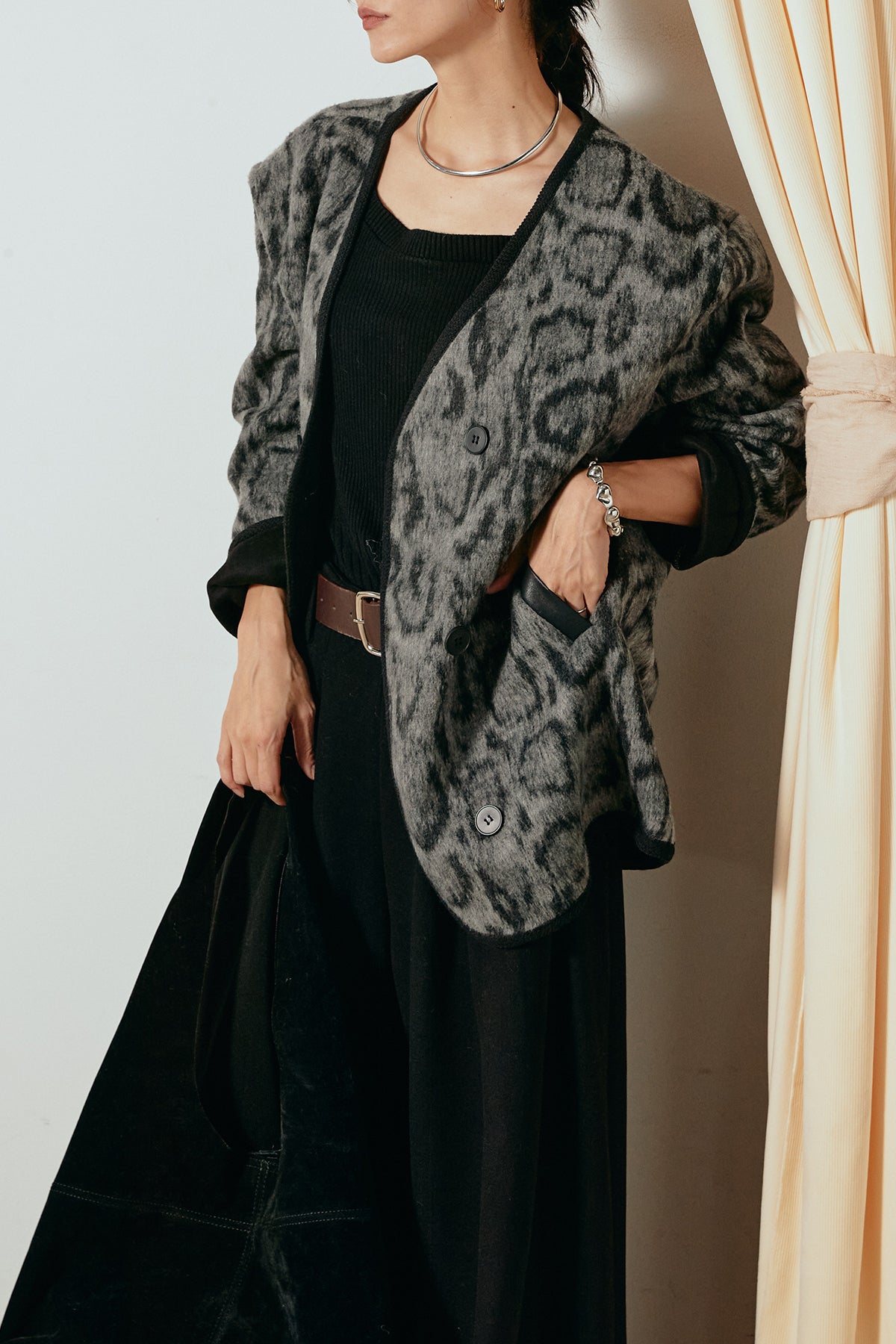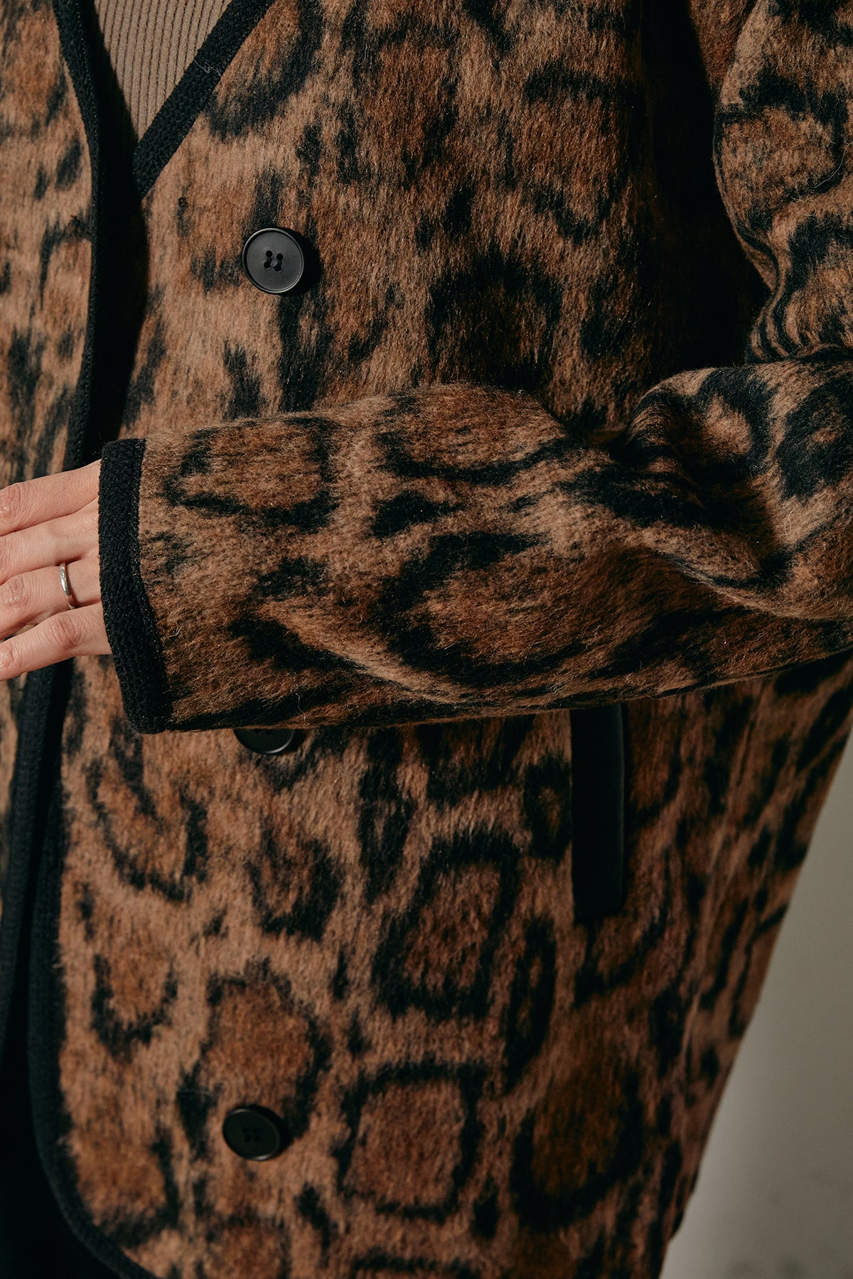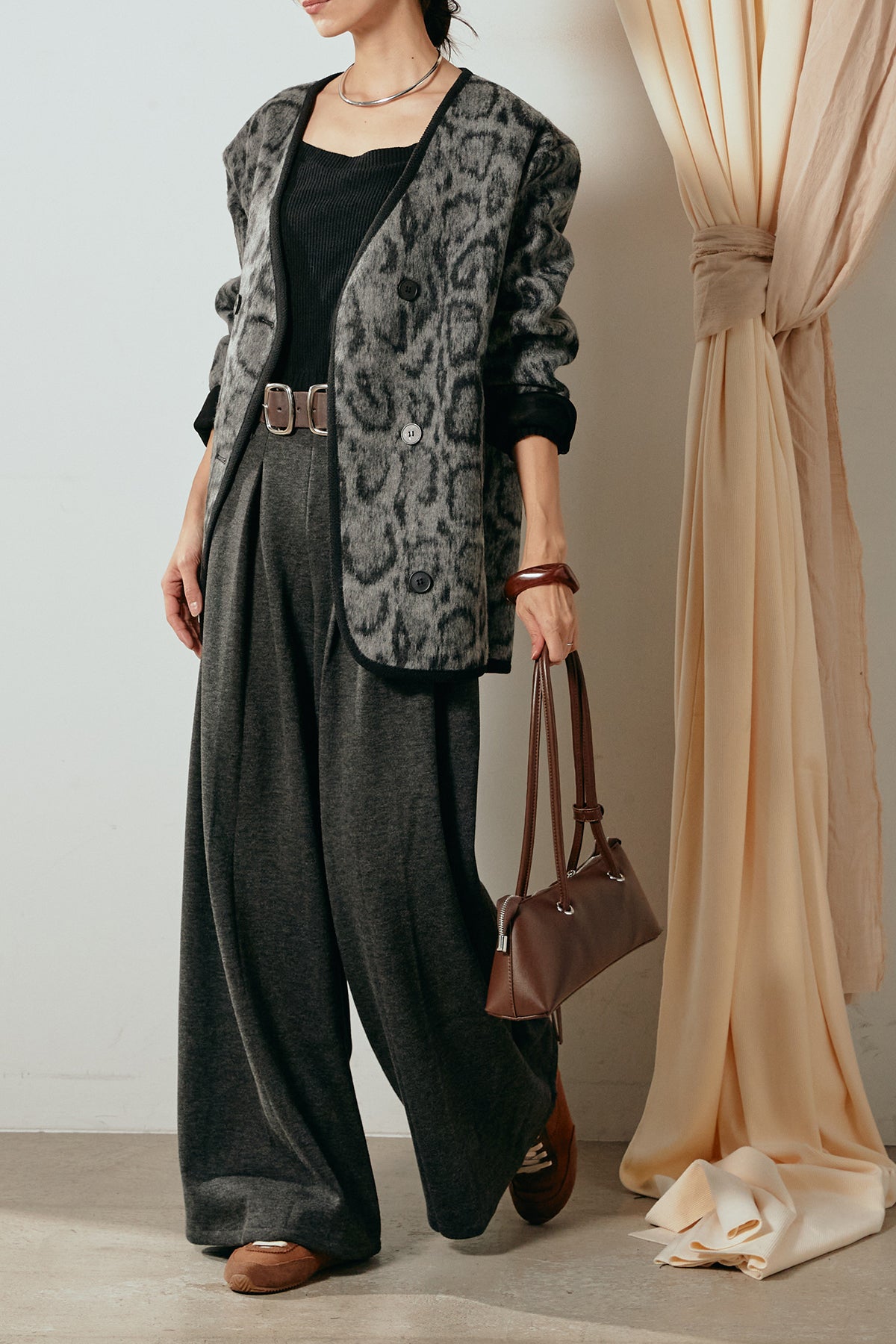 存在感のあるレオパード柄が目を惹くノーカラーアウター。