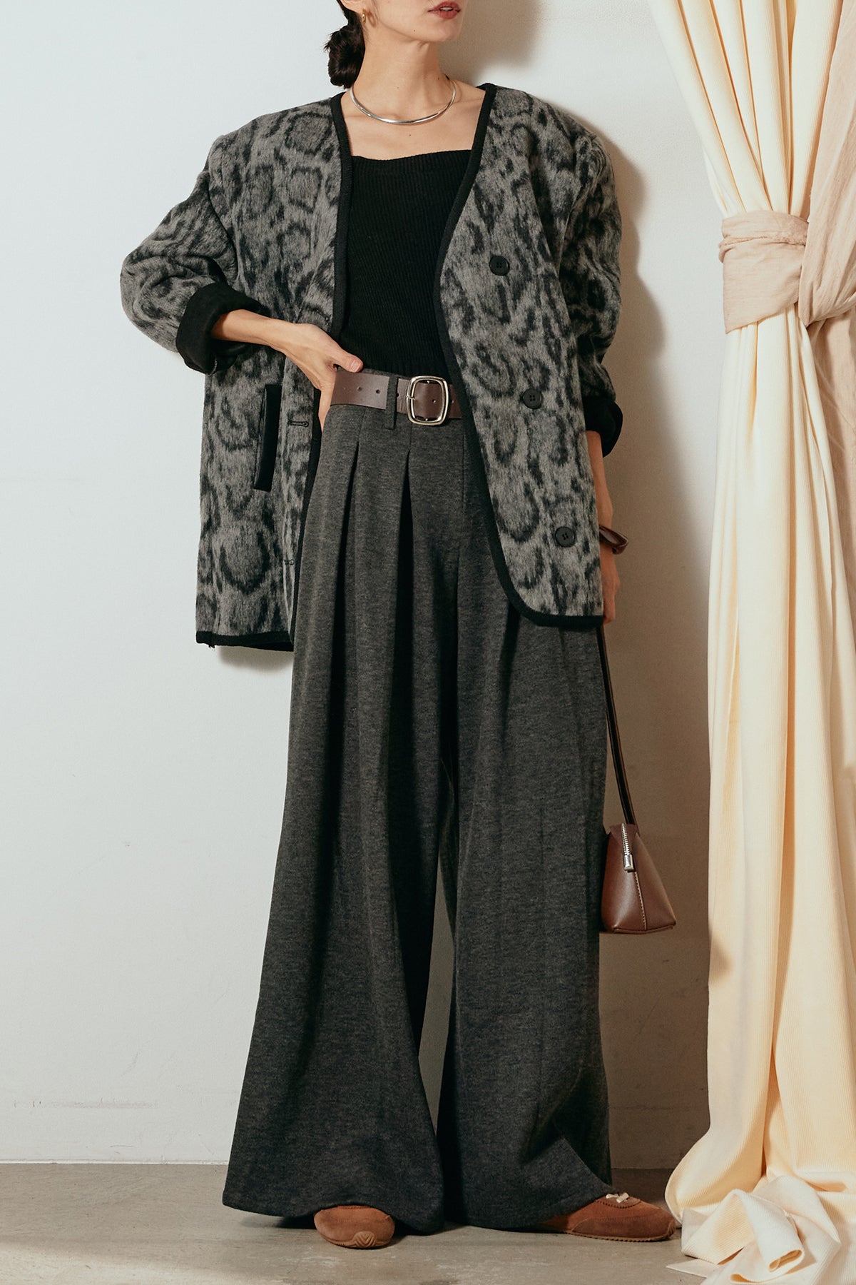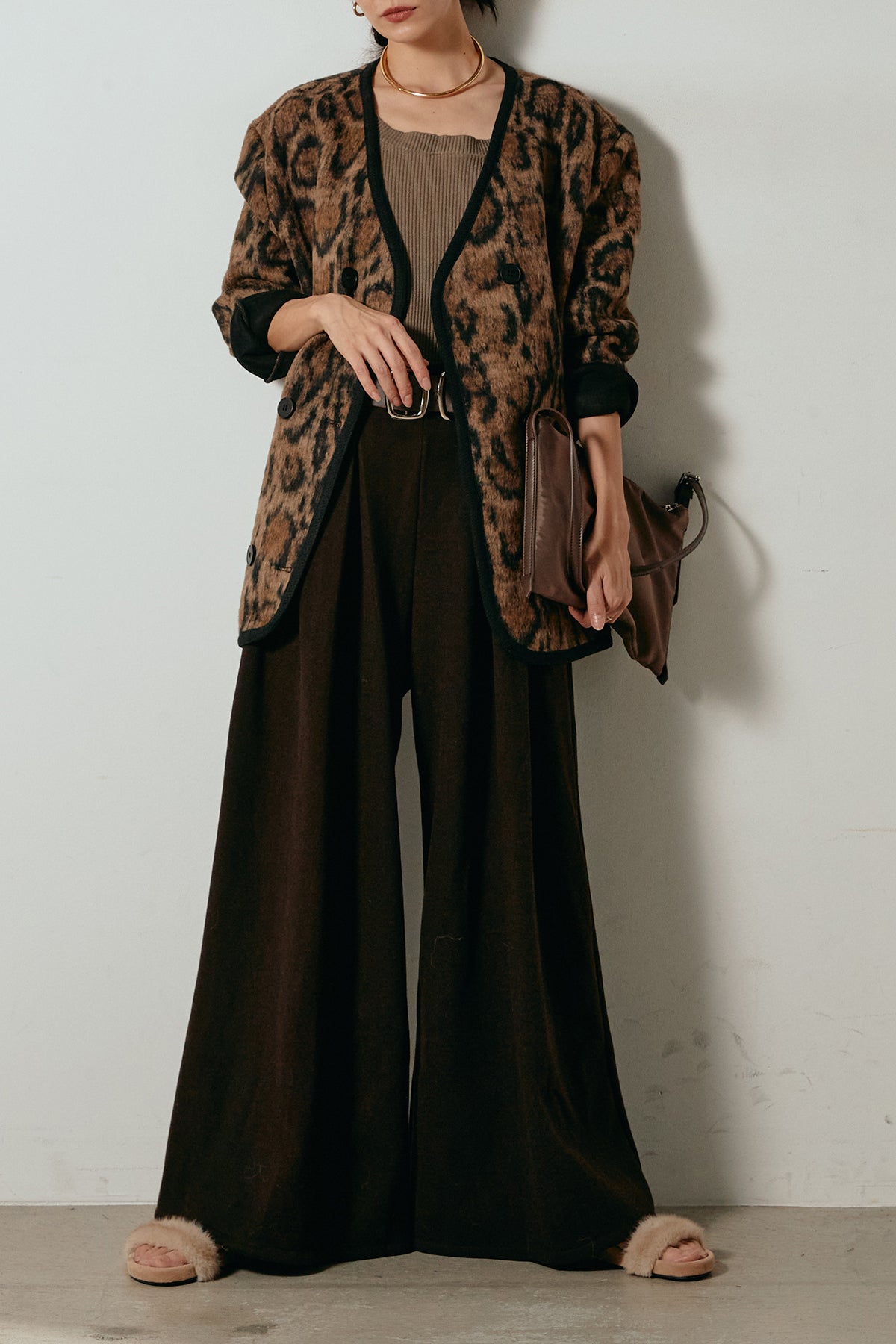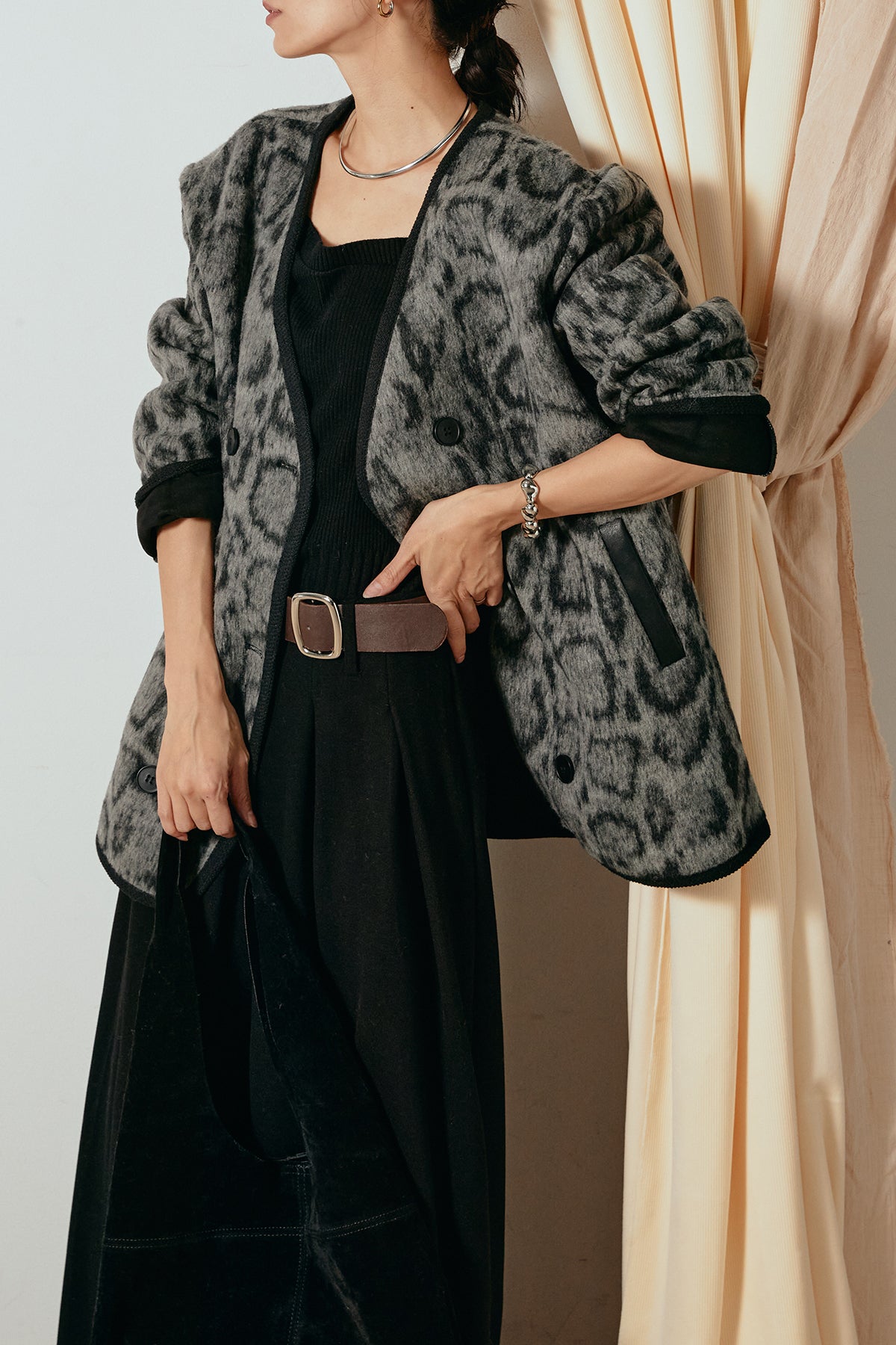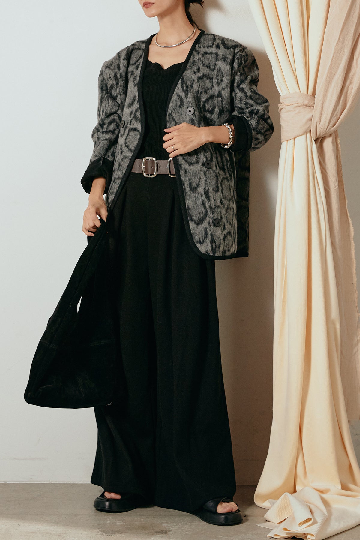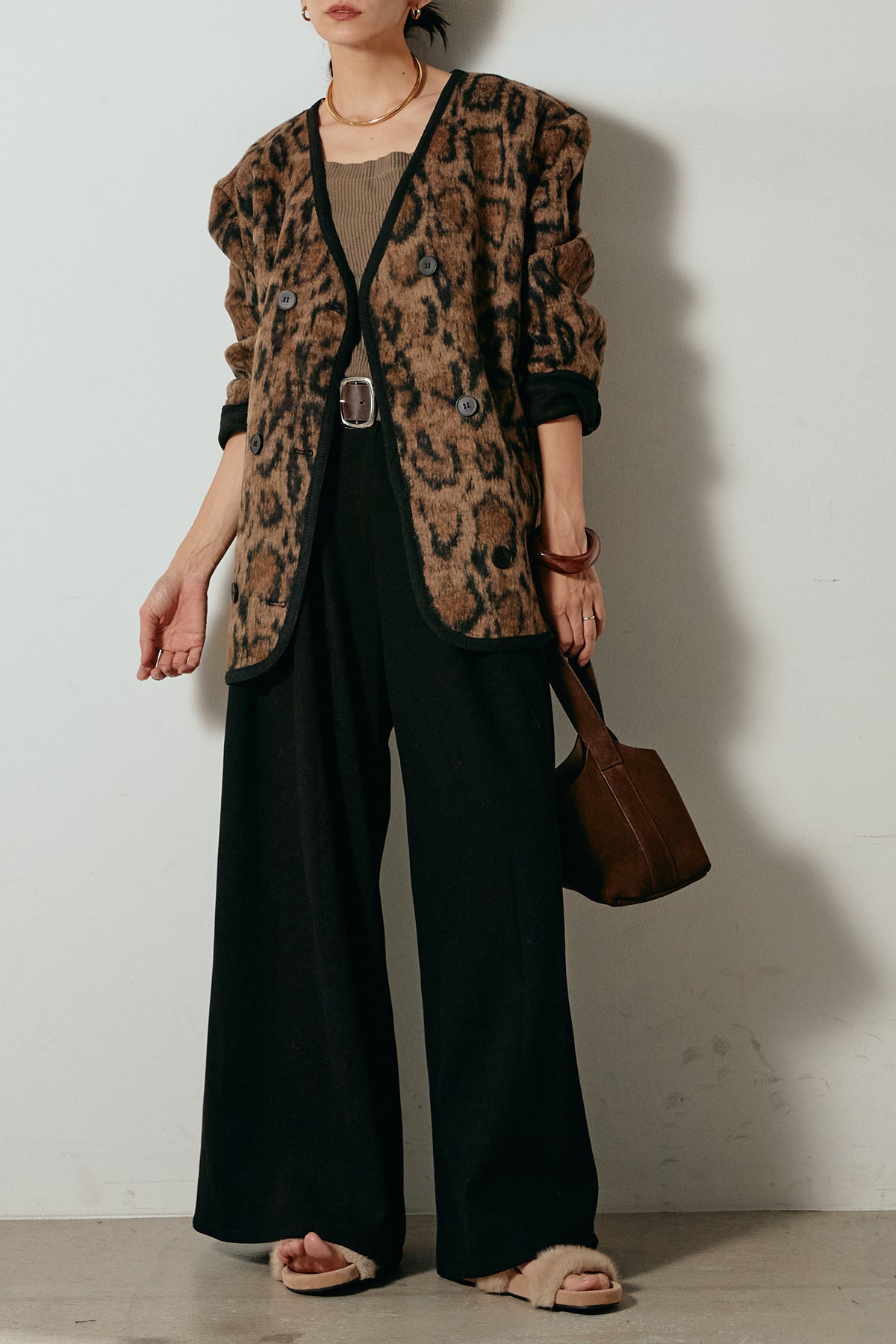 存在感のあるレオパード柄が目を惹くノーカラーアウター。