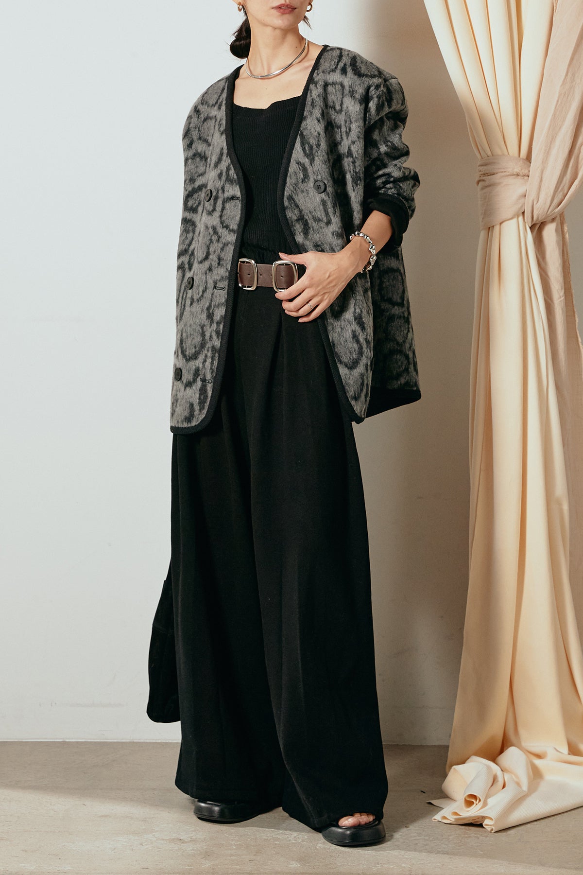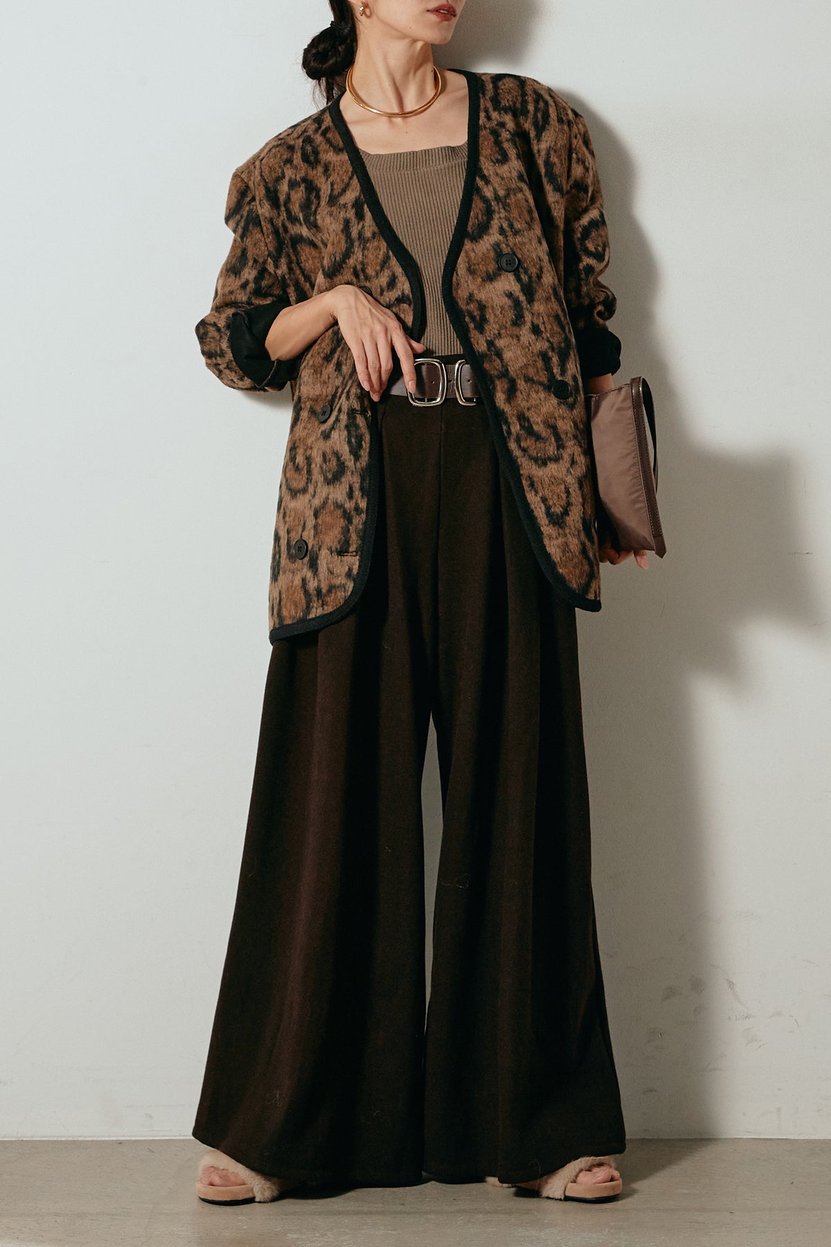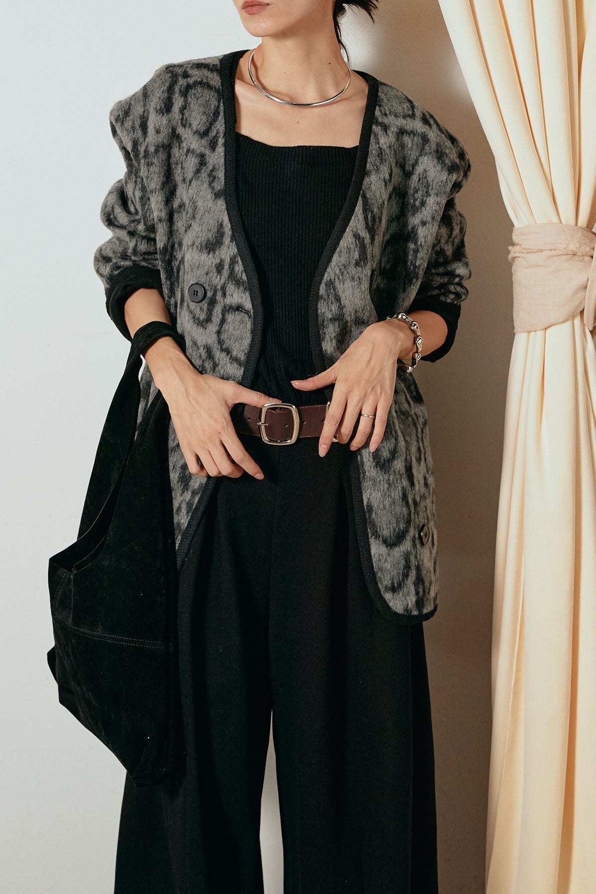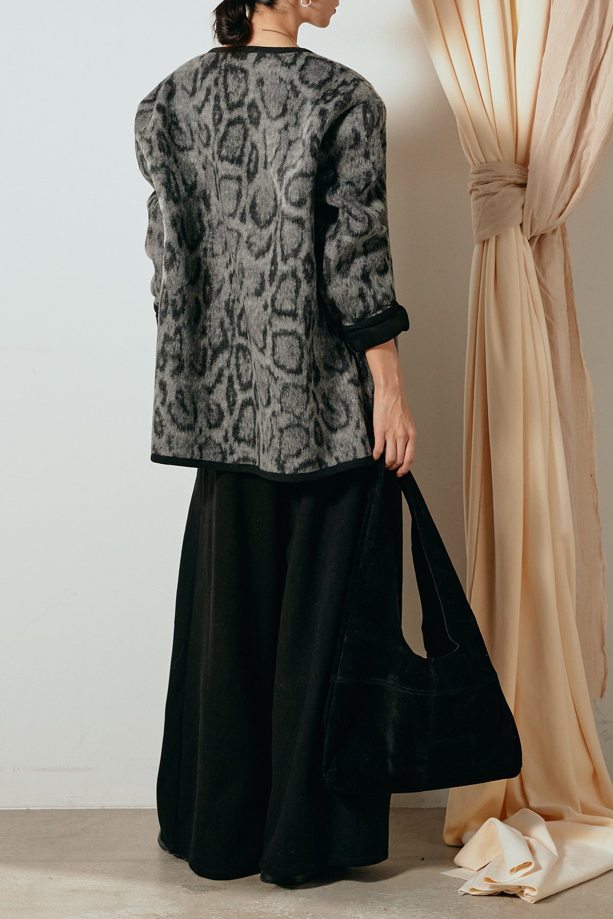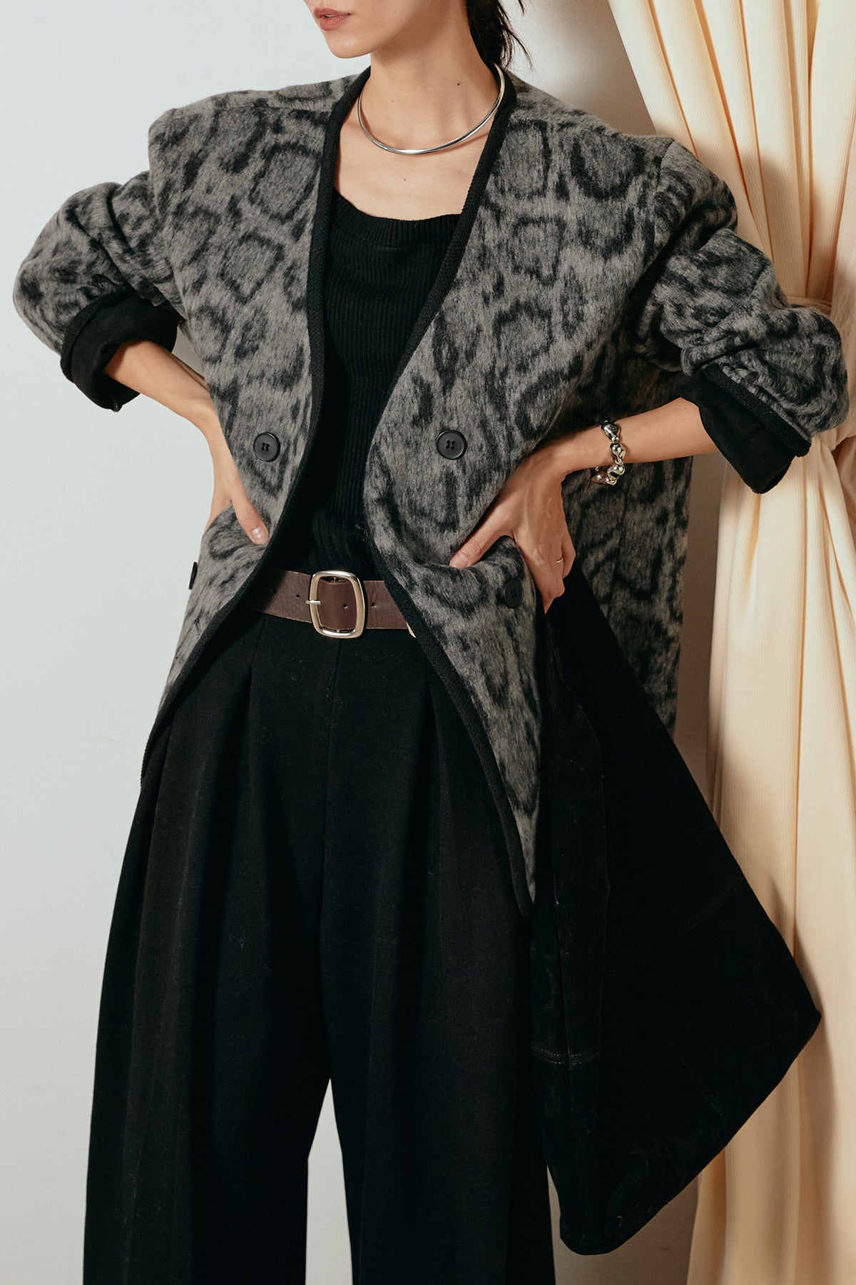 存在感のあるレオパード柄が目を惹くノーカラーアウター。