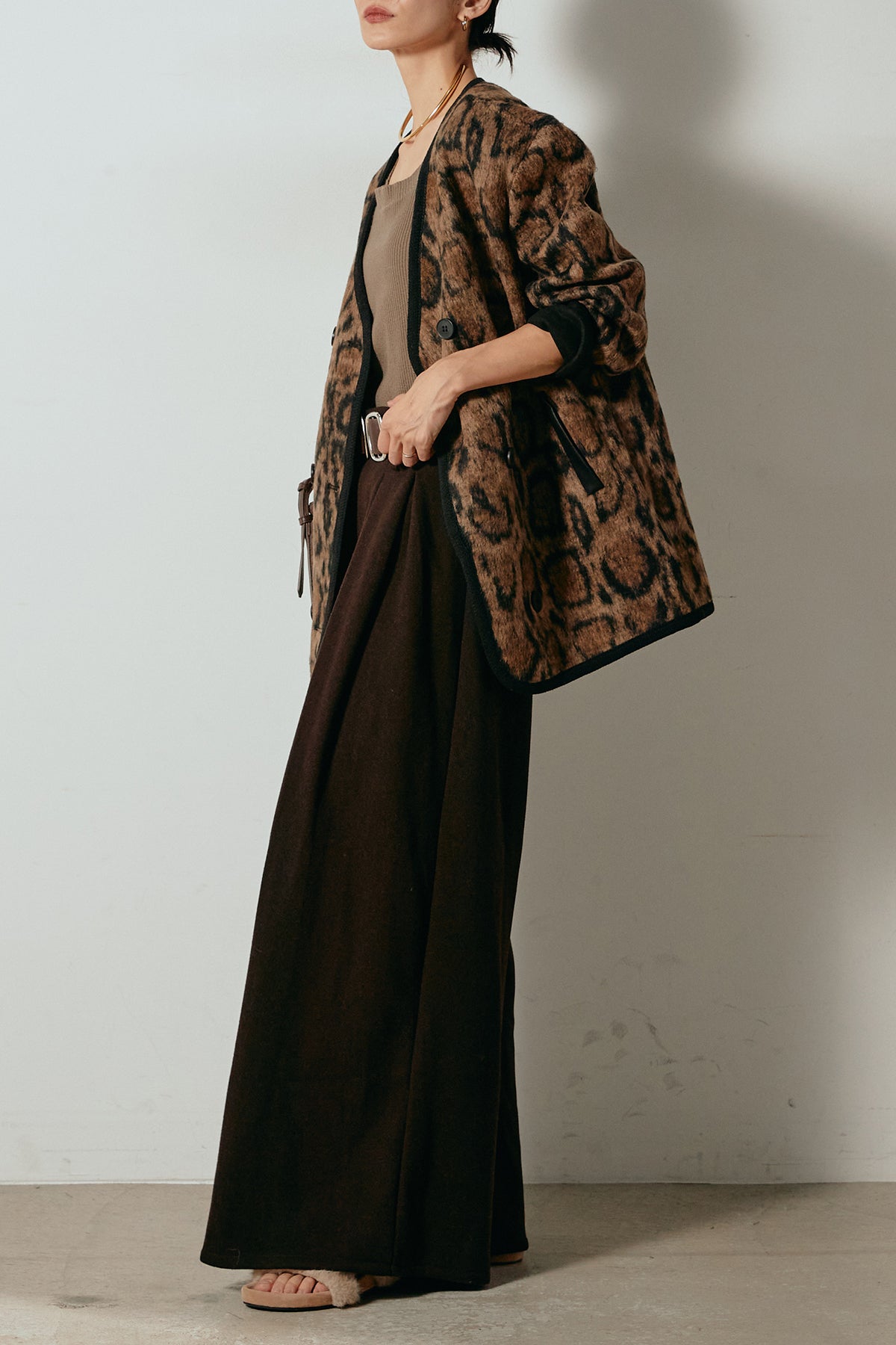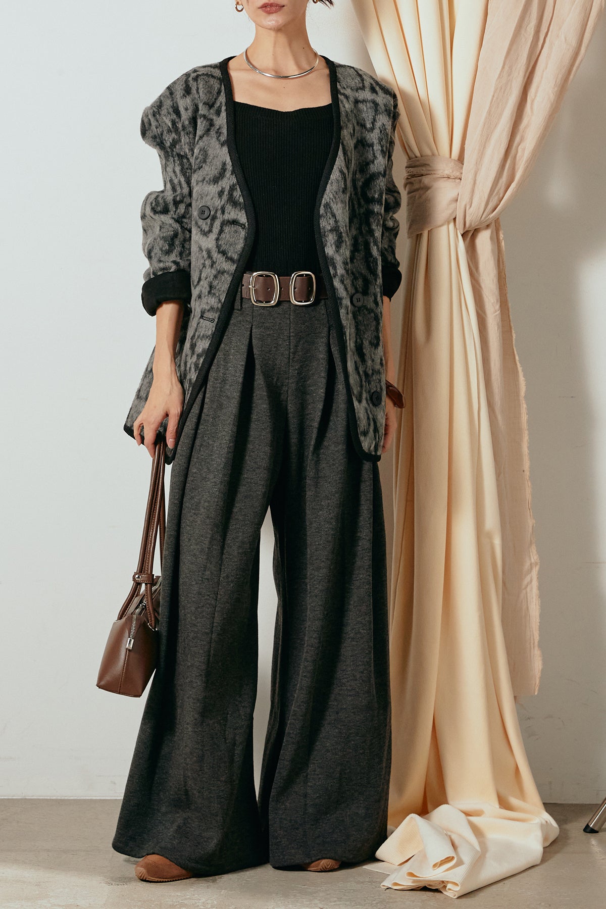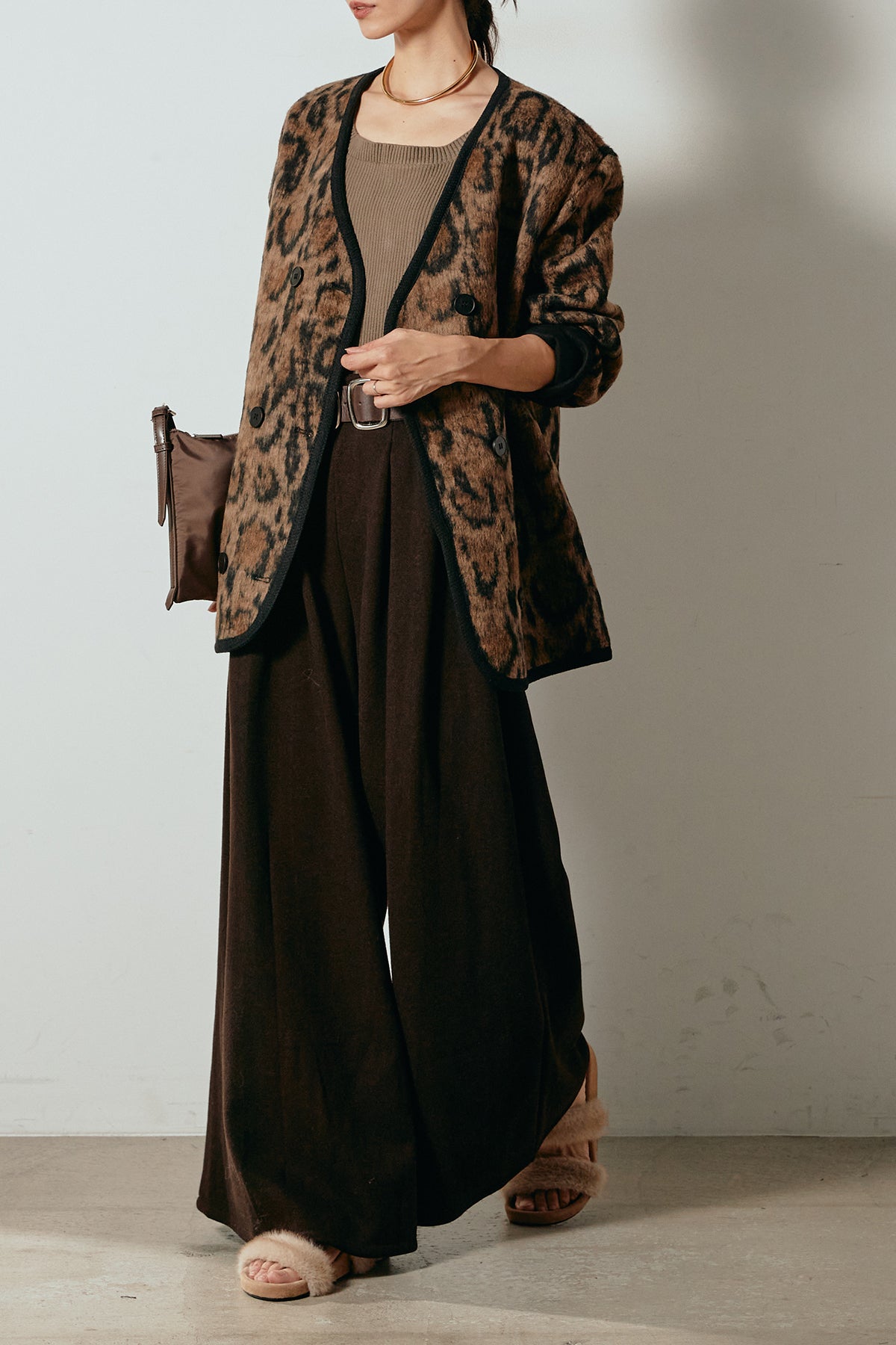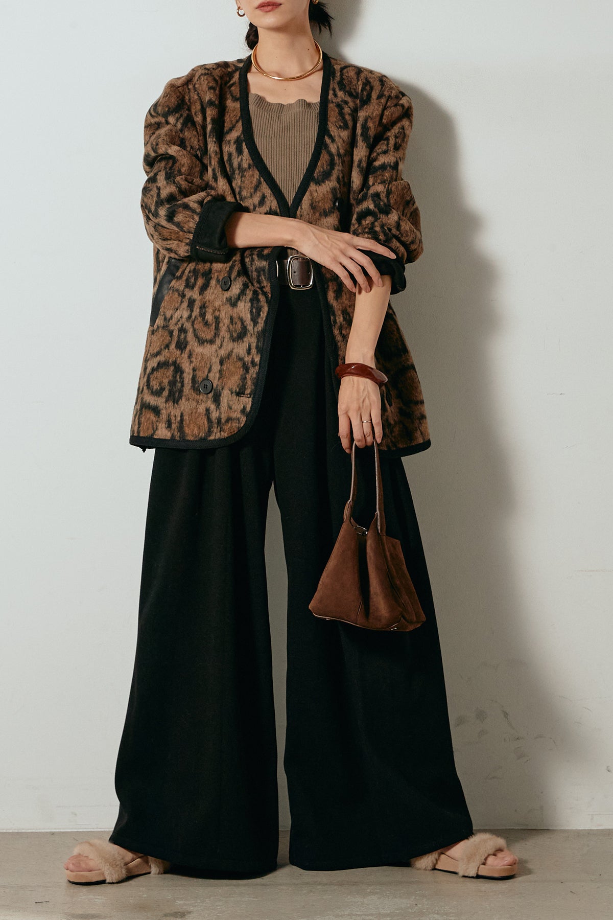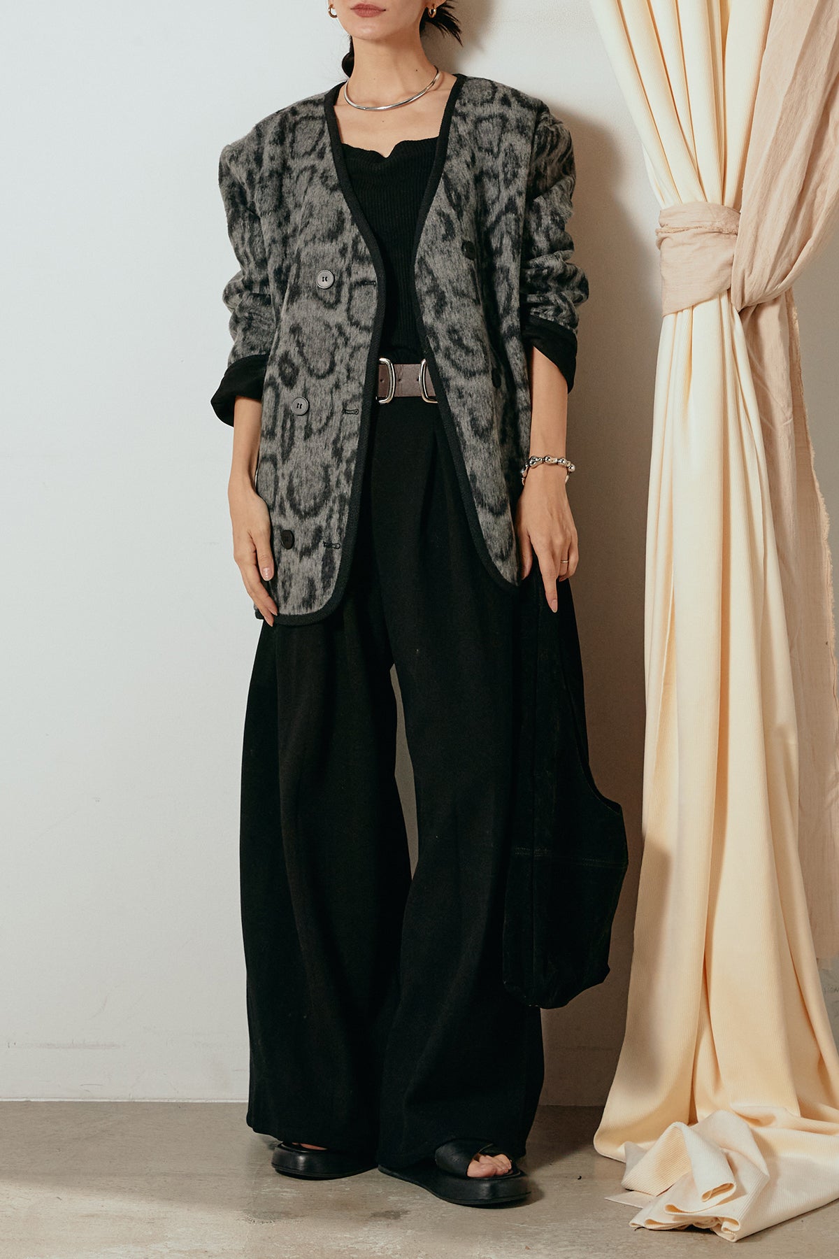 存在感のあるレオパード柄が目を惹くノーカラーアウター。