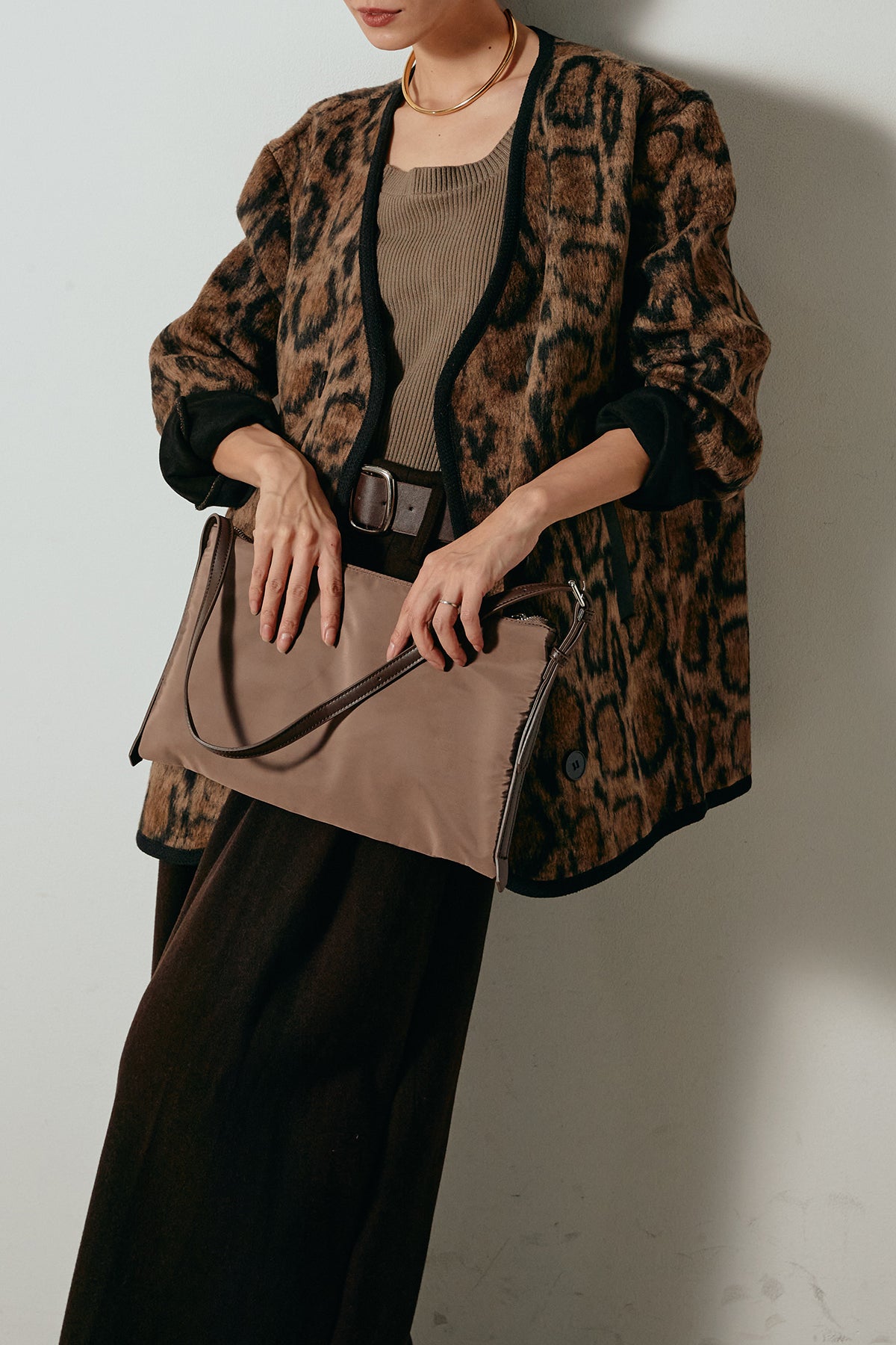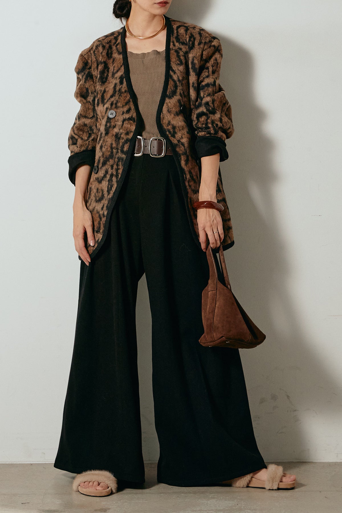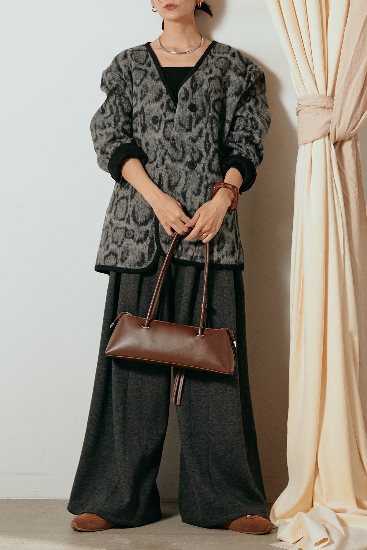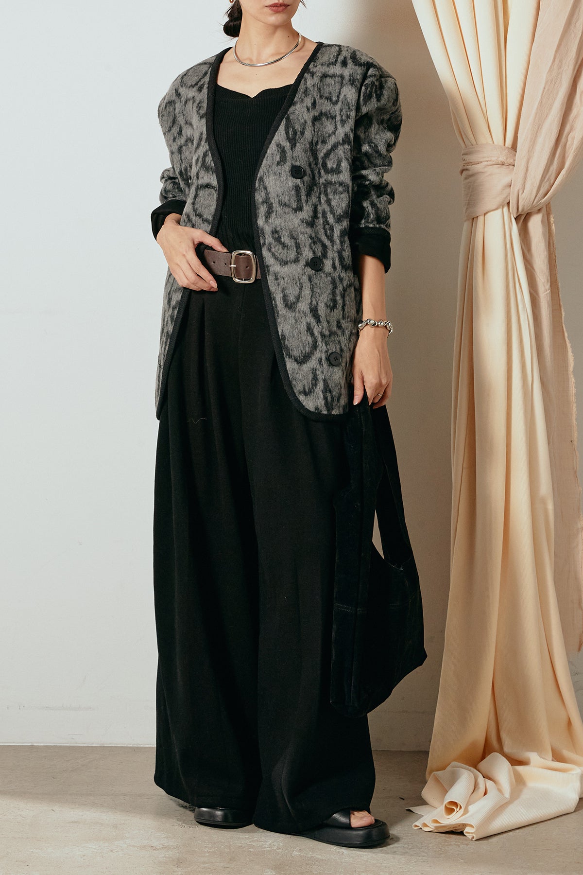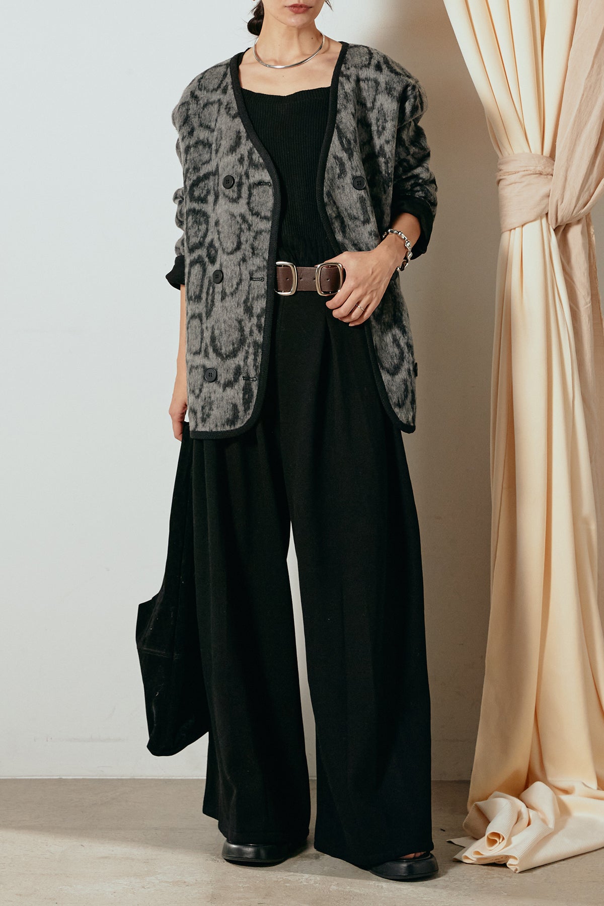 存在感のあるレオパード柄が目を惹くノーカラーアウター。