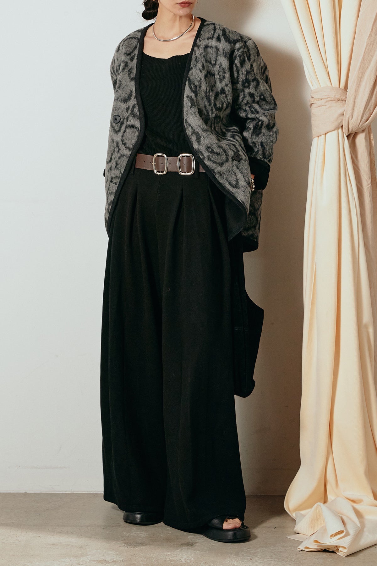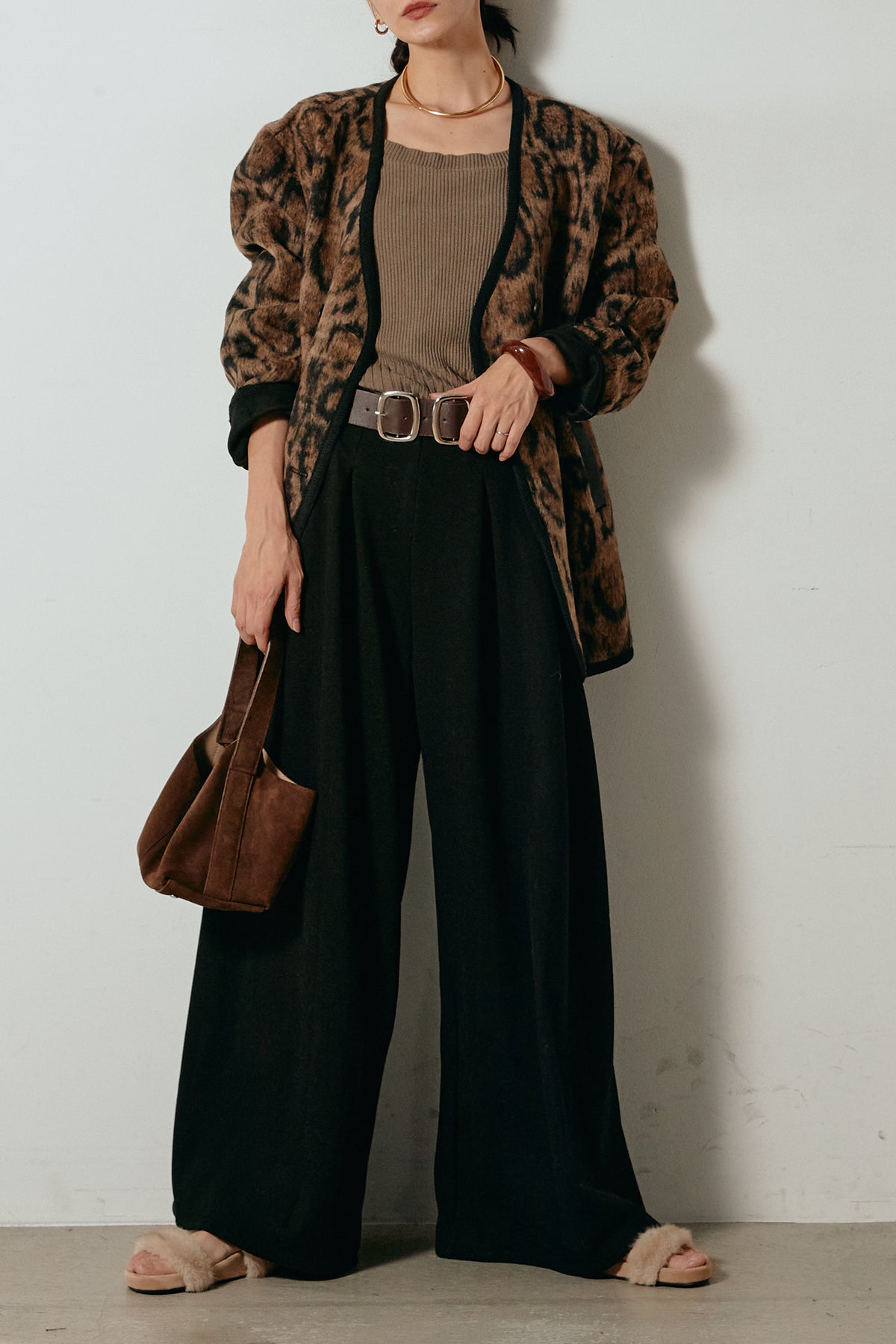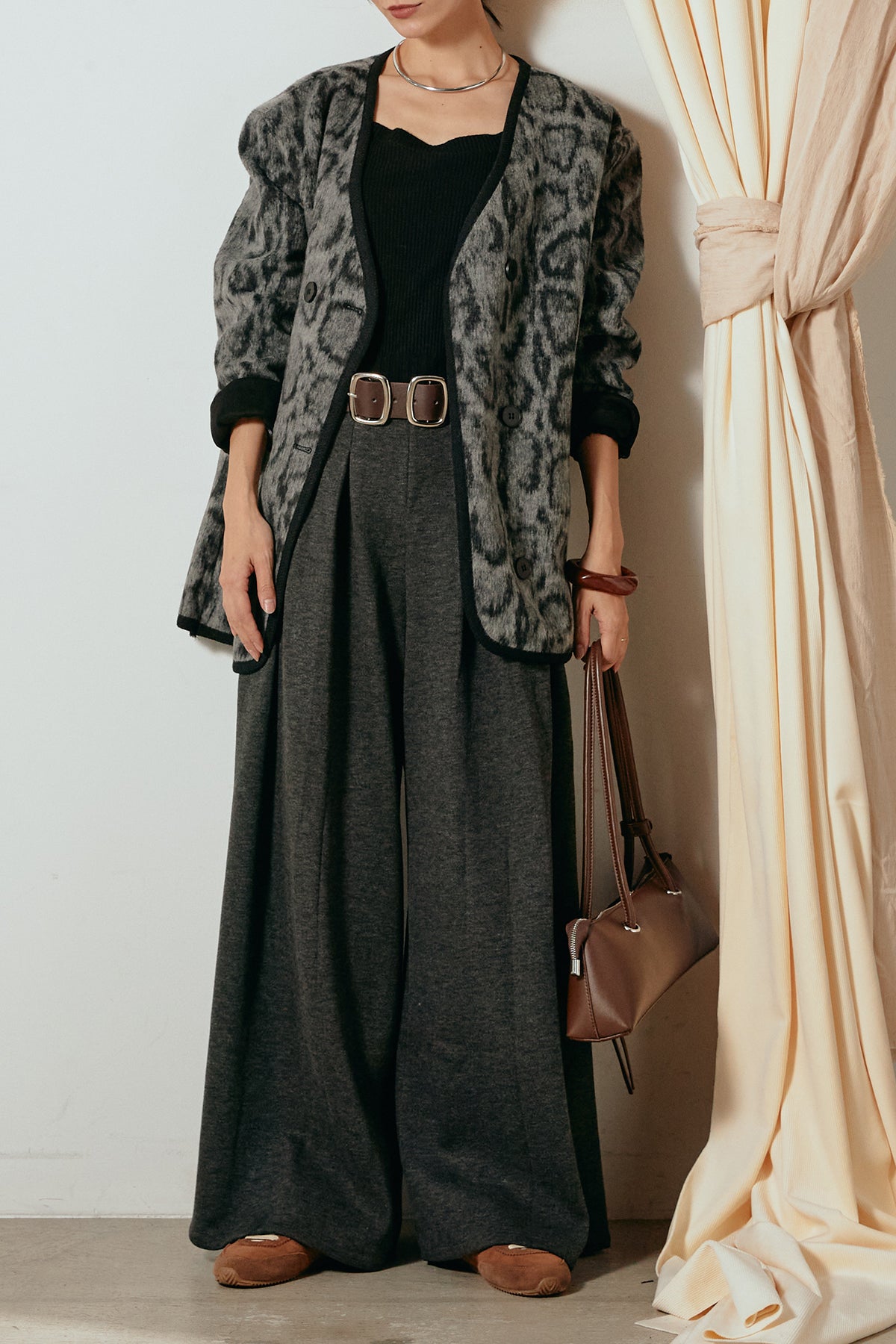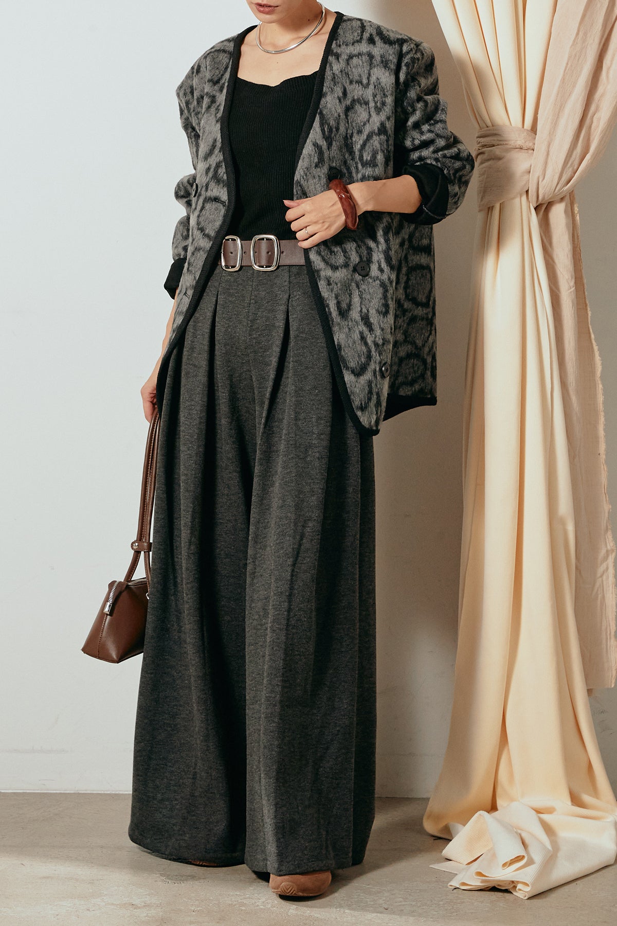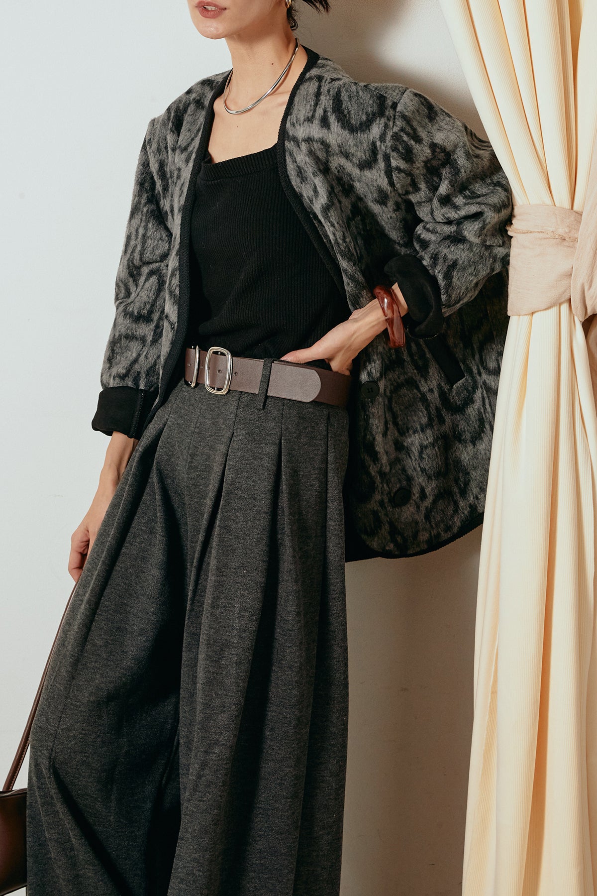 存在感のあるレオパード柄が目を惹くノーカラーアウター。