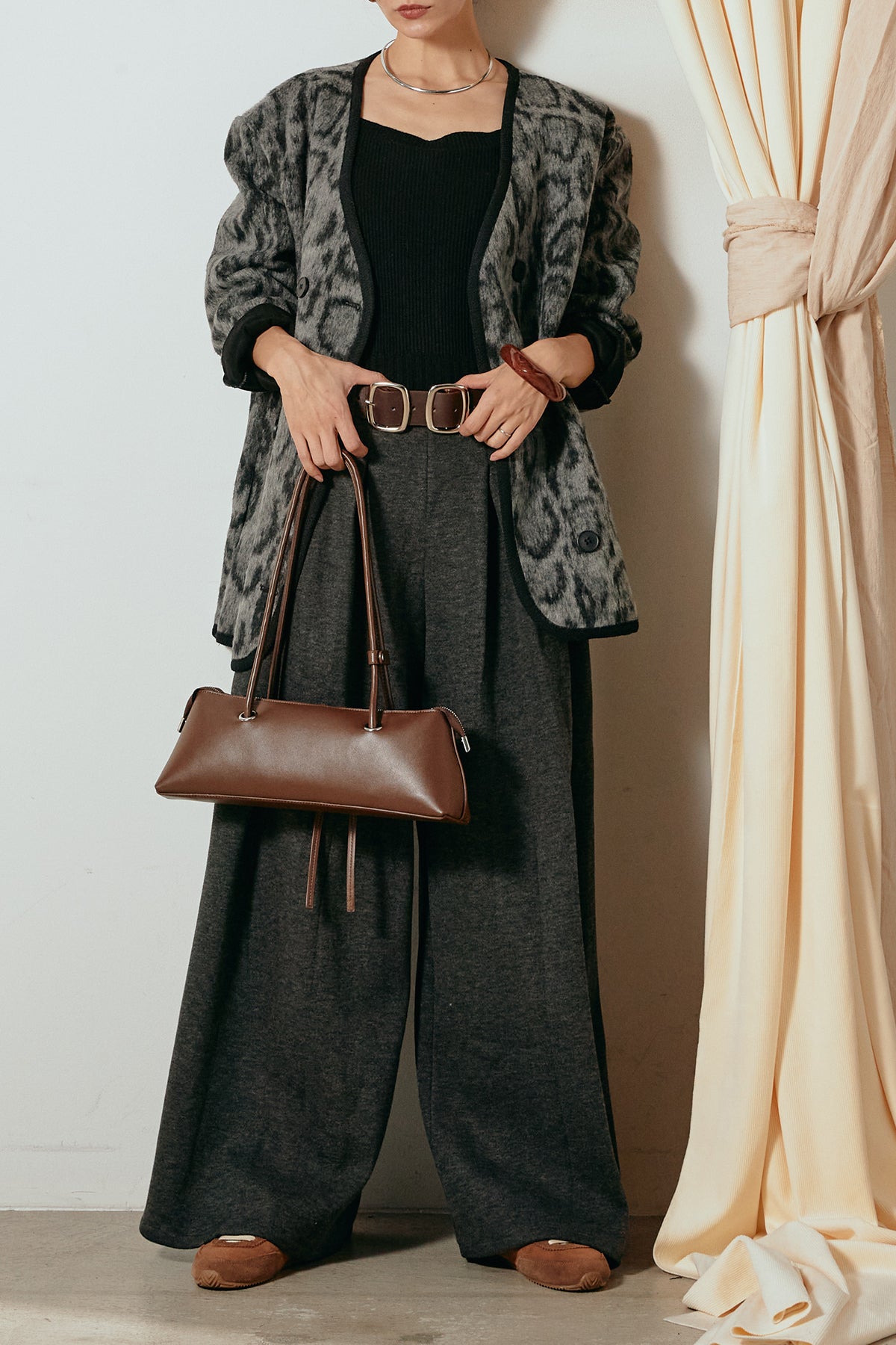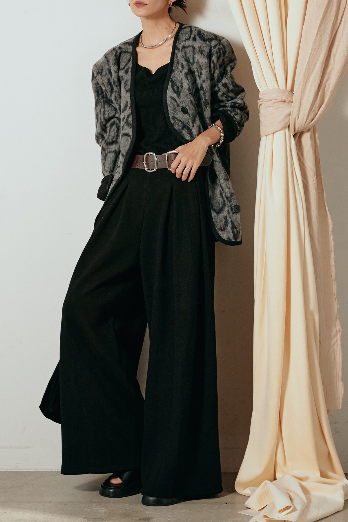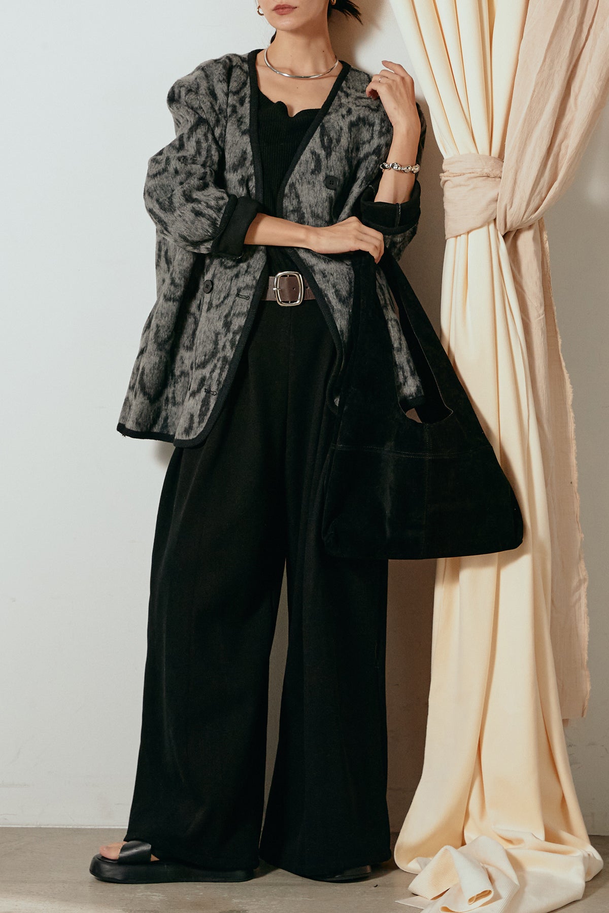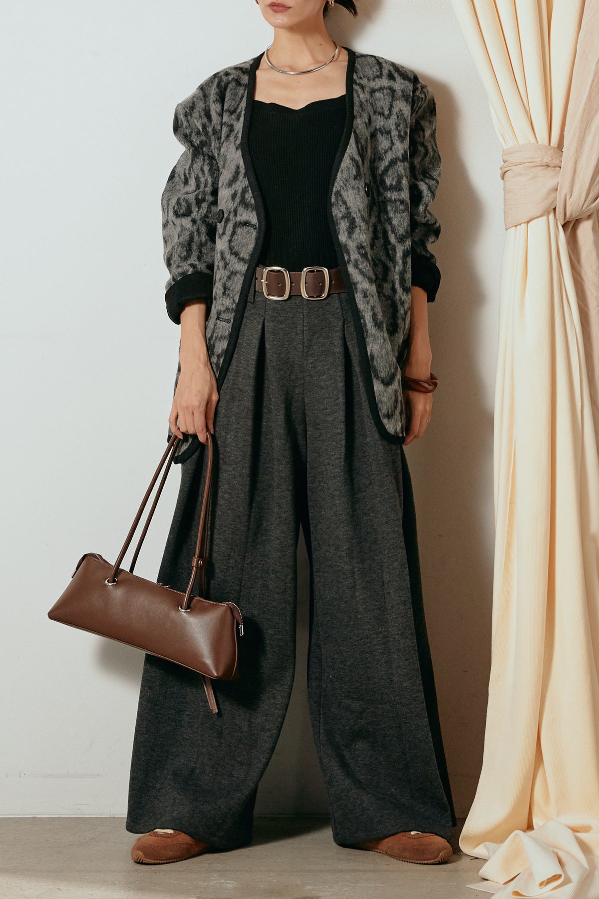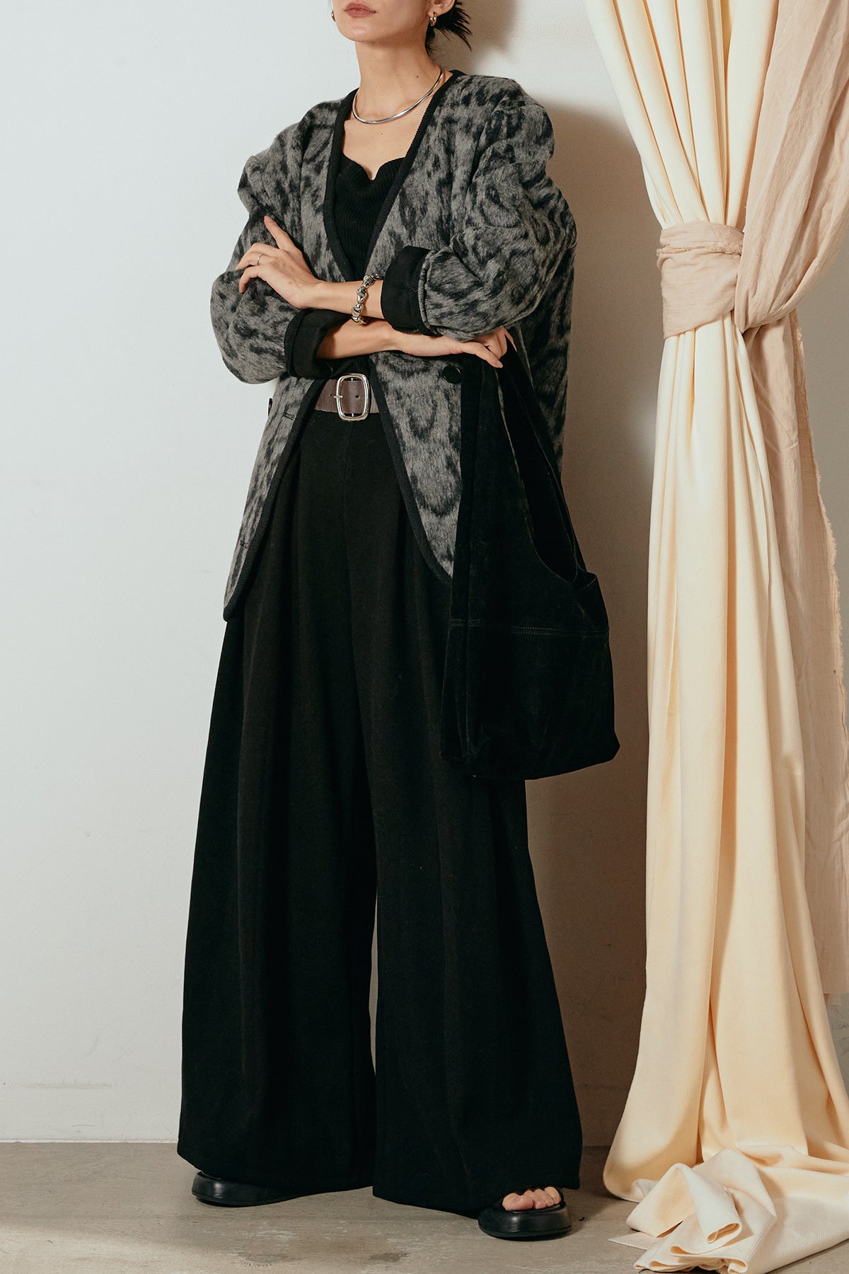 存在感のあるレオパード柄が目を惹くノーカラーアウター。