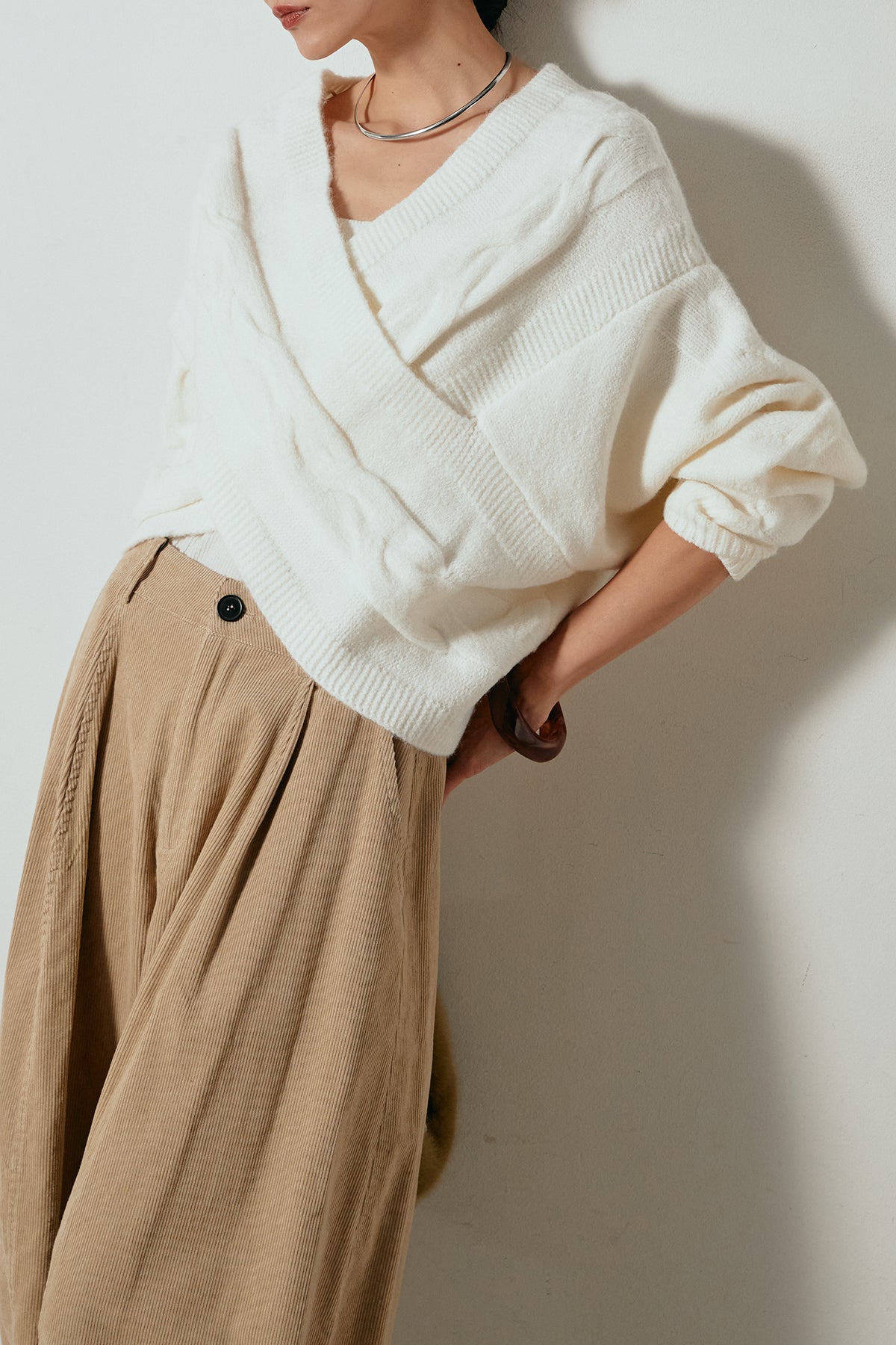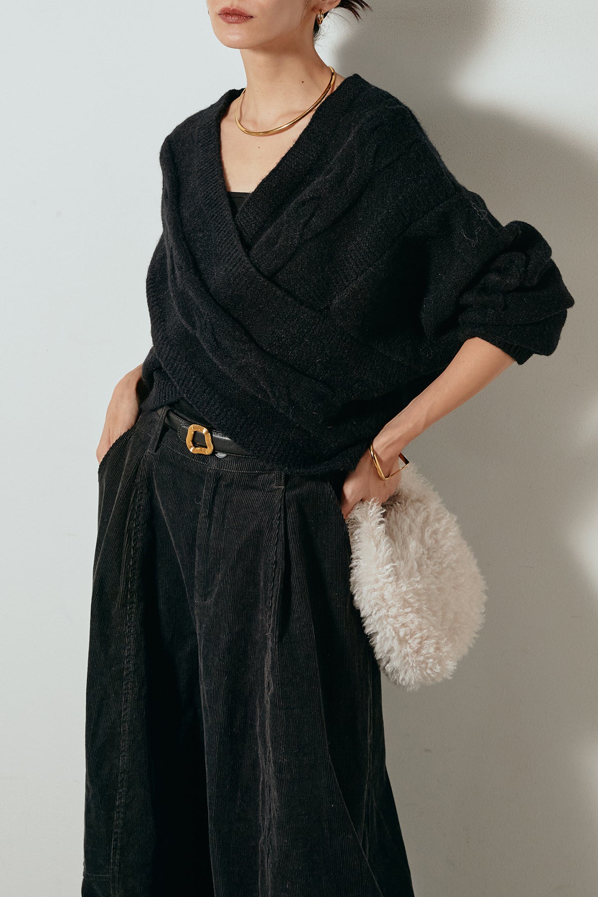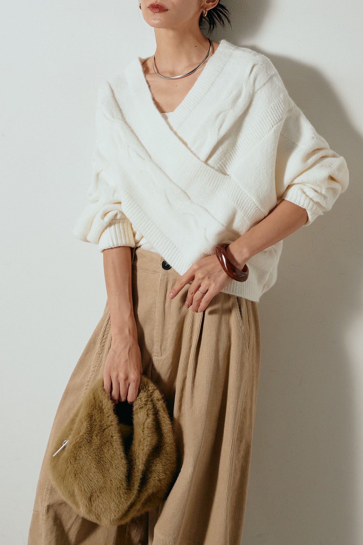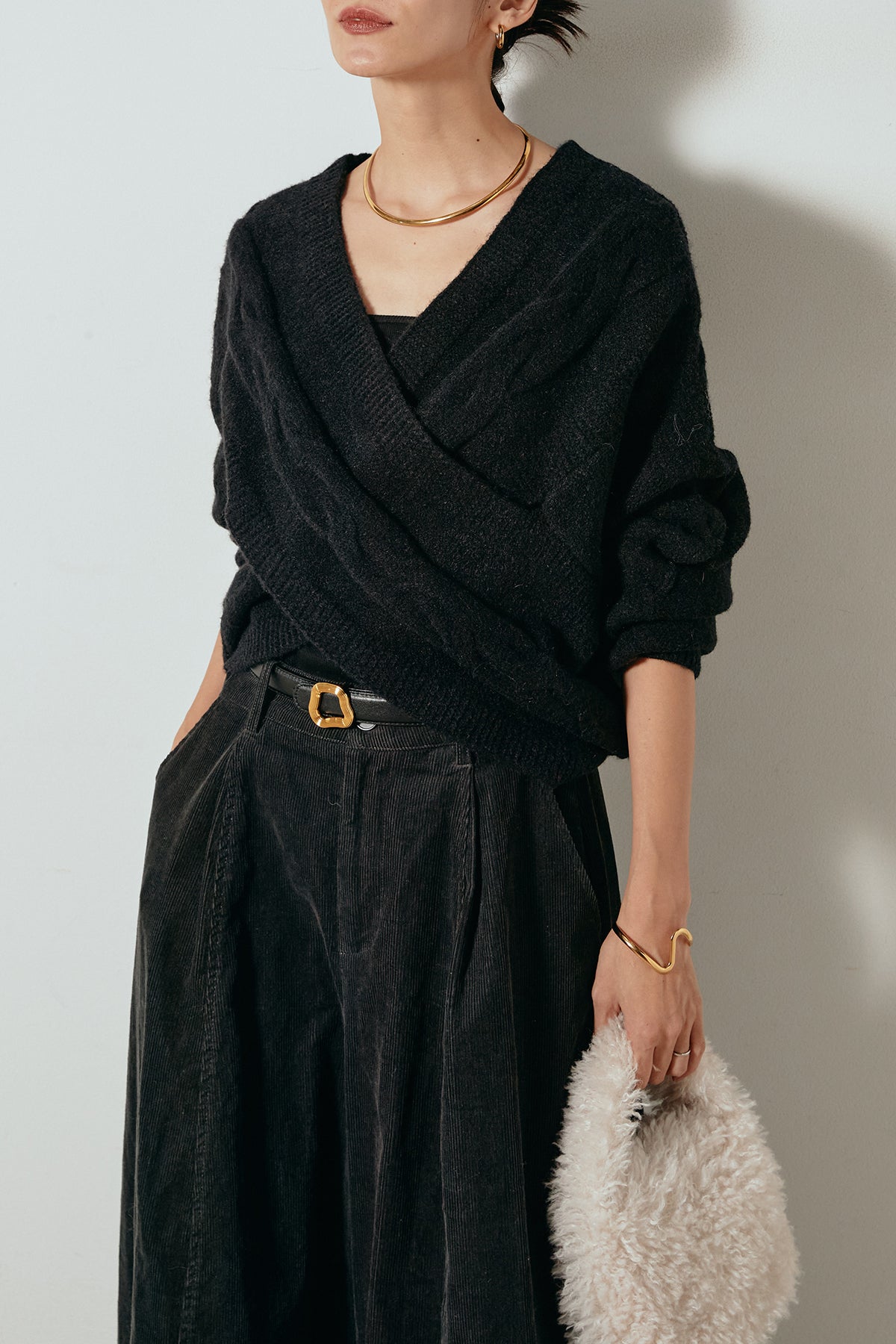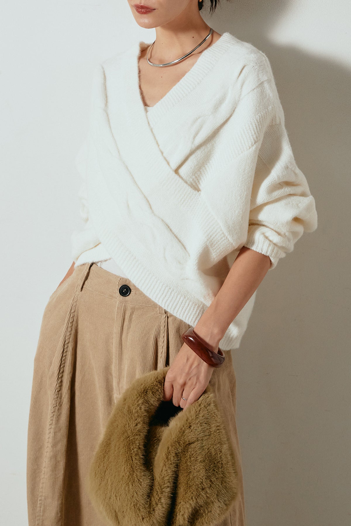 立体的なケーブル編みが目を惹くカシュクールニットトップス。 程よく開いたVネックが顔まわりをすっきり見せ、抜け感のあるバランスを演出します。 やわらかな風合いとリラクシーなシルエットで、女性らしさと上品さを兼ね備えた一枚。 パンツにもスカートにも合わせやすく、デイリーに活躍する万能アイテムです。