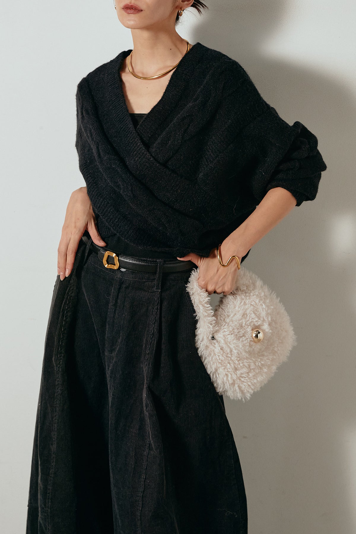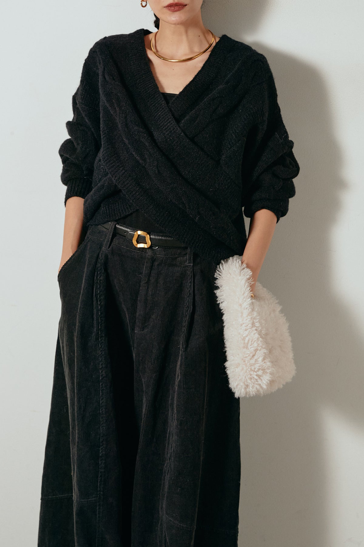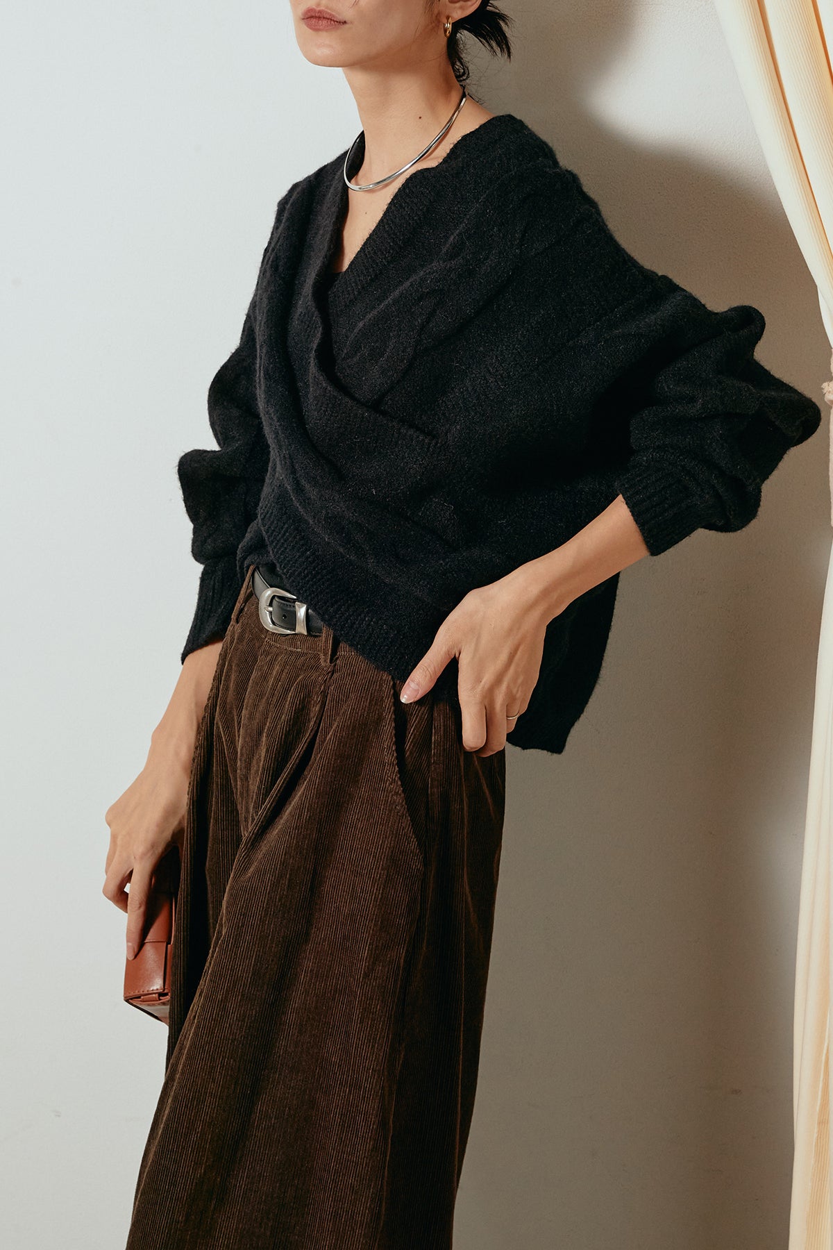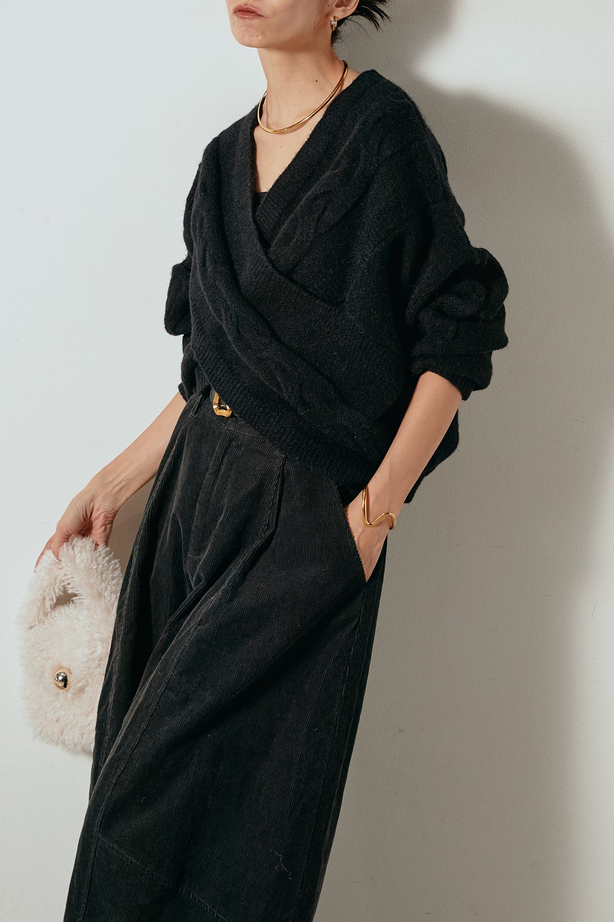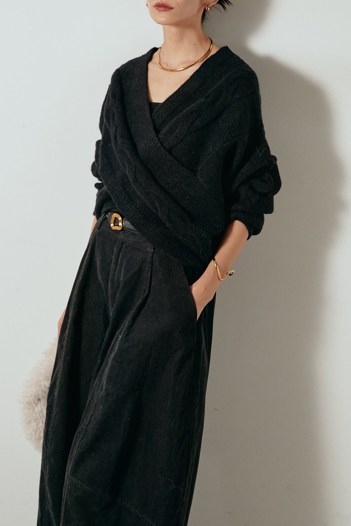 立体的なケーブル編みが目を惹くカシュクールニットトップス。 程よく開いたVネックが顔まわりをすっきり見せ、抜け感のあるバランスを演出します。 やわらかな風合いとリラクシーなシルエットで、女性らしさと上品さを兼ね備えた一枚。 パンツにもスカートにも合わせやすく、デイリーに活躍する万能アイテムです。