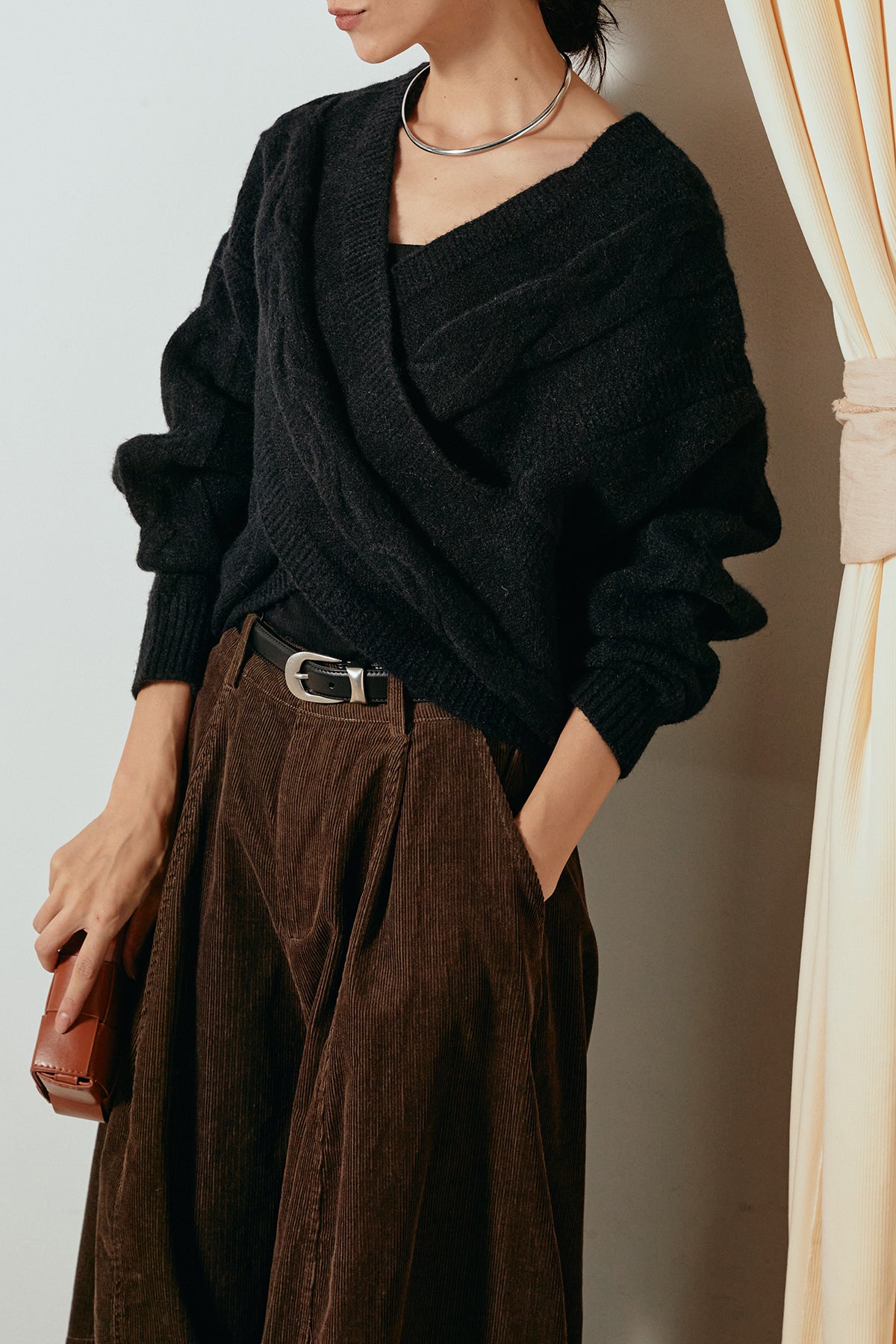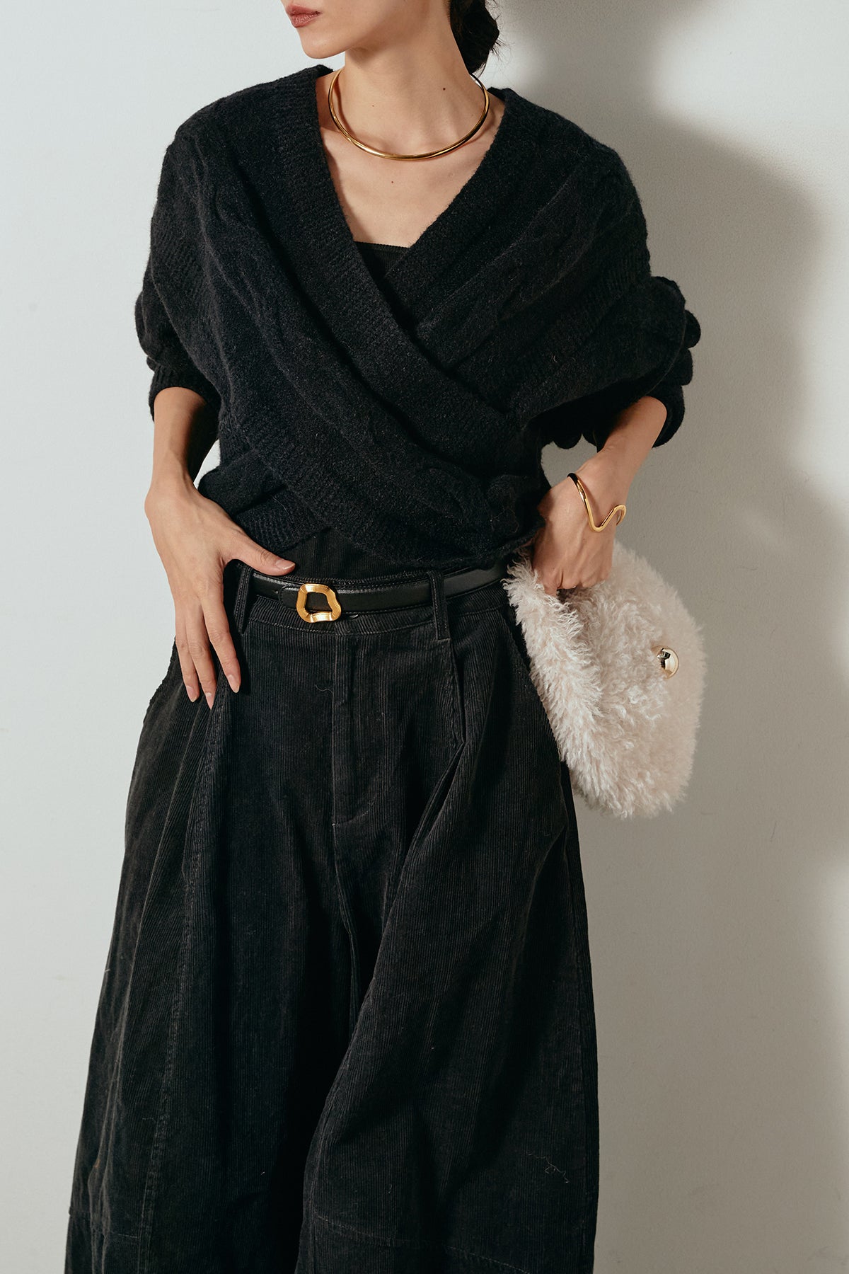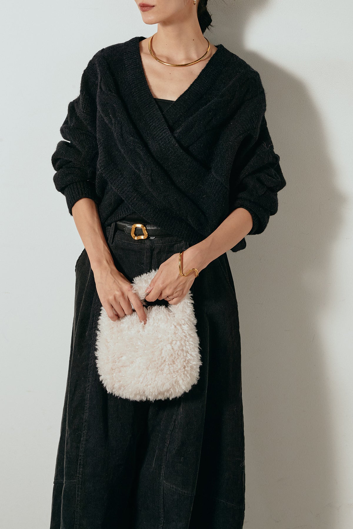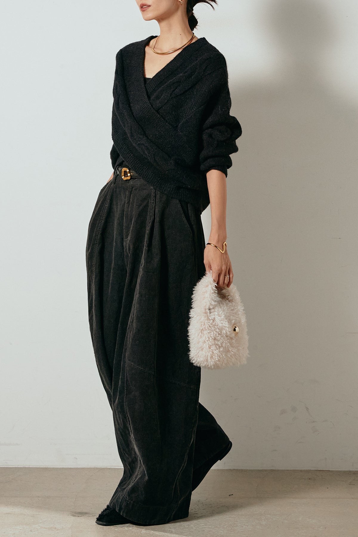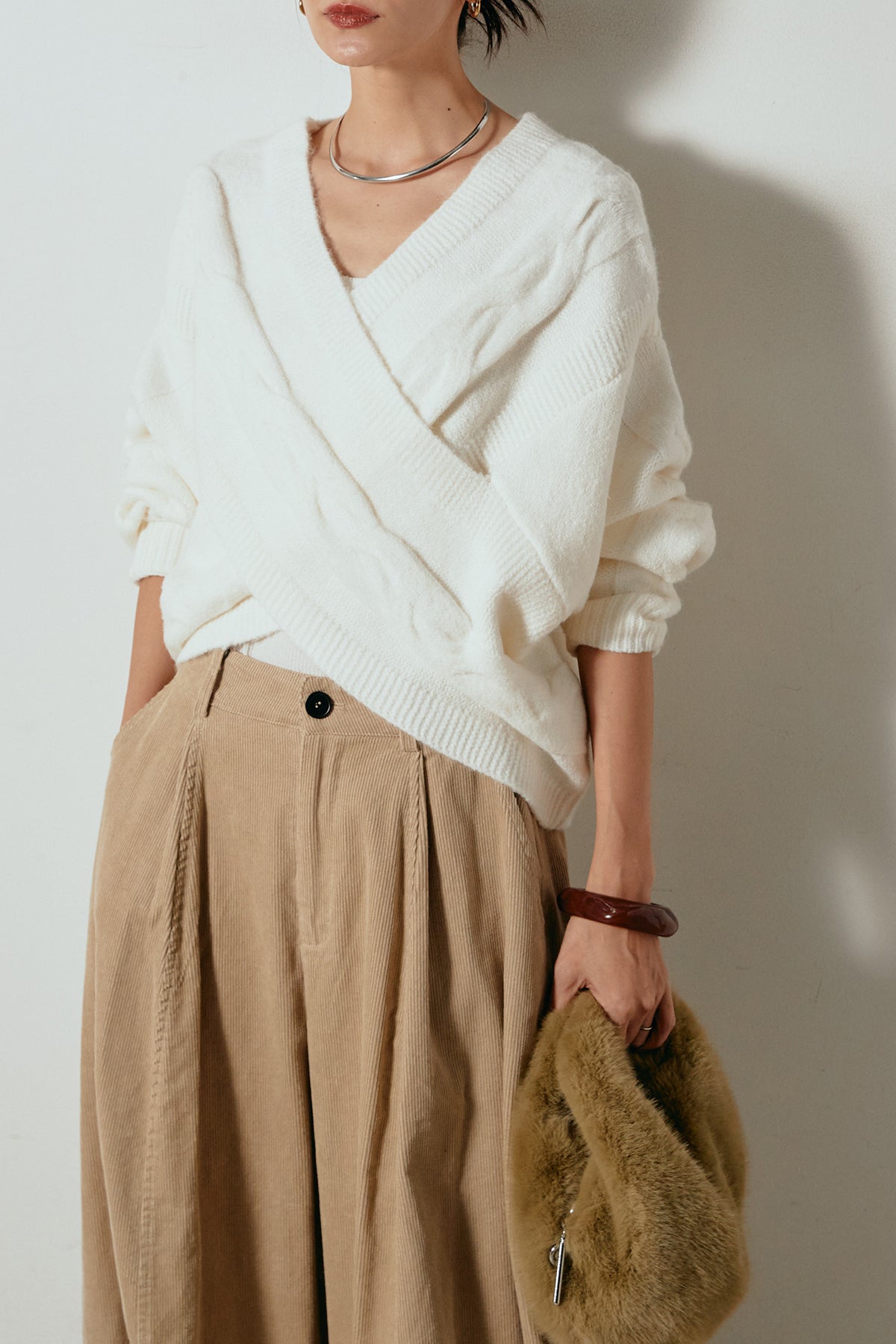 立体的なケーブル編みが目を惹くカシュクールニットトップス。 程よく開いたVネックが顔まわりをすっきり見せ、抜け感のあるバランスを演出します。 やわらかな風合いとリラクシーなシルエットで、女性らしさと上品さを兼ね備えた一枚。 パンツにもスカートにも合わせやすく、デイリーに活躍する万能アイテムです。