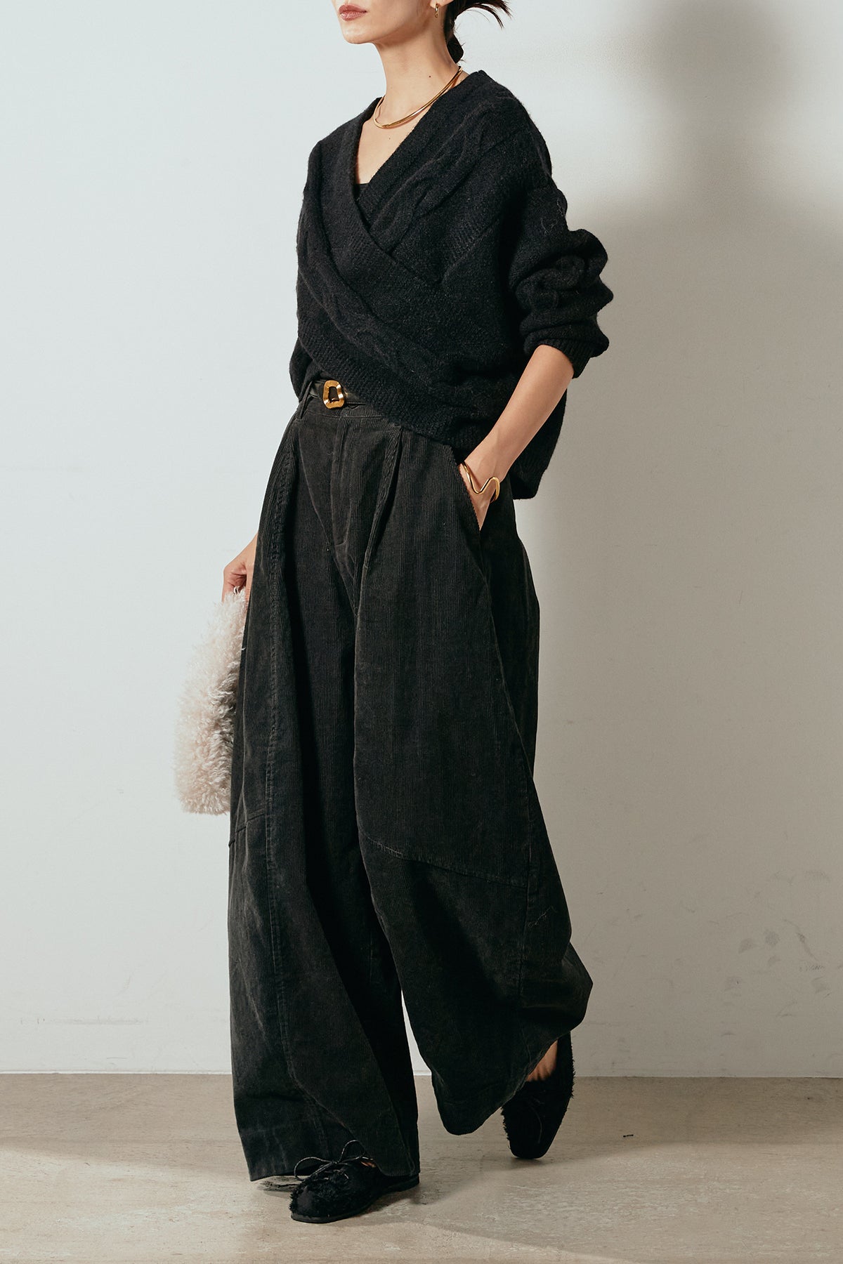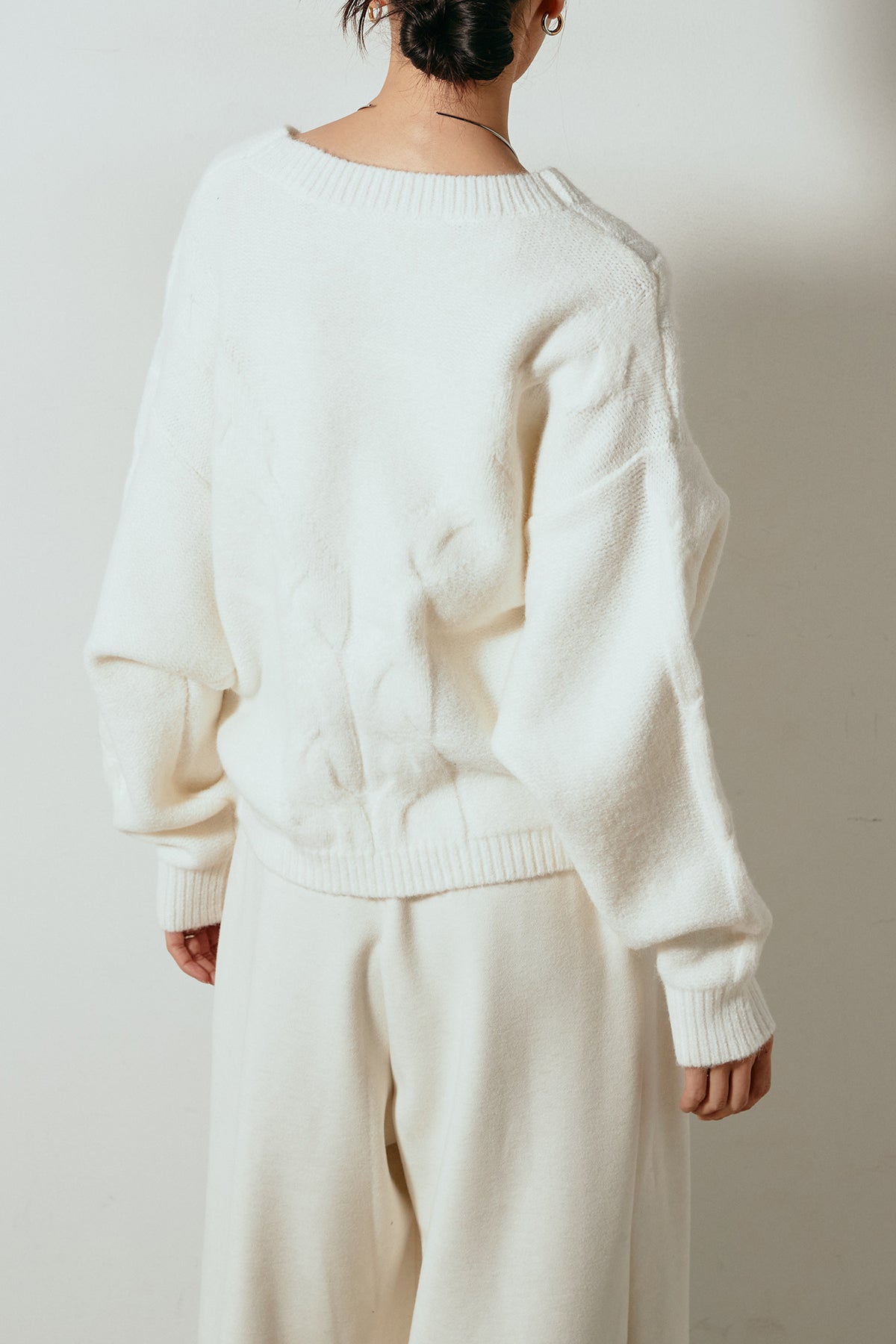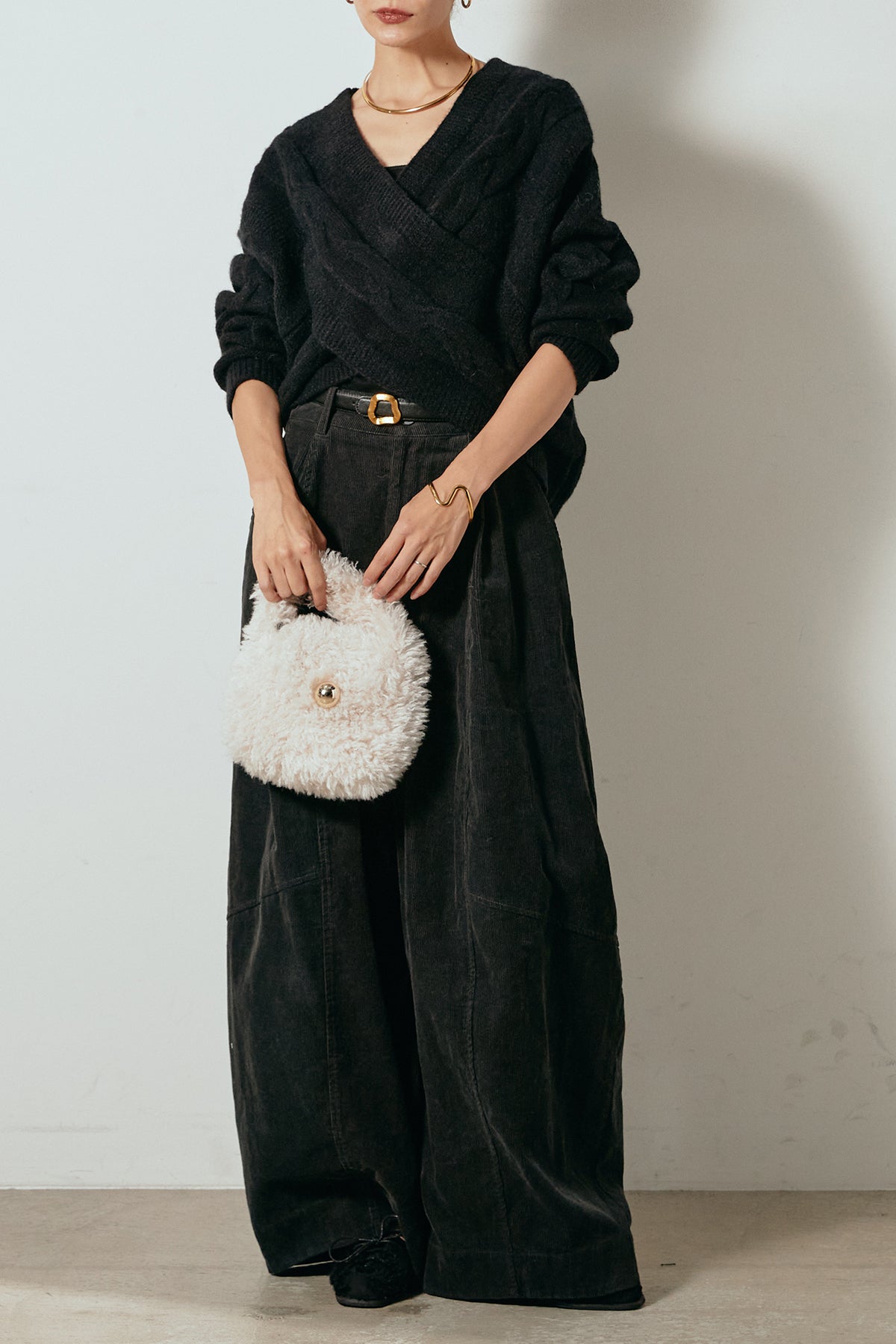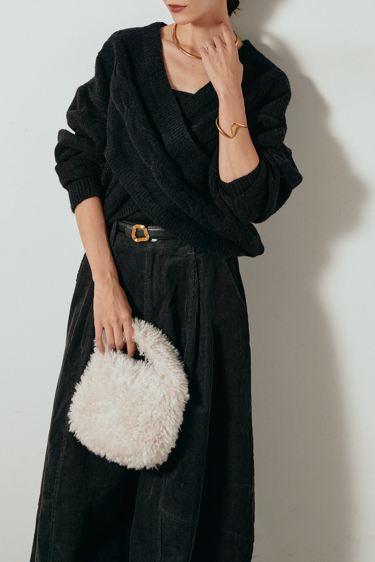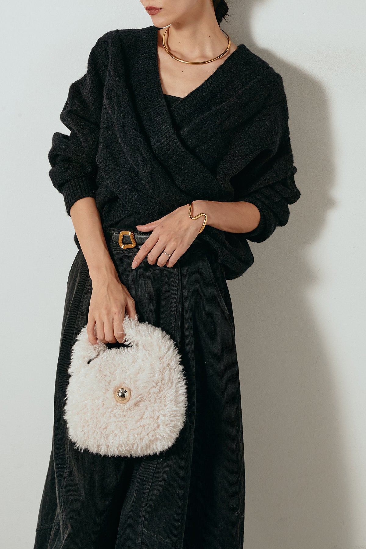 立体的なケーブル編みが目を惹くカシュクールニットトップス。 程よく開いたVネックが顔まわりをすっきり見せ、抜け感のあるバランスを演出します。 やわらかな風合いとリラクシーなシルエットで、女性らしさと上品さを兼ね備えた一枚。 パンツにもスカートにも合わせやすく、デイリーに活躍する万能アイテムです。