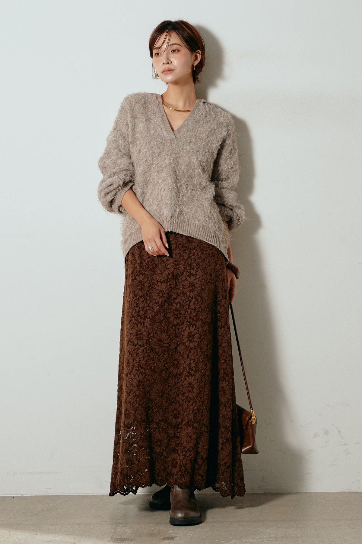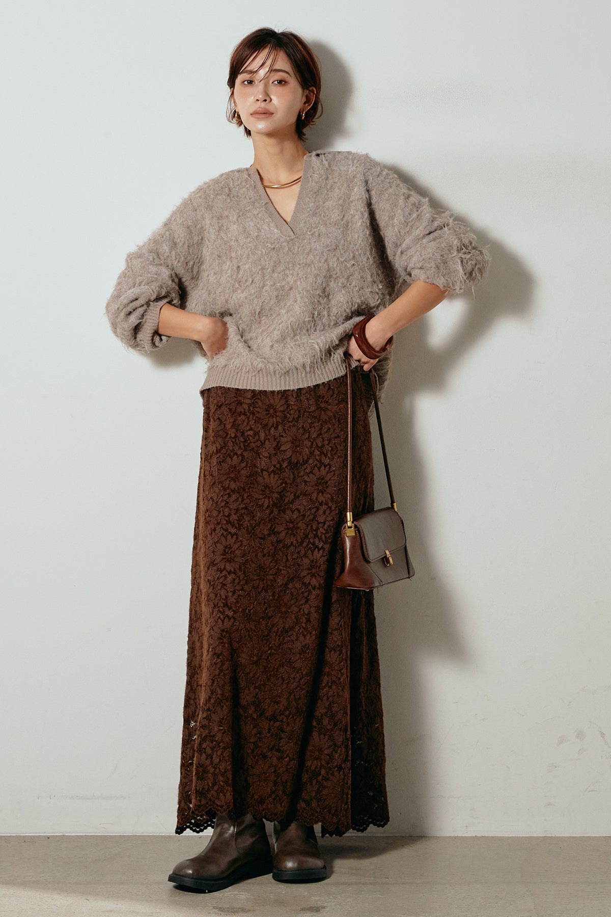 繊細な花柄刺繍が目を惹くベロアフレアスカート。 光沢のあるベロア生地に立体的な刺繍を施し、上品さと存在感を兼ね備えた一枚です。 動くたびに美しく揺れるフレアシルエットが、スタイリングに優雅な印象をプラス。 ニットやブラウスを合わせるだけで、シーズンライクな華やかコーデが完成します。