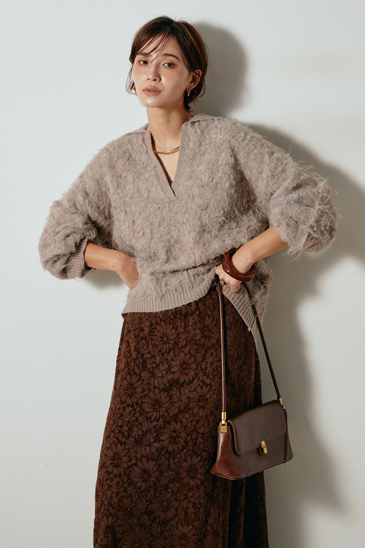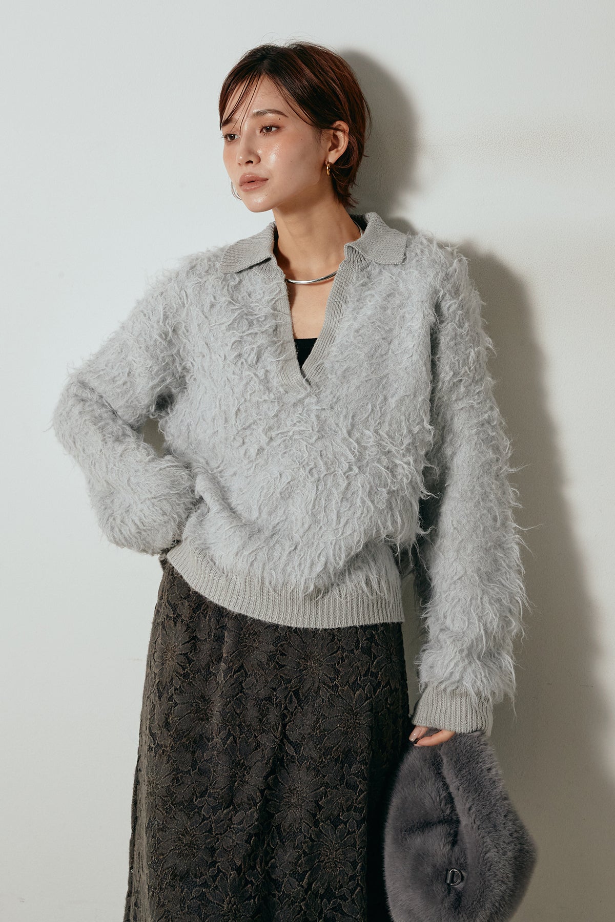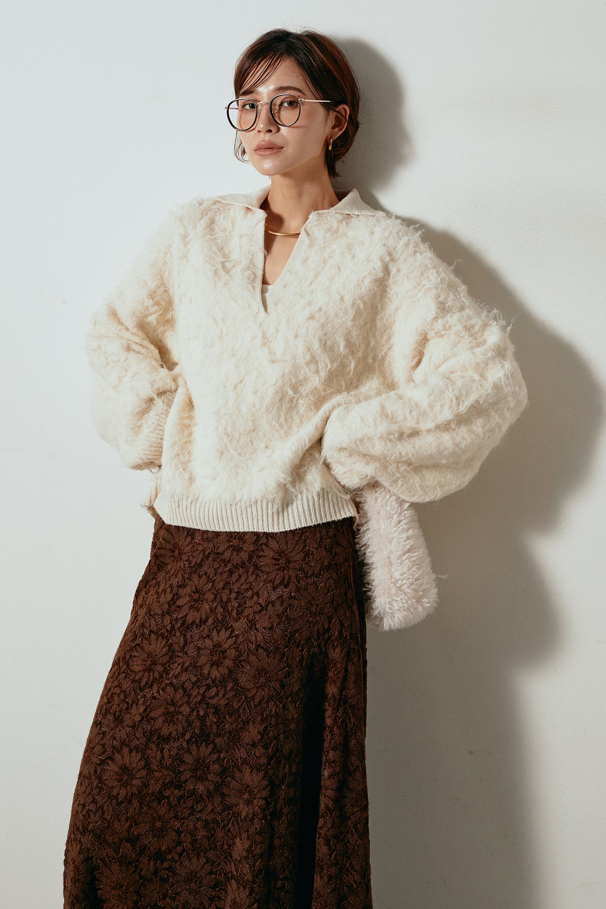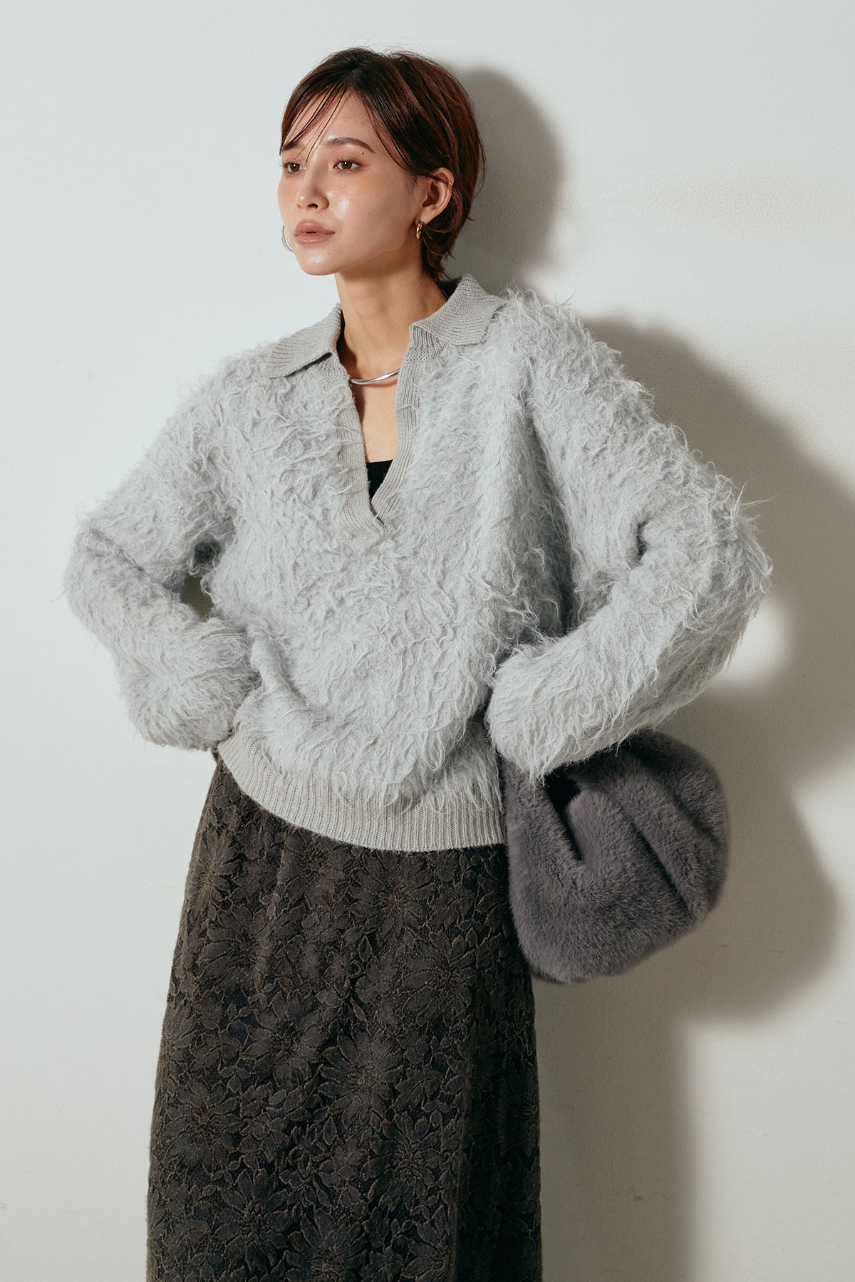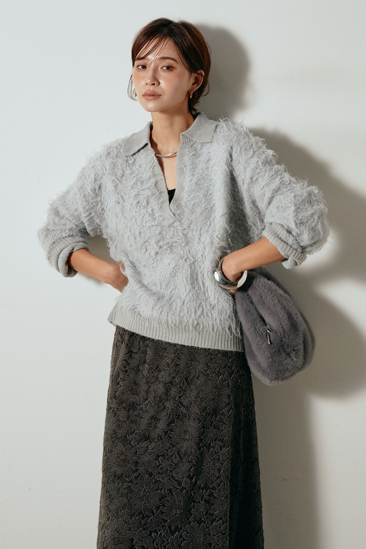 ふんわりとしたシャギー素材が目を惹くニットポロトップス。柔らかな質感がシーズンらしい温もりを感じさせ、程よいボリューム感の袖がこなれた印象をプラスします。襟付きデザインで顔まわりをすっきり見せつつ、カジュアルにも上品にも着こなせる一枚。スカートにもパンツにも合わせやすく、幅広いスタイリングを楽しめます。