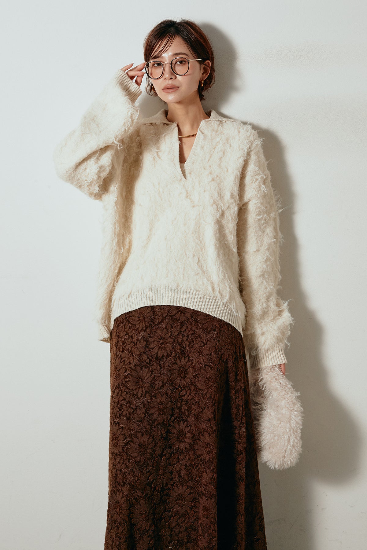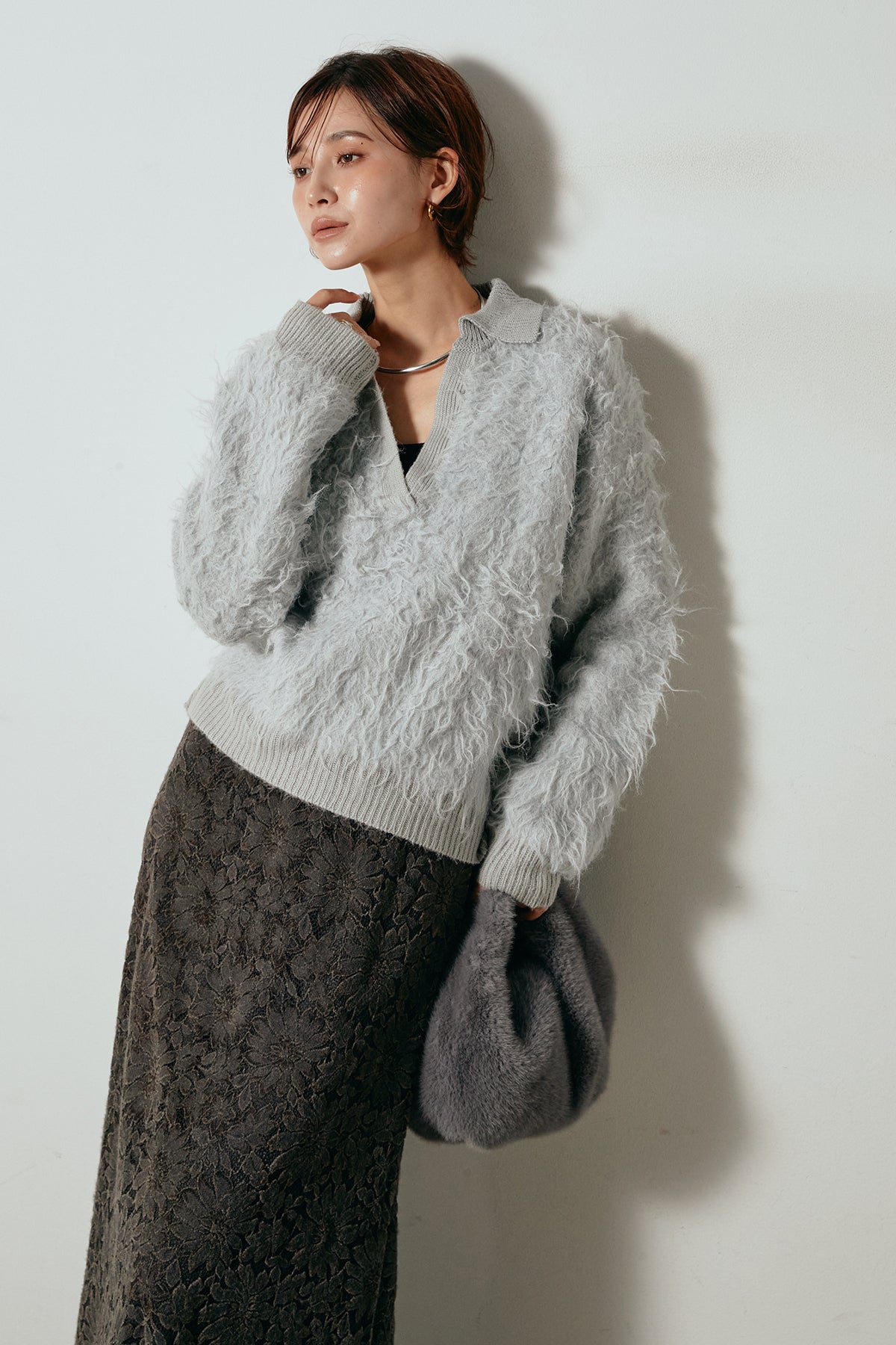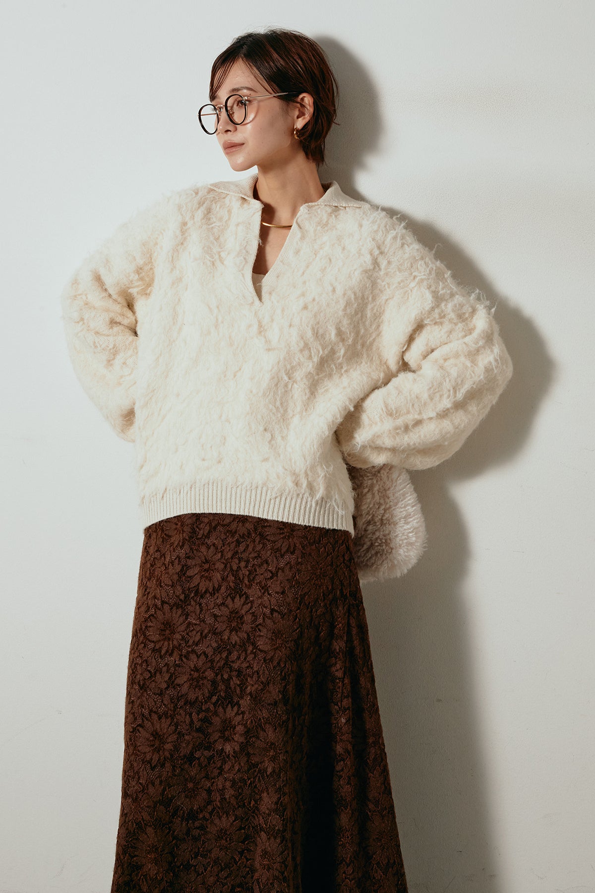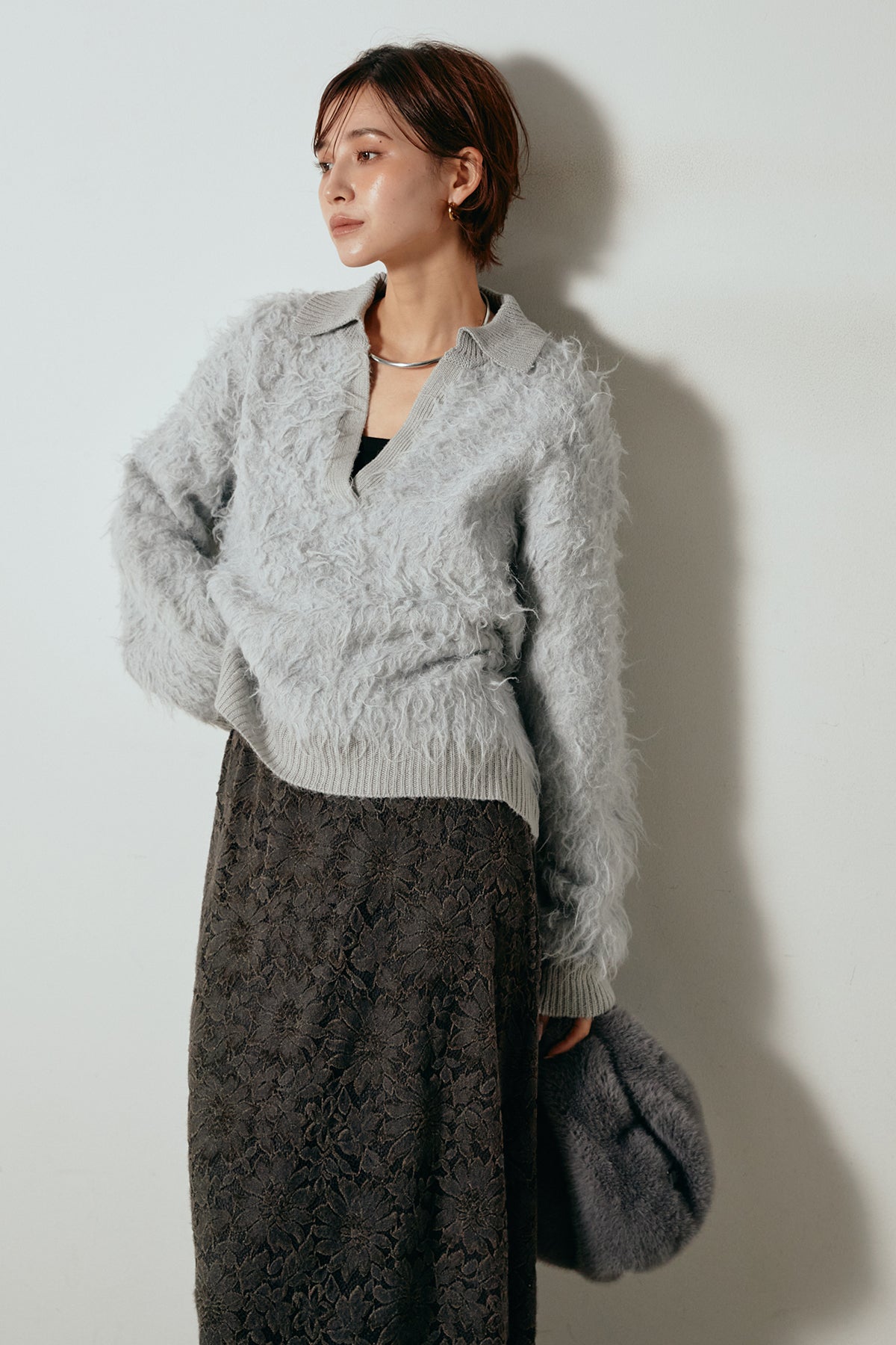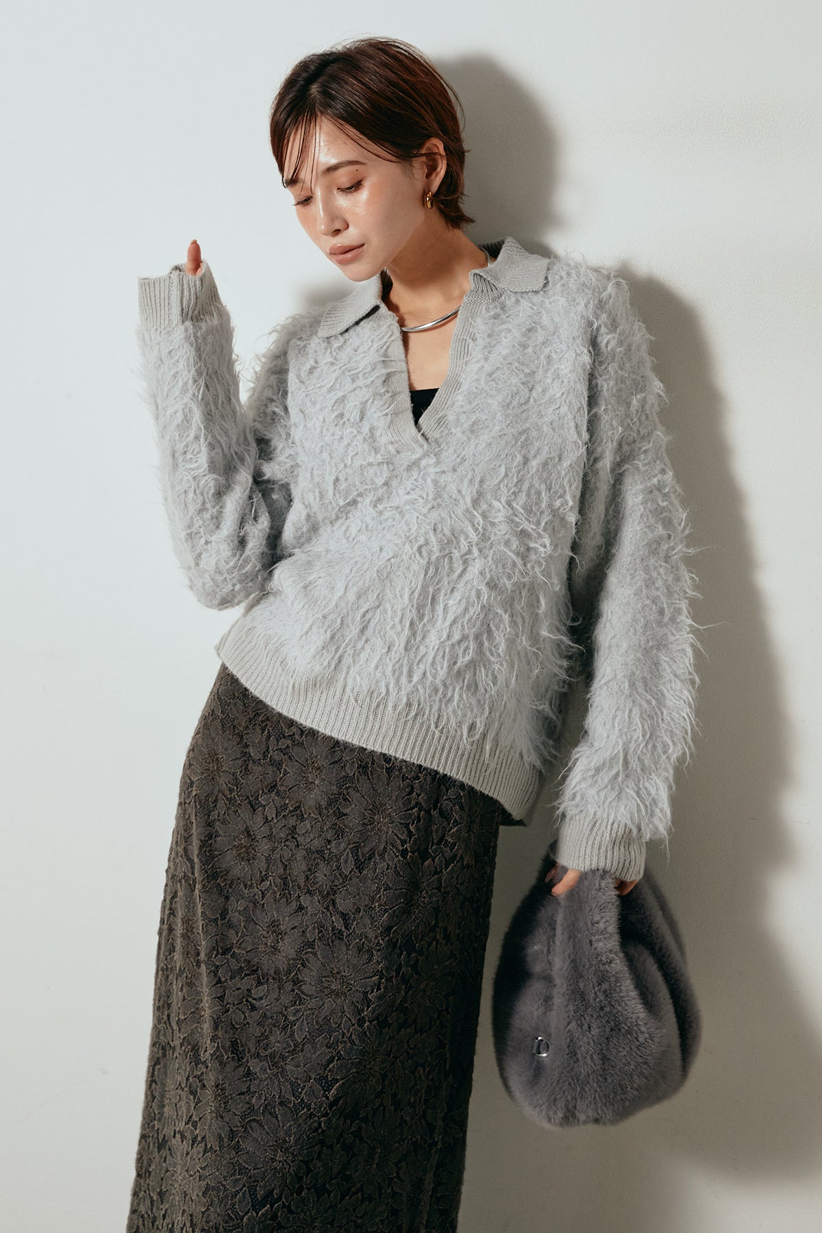 ふんわりとしたシャギー素材が目を惹くニットポロトップス。柔らかな質感がシーズンらしい温もりを感じさせ、程よいボリューム感の袖がこなれた印象をプラスします。襟付きデザインで顔まわりをすっきり見せつつ、カジュアルにも上品にも着こなせる一枚。スカートにもパンツにも合わせやすく、幅広いスタイリングを楽しめます。