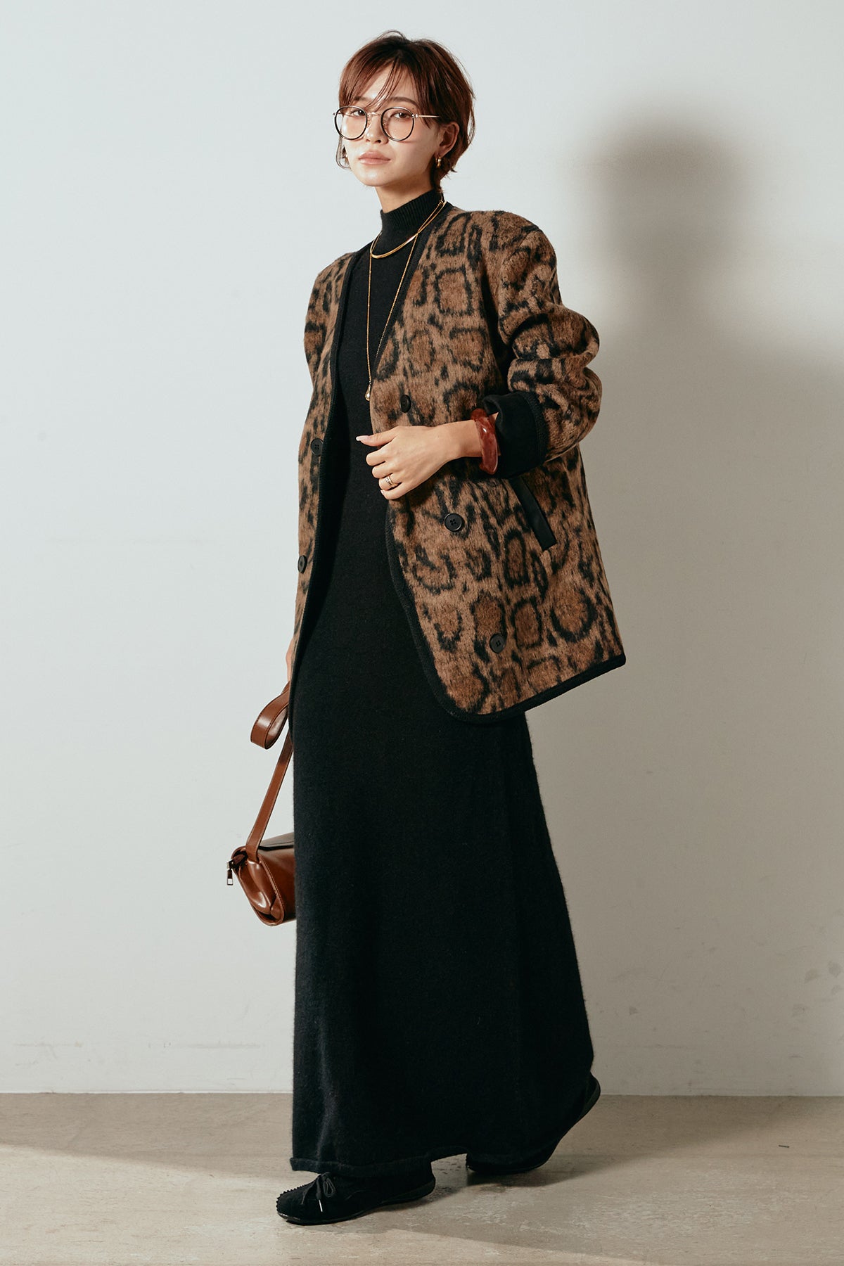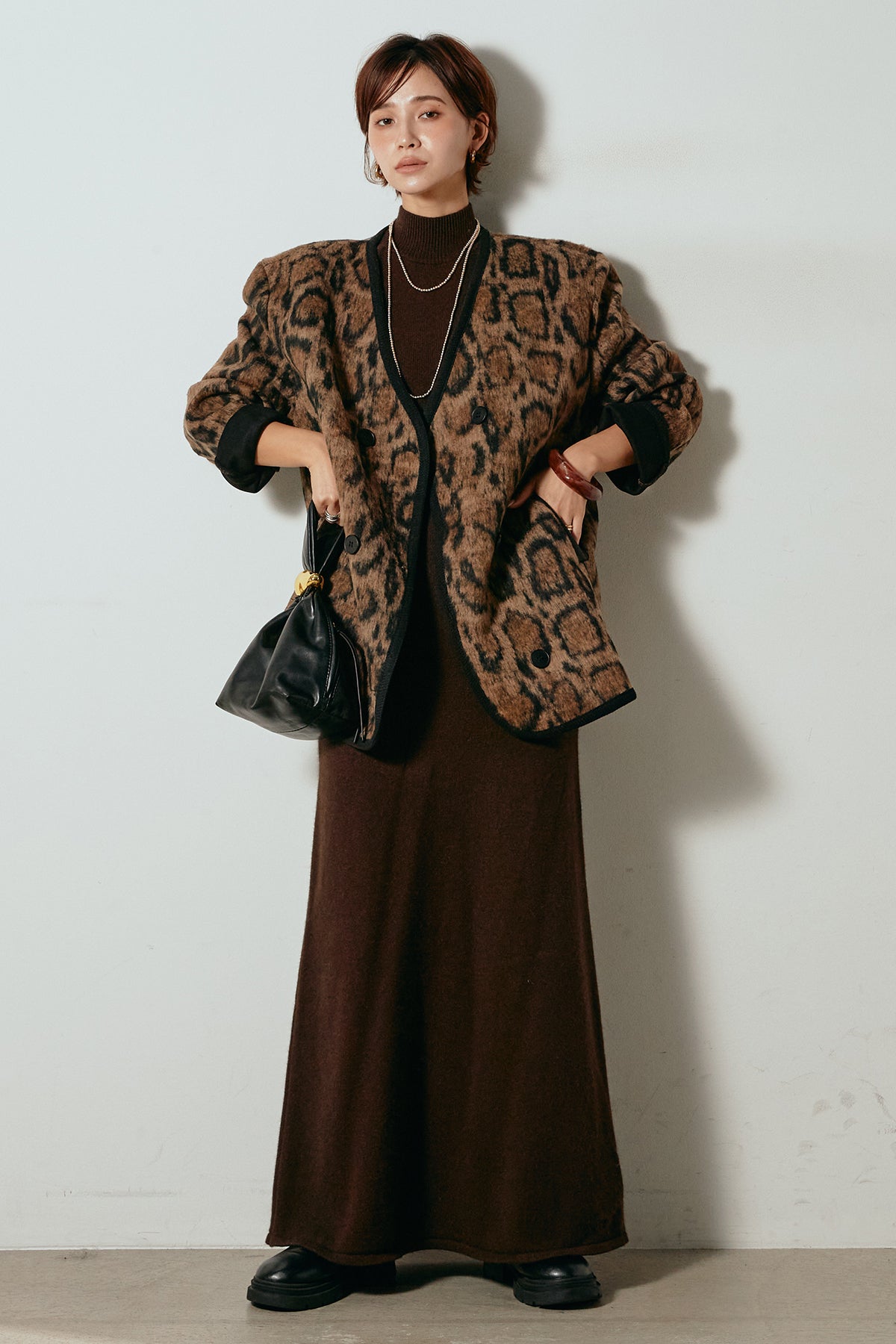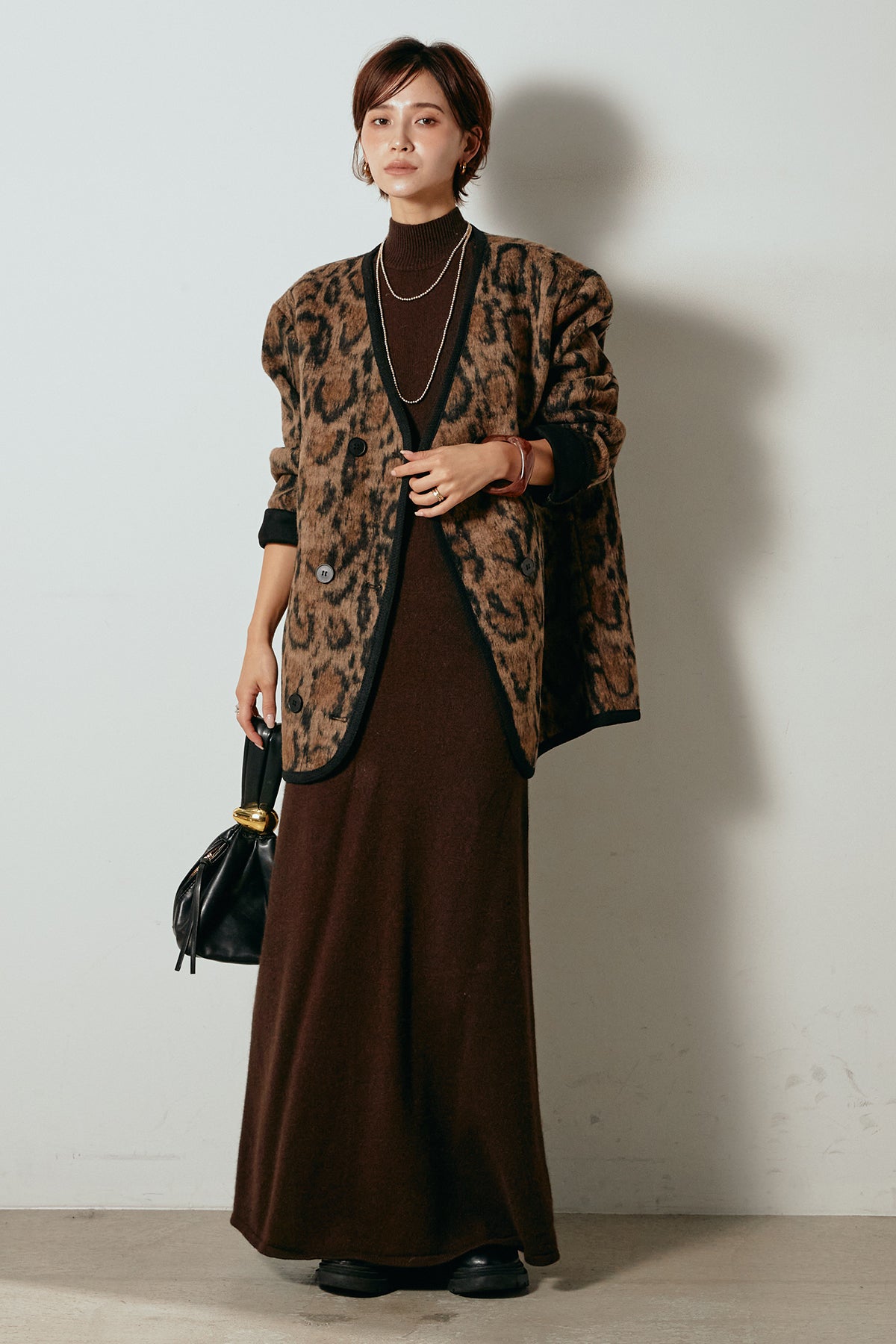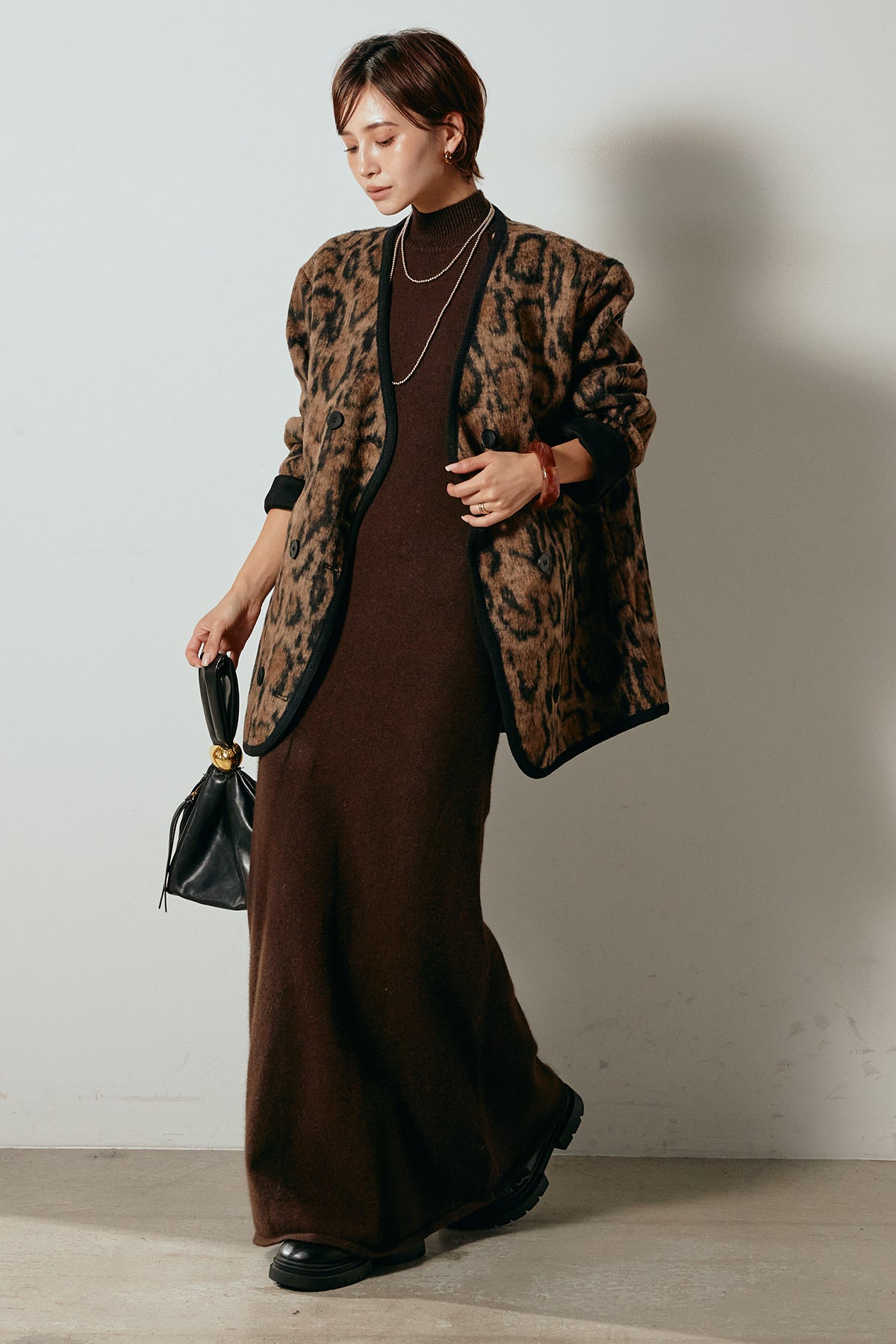 [SET]ノーカラーレオパード柄アウター+ノースリーブニットロングワンピース(2set)