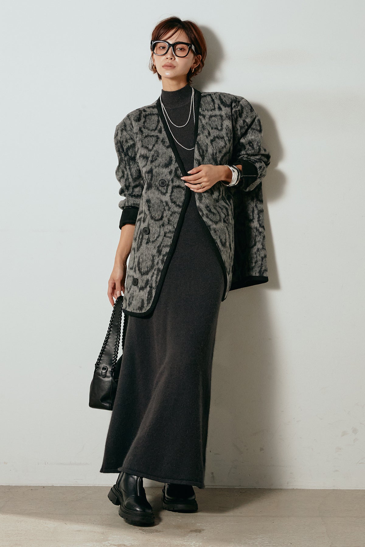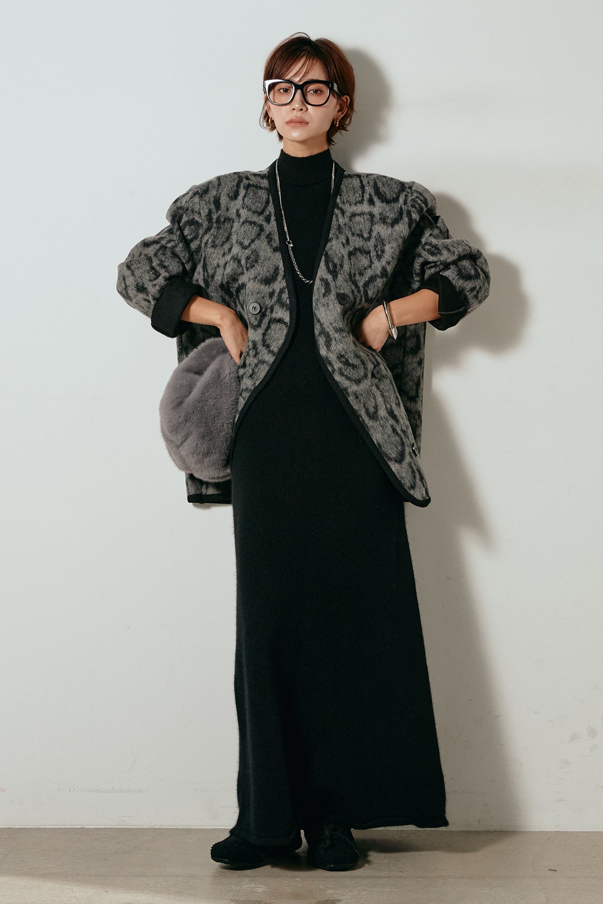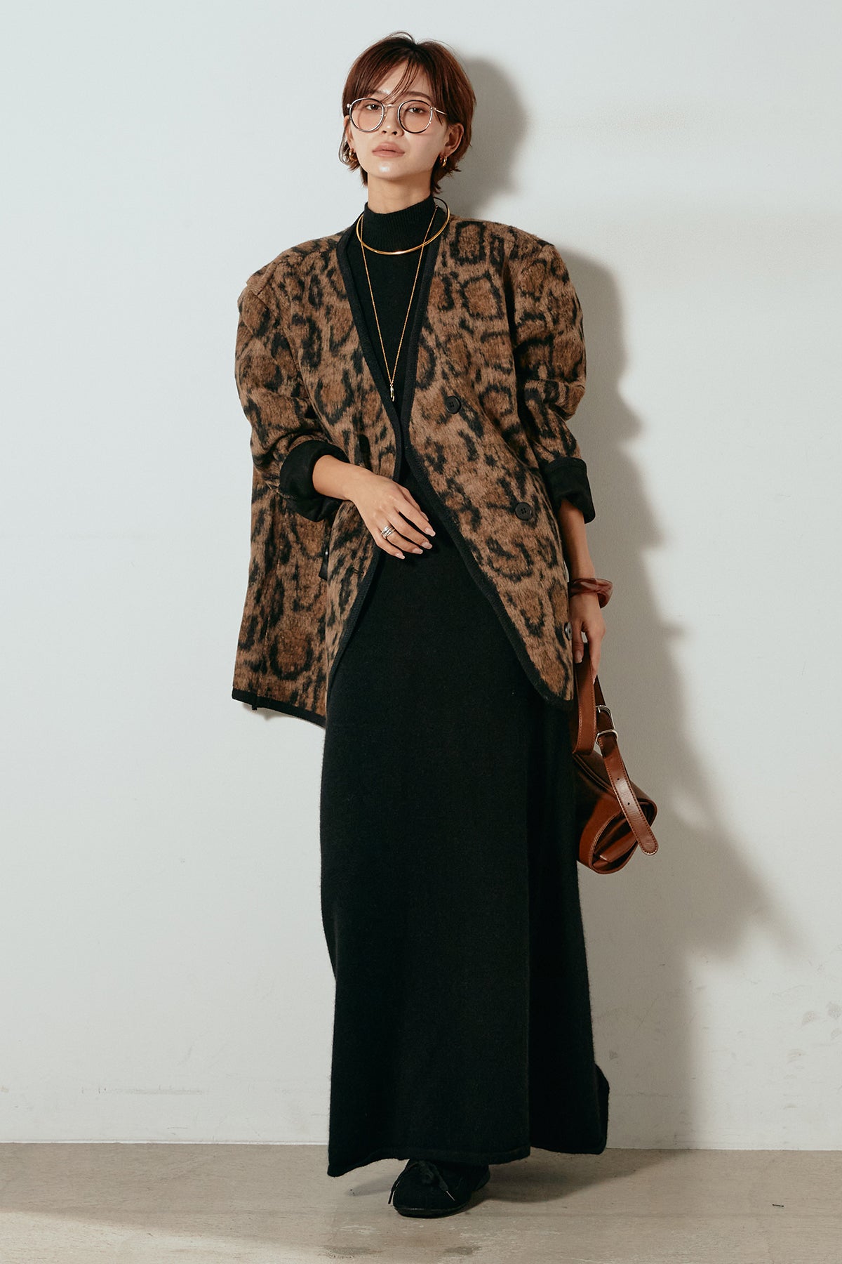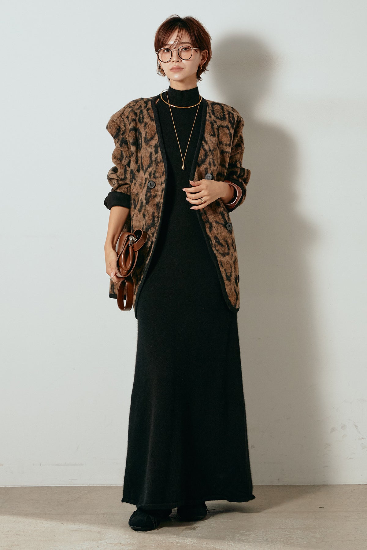 [SET]ノーカラーレオパード柄アウター+ノースリーブニットロングワンピース(2set)