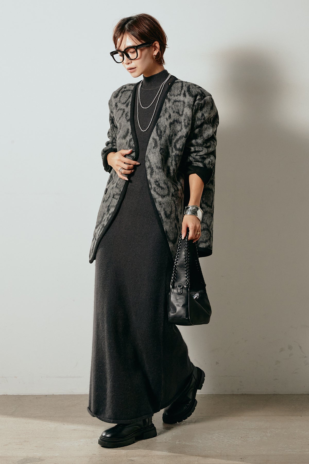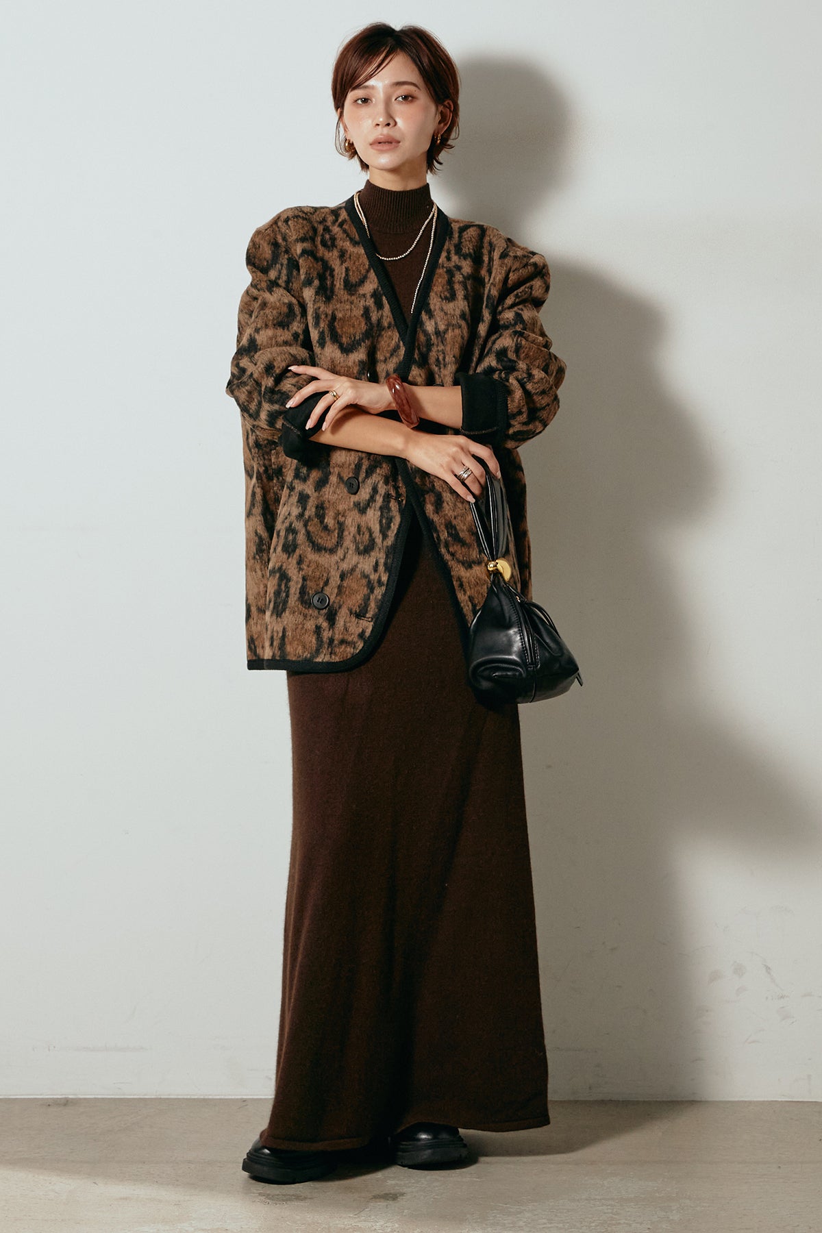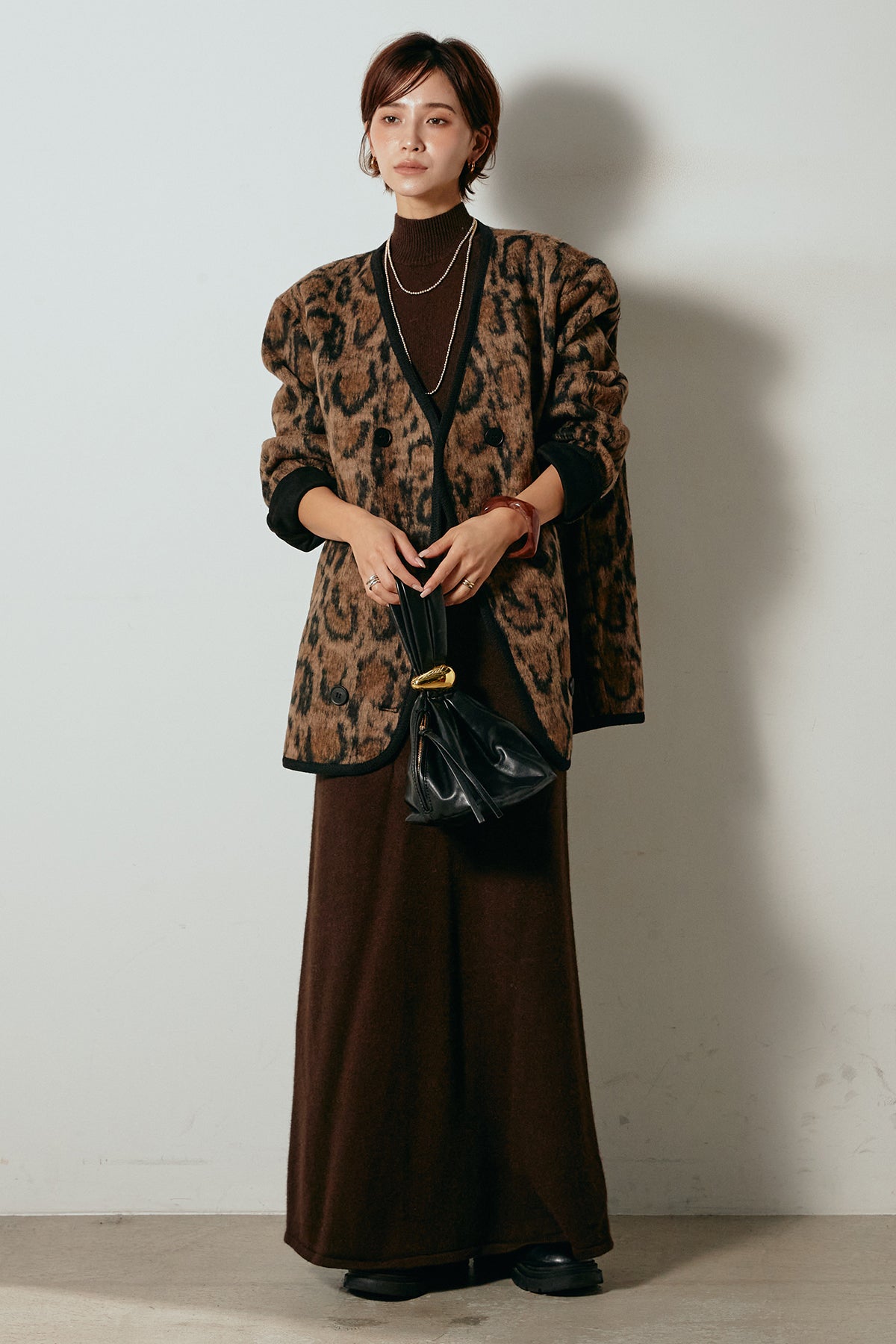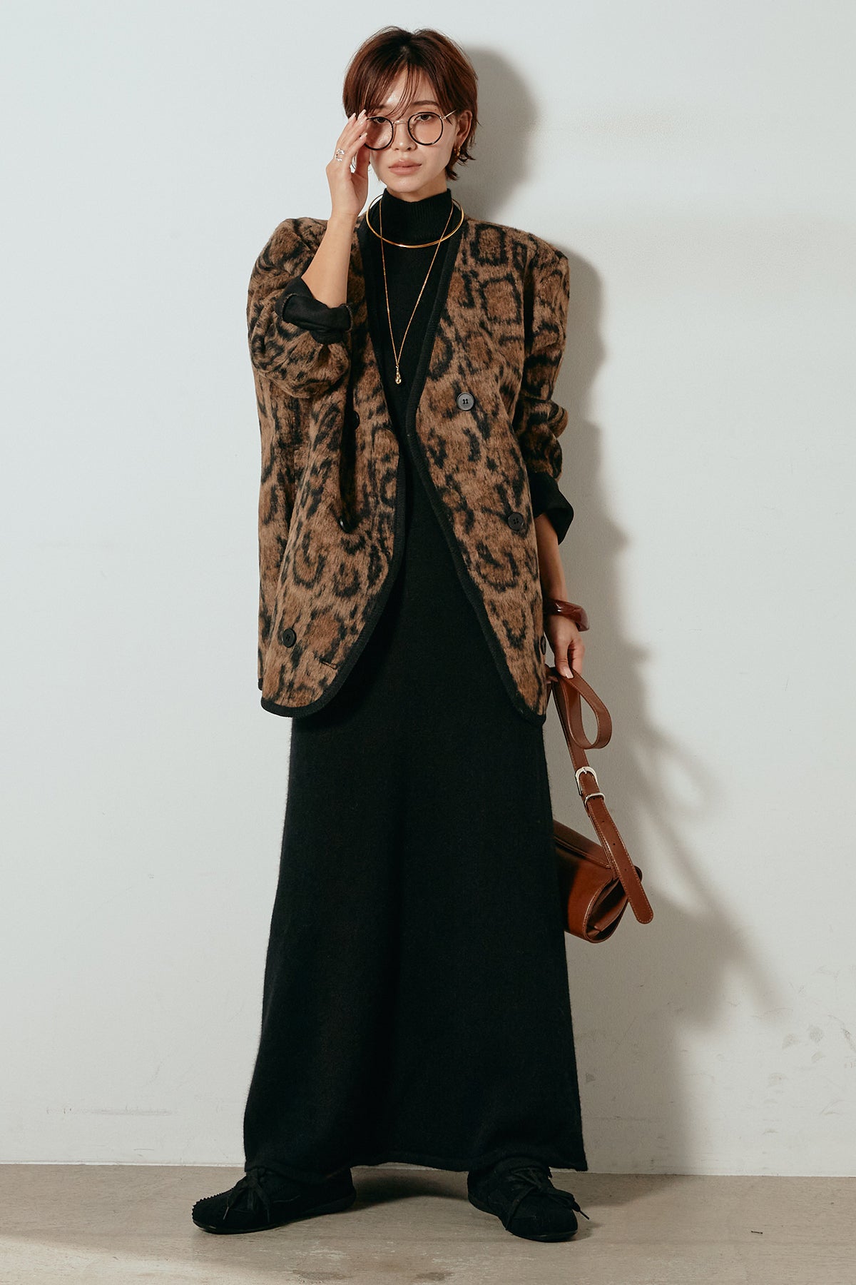 [SET]ノーカラーレオパード柄アウター+ノースリーブニットロングワンピース(2set)
