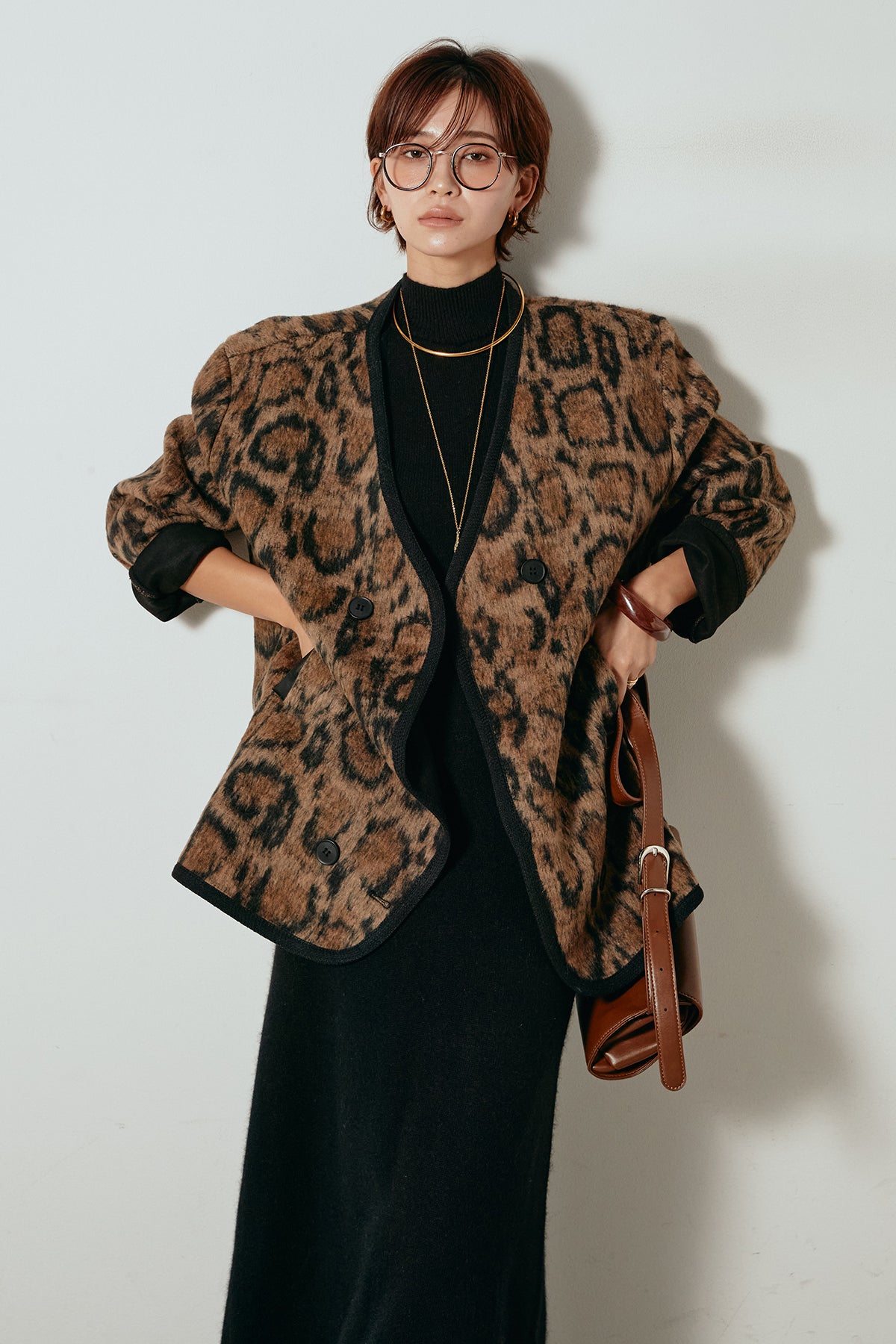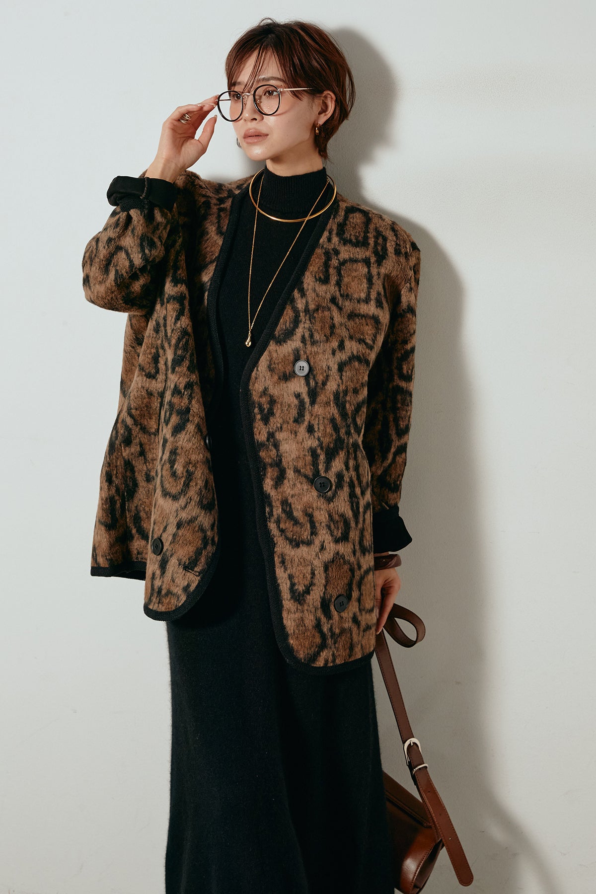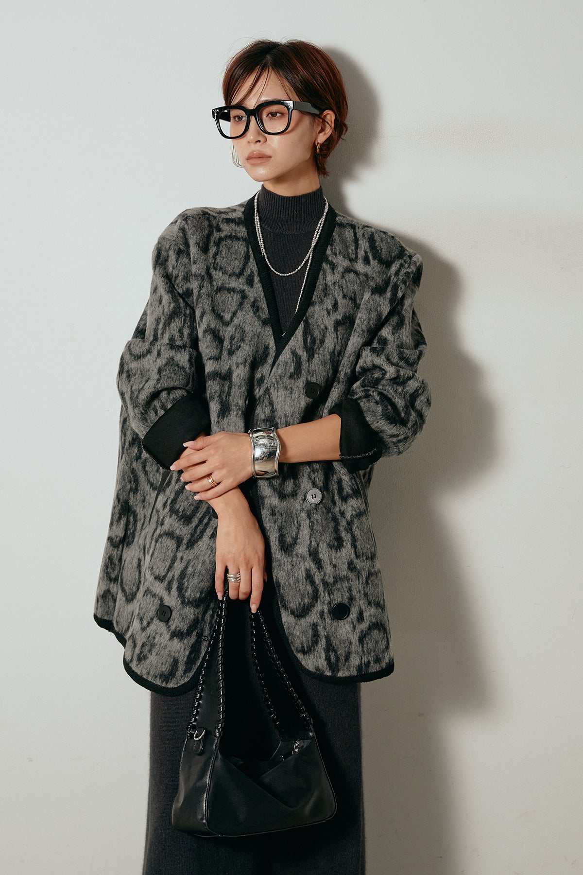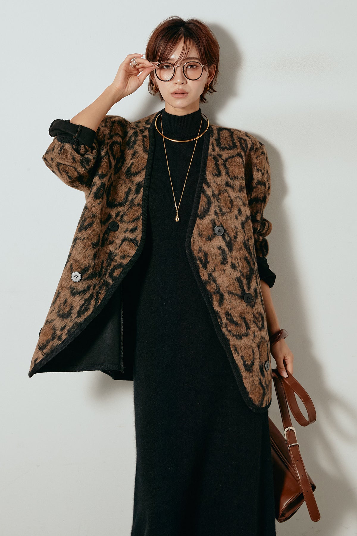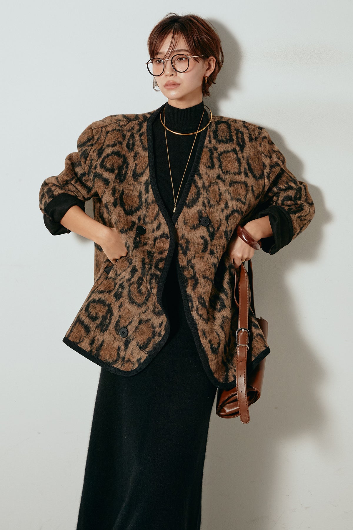 存在感のあるレオパード柄が目を惹くノーカラーアウター。 やわらかな起毛感のある素材で、軽やかな着心地ながらも暖かさをキープ。 ゆったりとしたシルエットが抜け感を生み、羽織るだけでスタイルにアクセントを加えます。 シンプルなインナーと合わせるだけで旬なムードを纏える、秋冬の主役アイテムです。