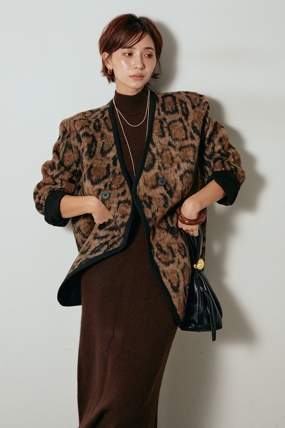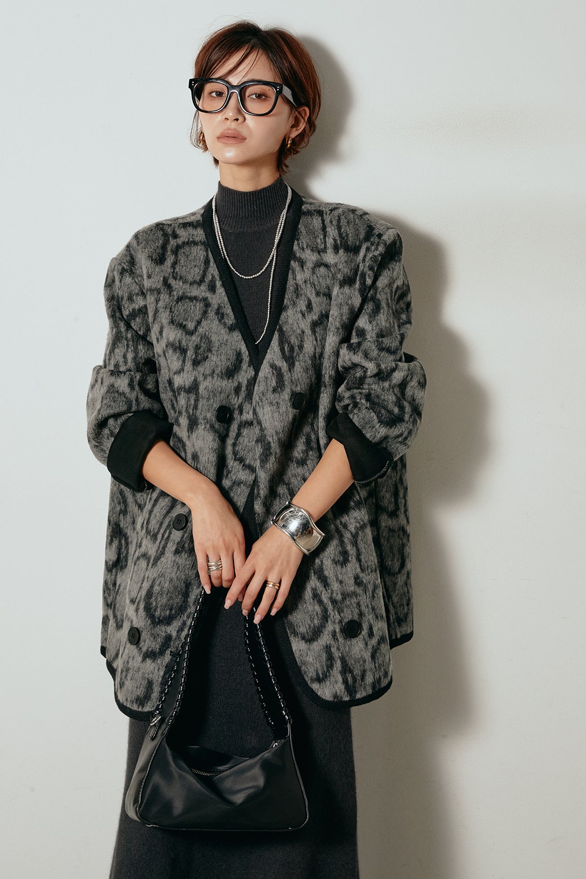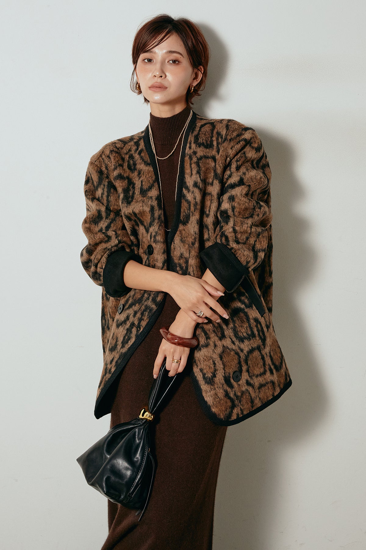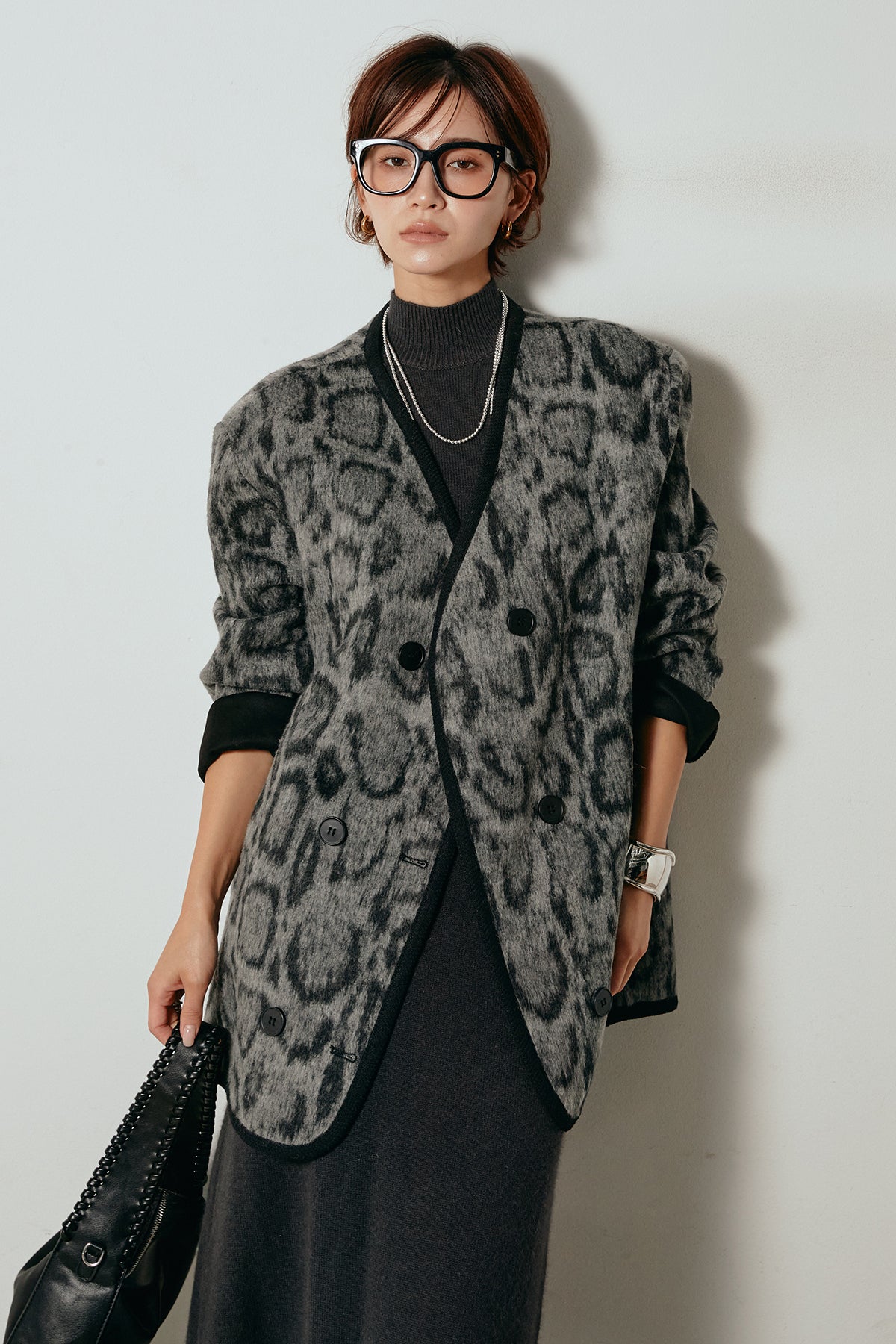 存在感のあるレオパード柄が目を惹くノーカラーアウター。 やわらかな起毛感のある素材で、軽やかな着心地ながらも暖かさをキープ。 ゆったりとしたシルエットが抜け感を生み、羽織るだけでスタイルにアクセントを加えます。 シンプルなインナーと合わせるだけで旬なムードを纏える、秋冬の主役アイテムです。