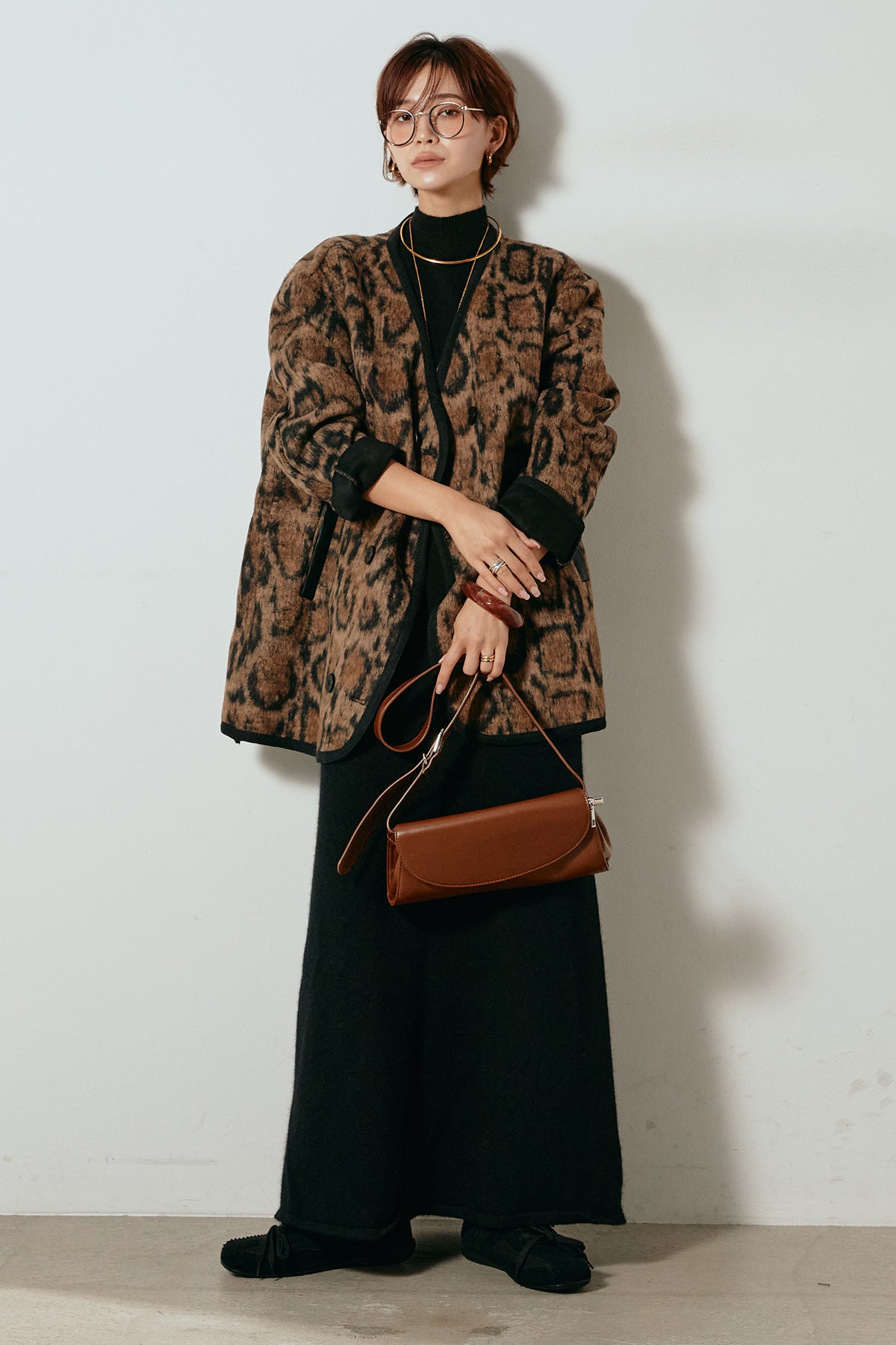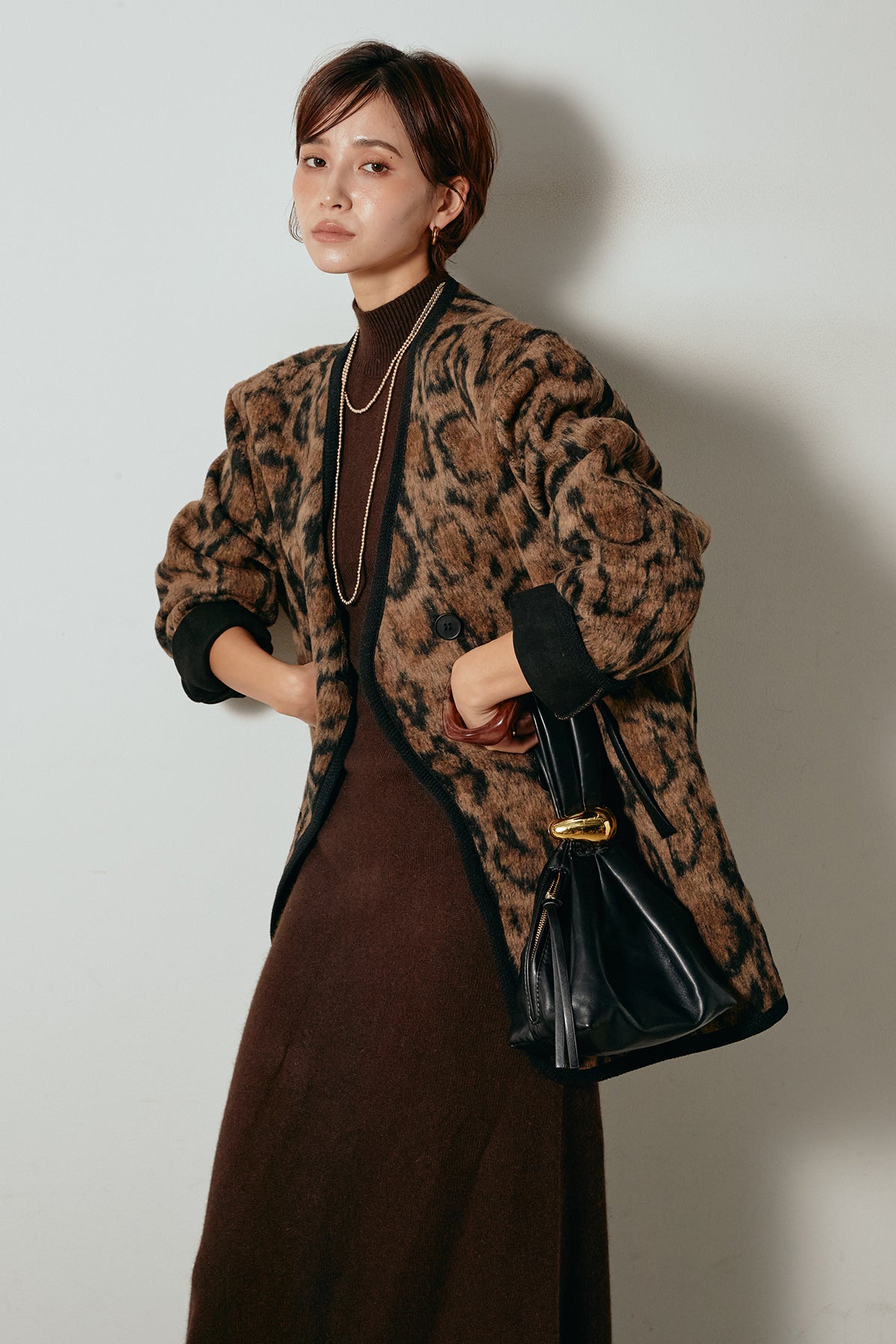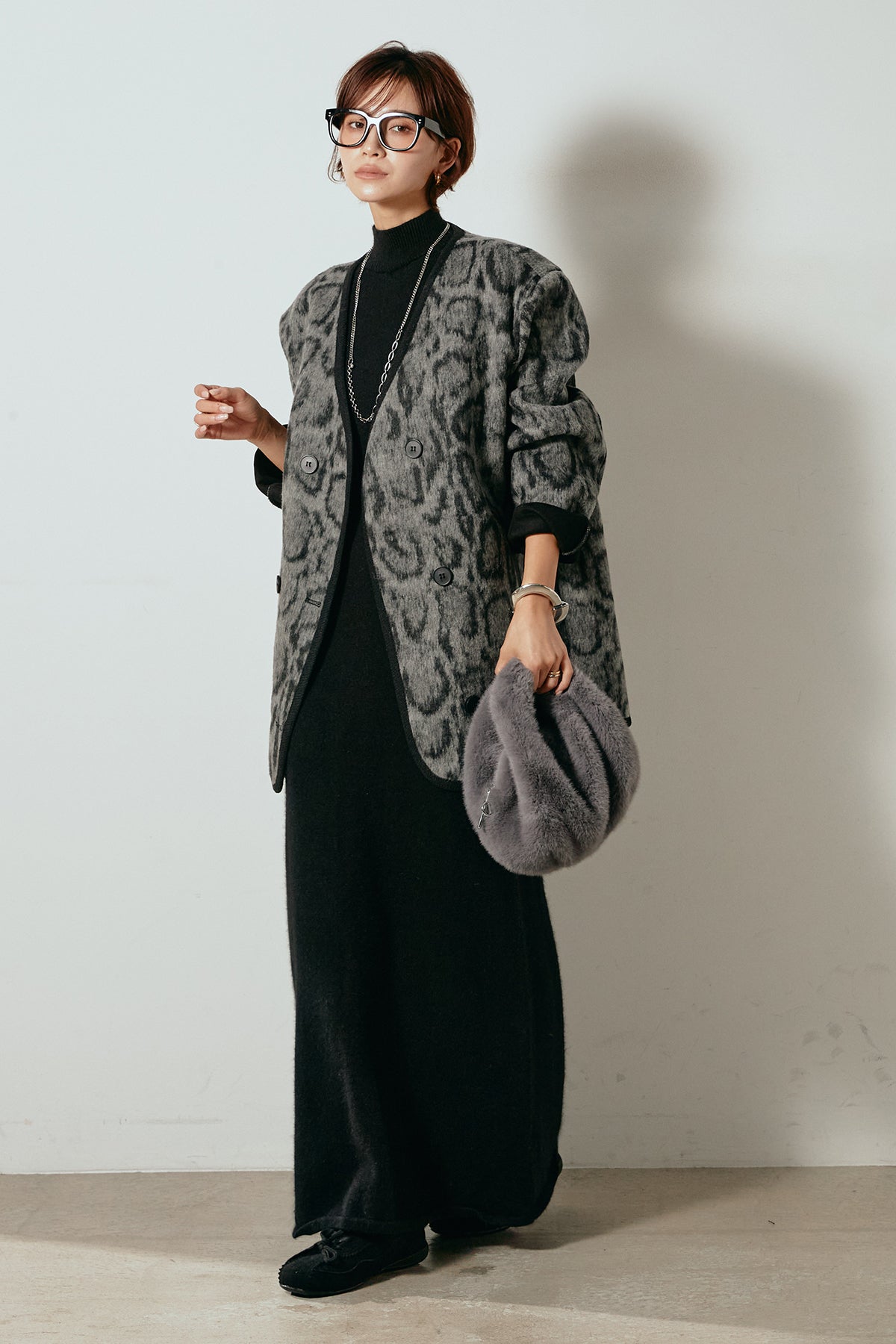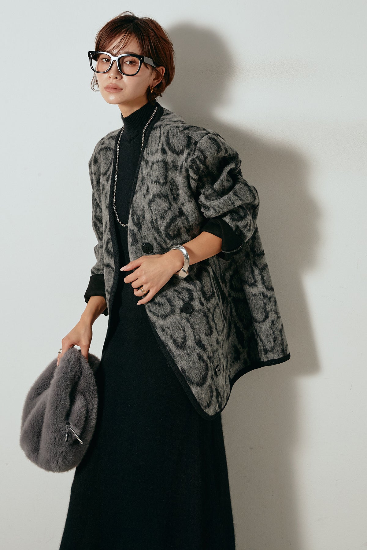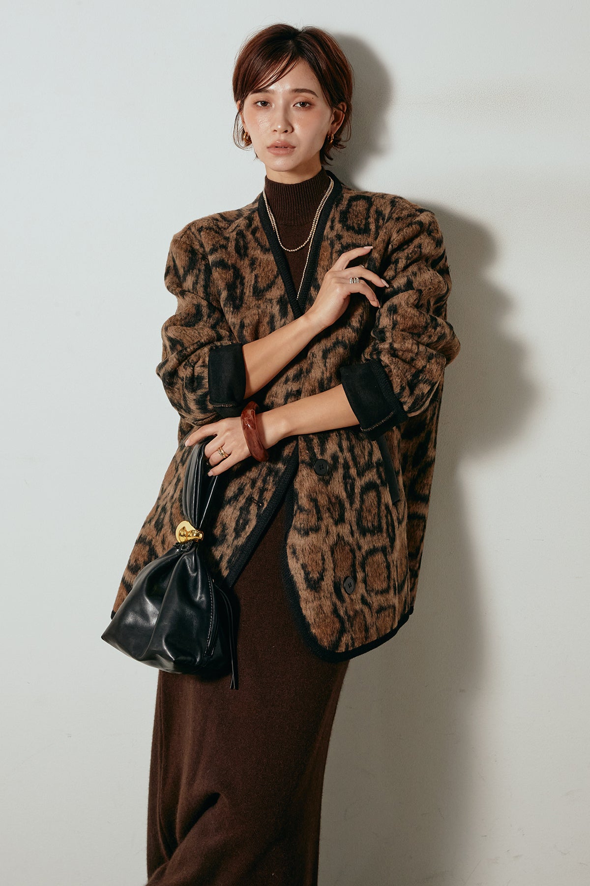 存在感のあるレオパード柄が目を惹くノーカラーアウター。 やわらかな起毛感のある素材で、軽やかな着心地ながらも暖かさをキープ。 ゆったりとしたシルエットが抜け感を生み、羽織るだけでスタイルにアクセントを加えます。 シンプルなインナーと合わせるだけで旬なムードを纏える、秋冬の主役アイテムです。