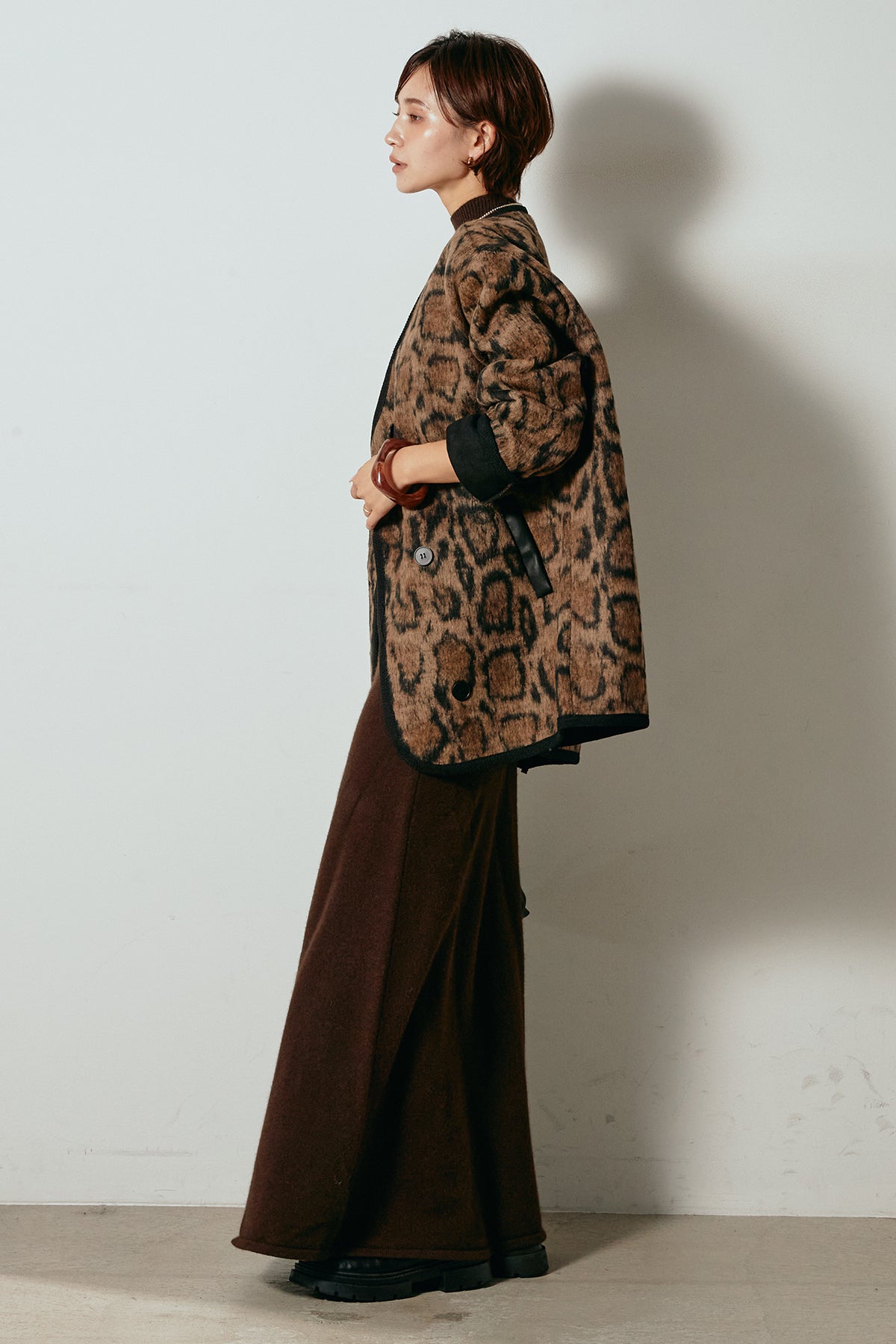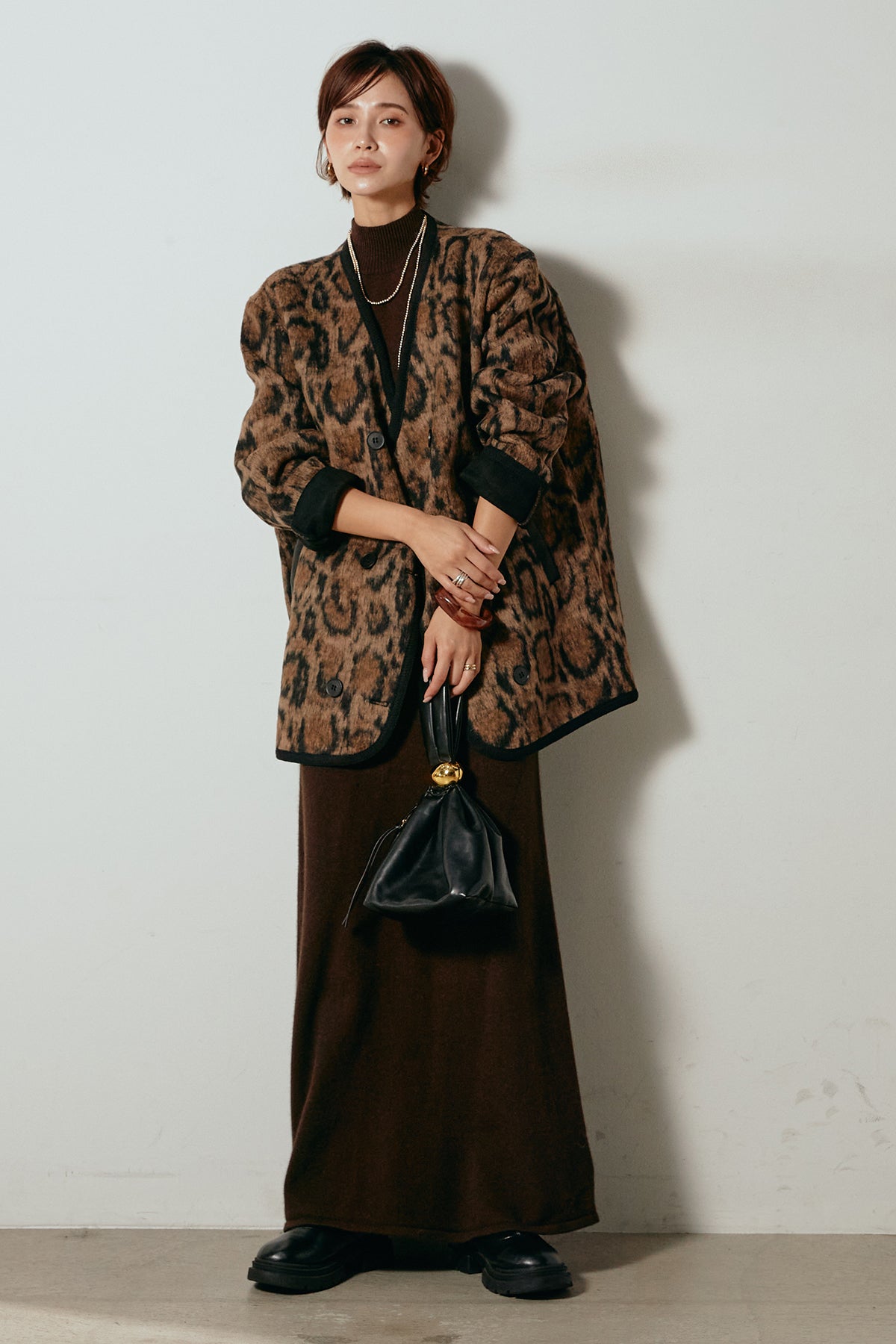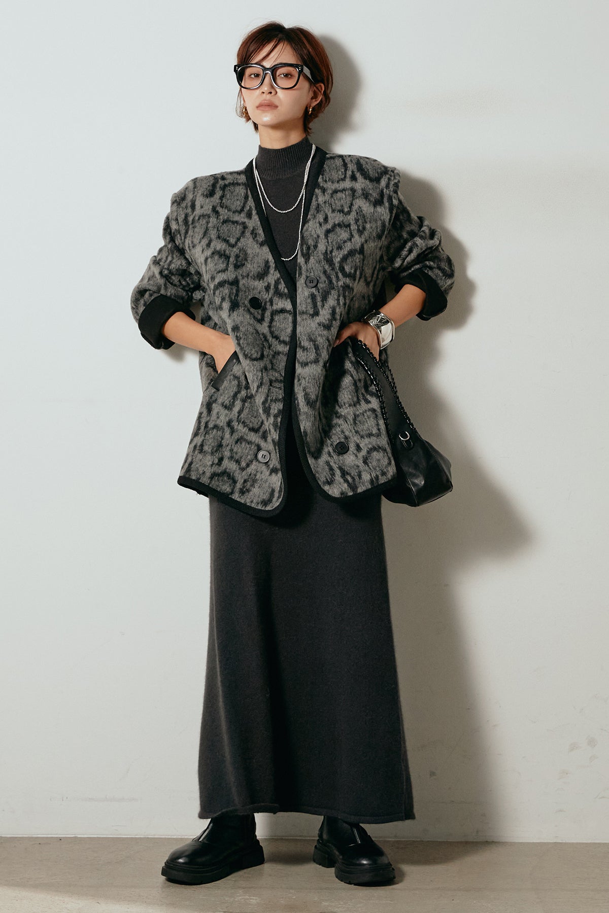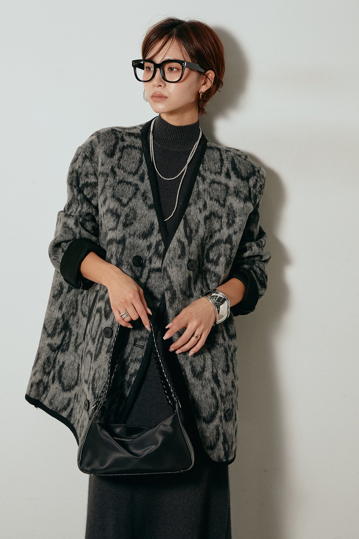 存在感のあるレオパード柄が目を惹くノーカラーアウター。 やわらかな起毛感のある素材で、軽やかな着心地ながらも暖かさをキープ。 ゆったりとしたシルエットが抜け感を生み、羽織るだけでスタイルにアクセントを加えます。 シンプルなインナーと合わせるだけで旬なムードを纏える、秋冬の主役アイテムです。
