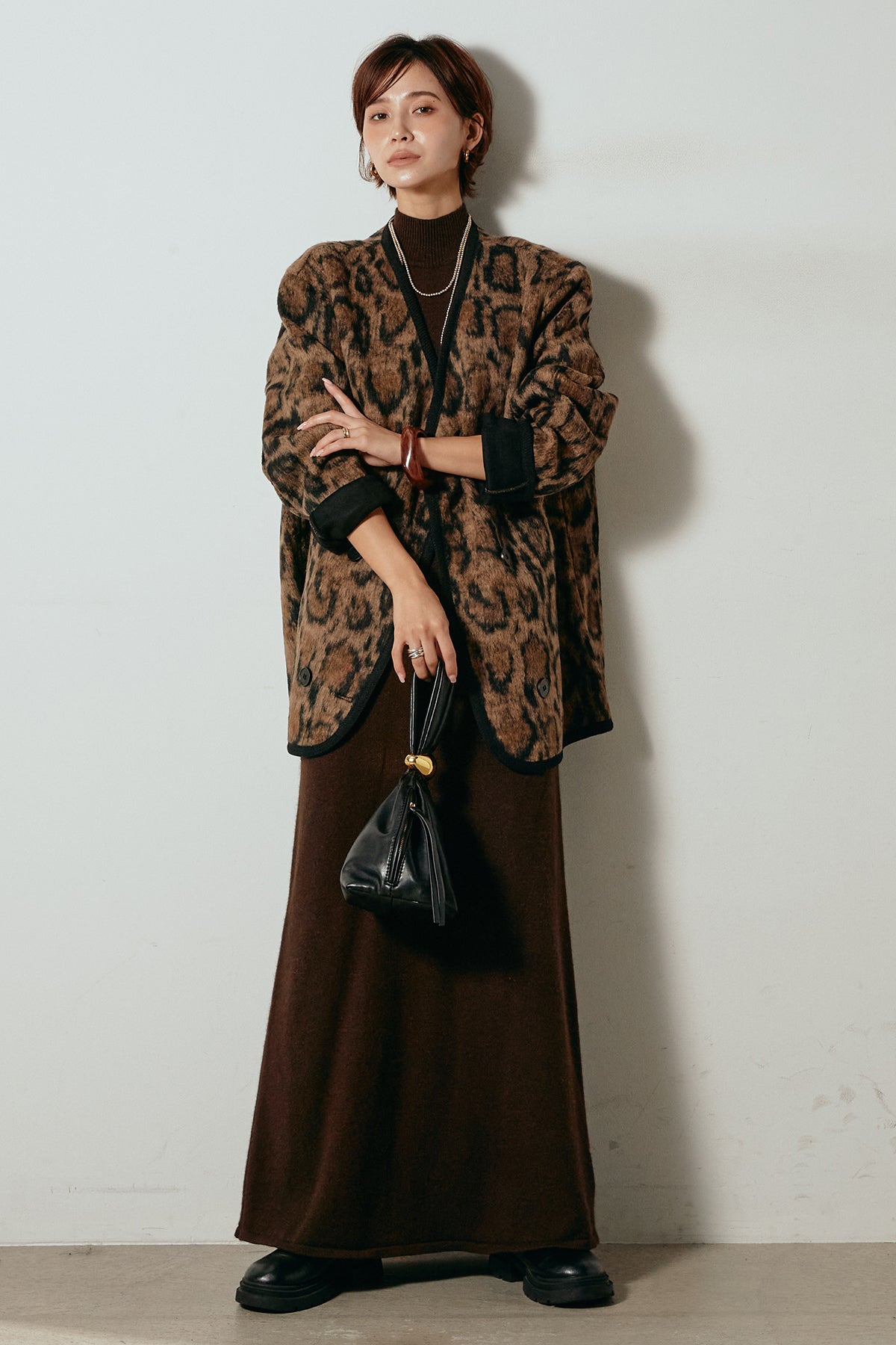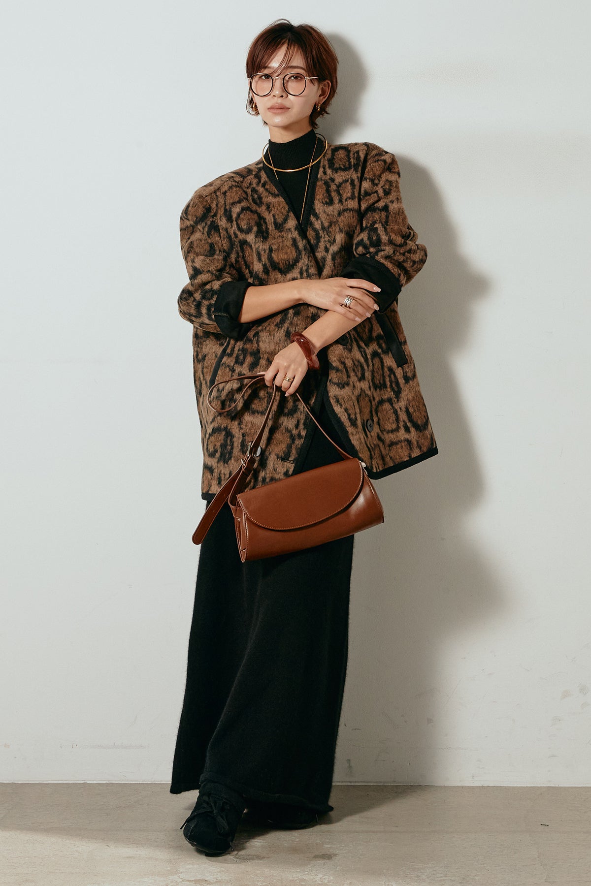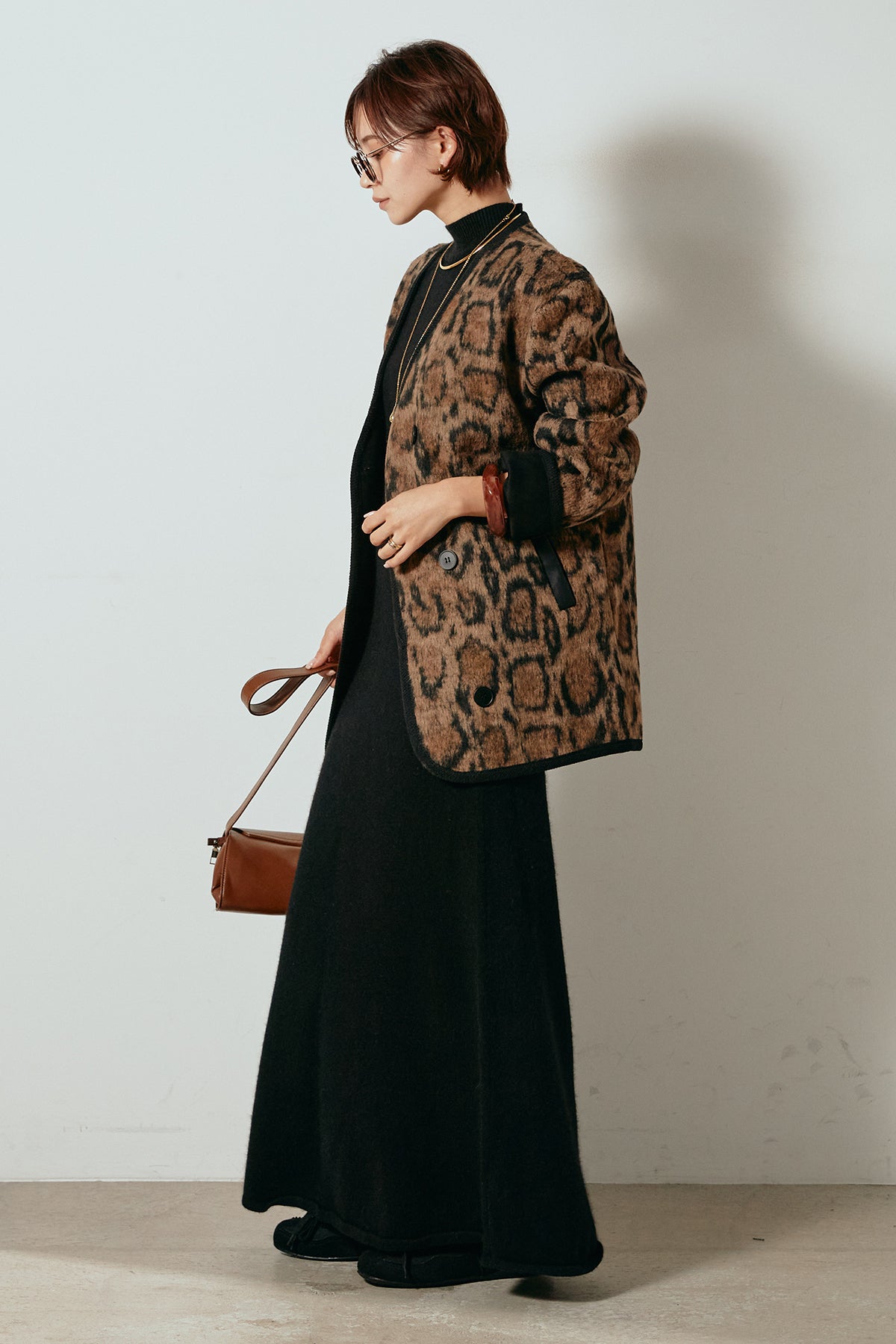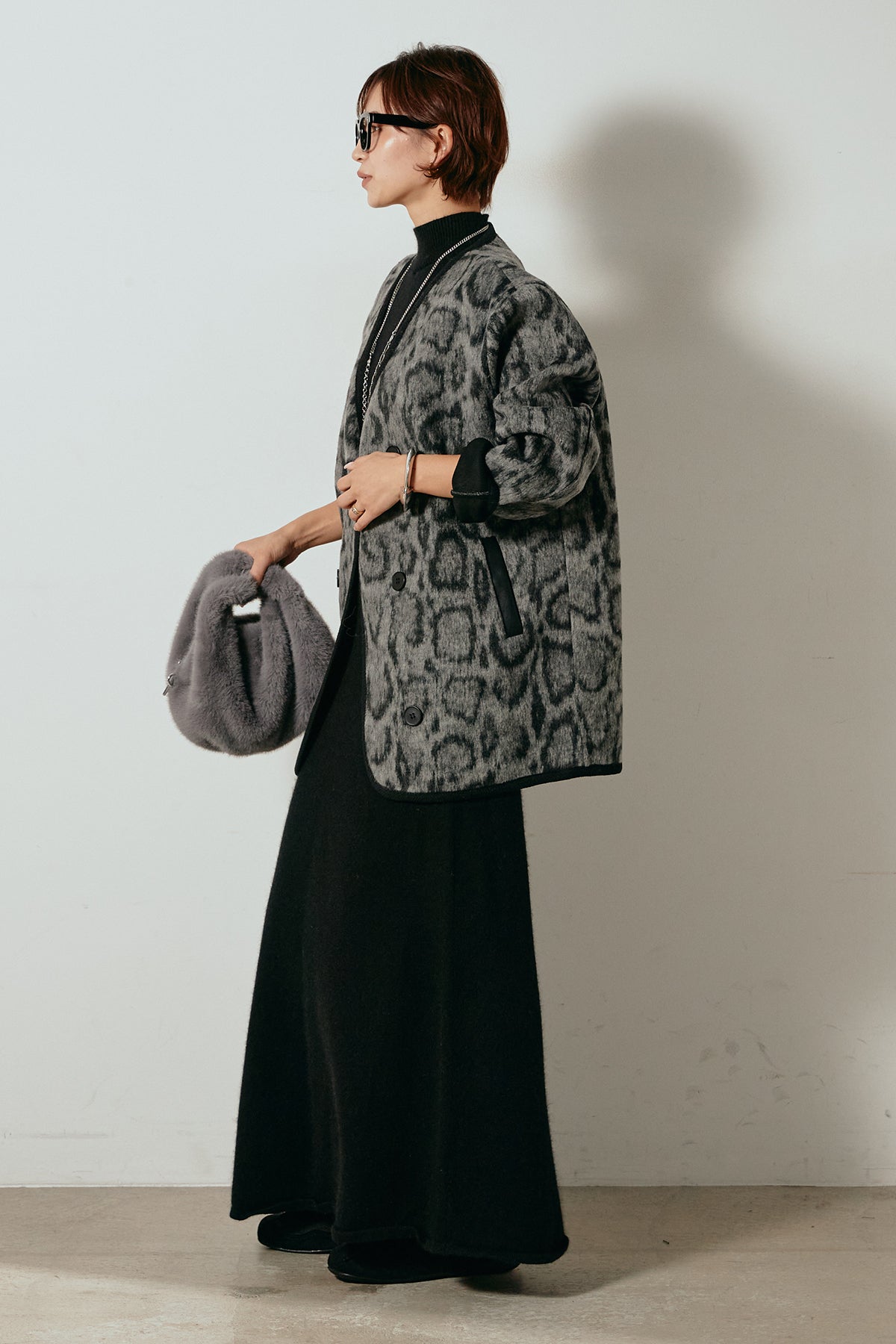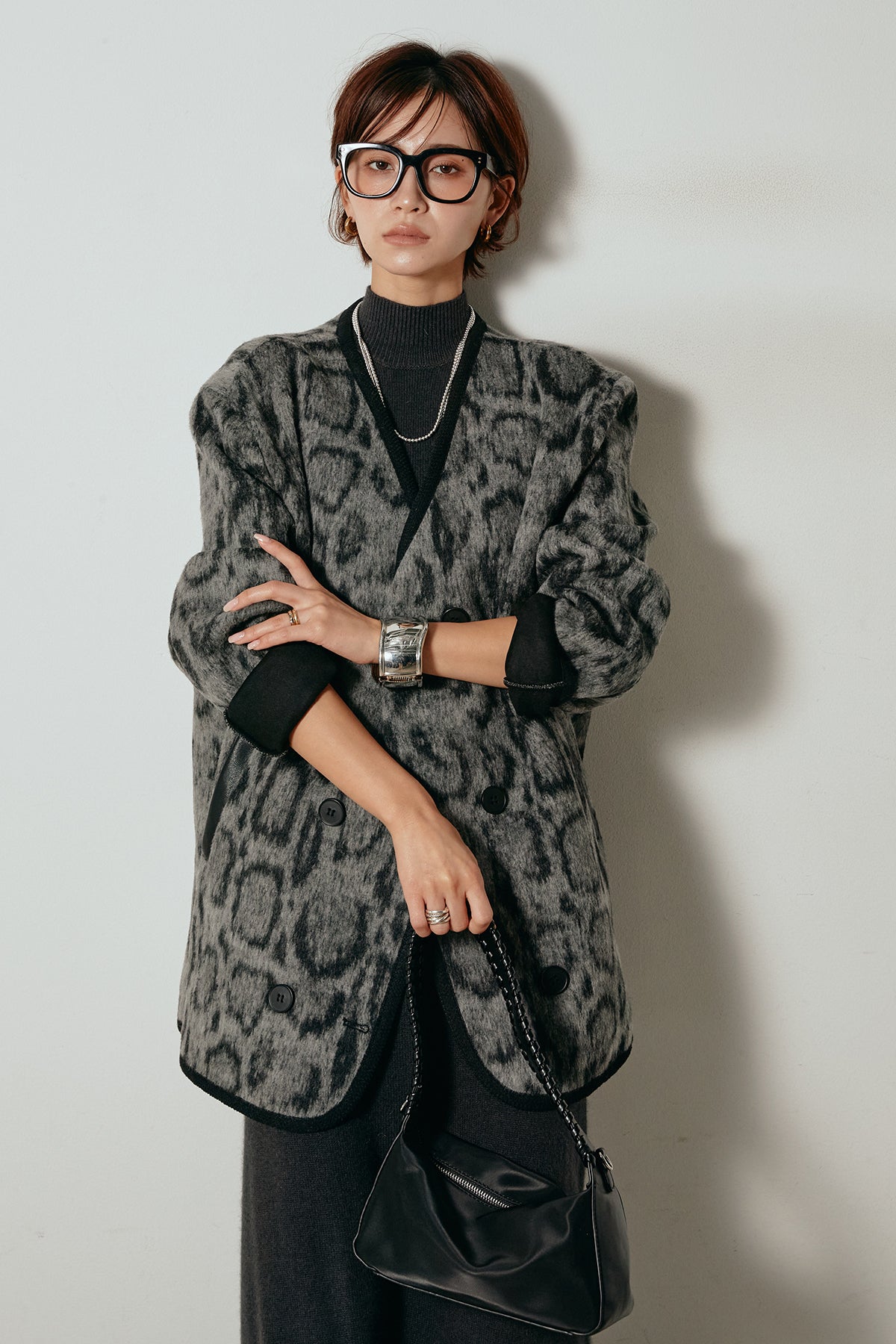 存在感のあるレオパード柄が目を惹くノーカラーアウター。 やわらかな起毛感のある素材で、軽やかな着心地ながらも暖かさをキープ。 ゆったりとしたシルエットが抜け感を生み、羽織るだけでスタイルにアクセントを加えます。 シンプルなインナーと合わせるだけで旬なムードを纏える、秋冬の主役アイテムです。
