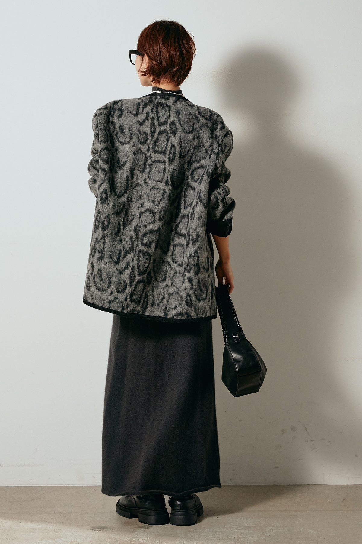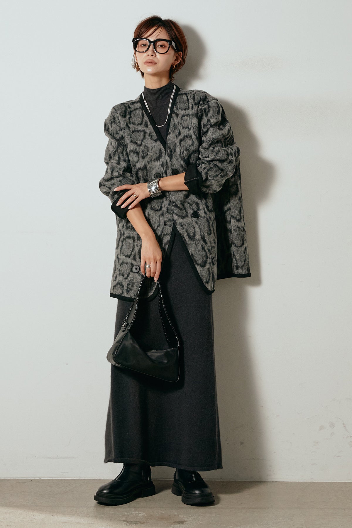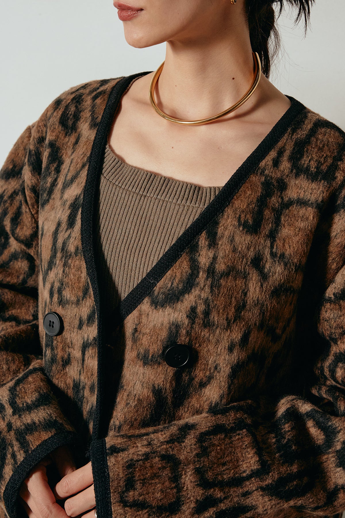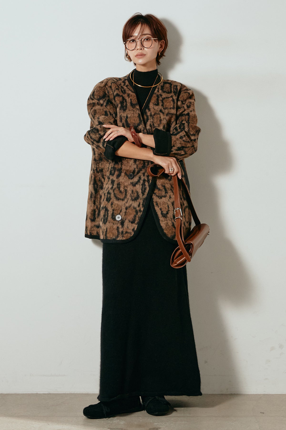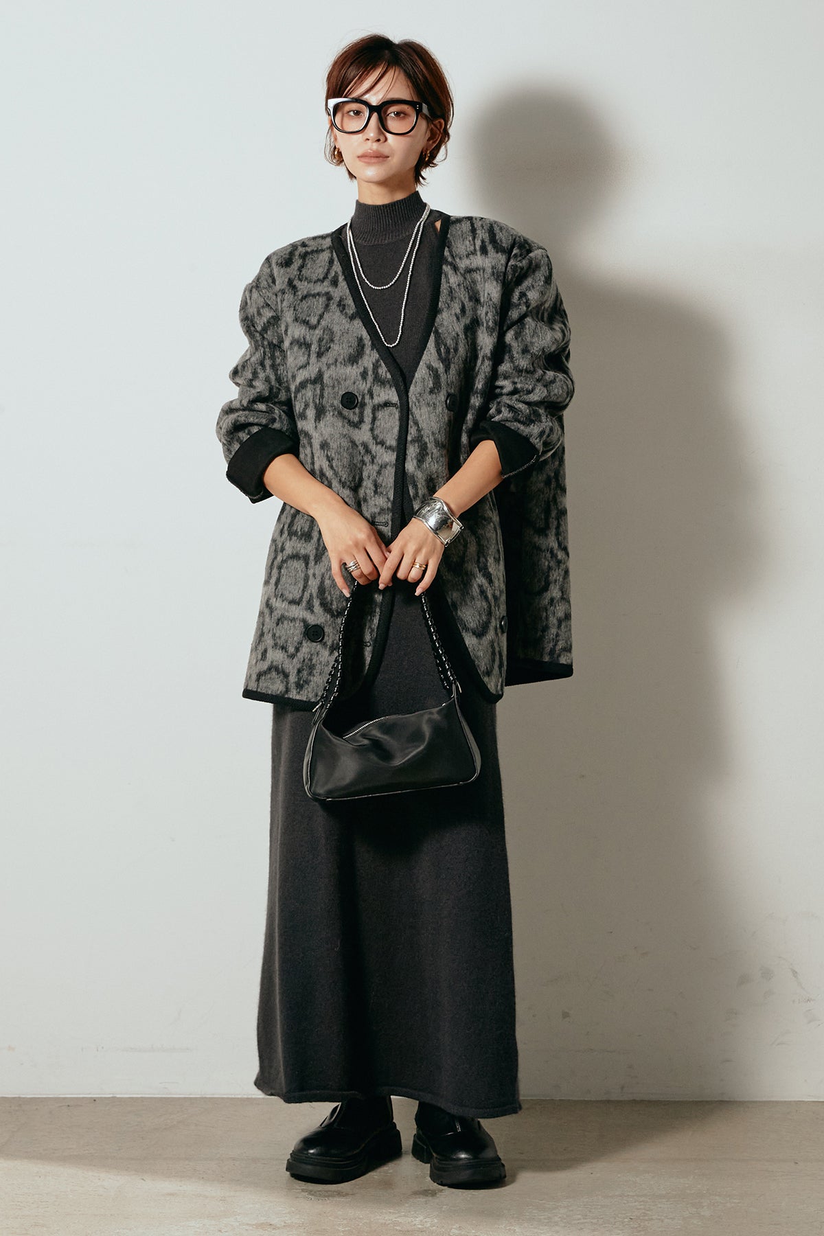 存在感のあるレオパード柄が目を惹くノーカラーアウター。 やわらかな起毛感のある素材で、軽やかな着心地ながらも暖かさをキープ。 ゆったりとしたシルエットが抜け感を生み、羽織るだけでスタイルにアクセントを加えます。 シンプルなインナーと合わせるだけで旬なムードを纏える、秋冬の主役アイテムです。