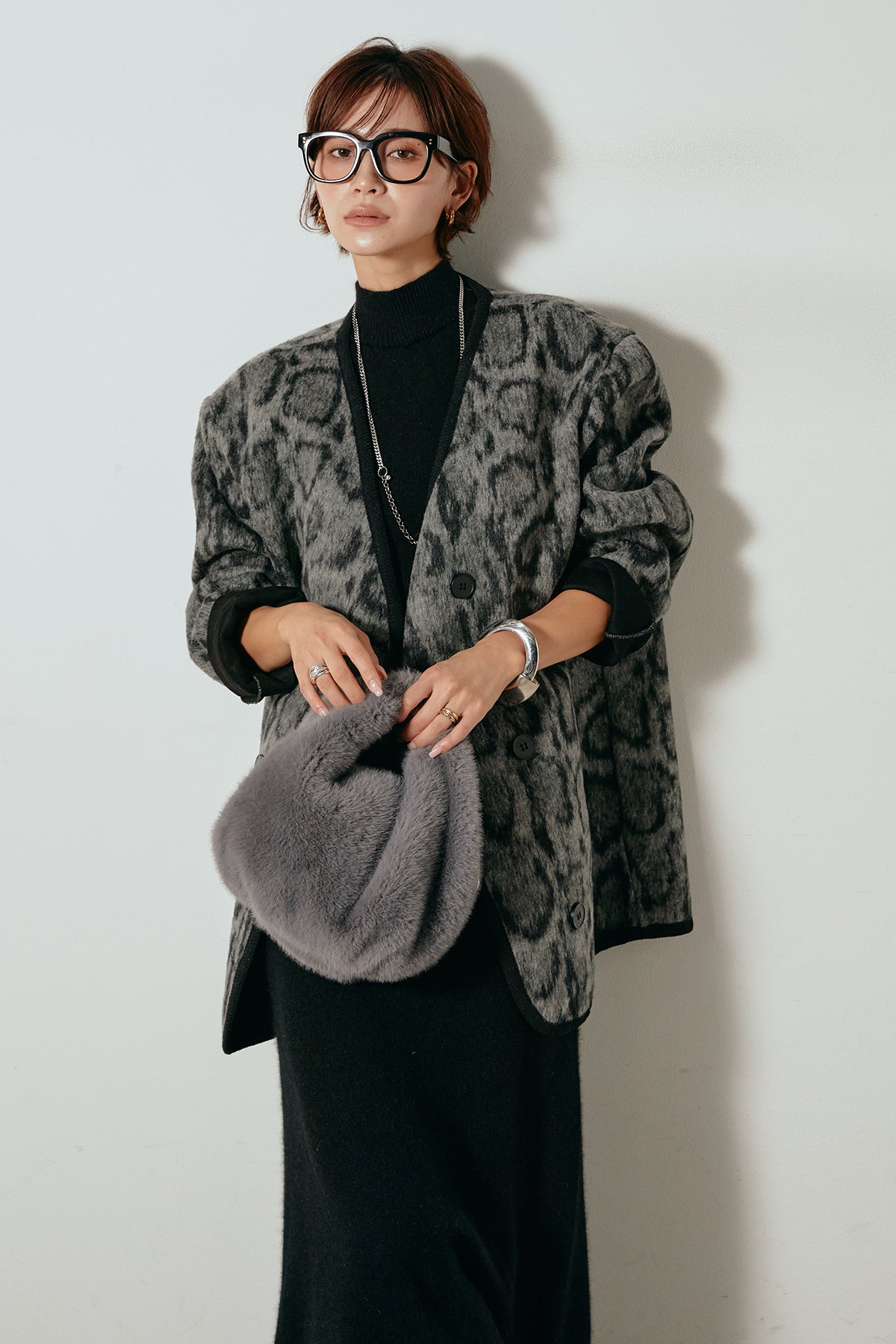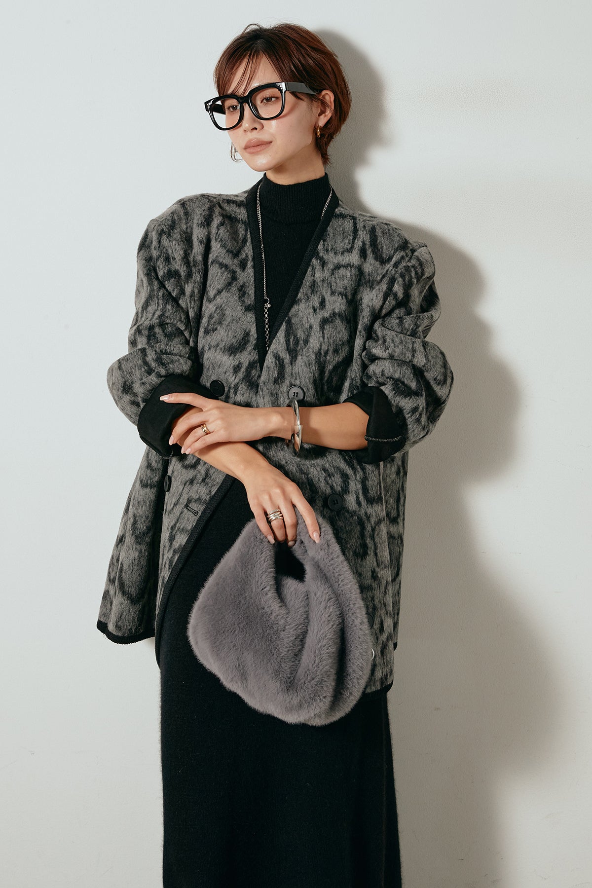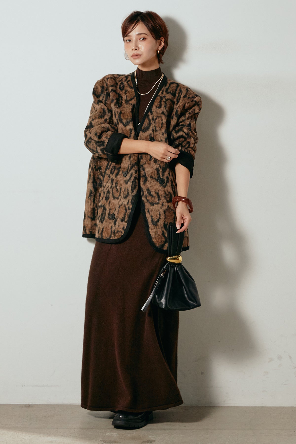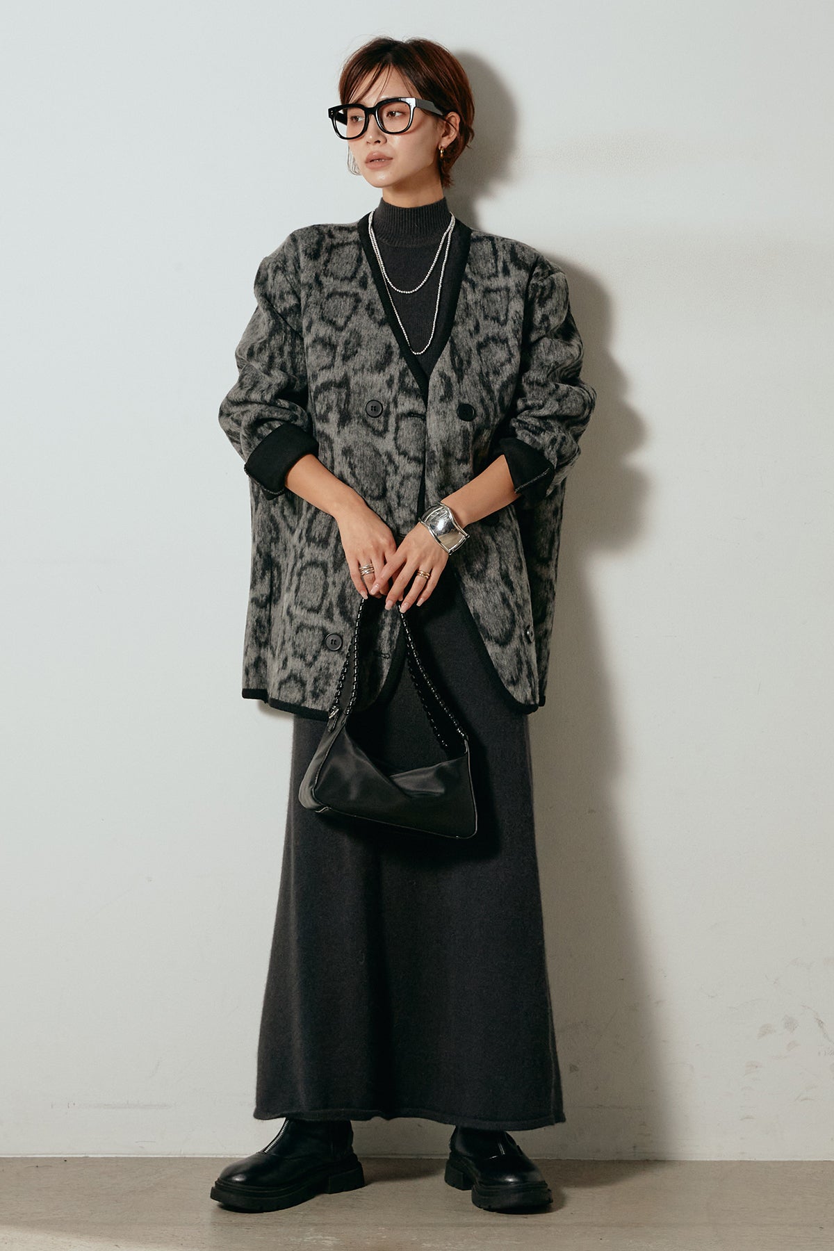 存在感のあるレオパード柄が目を惹くノーカラーアウター。 やわらかな起毛感のある素材で、軽やかな着心地ながらも暖かさをキープ。 ゆったりとしたシルエットが抜け感を生み、羽織るだけでスタイルにアクセントを加えます。 シンプルなインナーと合わせるだけで旬なムードを纏える、秋冬の主役アイテムです。