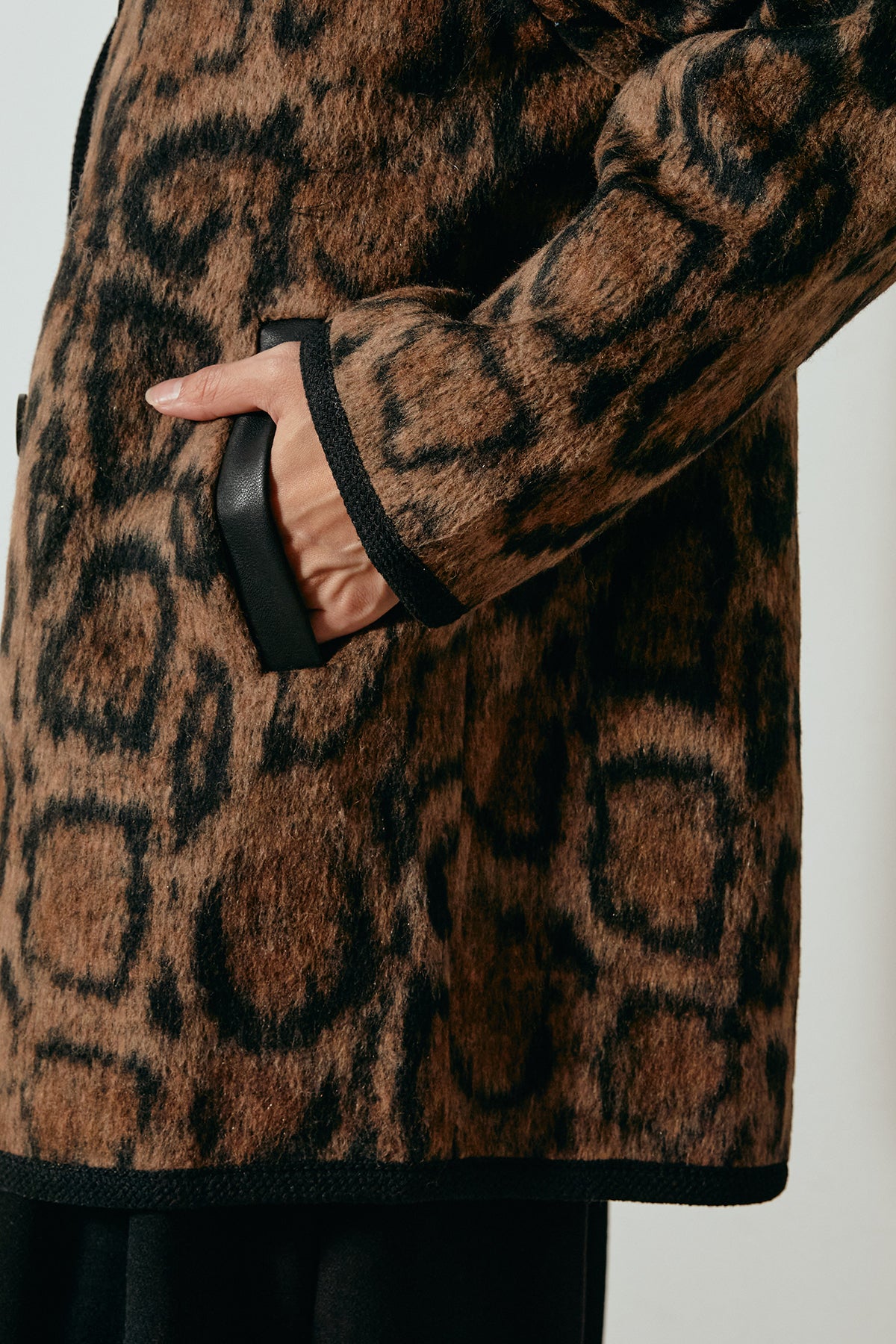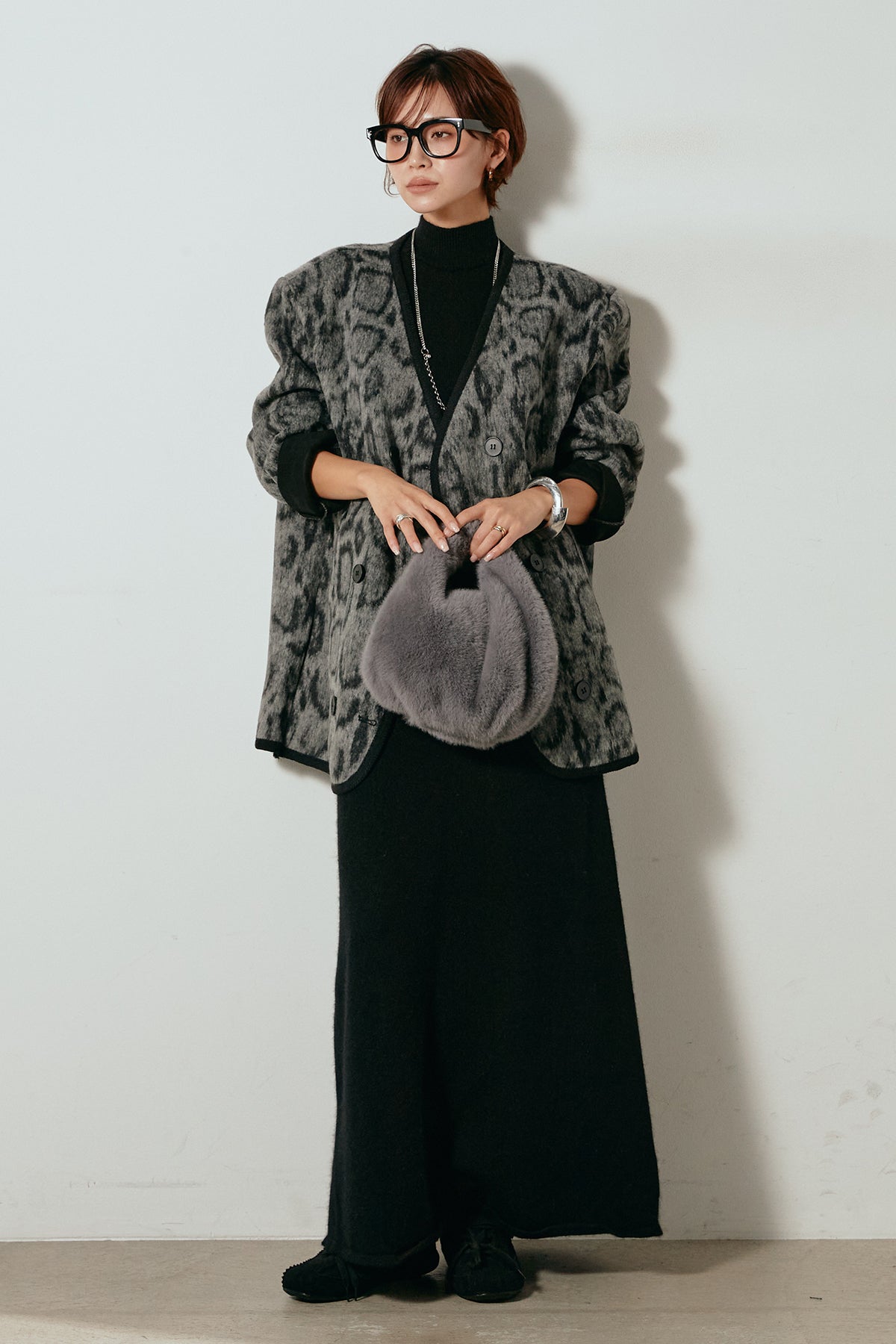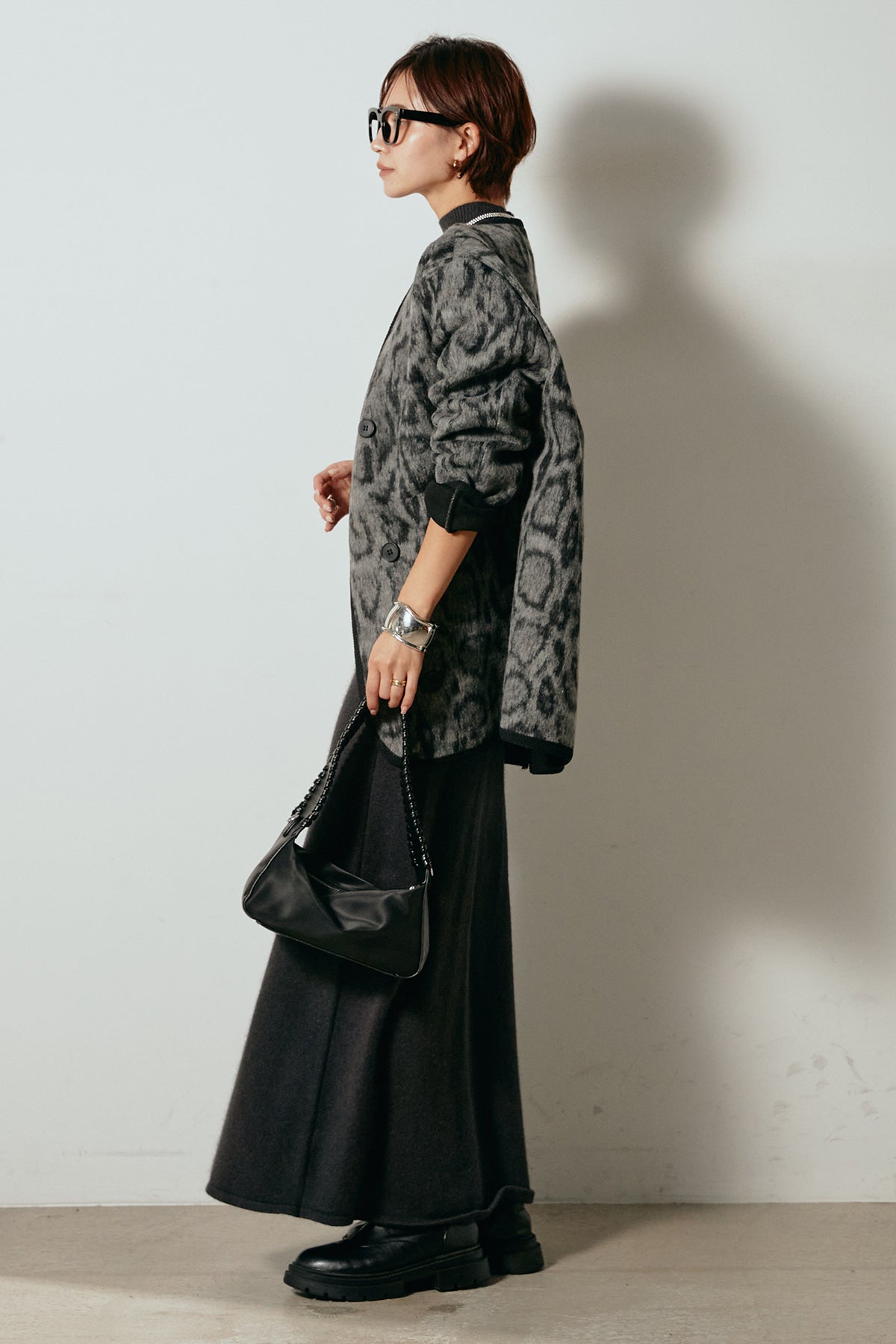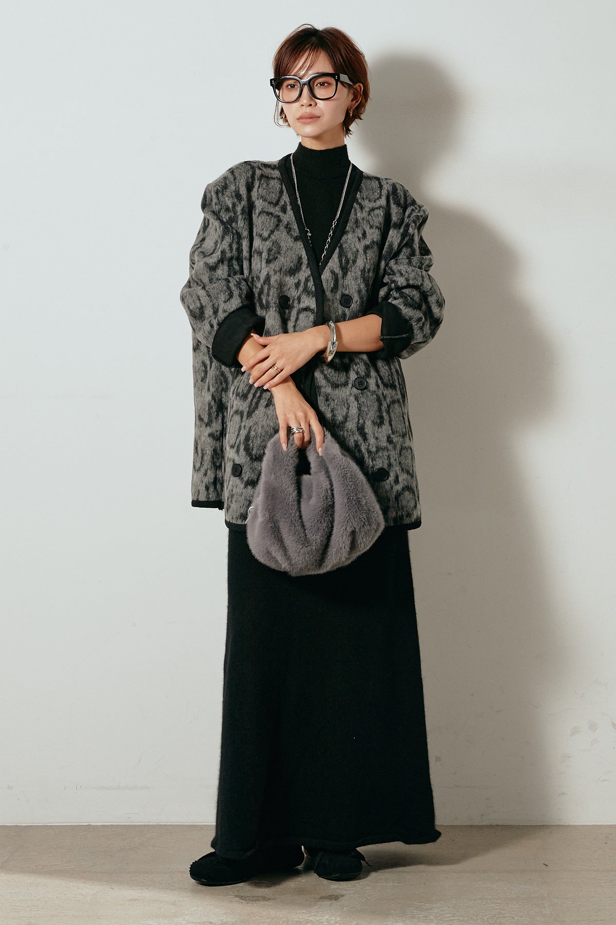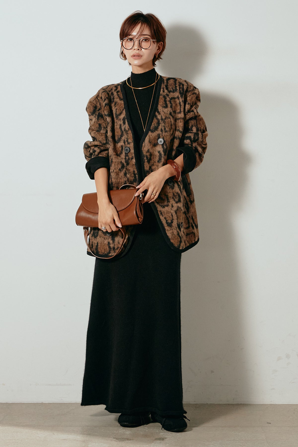 存在感のあるレオパード柄が目を惹くノーカラーアウター。 やわらかな起毛感のある素材で、軽やかな着心地ながらも暖かさをキープ。 ゆったりとしたシルエットが抜け感を生み、羽織るだけでスタイルにアクセントを加えます。 シンプルなインナーと合わせるだけで旬なムードを纏える、秋冬の主役アイテムです。