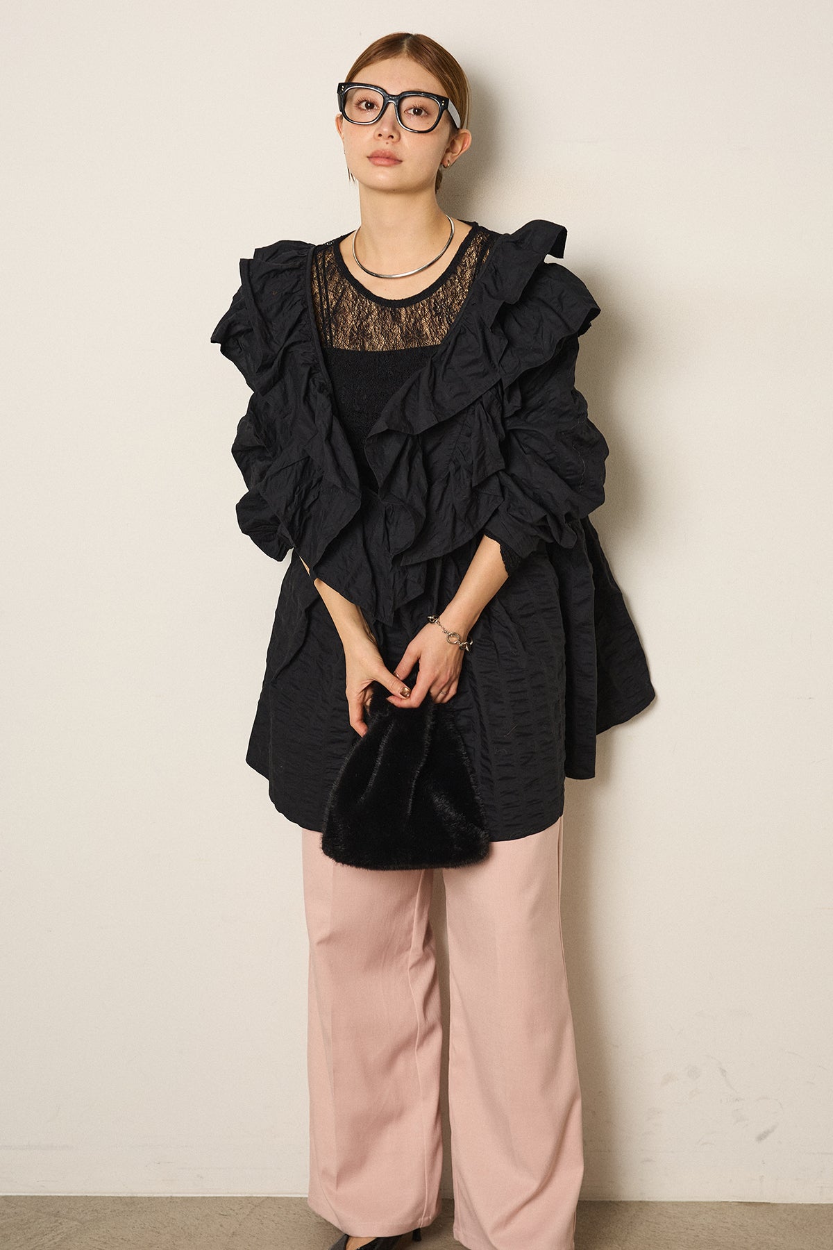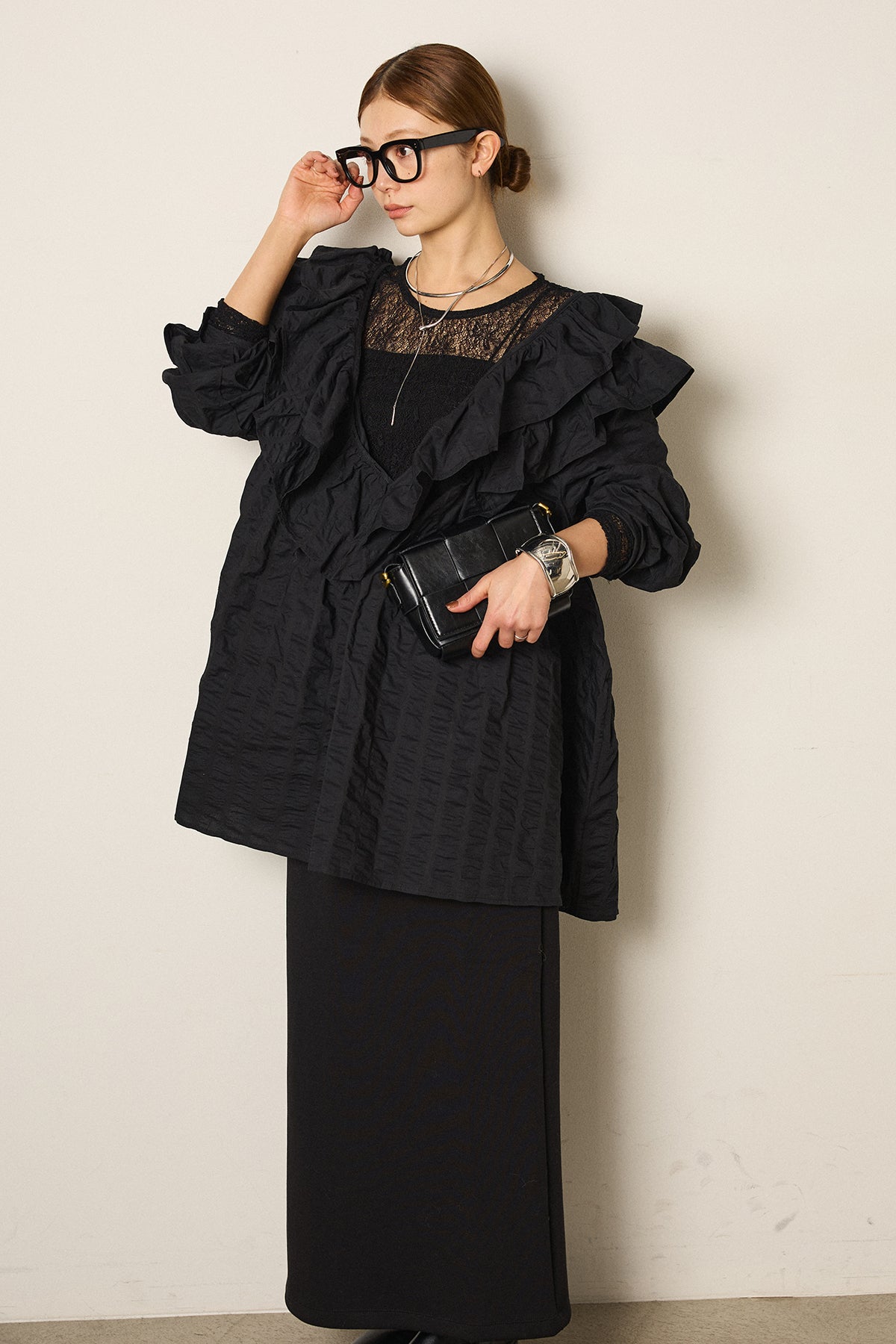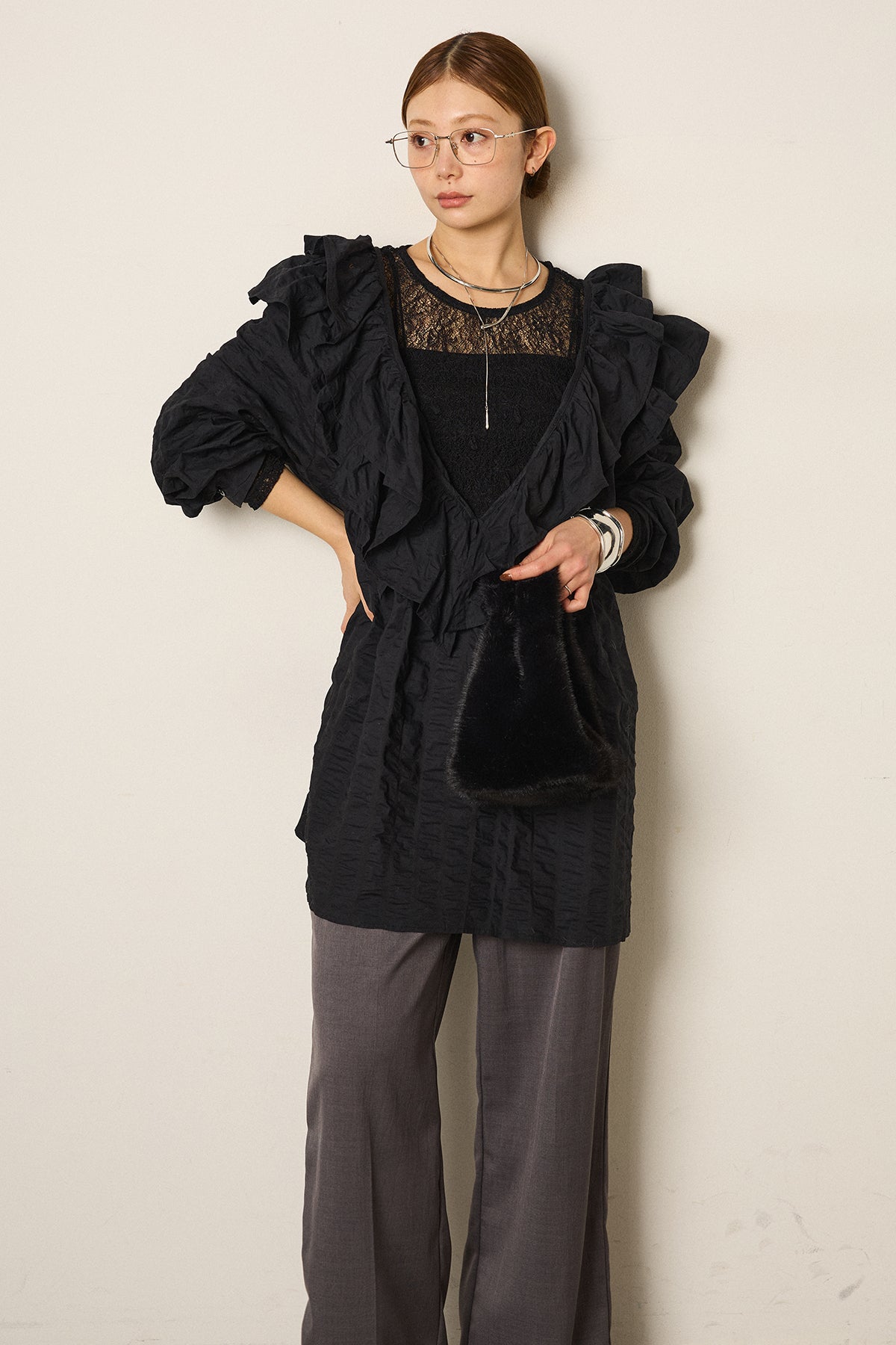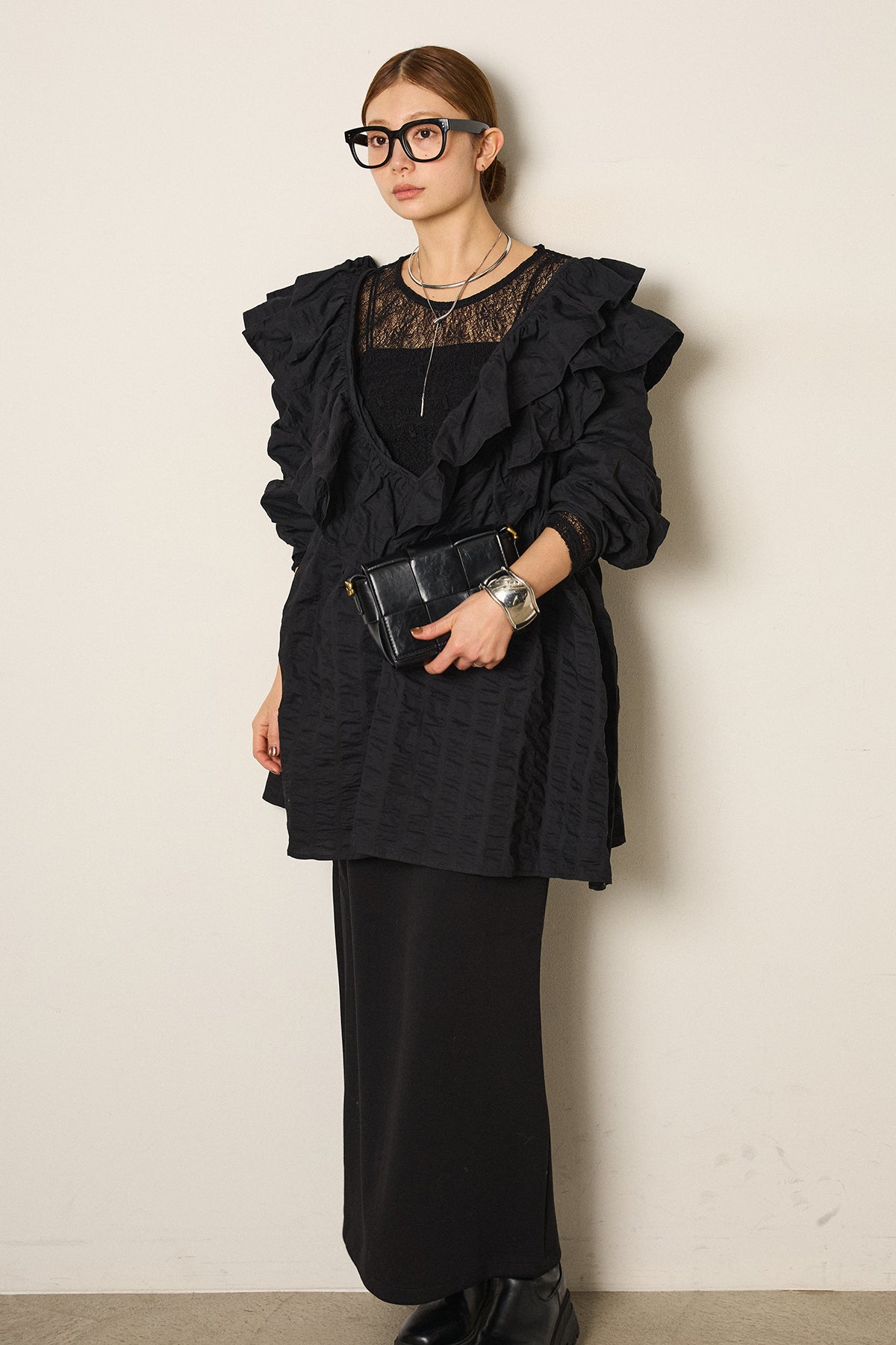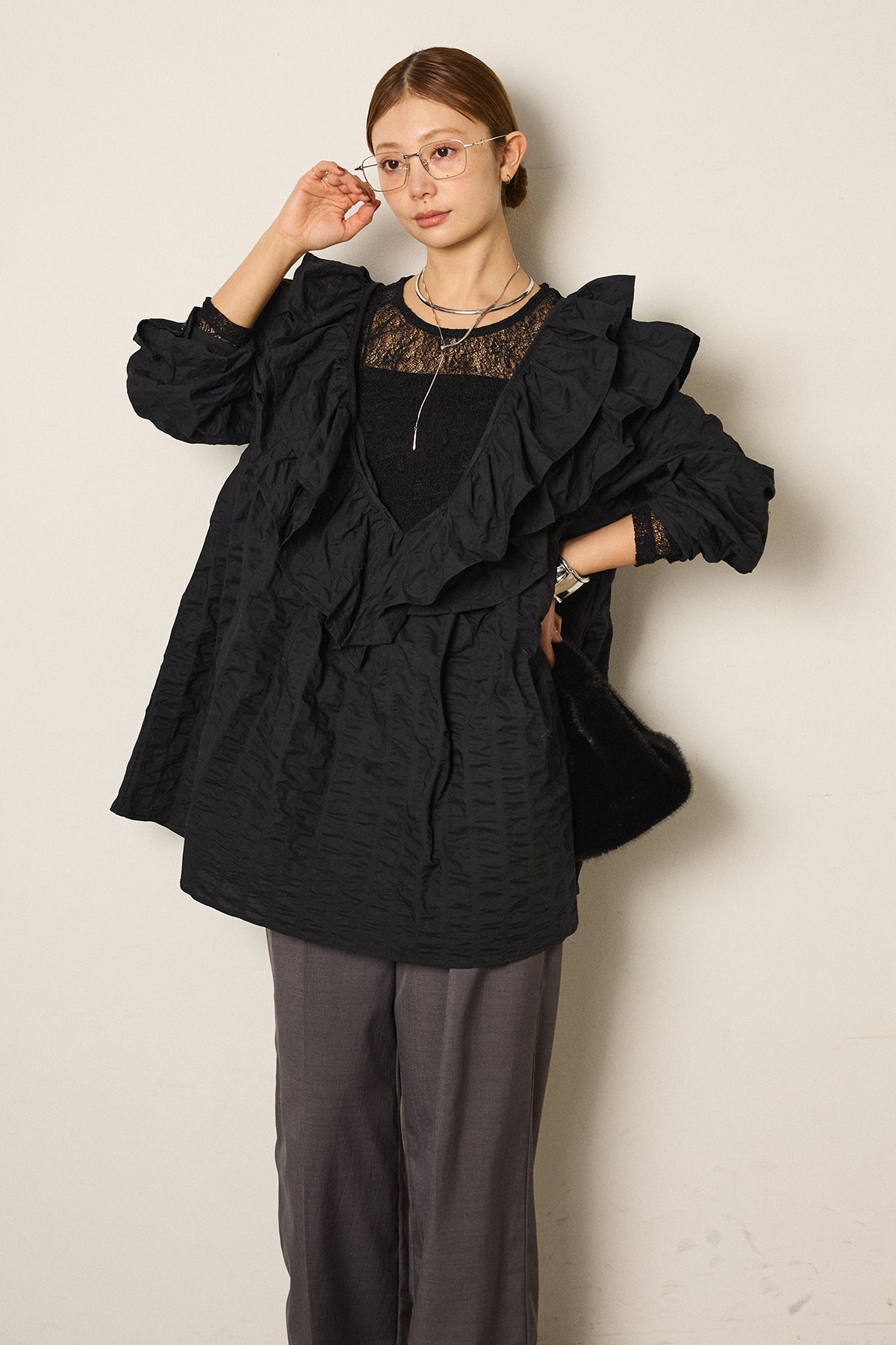 [SET]Vネックフリルカラーブラウス+ストレッチレースクルーネックインナー(2set)