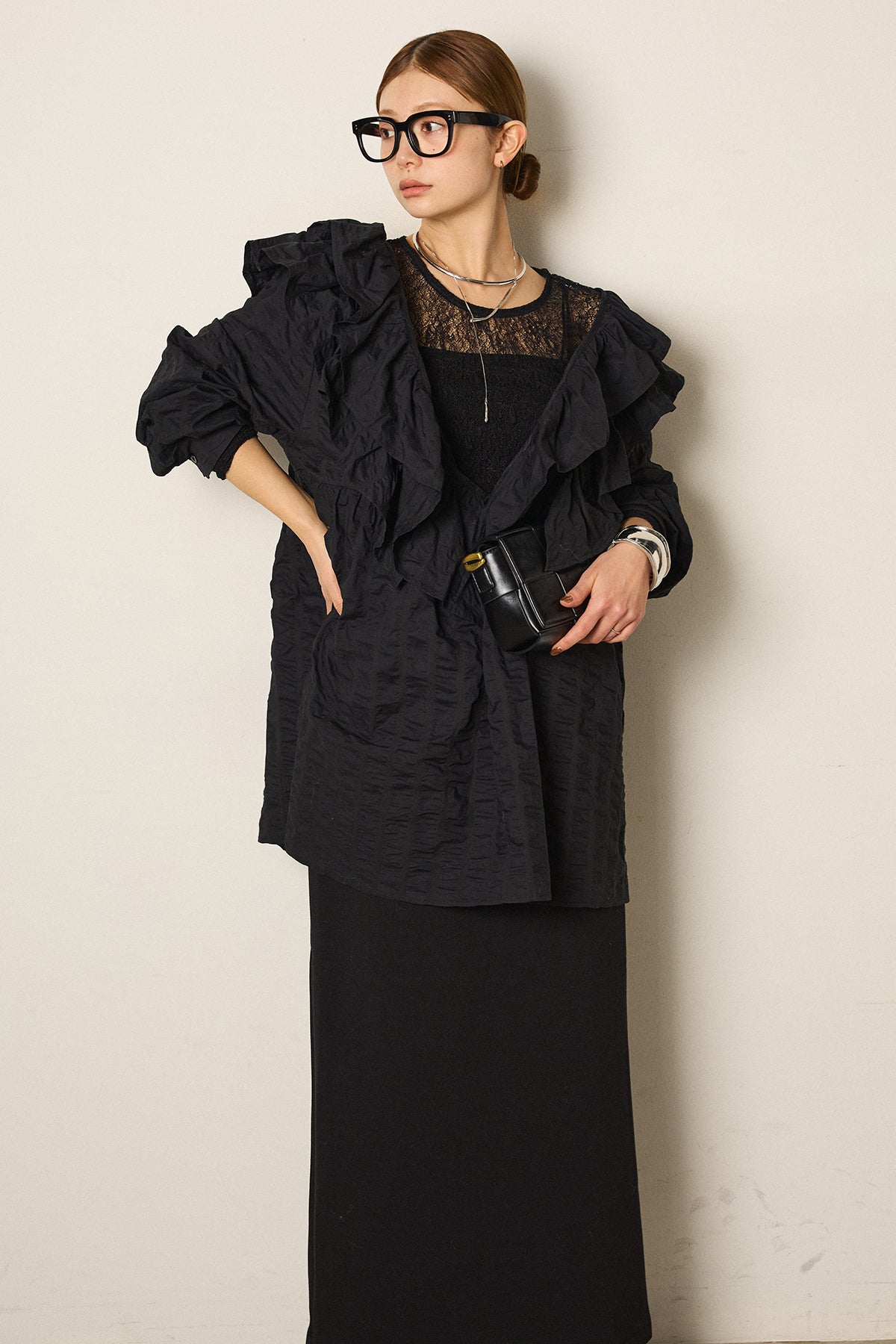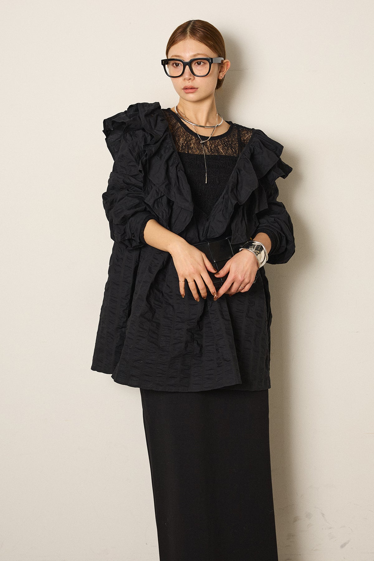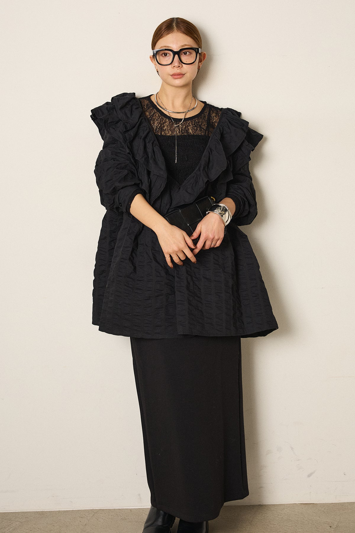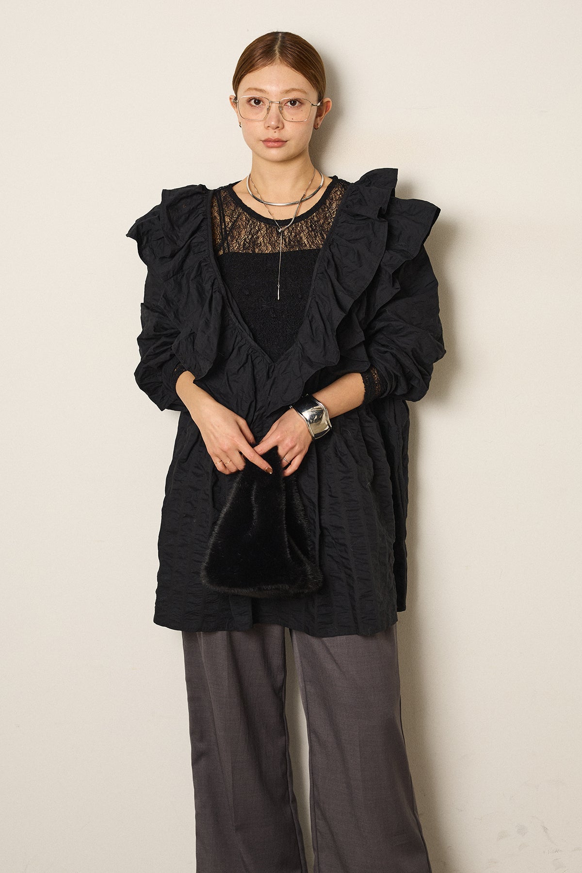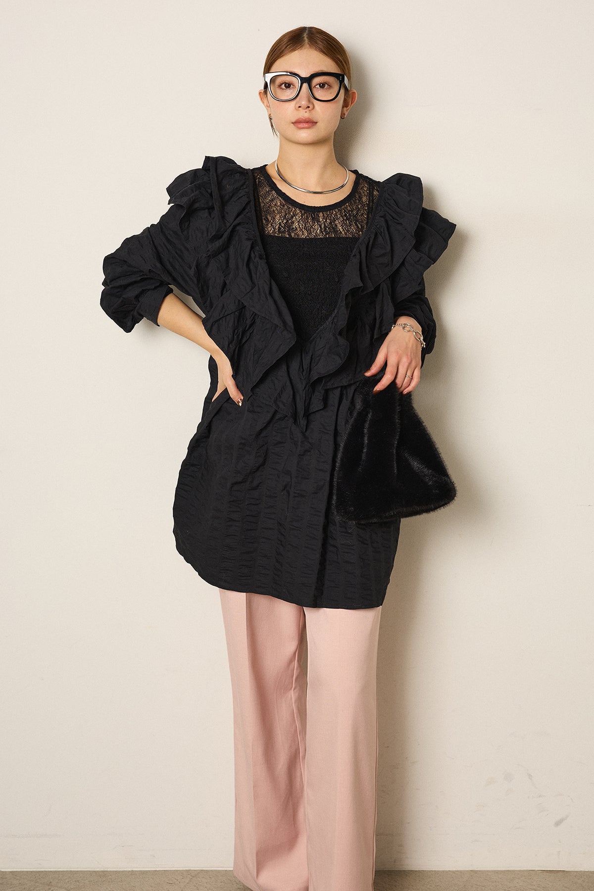 [SET]Vネックフリルカラーブラウス+ストレッチレースクルーネックインナー(2set)