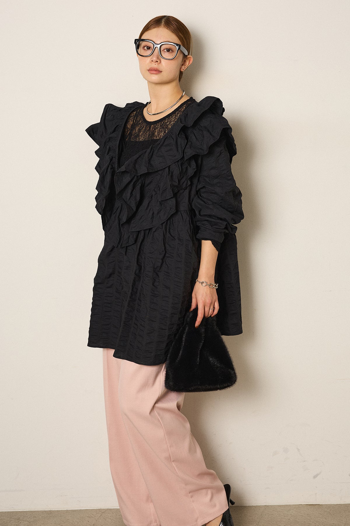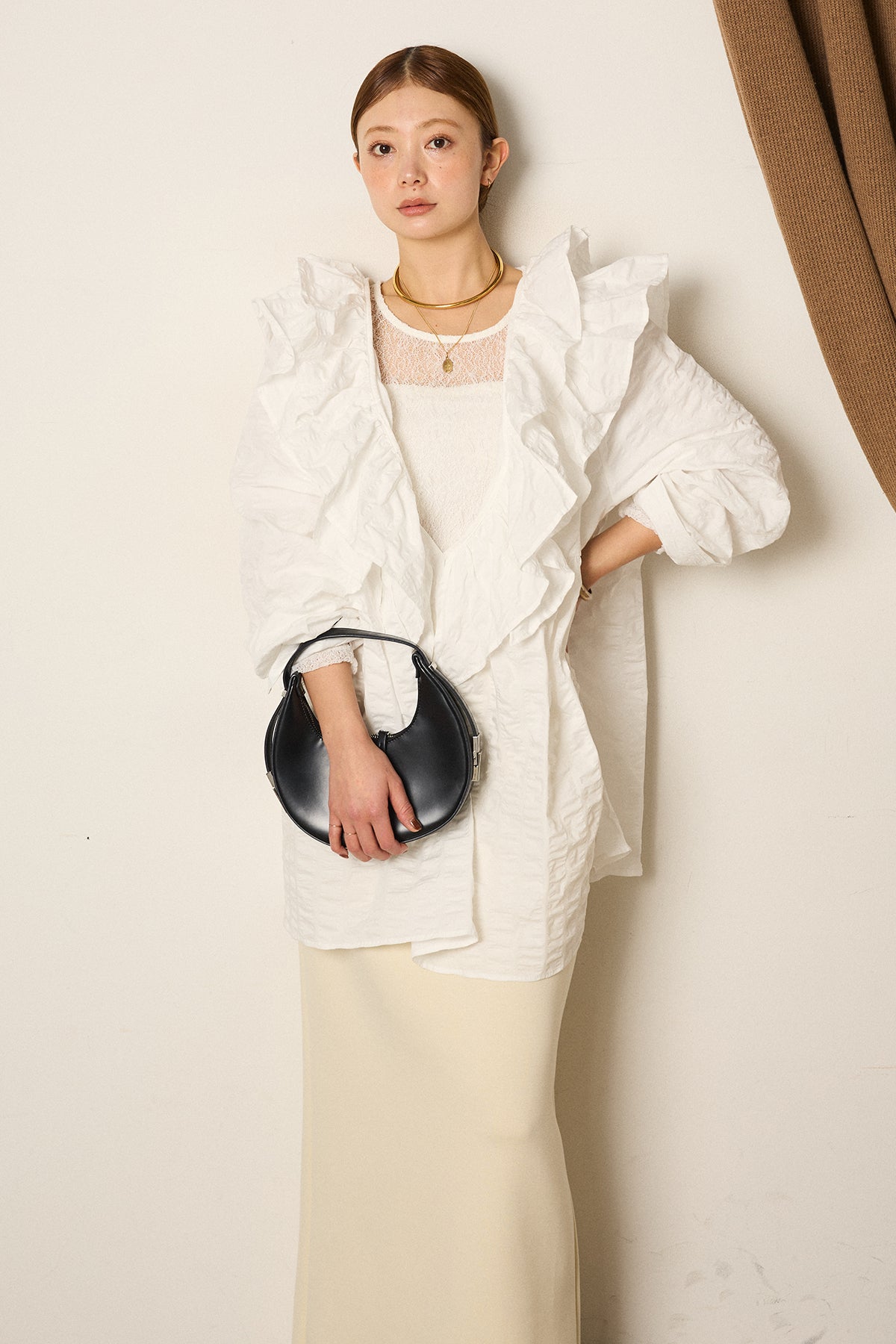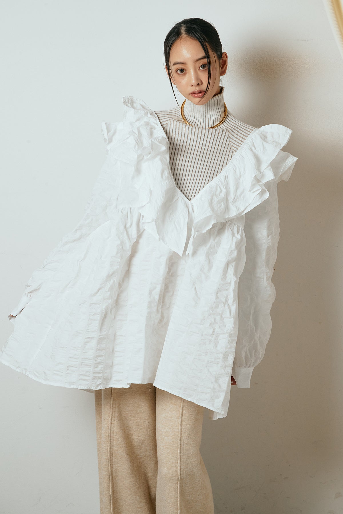 Vネックにフリルカラーをあしらったデザインブラウス。 顔まわりに立体感が出やすく、シンプルなボトム合わせでも印象的にまとまります。 程よくゆとりのあるシルエットで、レイヤードもしやすい一枚。 パンツ・スカートどちらにも合わせやすく、デイリーから外出まで幅広く活躍します。