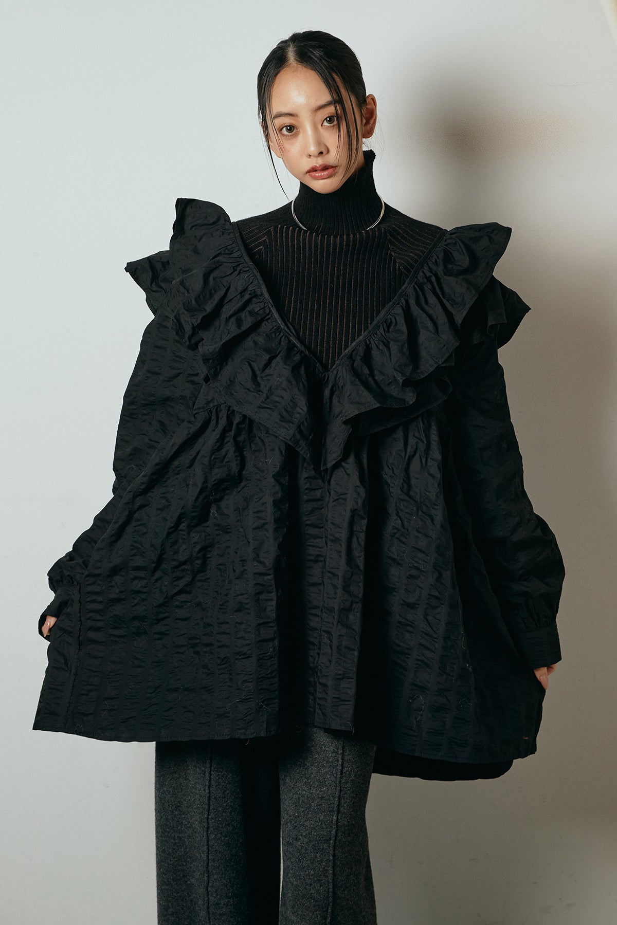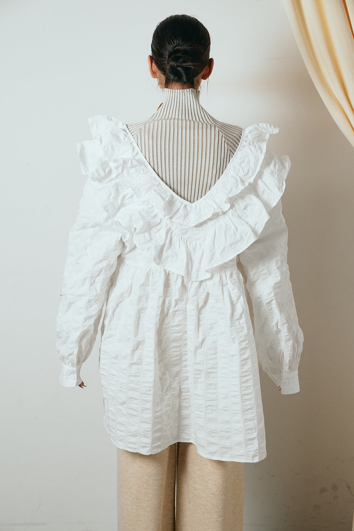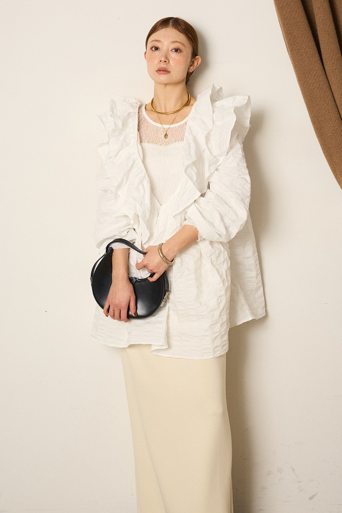 Vネックにフリルカラーをあしらったデザインブラウス。 顔まわりに立体感が出やすく、シンプルなボトム合わせでも印象的にまとまります。 程よくゆとりのあるシルエットで、レイヤードもしやすい一枚。 パンツ・スカートどちらにも合わせやすく、デイリーから外出まで幅広く活躍します。